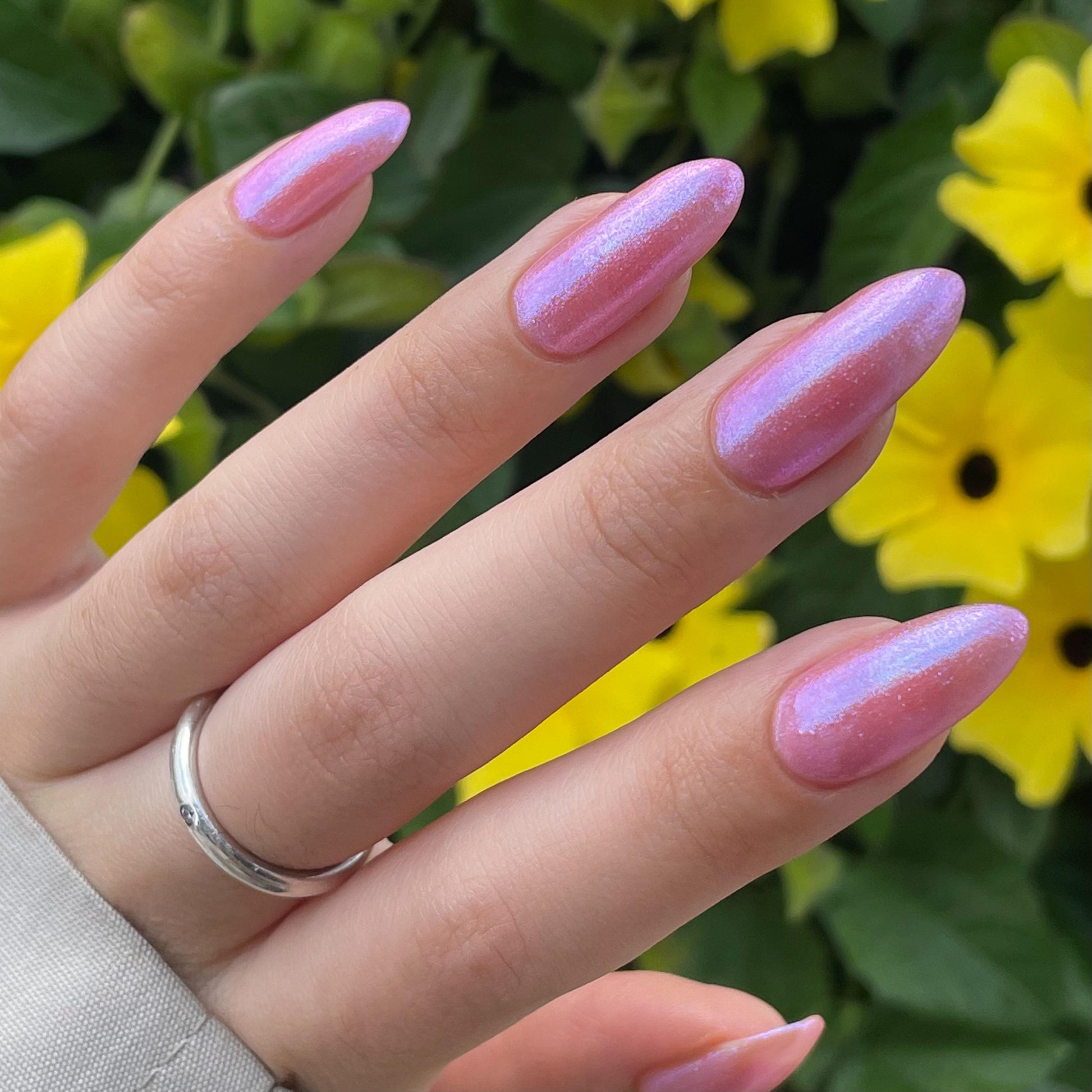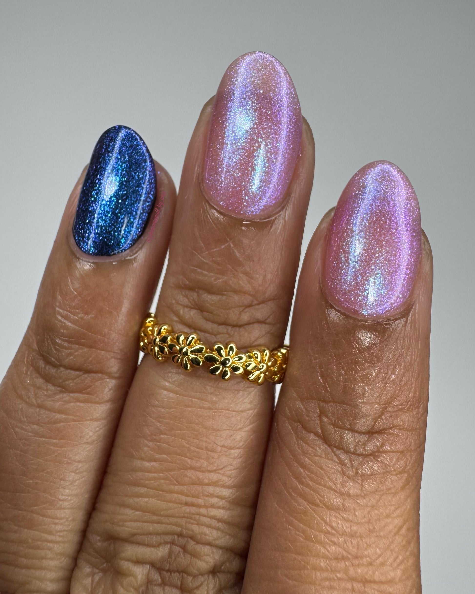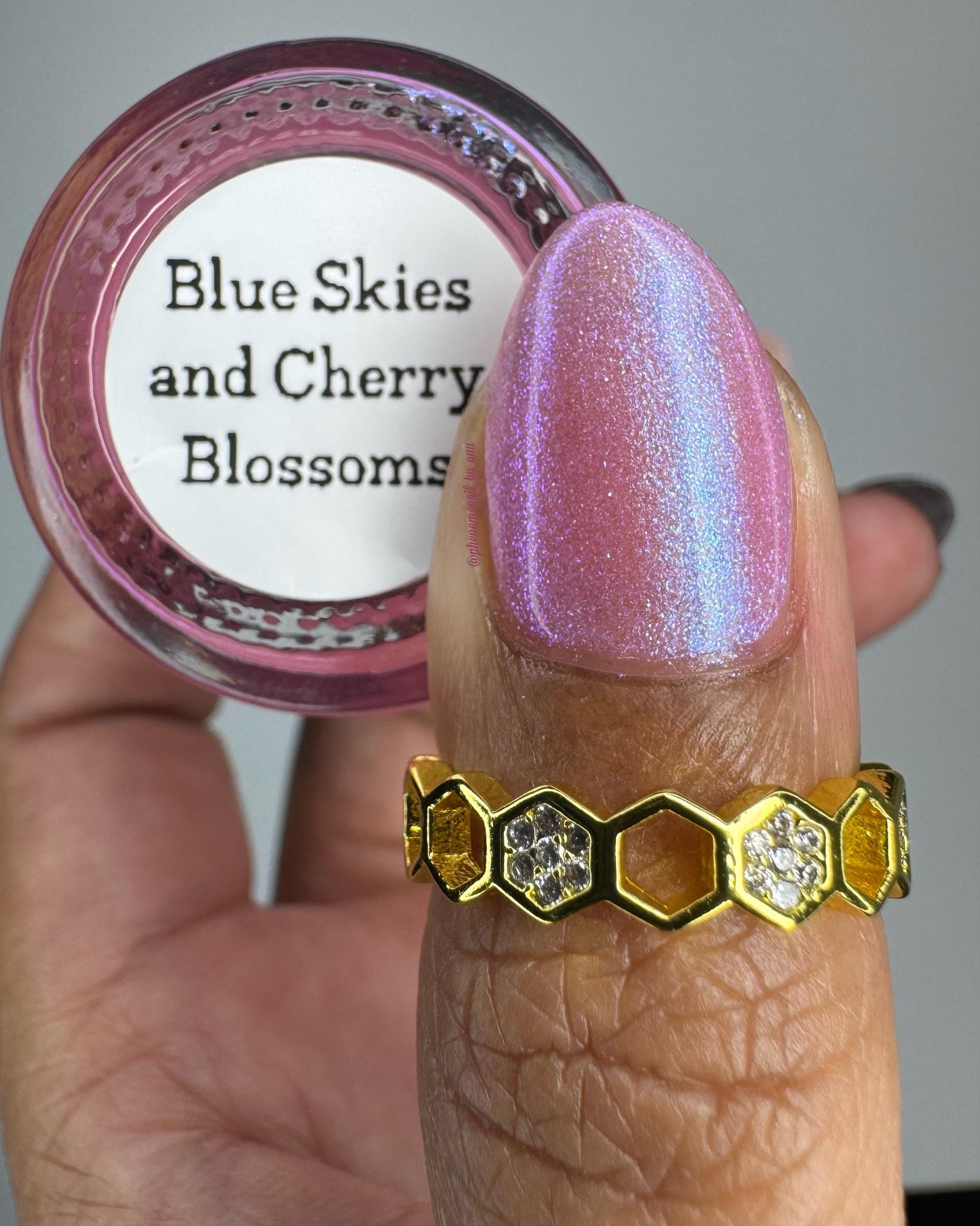 Blue Skies and Cherry Blossoms is a light pink jelly polish with shimmer that shifts between aqua and pink. Note: making up the larger batches of this polish I added a *little* more pink pigment so the pink is just a tad less sheer than pictured. It still looks almost identical to the swatch photos.