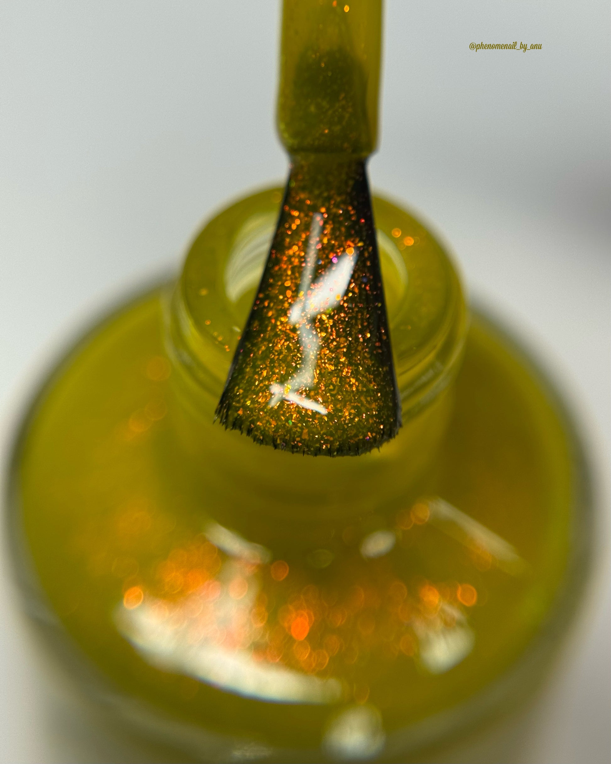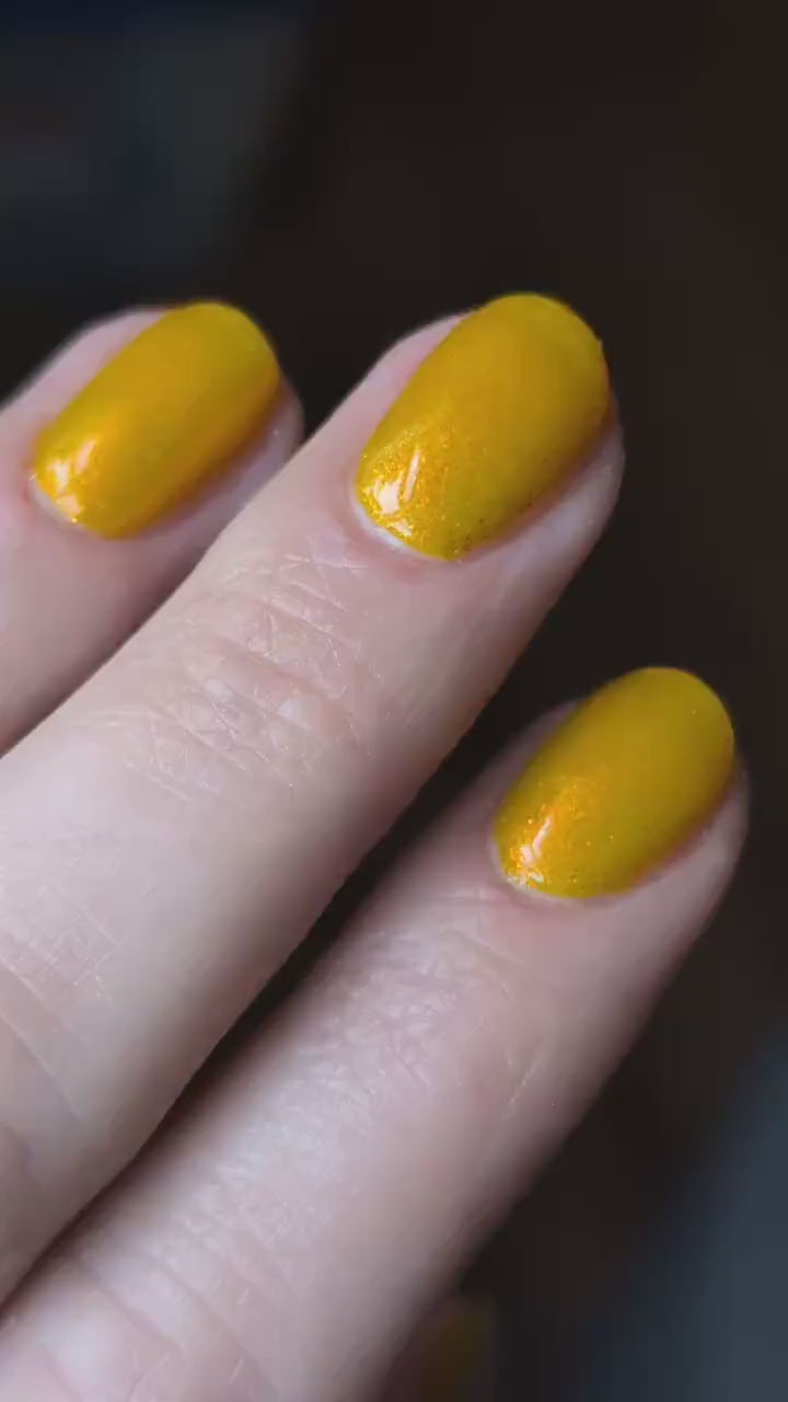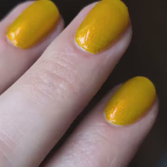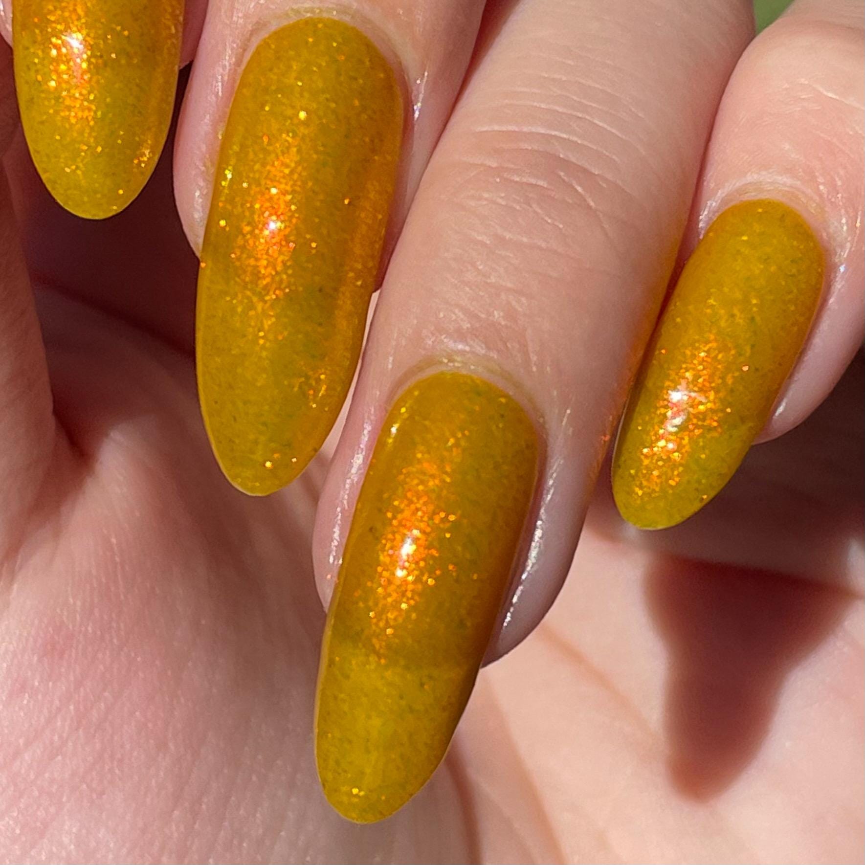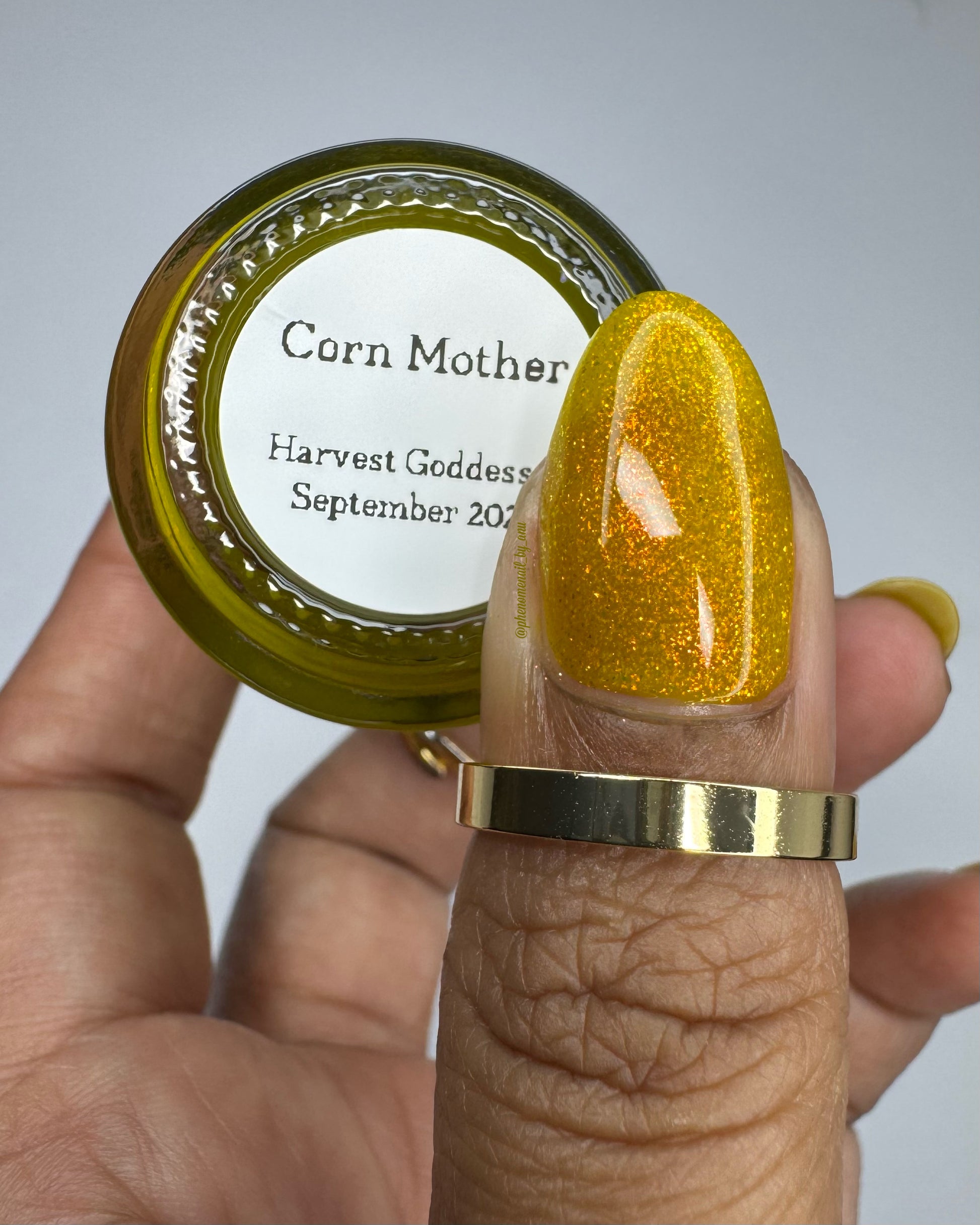 Corn Mother is a green-leaning yellow jelly polish with orange shimmer and a scattering of orange micro flakes.
