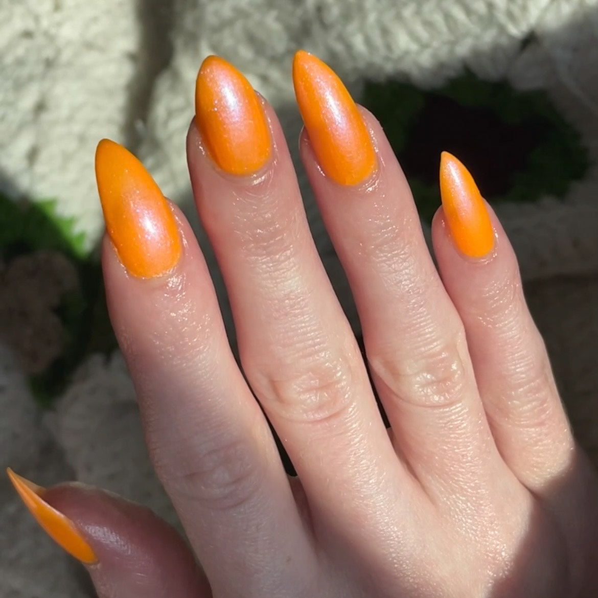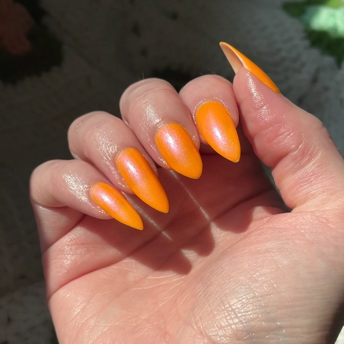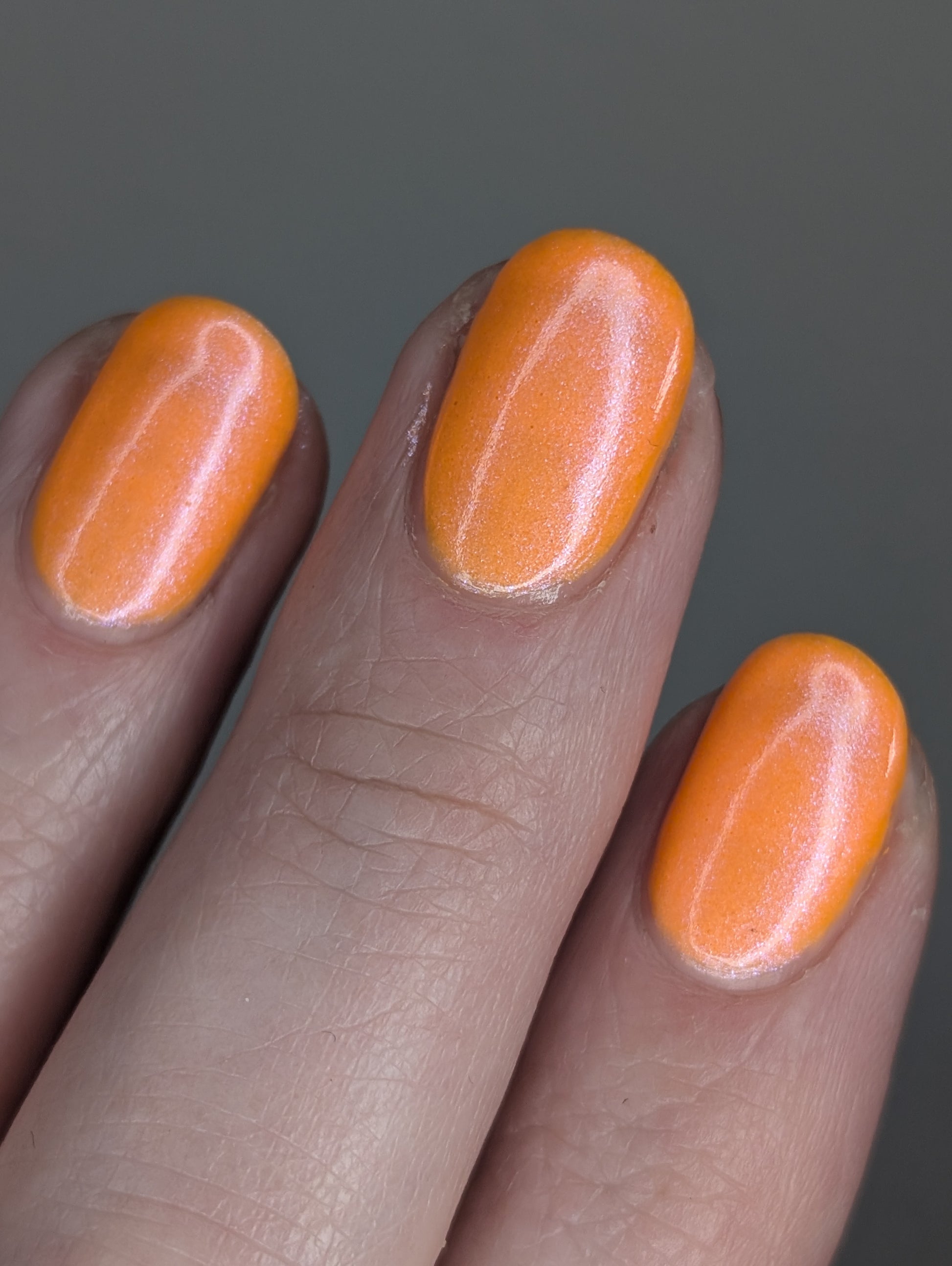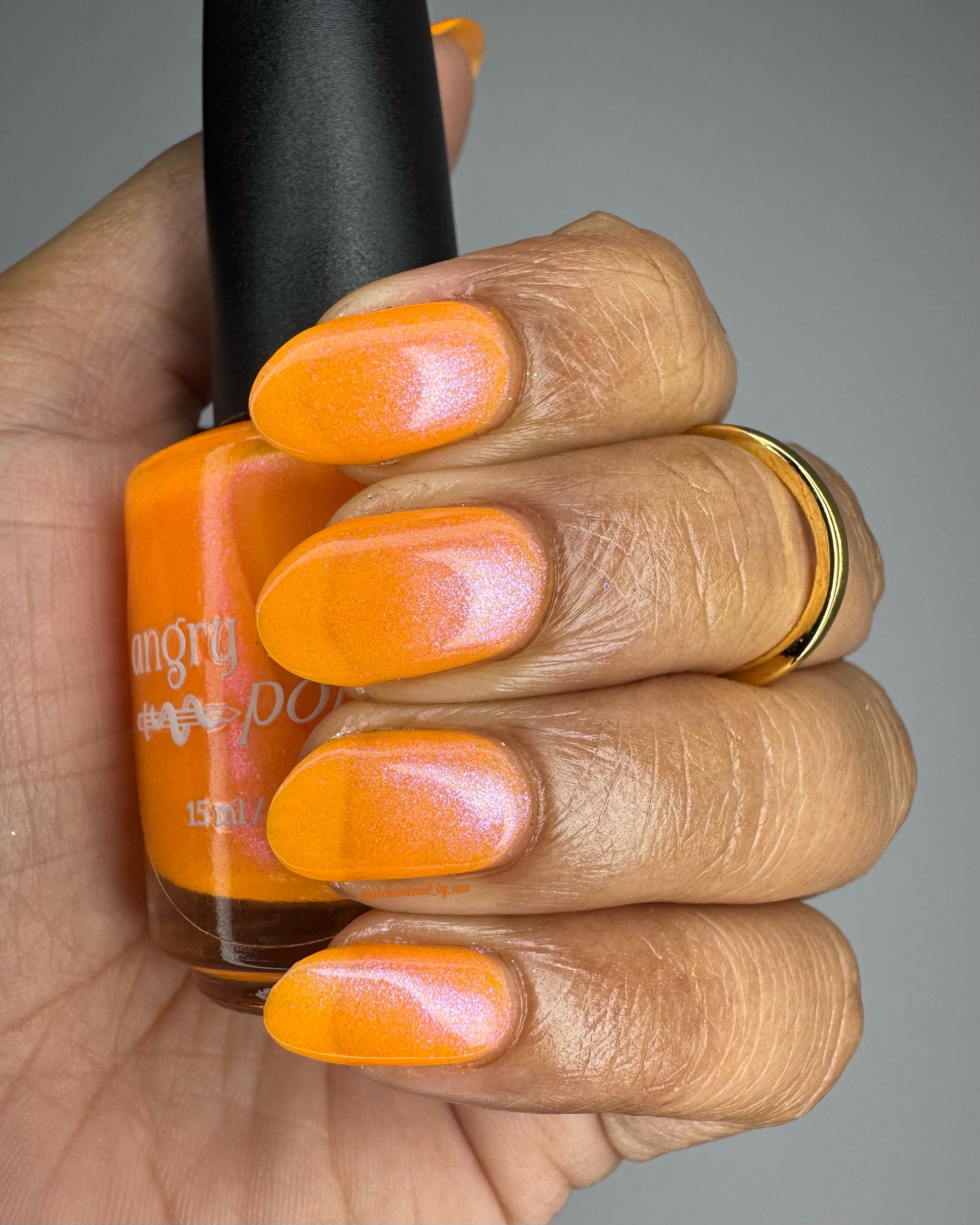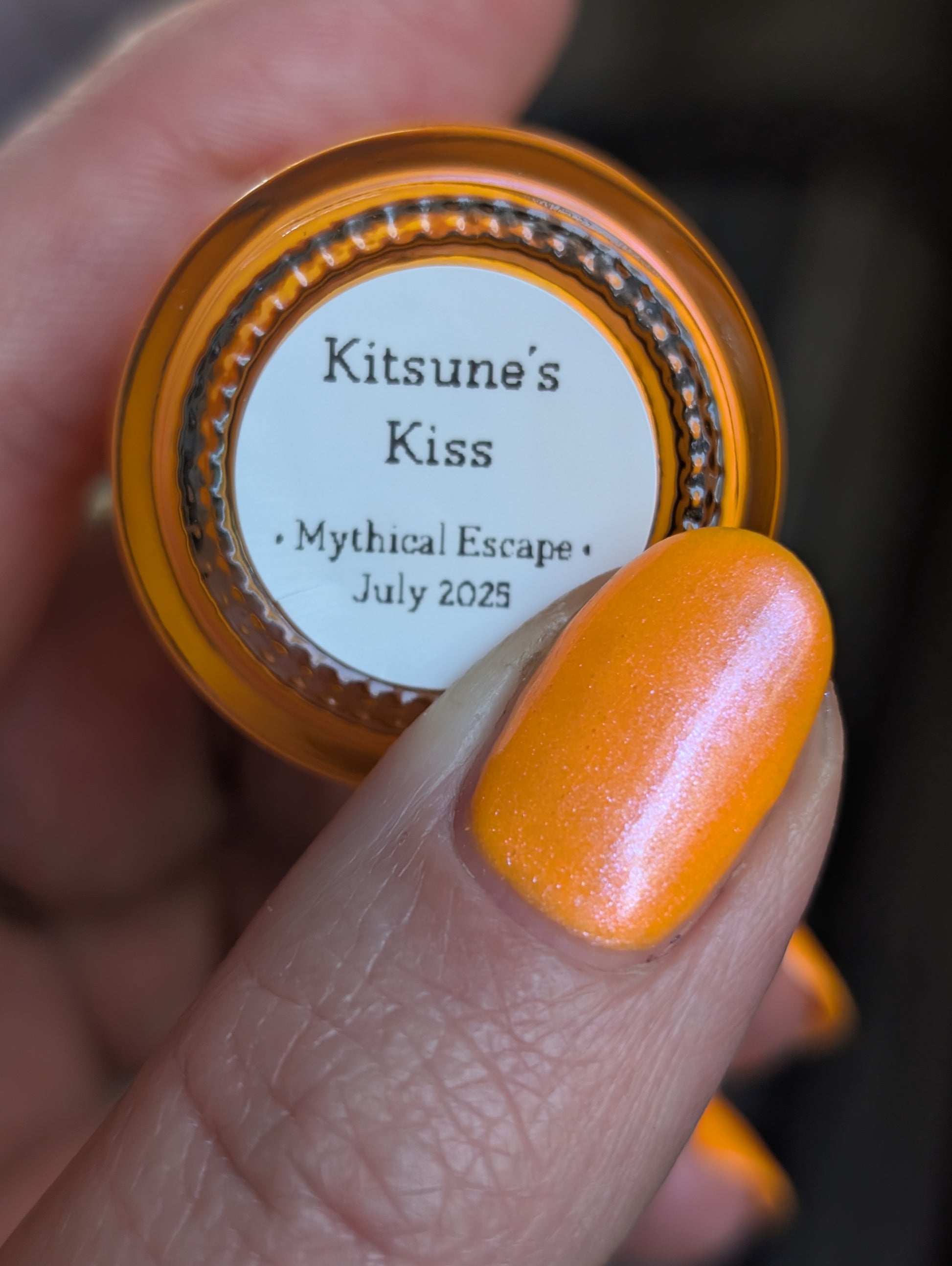 Kitsune’s Kiss is a neon orange nail lacquer with pink-purple shimmer. *free art sticker with first 25 purchases of this polish*