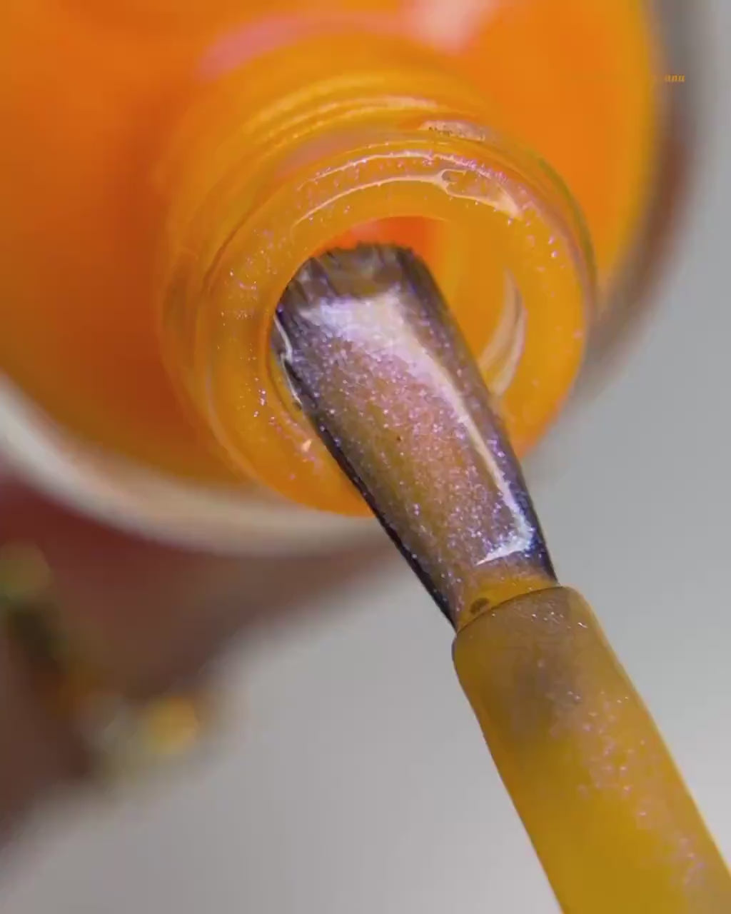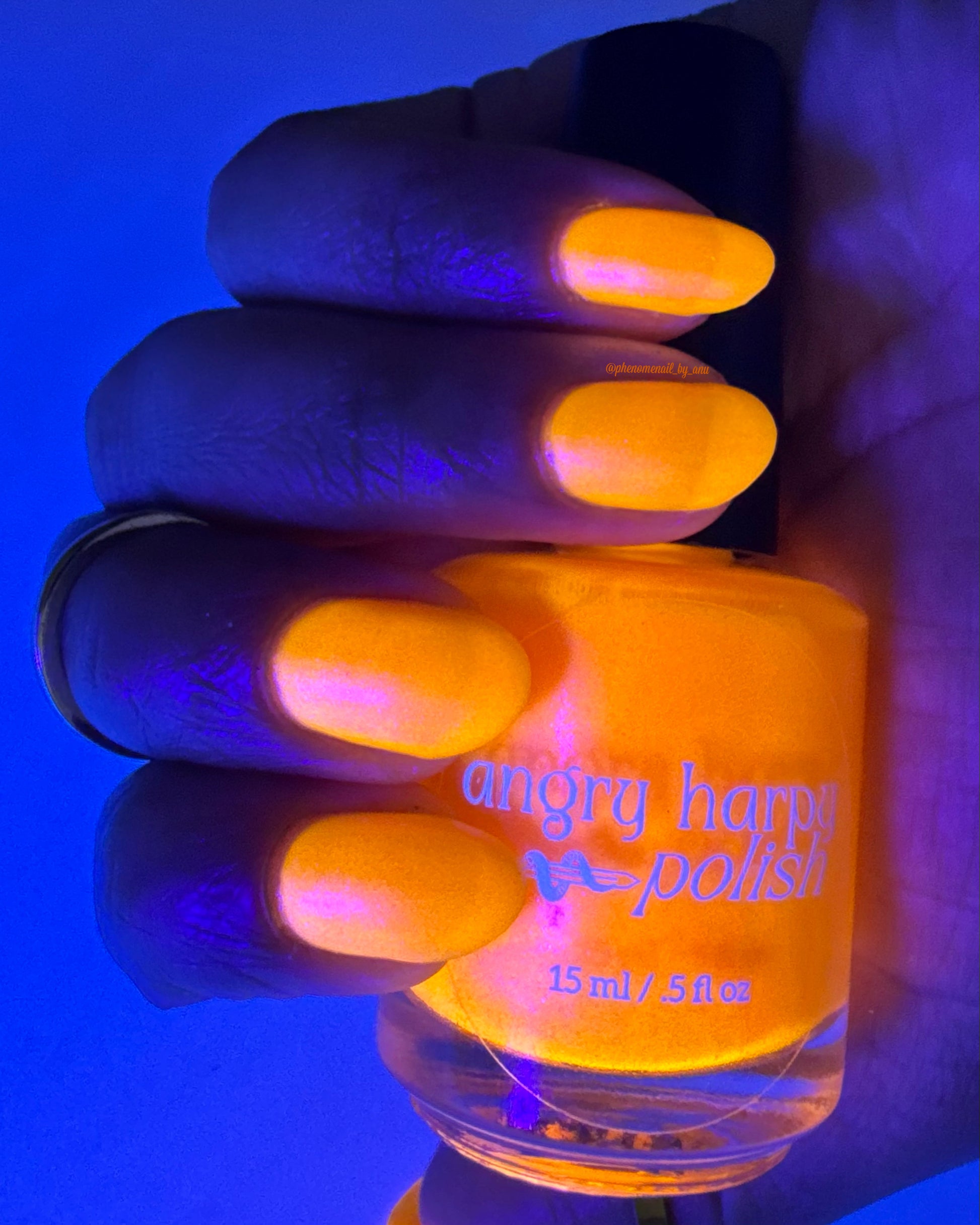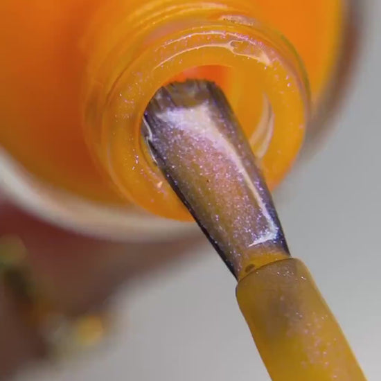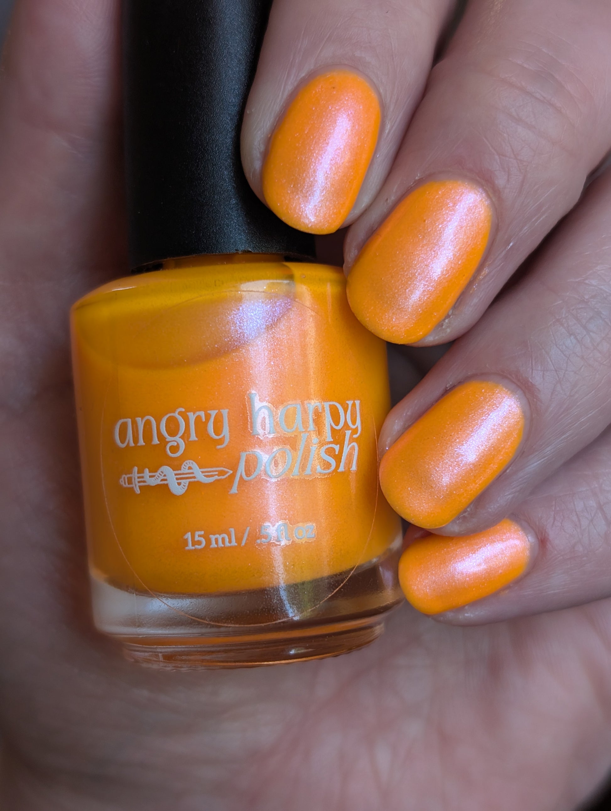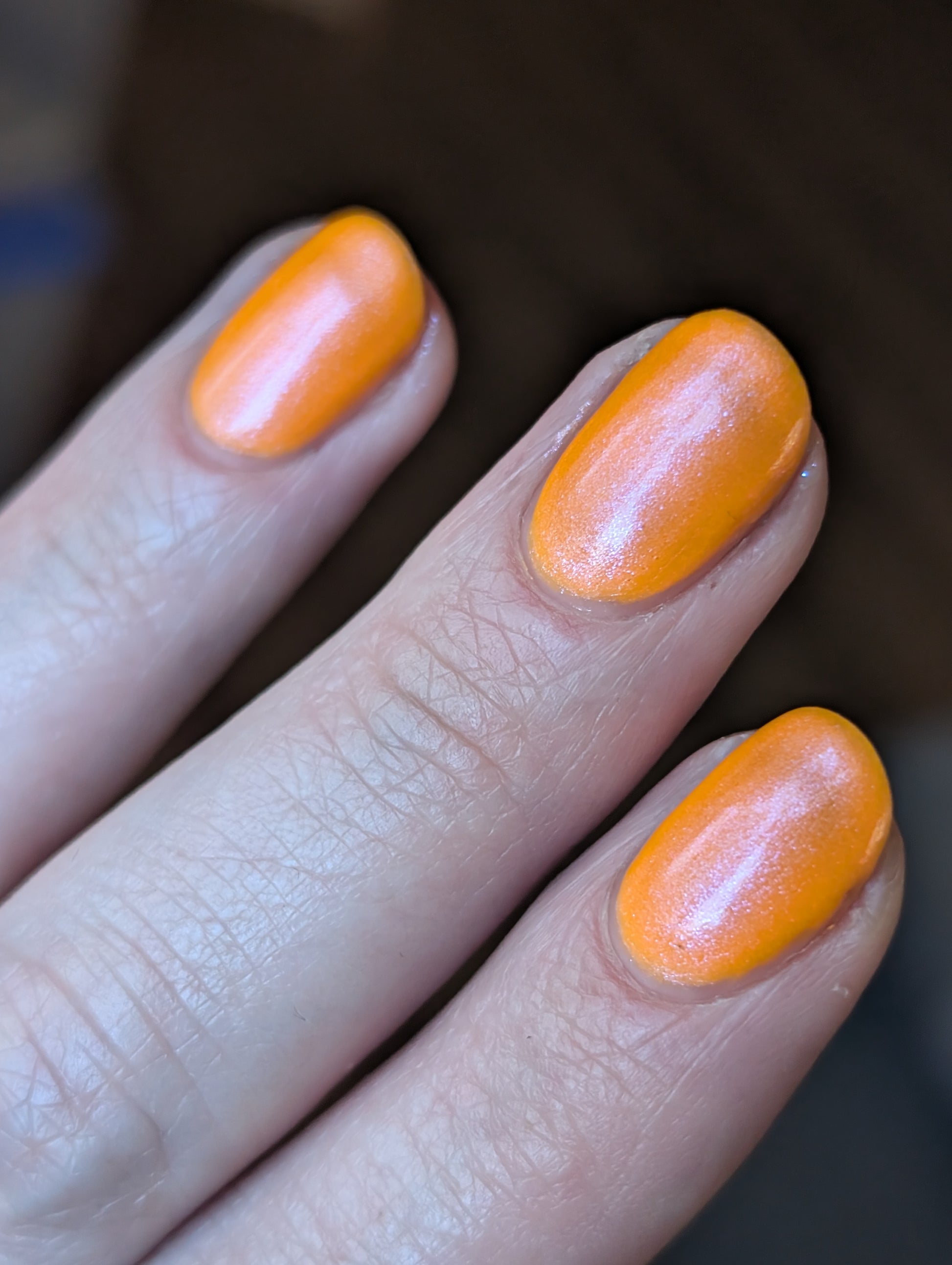 Kitsune’s Kiss is a neon orange nail lacquer with pink-purple shimmer. *free art sticker with first 25 purchases of this polish*