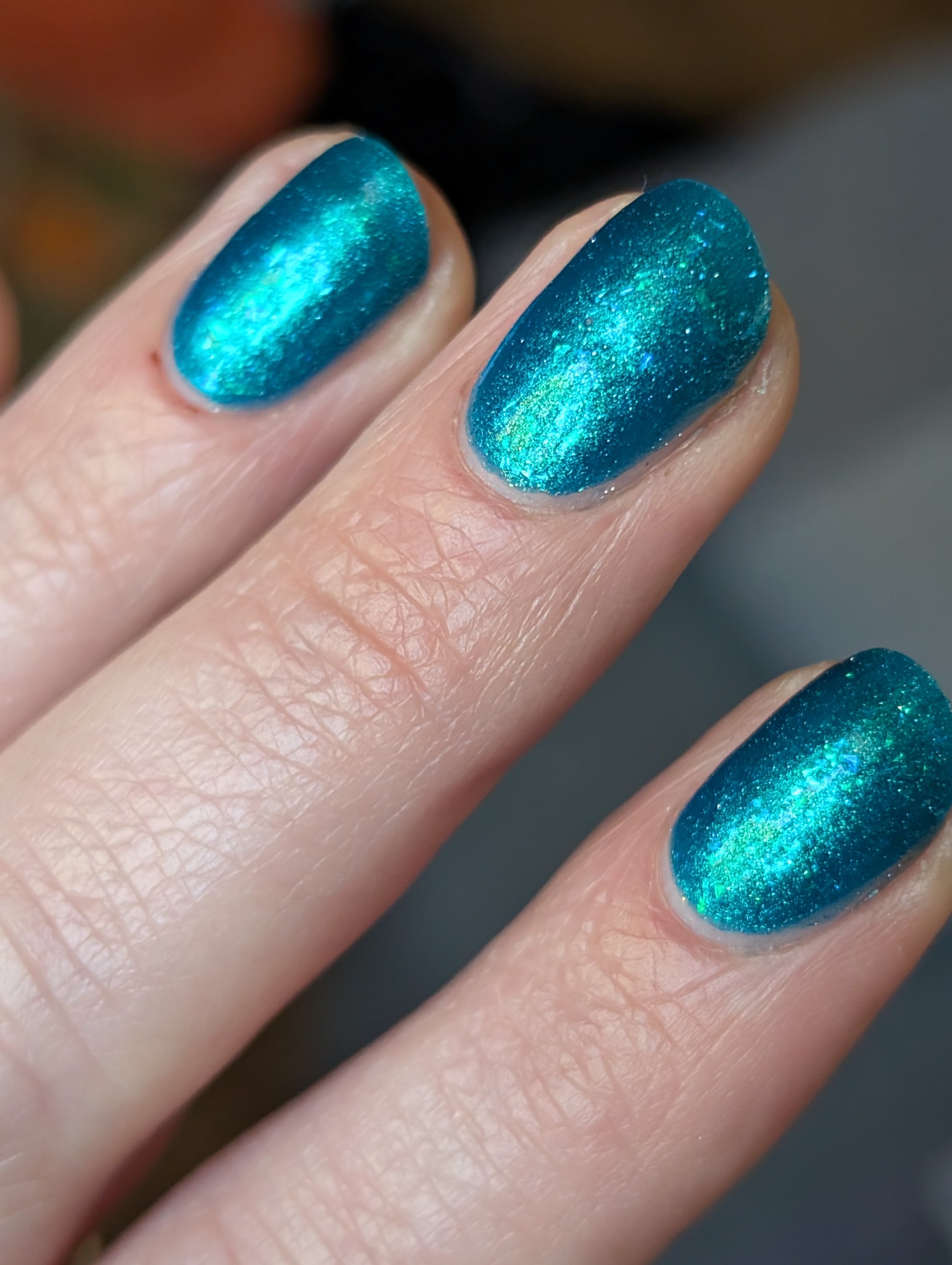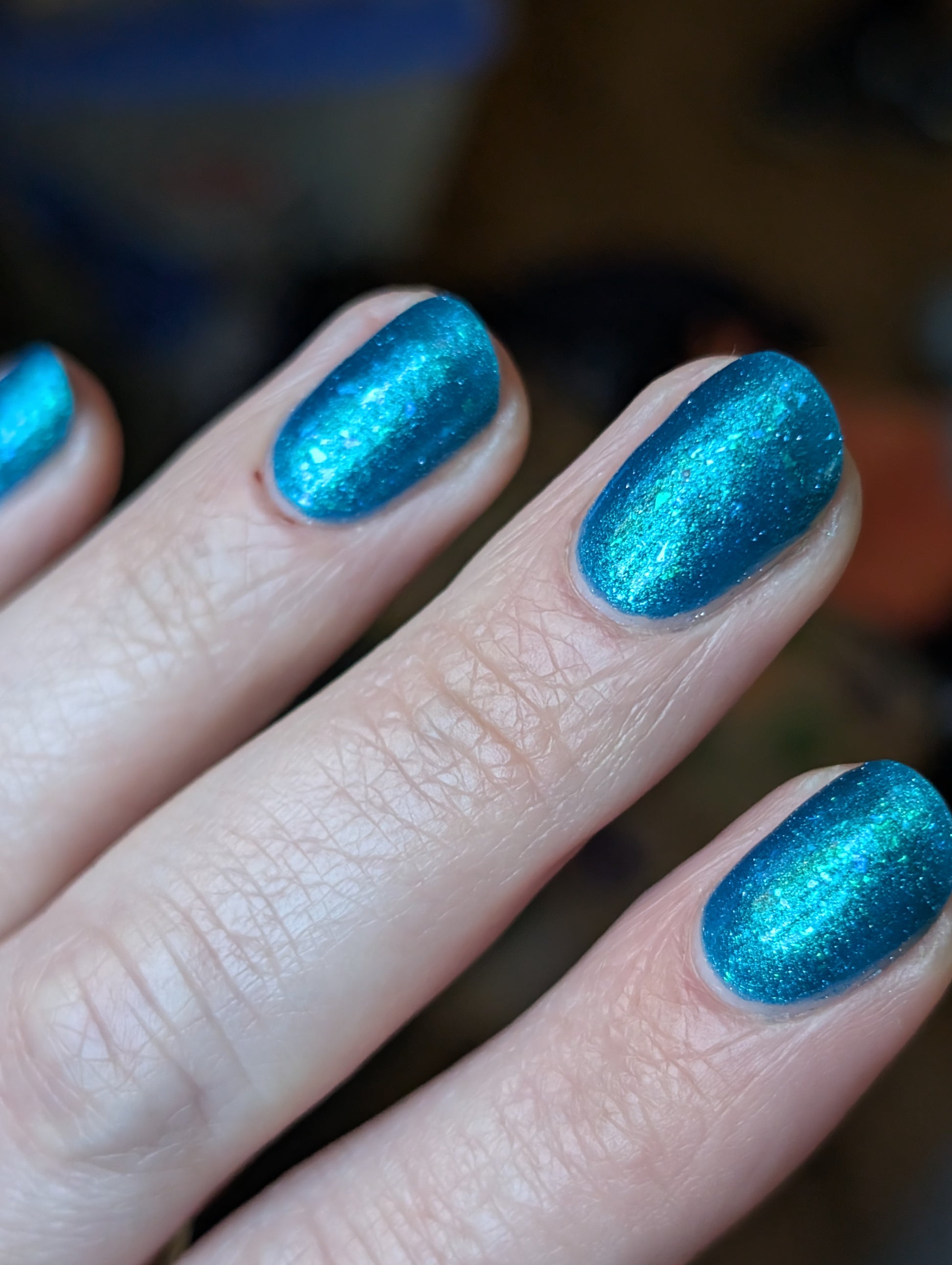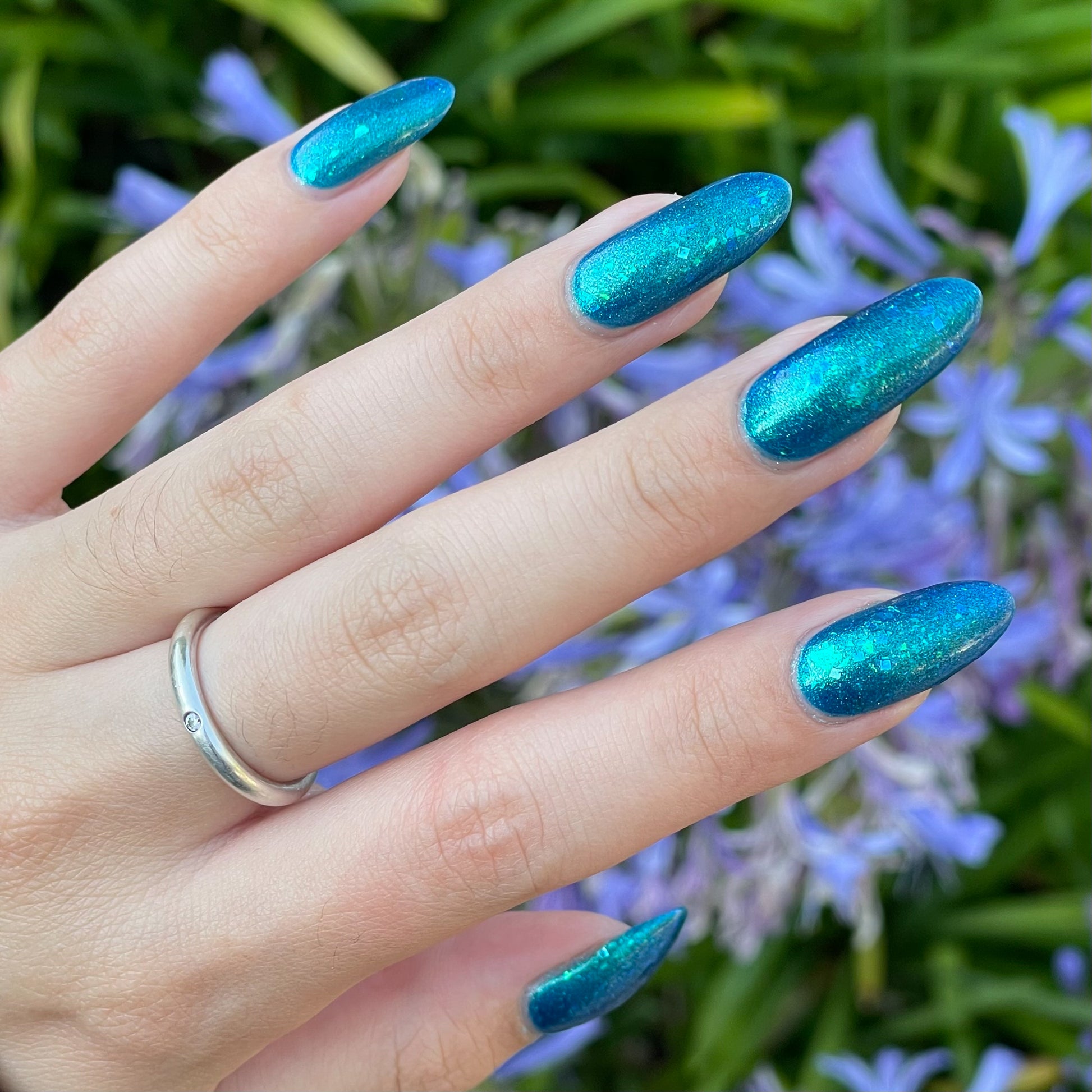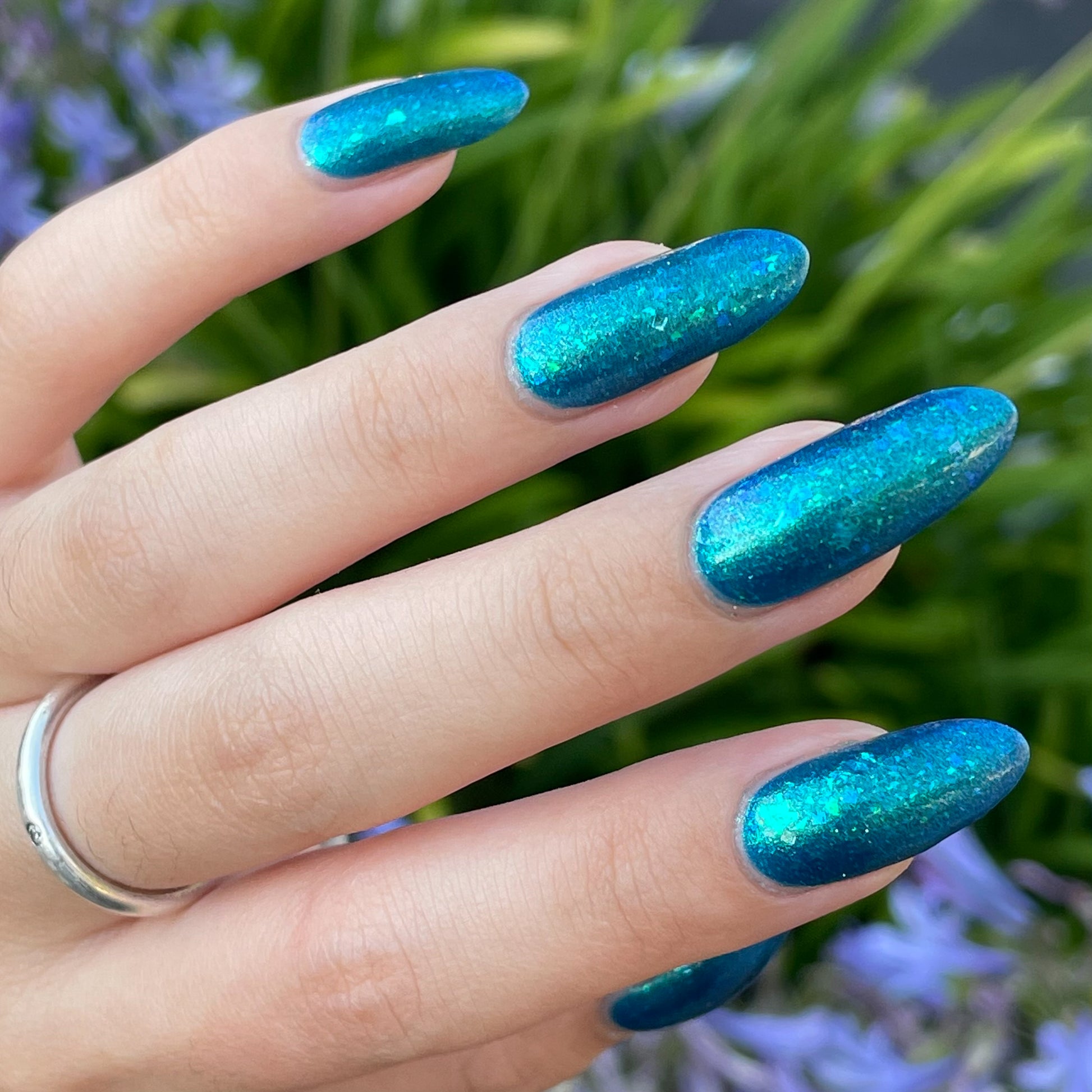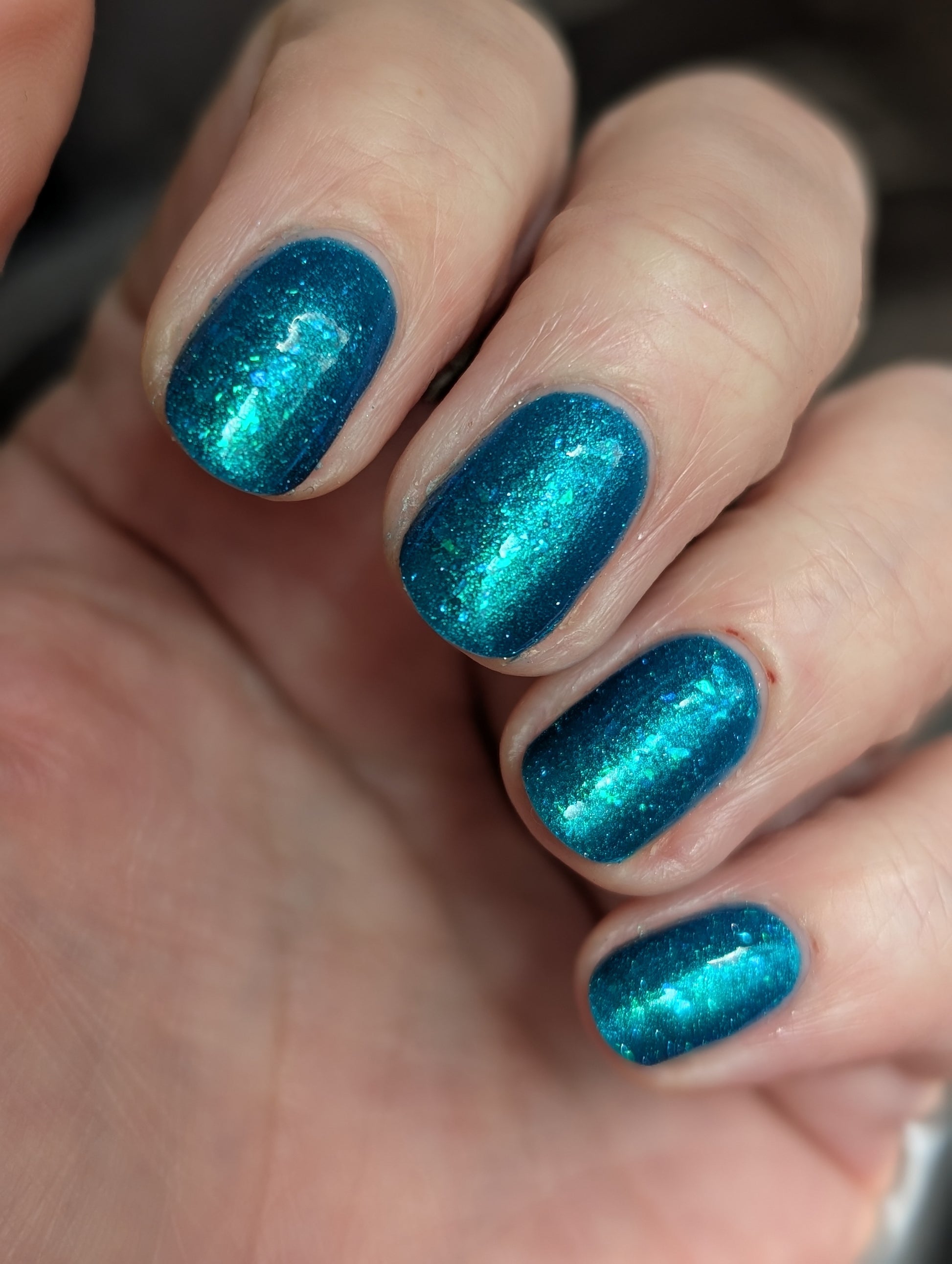 Mermaid Motel is a color shifting blue-green (teal) nail lacquer packed with flakes, shimmer and reflective glitter.