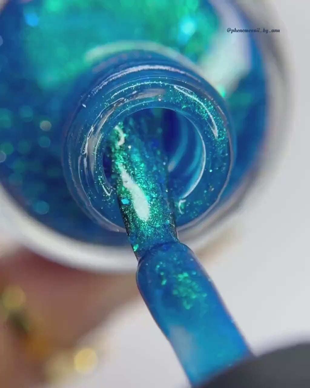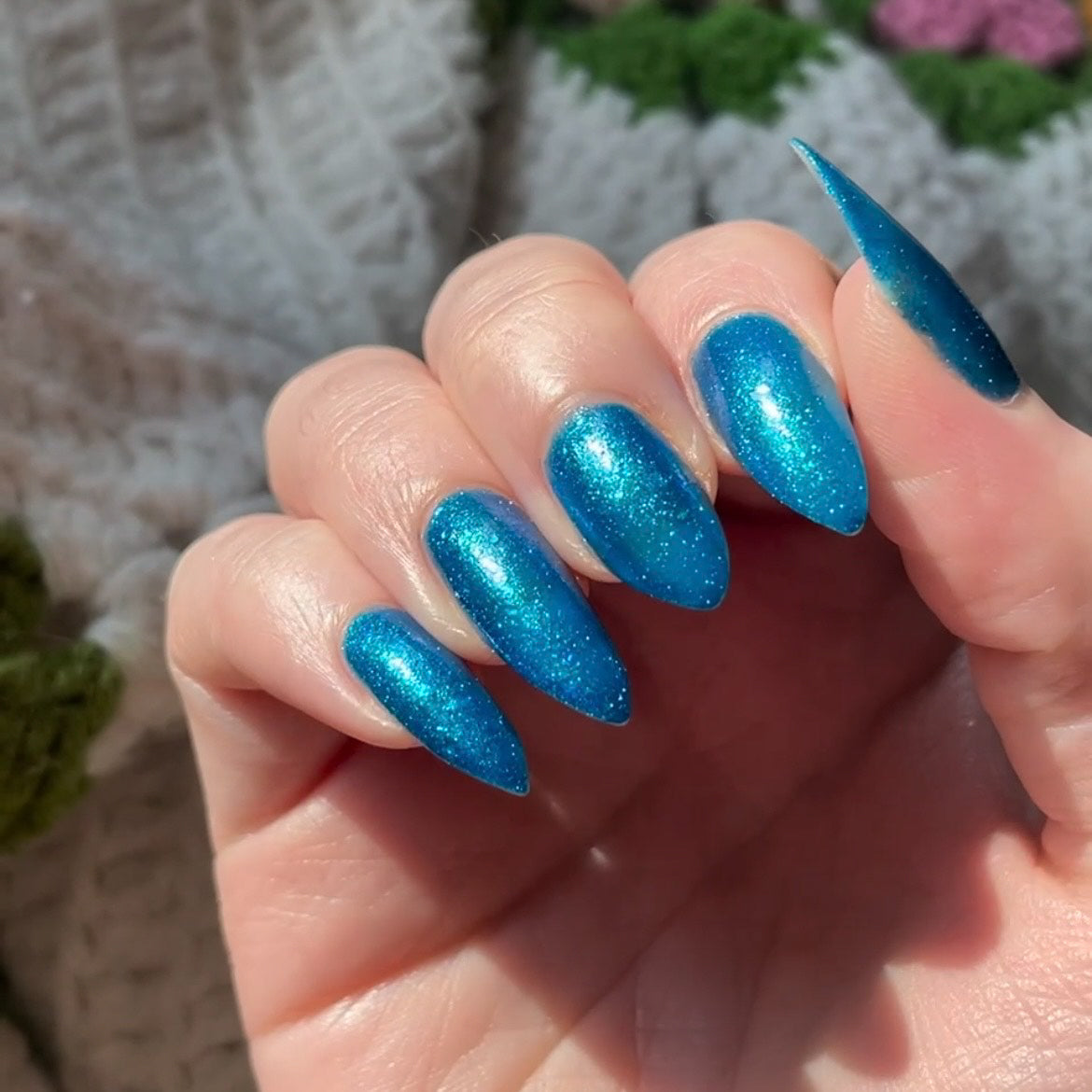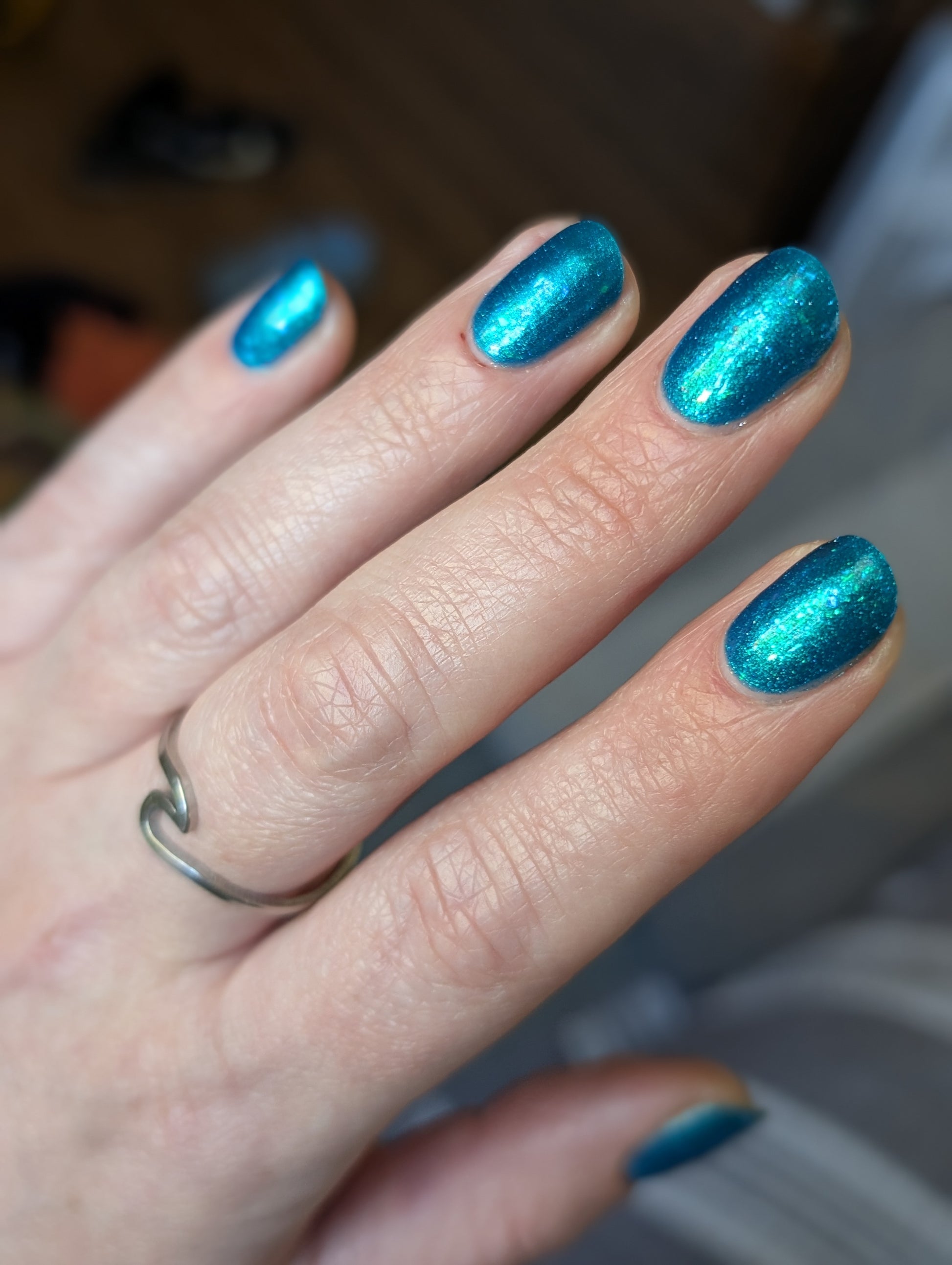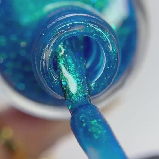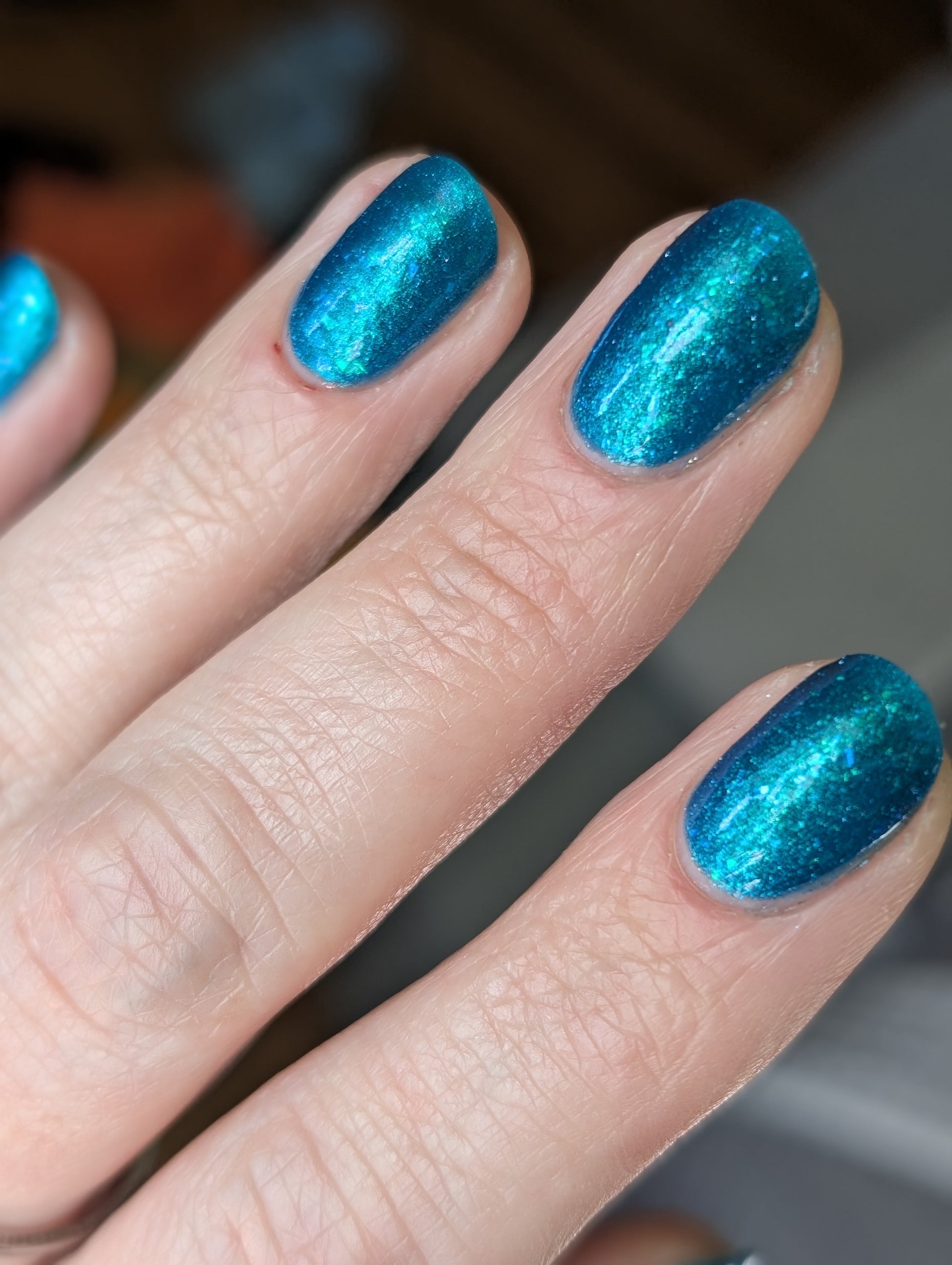 Mermaid Motel is a color shifting blue-green (teal) nail lacquer packed with flakes, shimmer and reflective glitter.