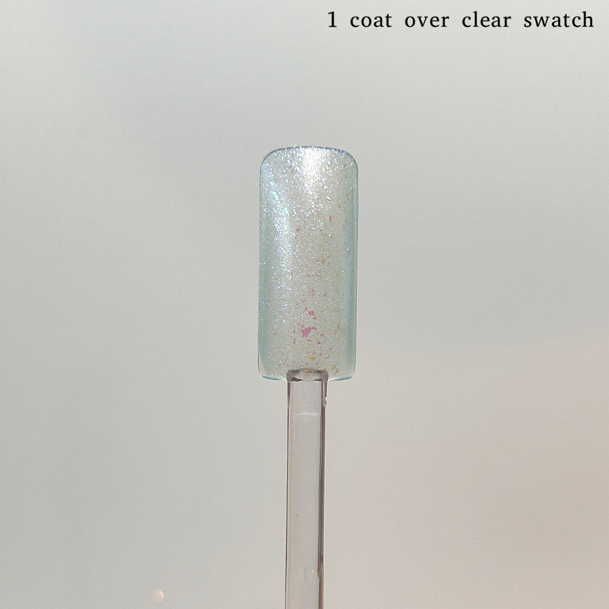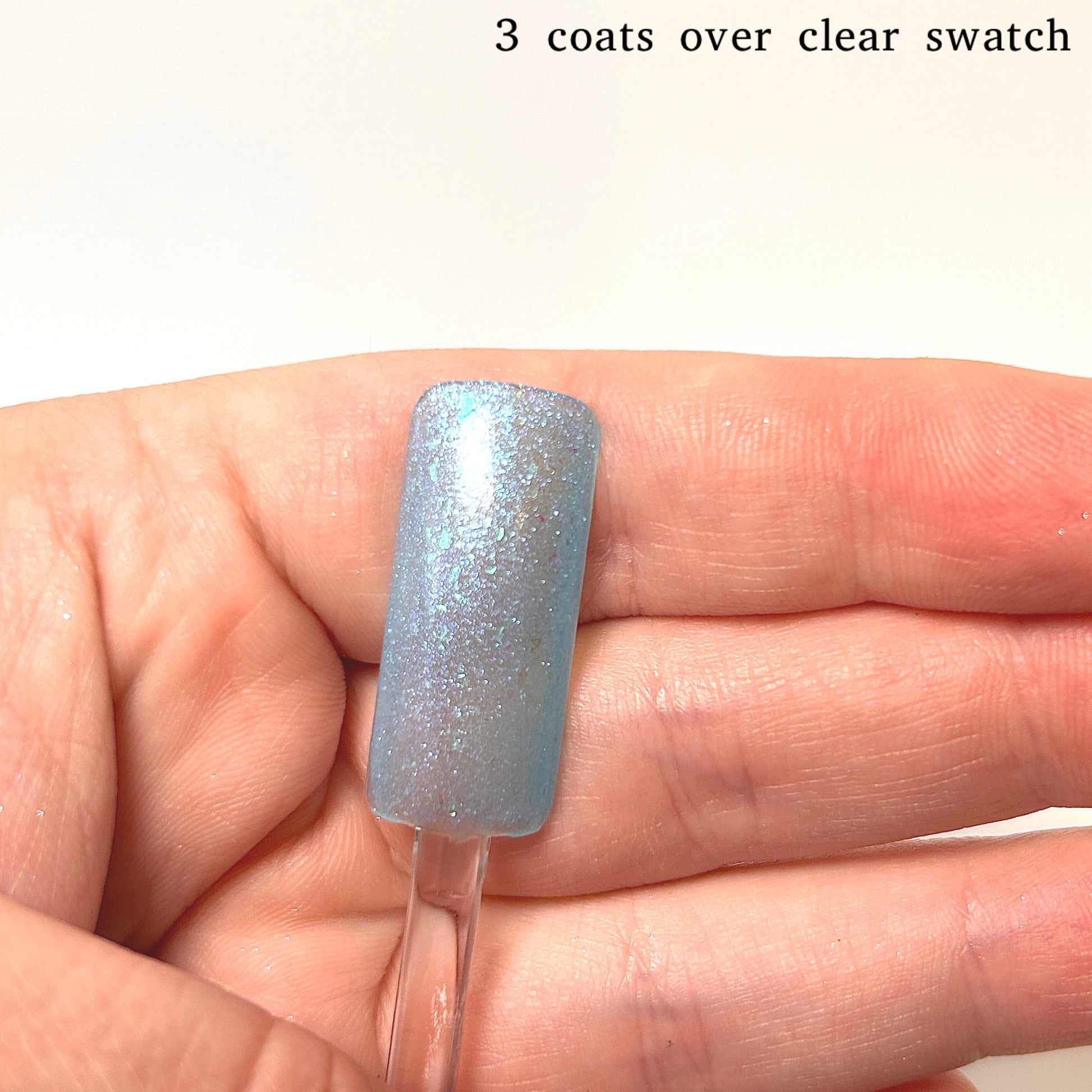 This is an “oops” batch of Mixing by Moonlight. My hand slipped while mixing and I added a a little too much blue! It’s still a sheer pale blue nail lacquer with blue shimmer and iridescent flakes that glows aqua in the dark. I don’t want to waste this beautiful polish so I’m offering it as a bluer alternative to the OG Mixing by Moonlight.