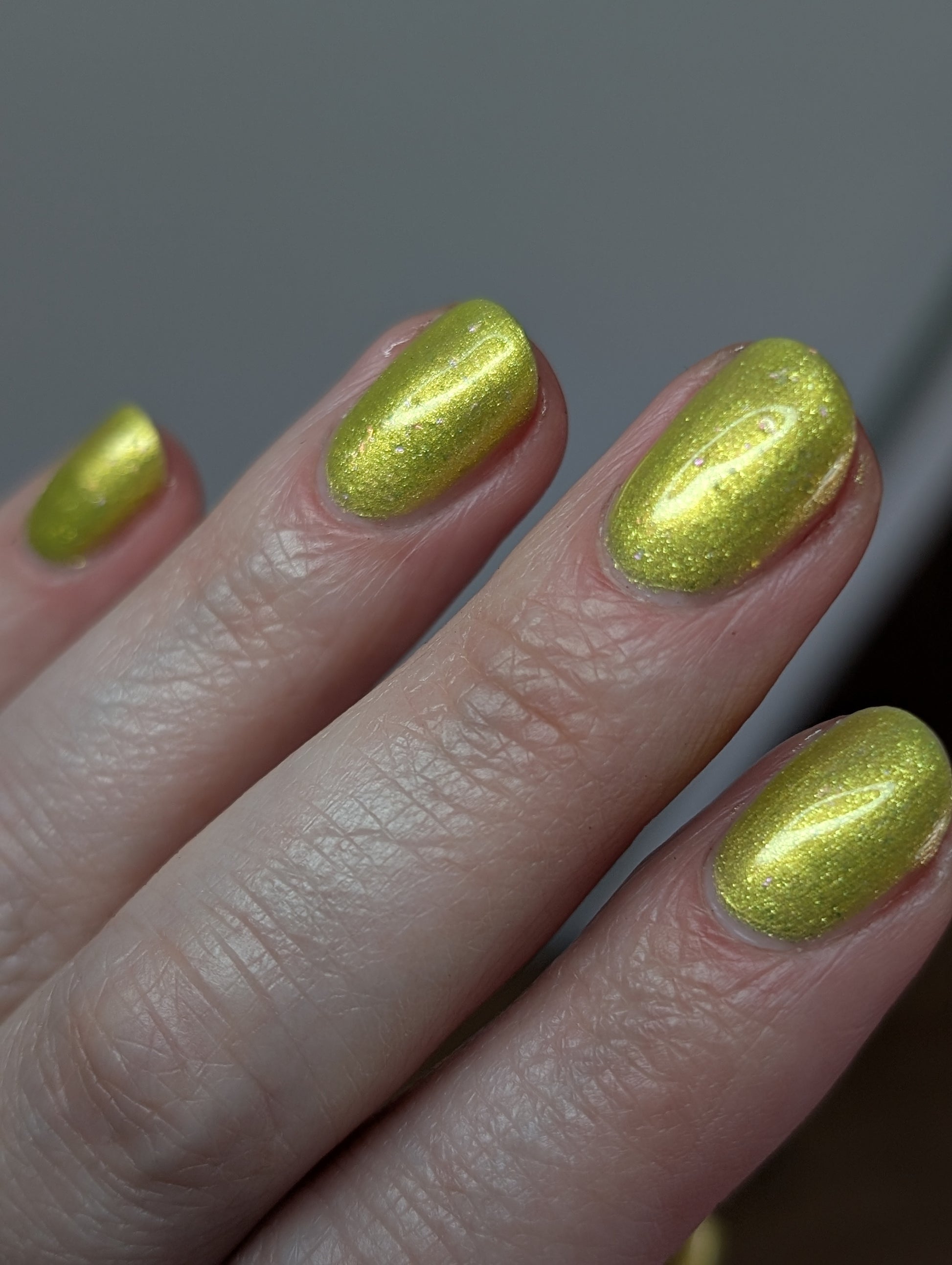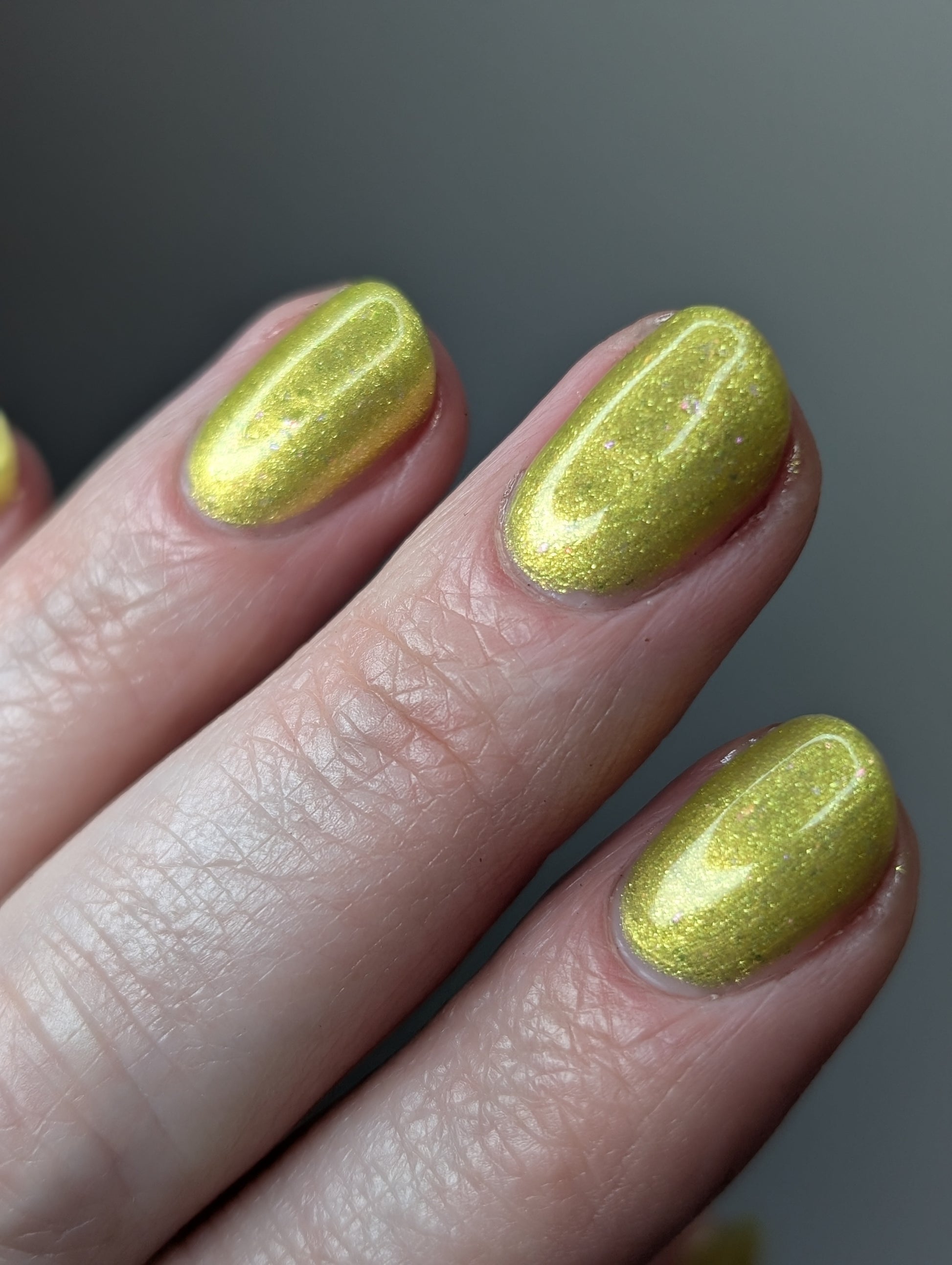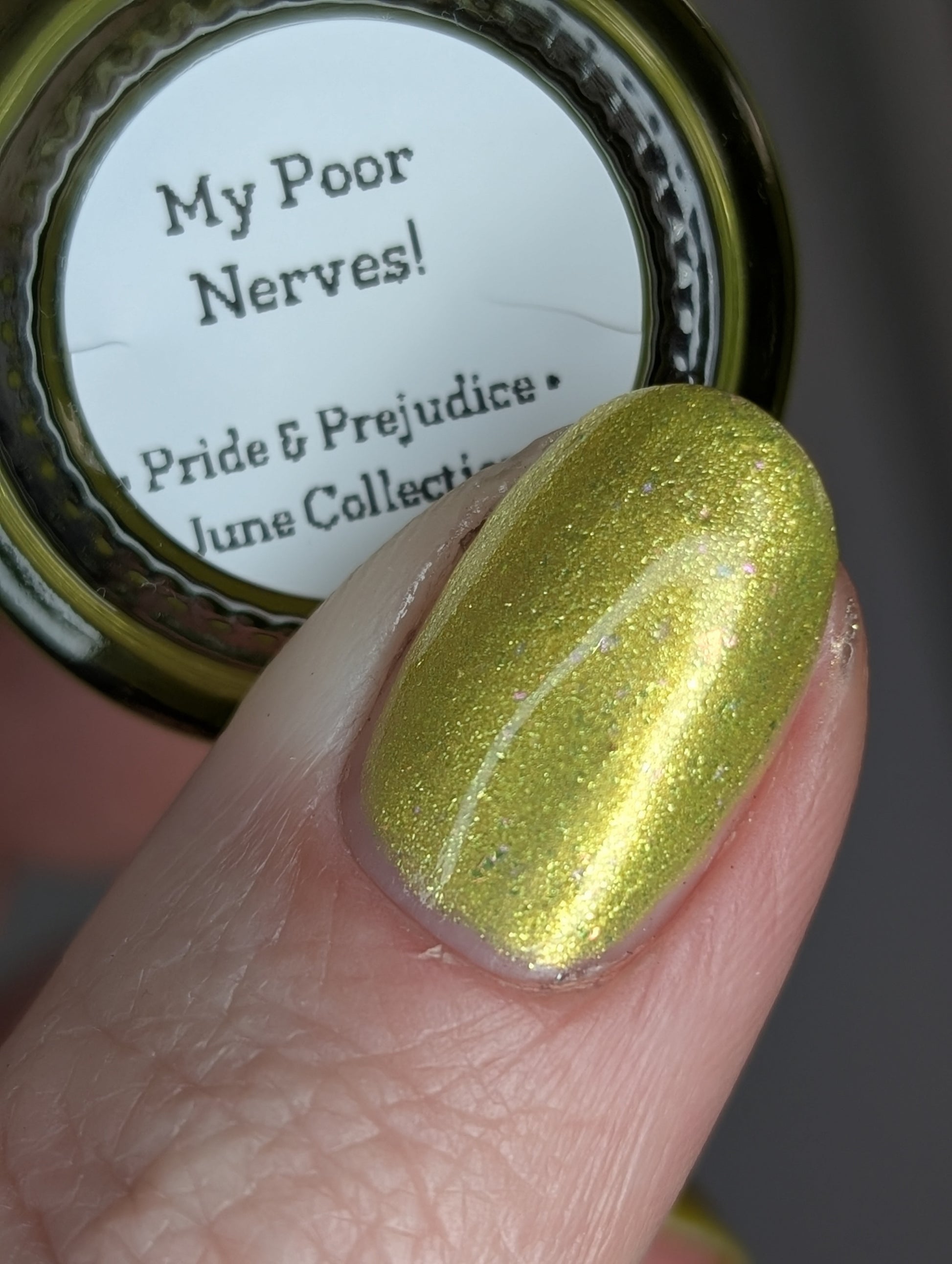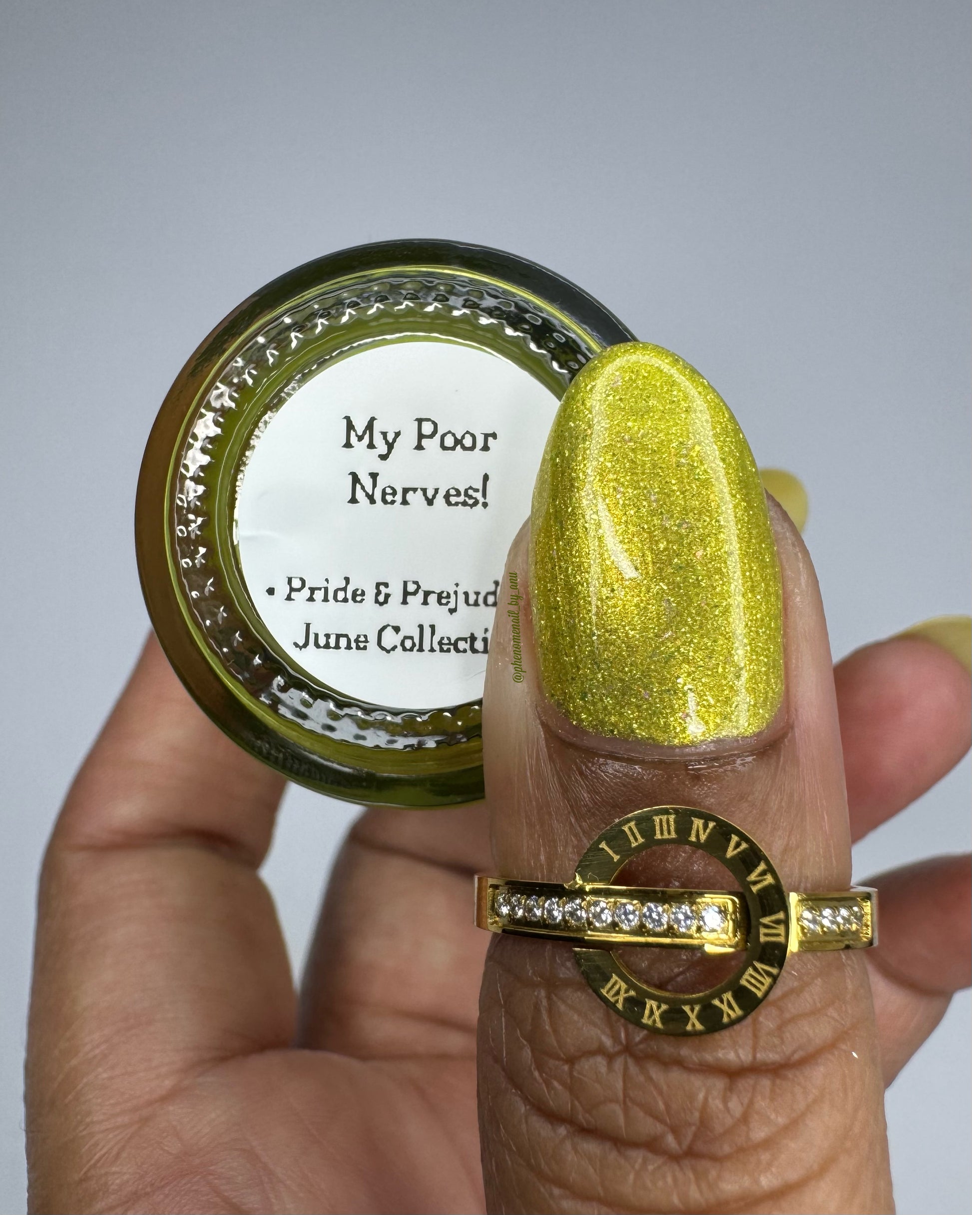 My Poor Nerves! is a yellow nail polish packed with pale green metallic micro flakes and iridescent flakes. Overall color appears chartreuse.