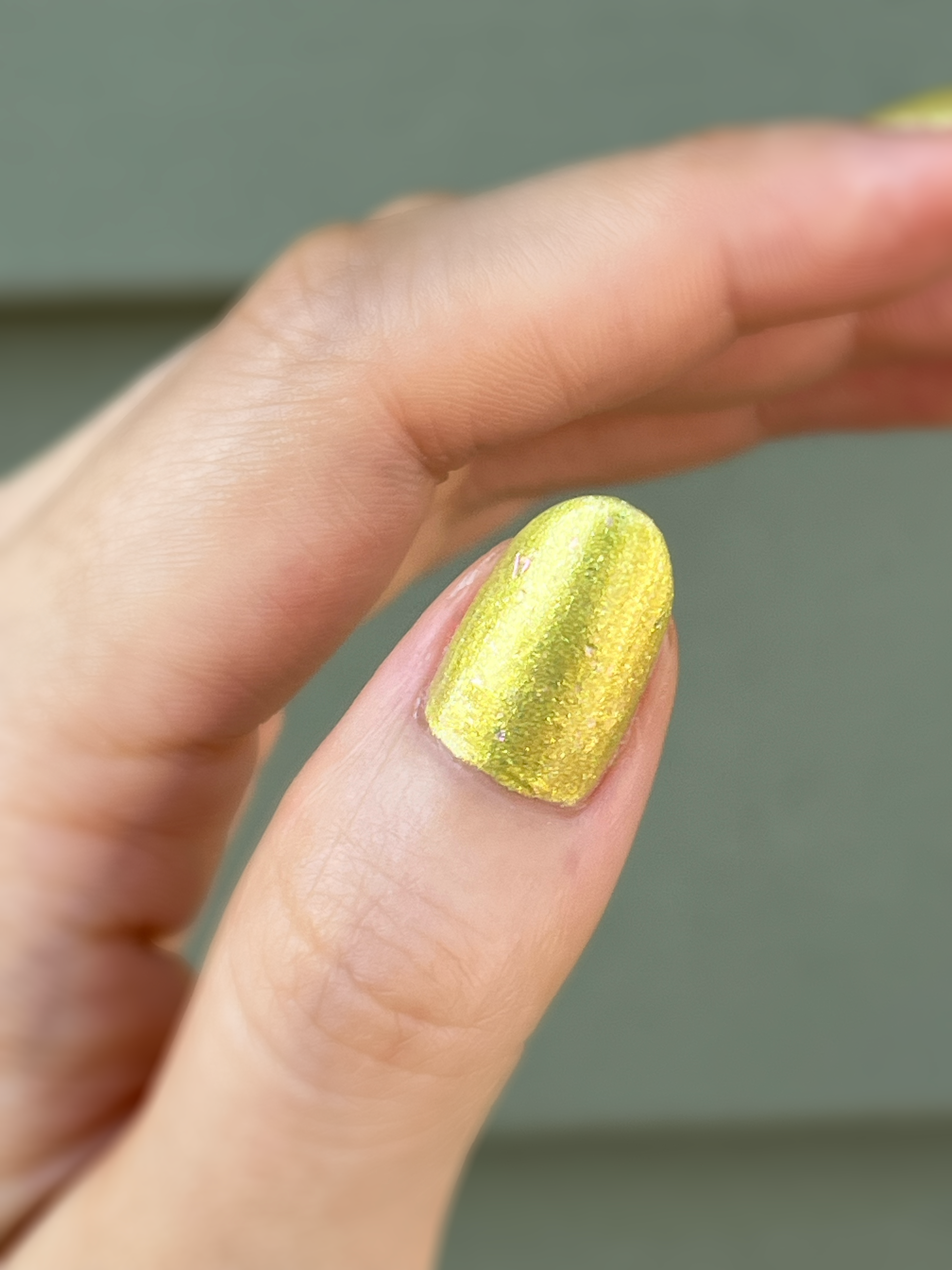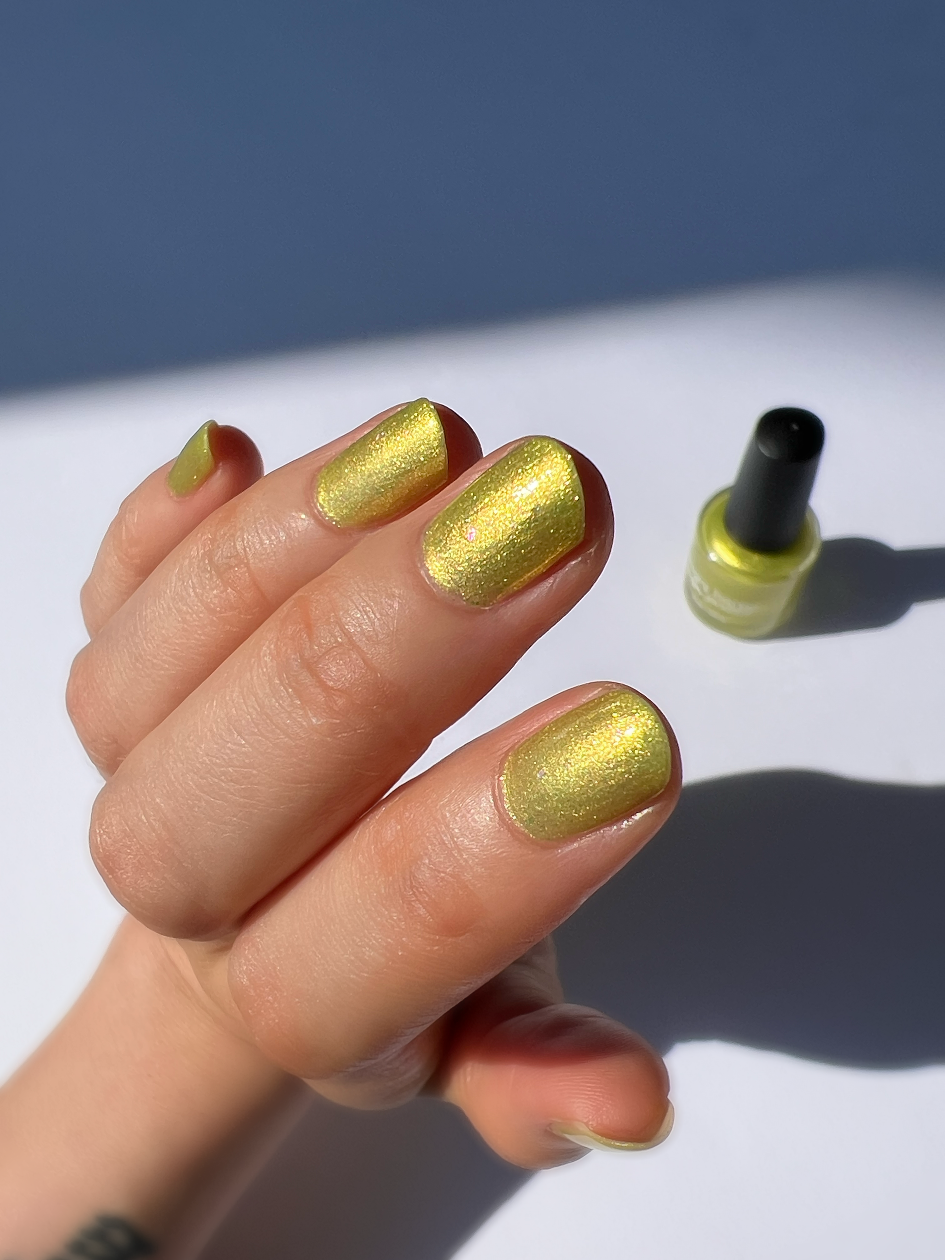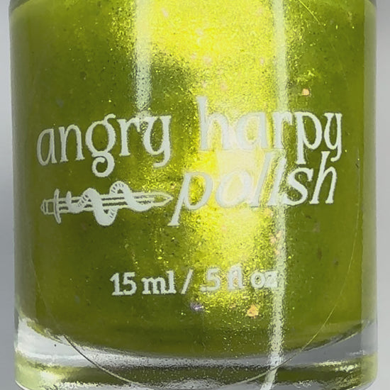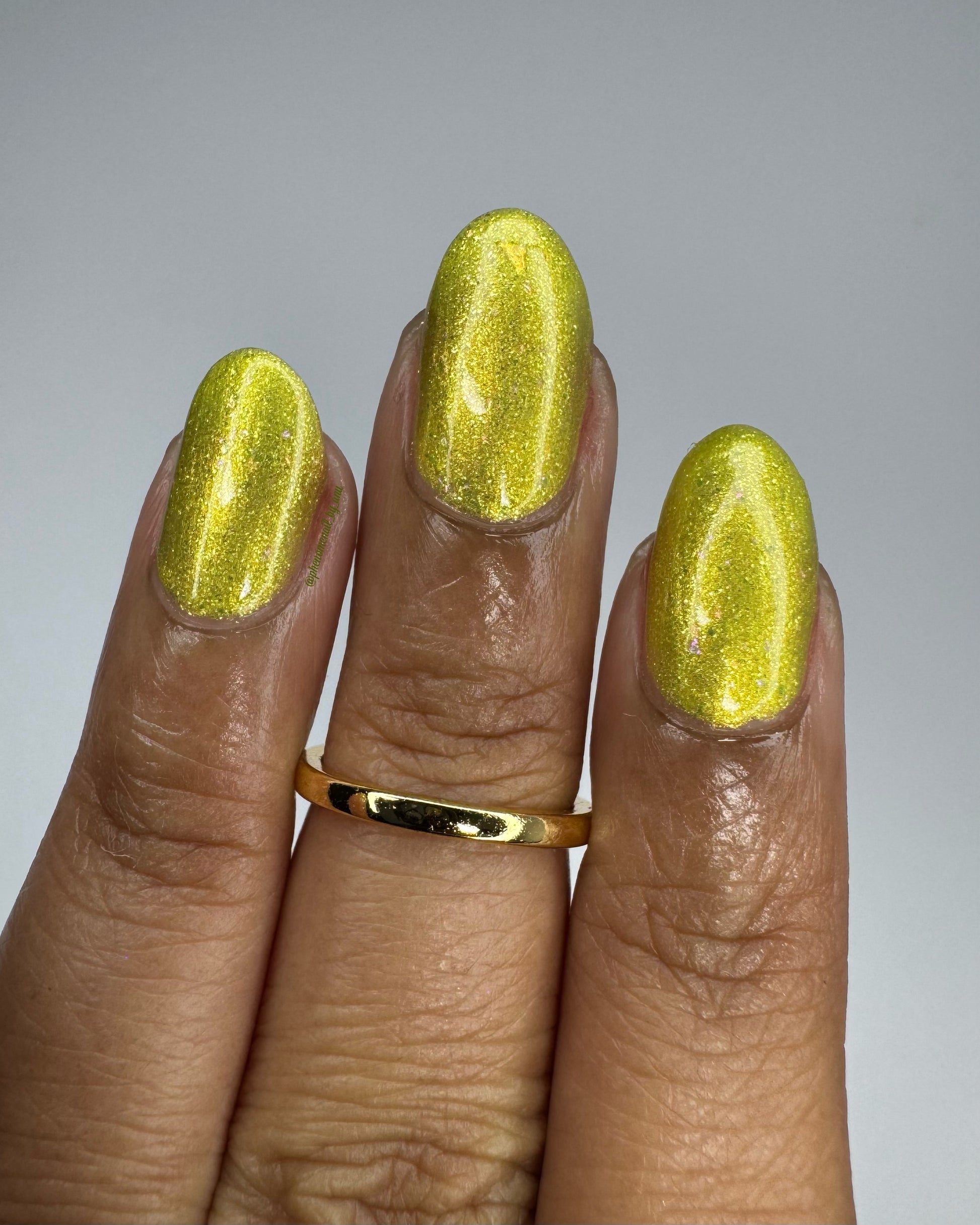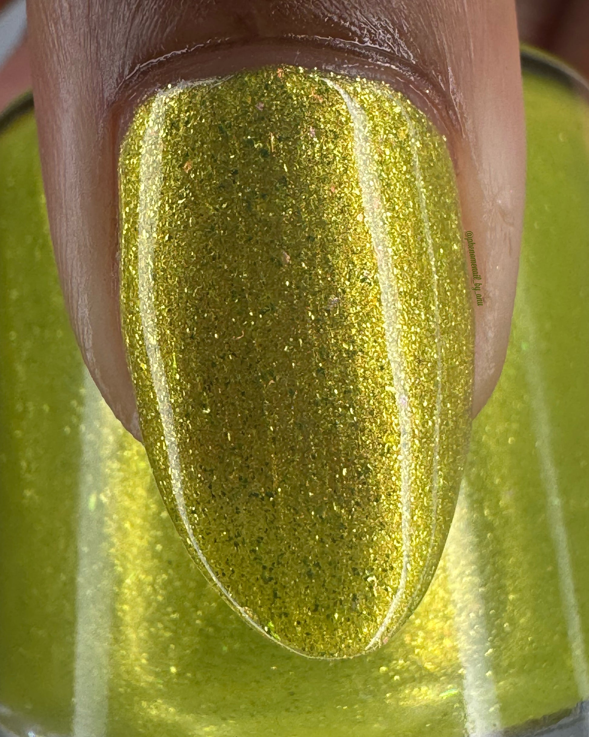 My Poor Nerves! is a yellow nail polish packed with pale green metallic micro flakes and iridescent flakes. Overall color appears chartreuse.