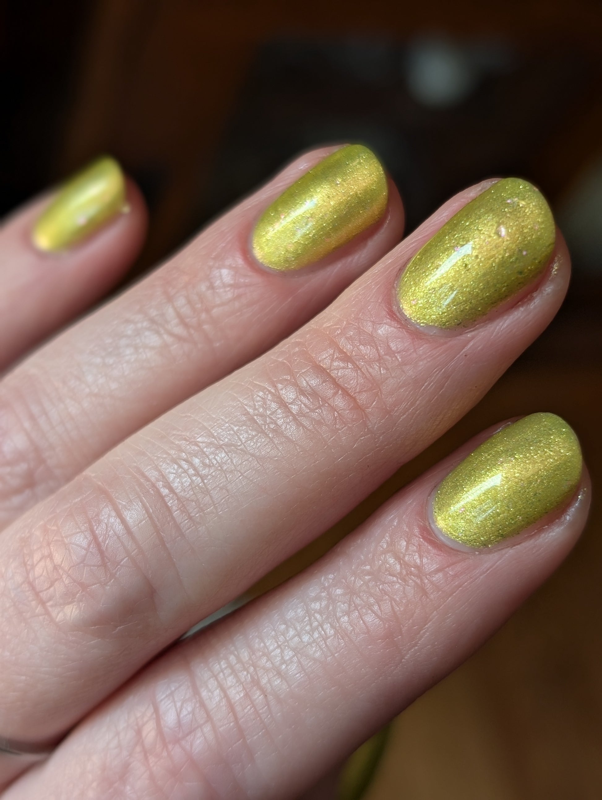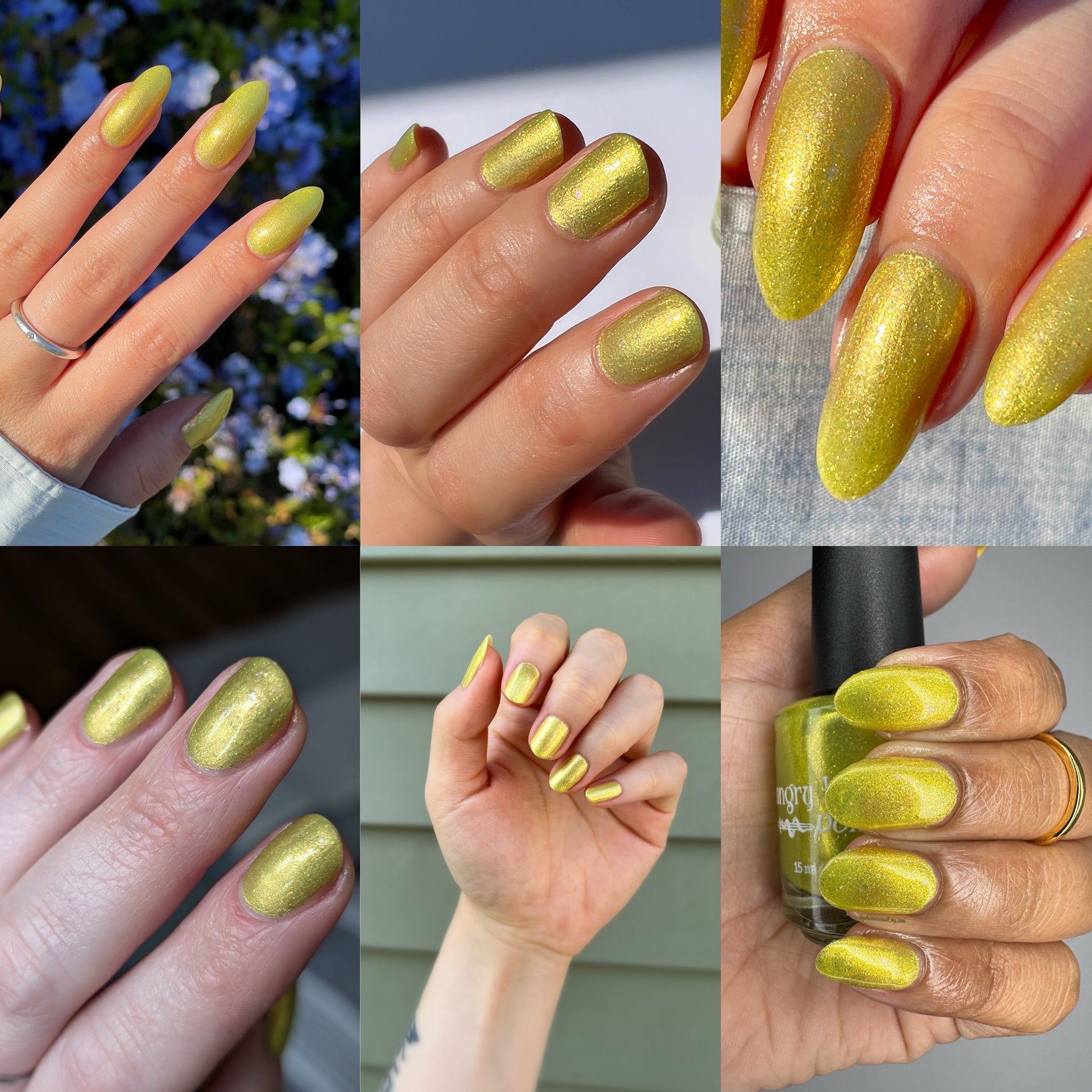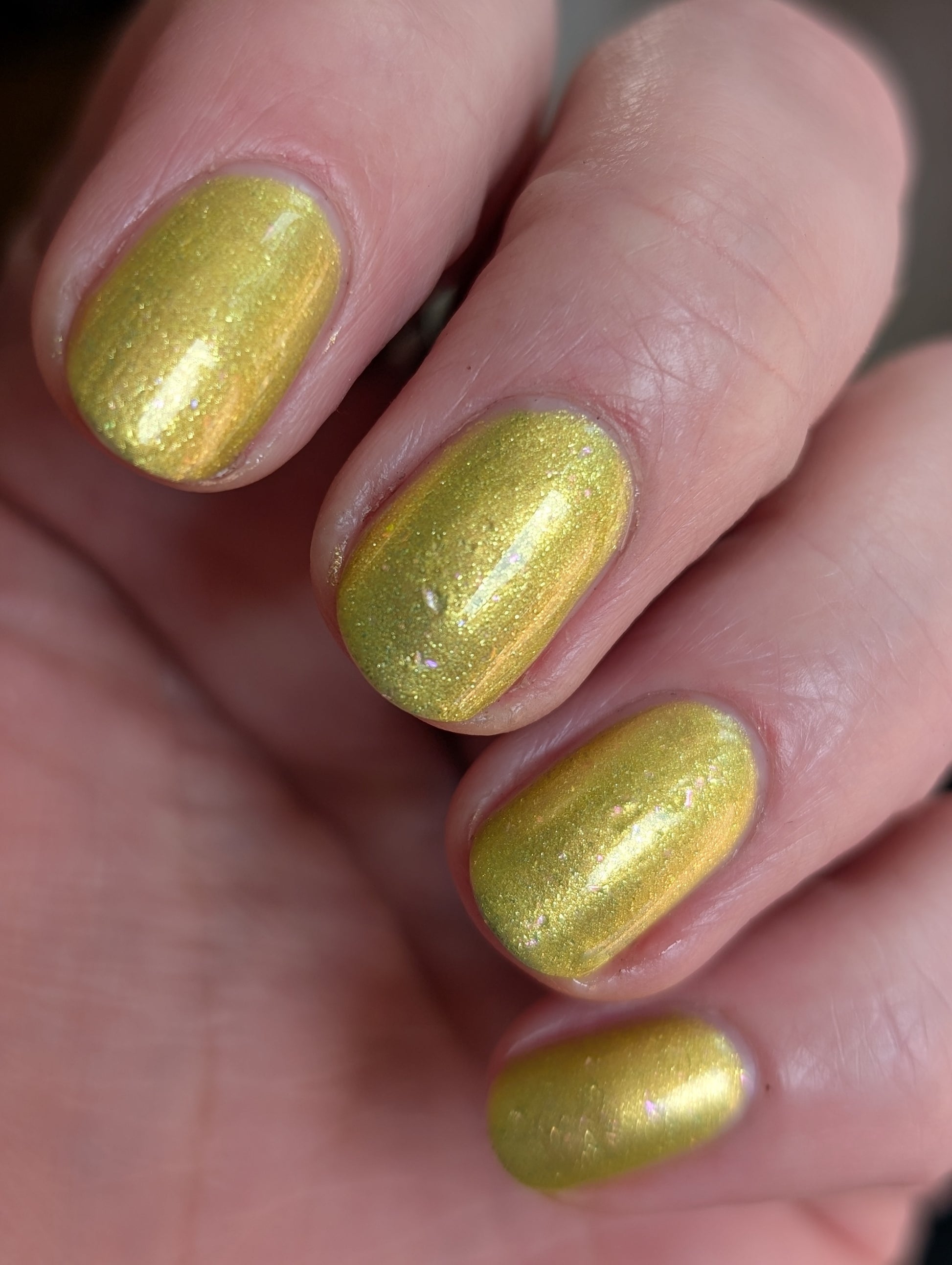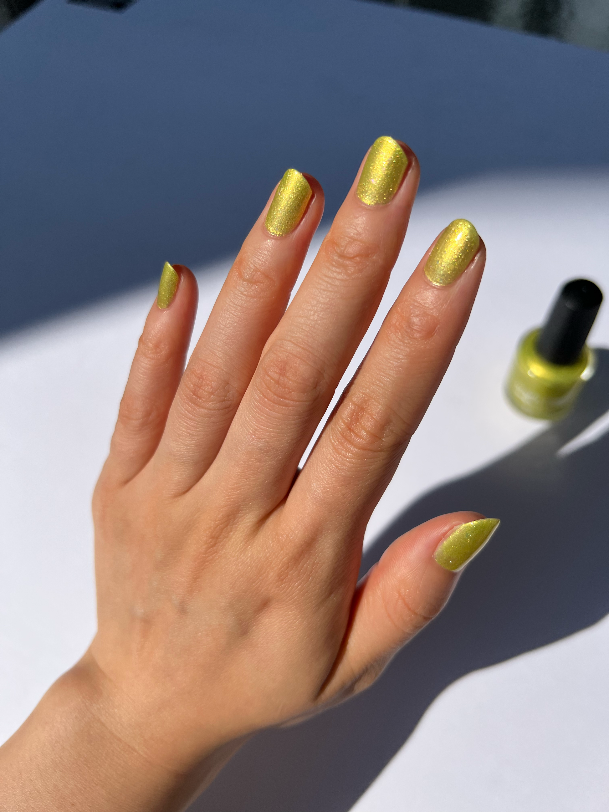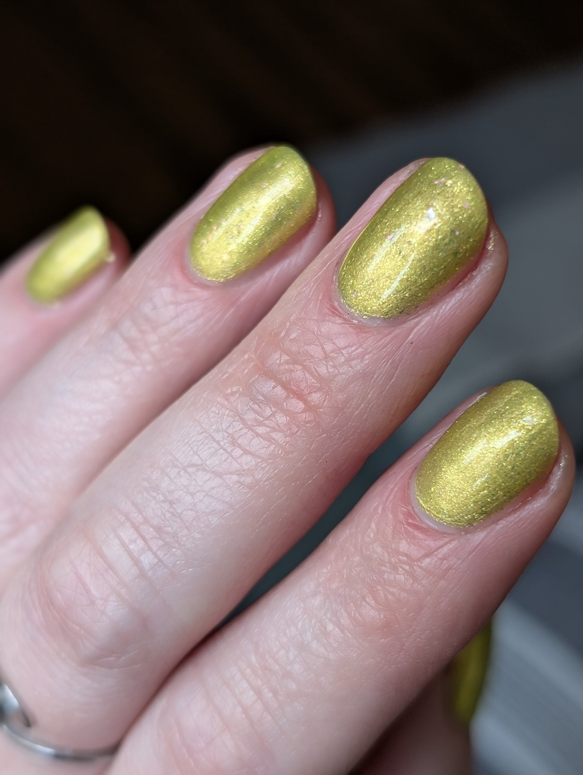 My Poor Nerves! is a yellow nail polish packed with pale green metallic micro flakes and iridescent flakes. Overall color appears chartreuse.