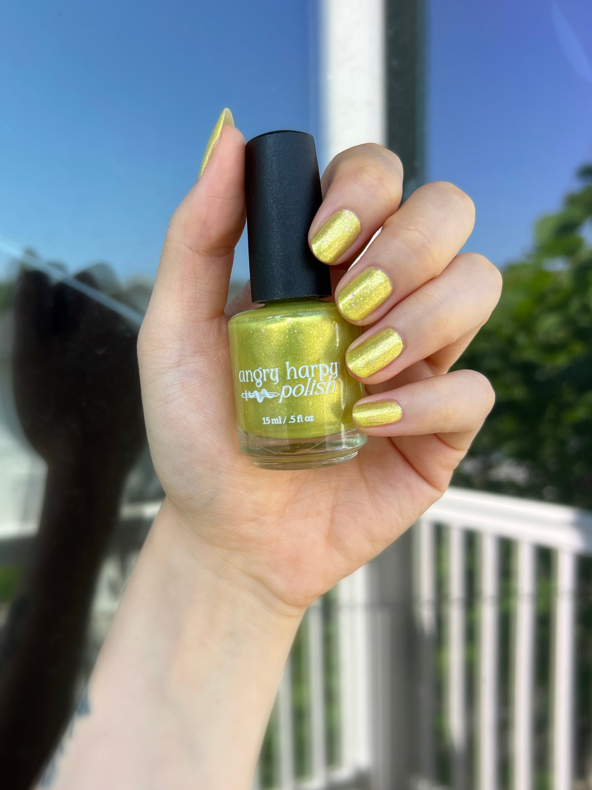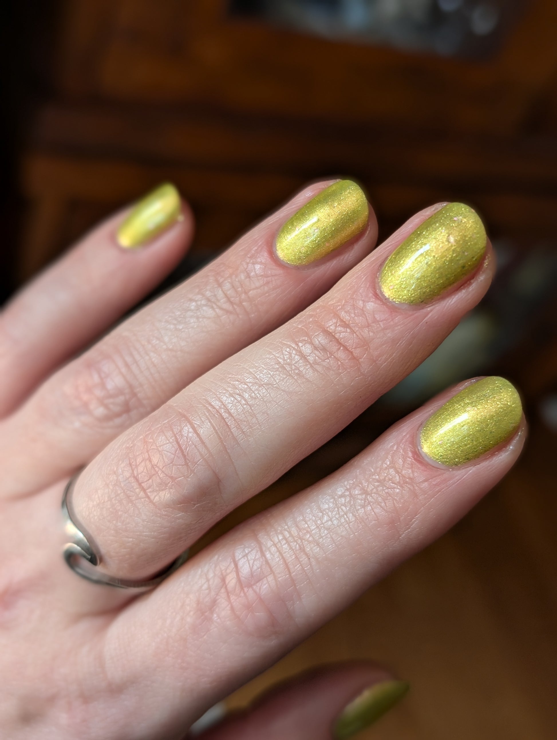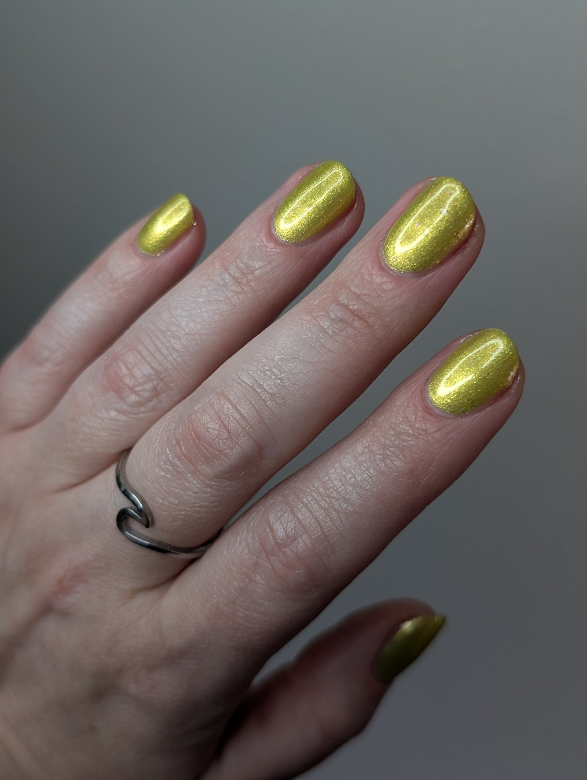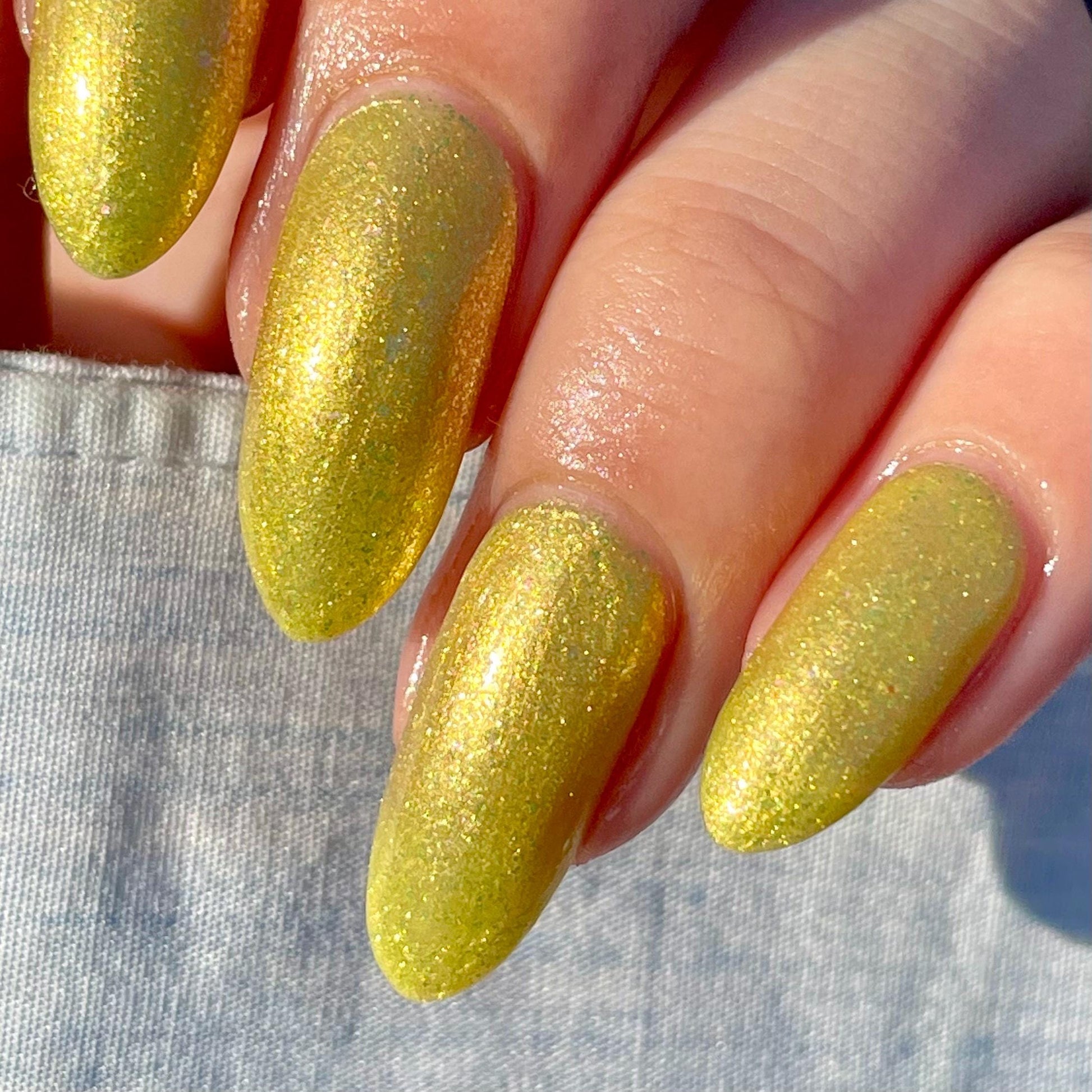 My Poor Nerves! is a yellow nail polish packed with pale green metallic micro flakes and iridescent flakes. Overall color appears chartreuse.