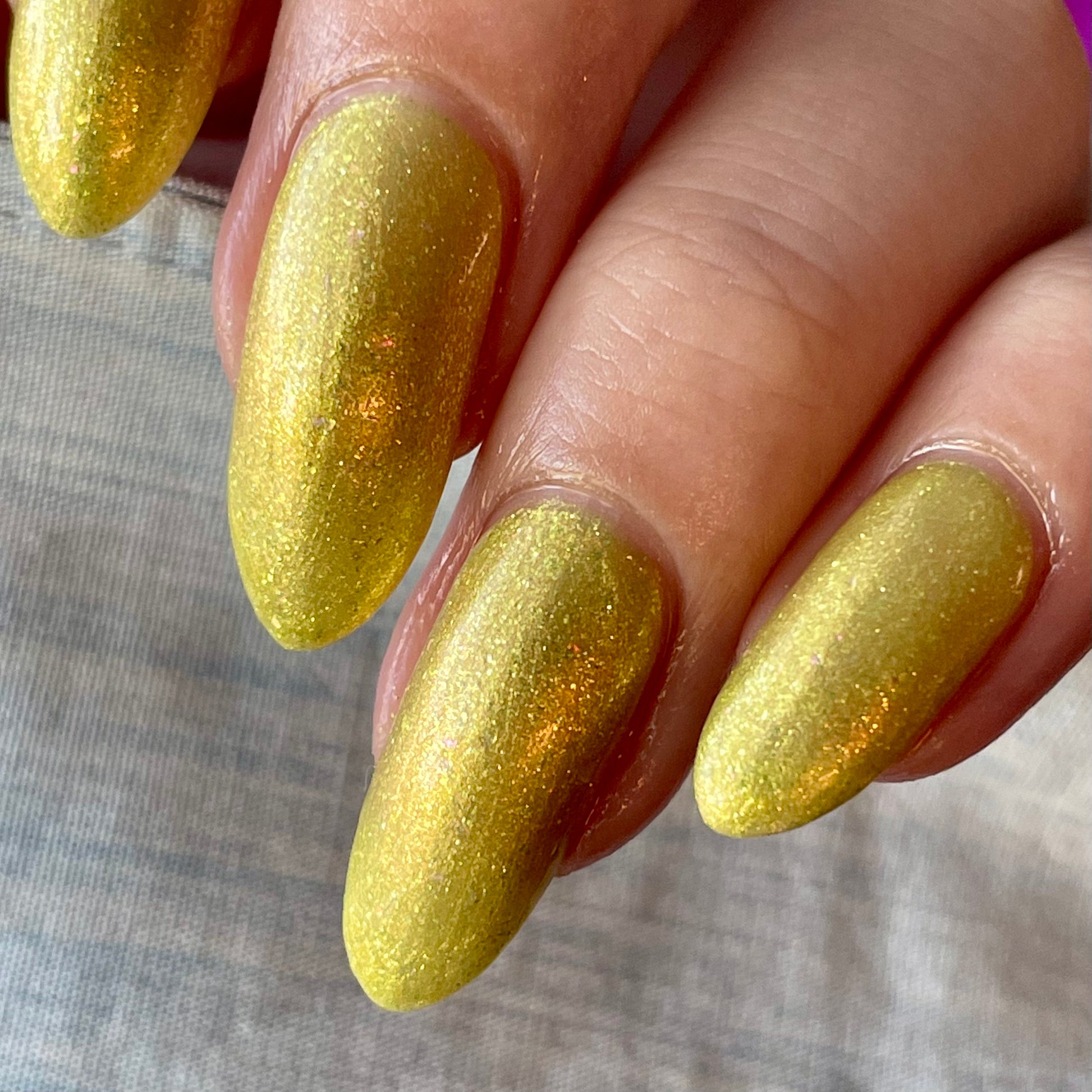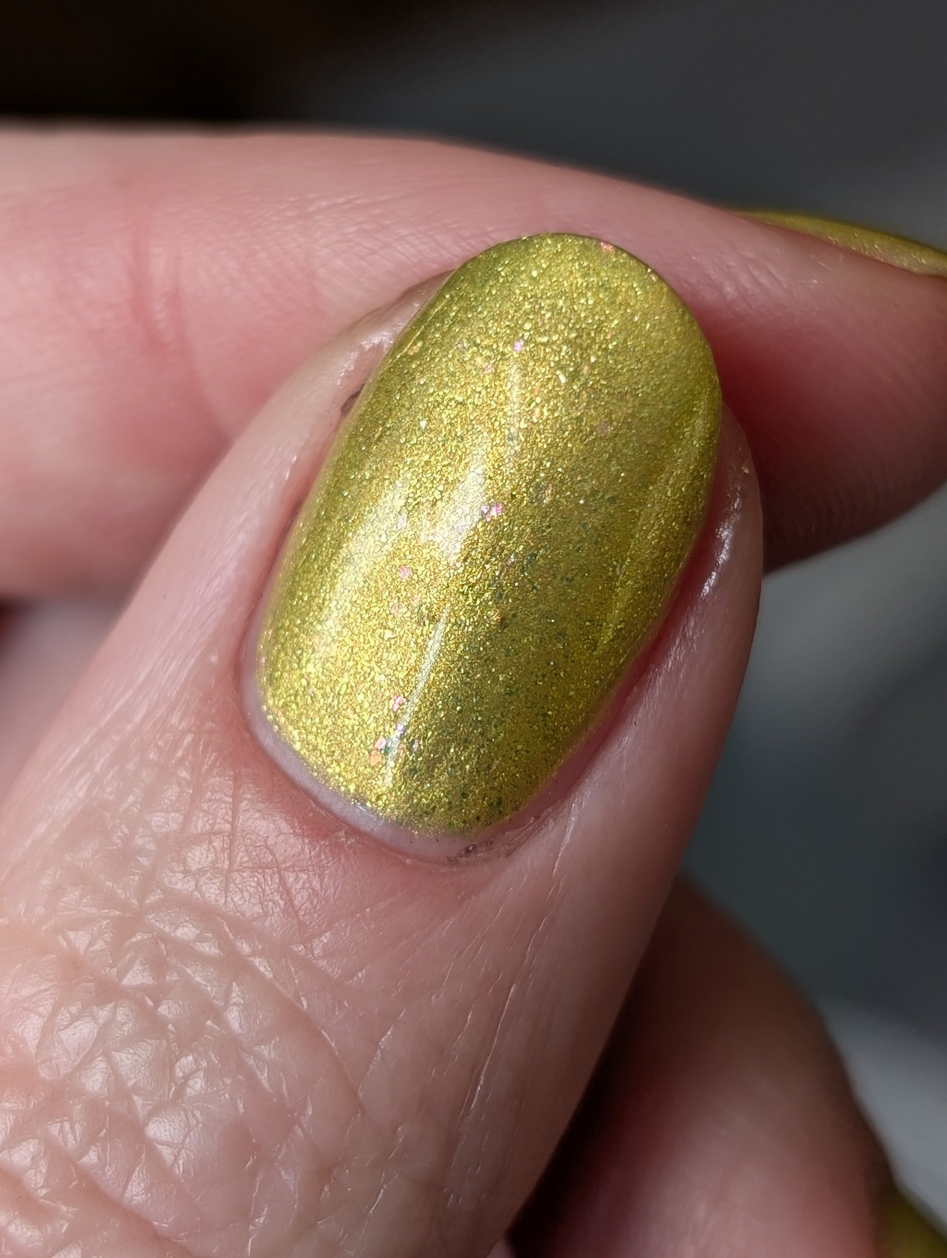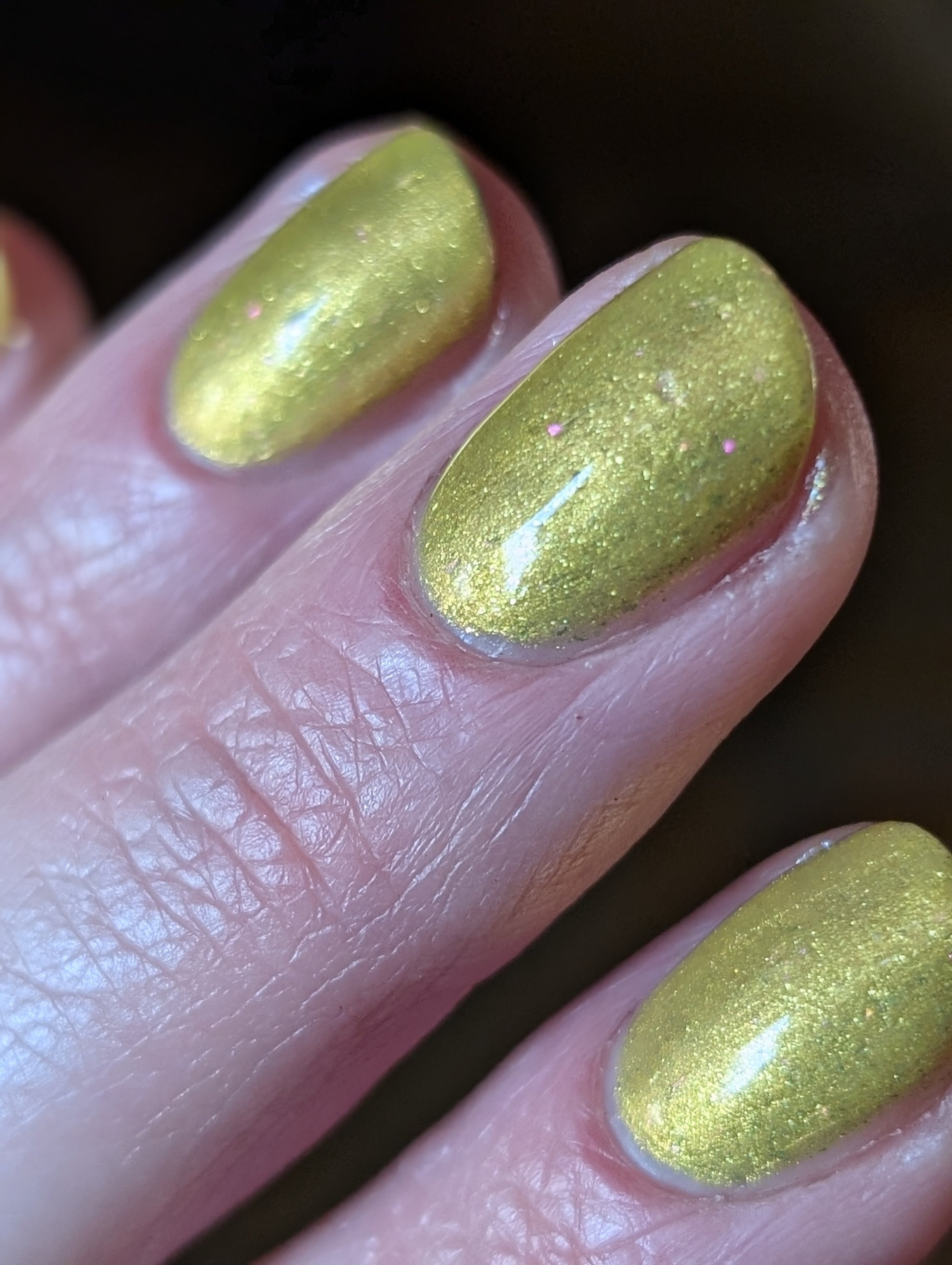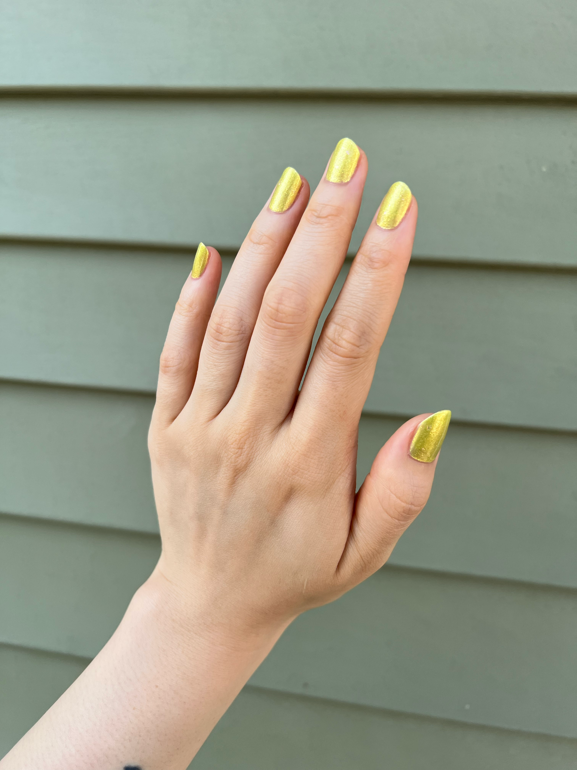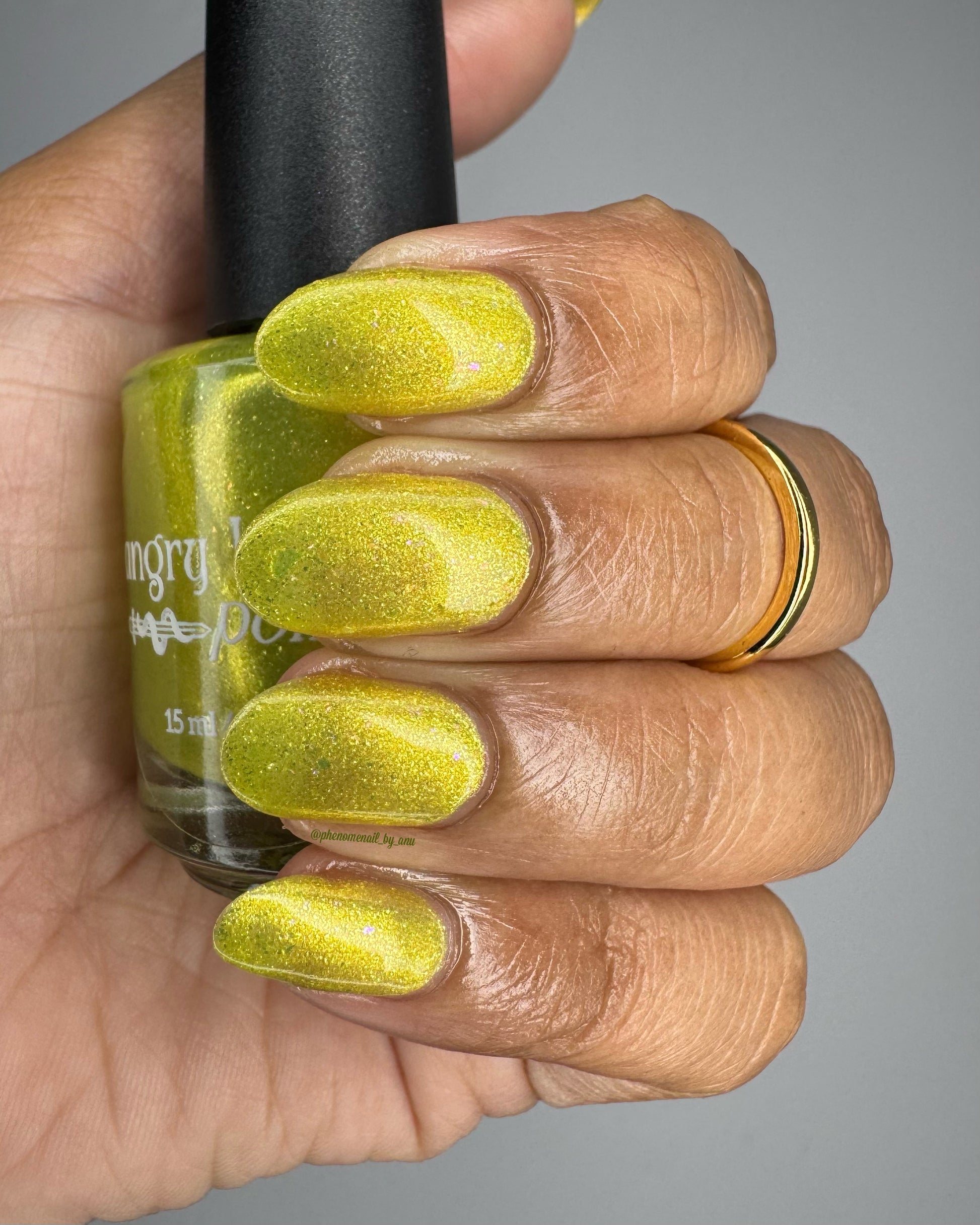 My Poor Nerves! is a yellow nail polish packed with pale green metallic micro flakes and iridescent flakes. Overall color appears chartreuse.