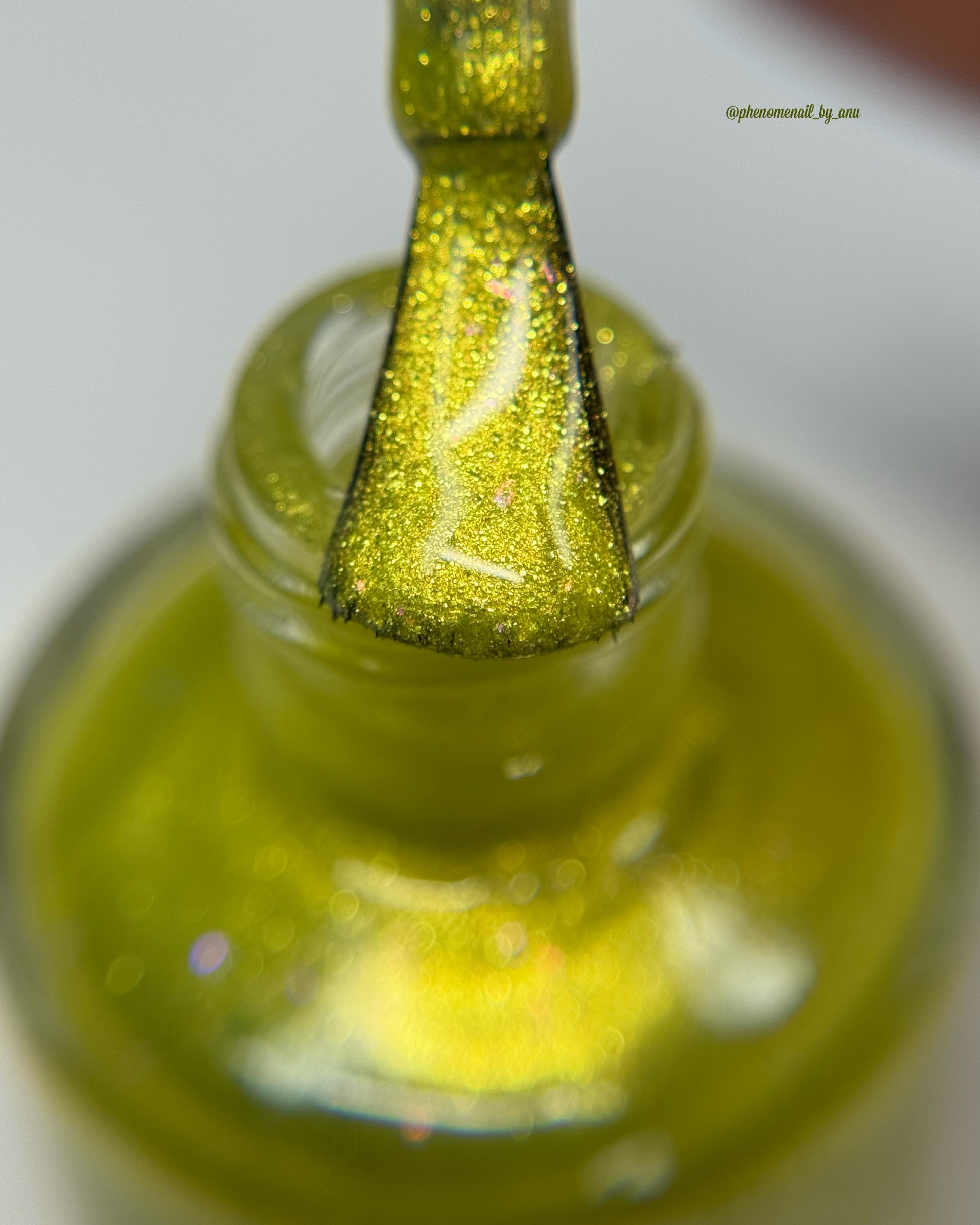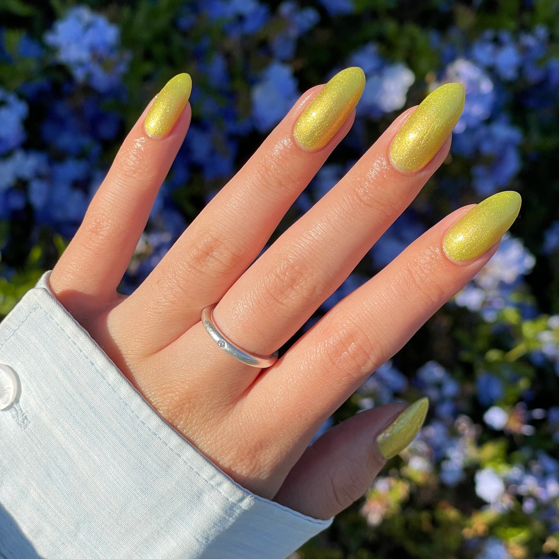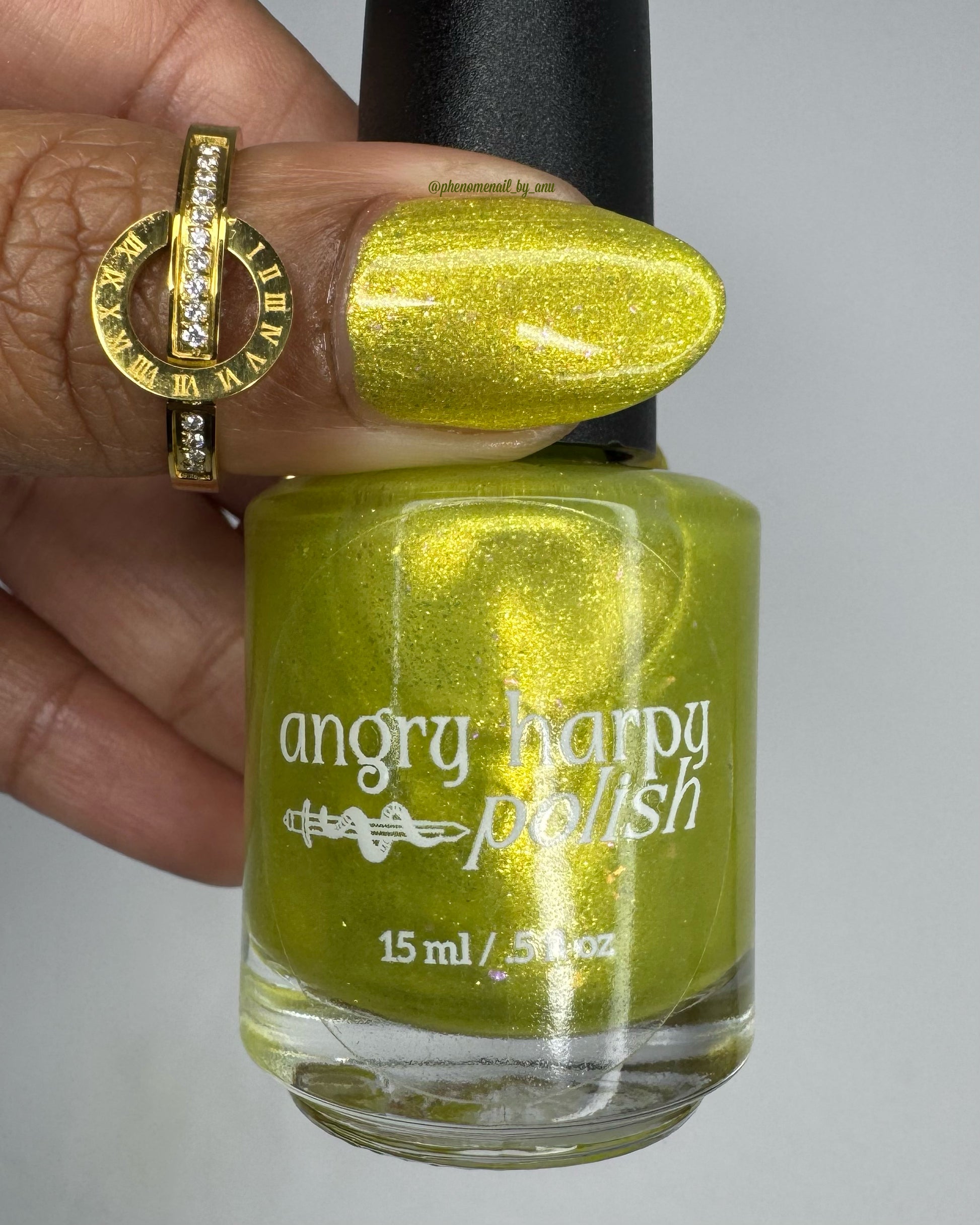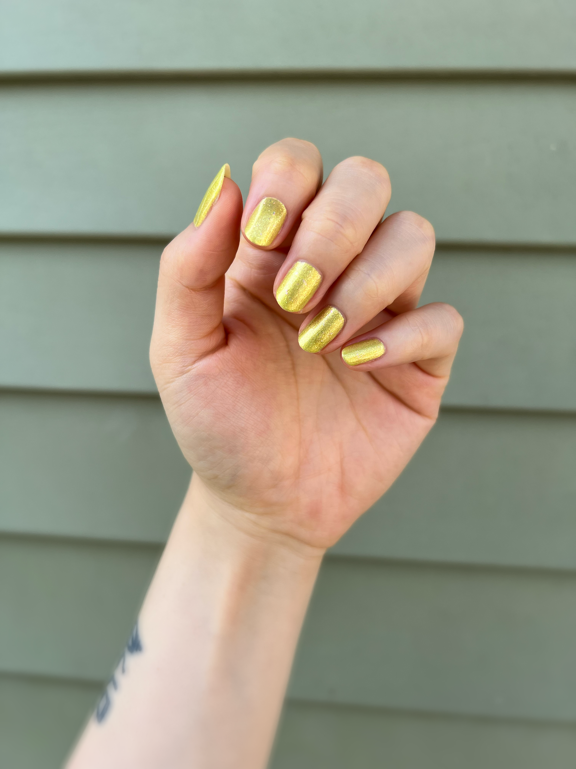 My Poor Nerves! is a yellow nail polish packed with pale green metallic micro flakes and iridescent flakes. Overall color appears chartreuse.