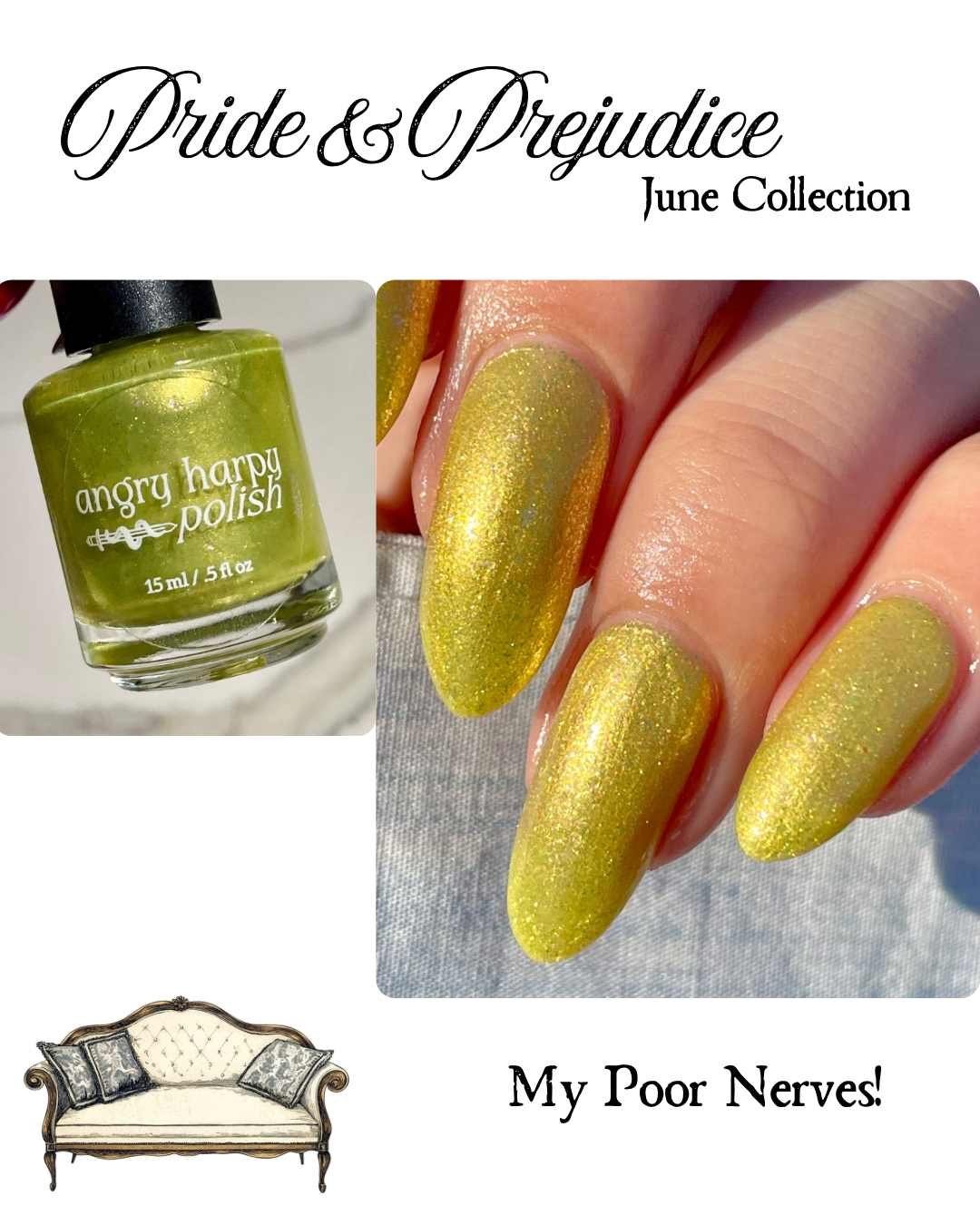 An exciting color for an excitable character! This polish is inspired by Mrs. Bennet and her infamous nerves. Someone give this lady a Xanax! As Mr. Bennet put it: “You mistake me, my dear. I have a high respect for your nerves. They are my old friends. I have heard you mention them with consideration these last twenty years at least.”