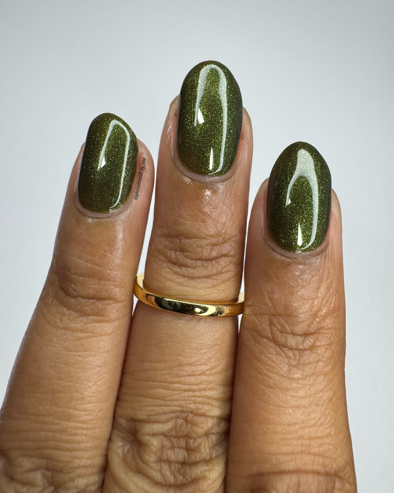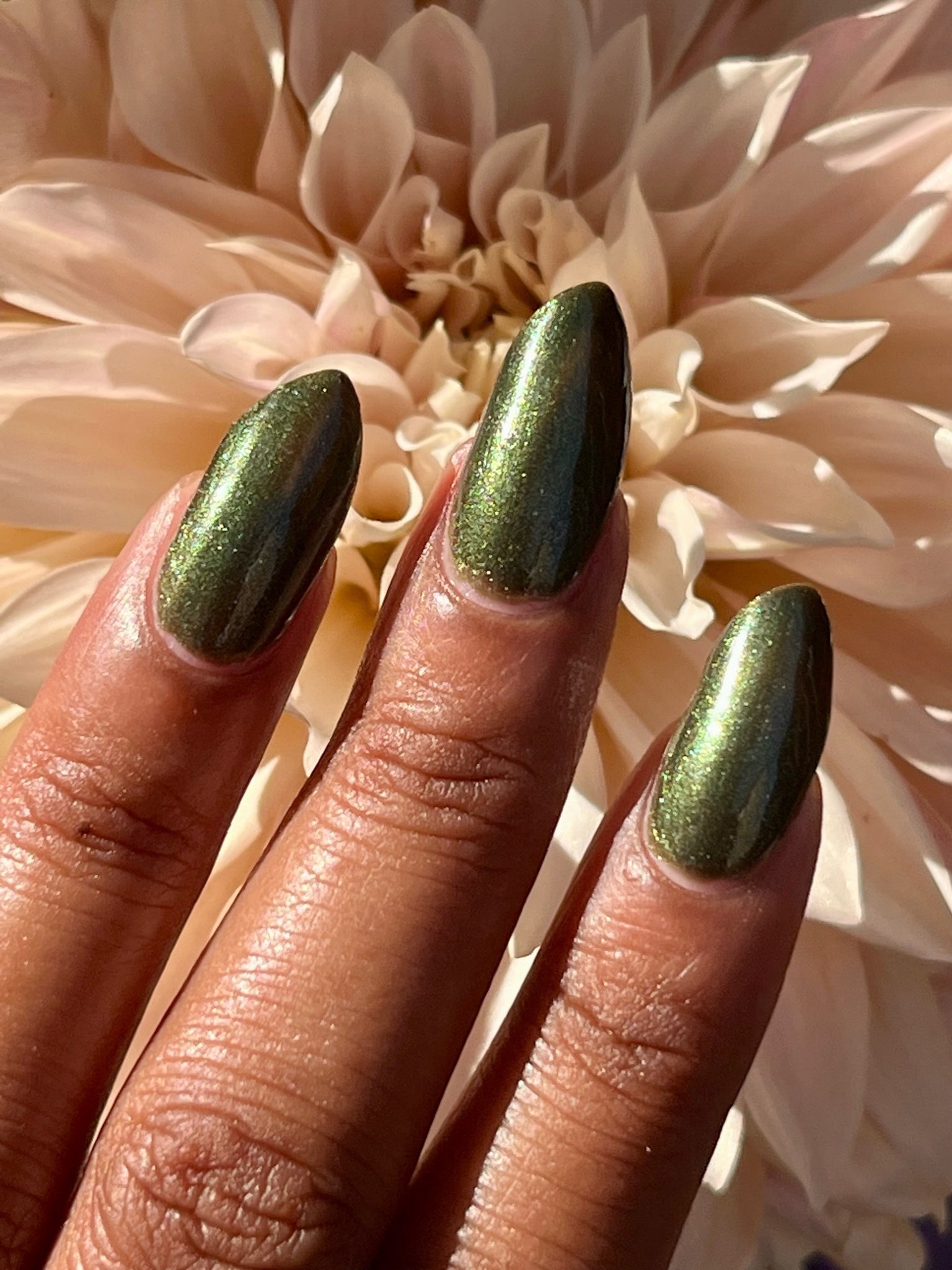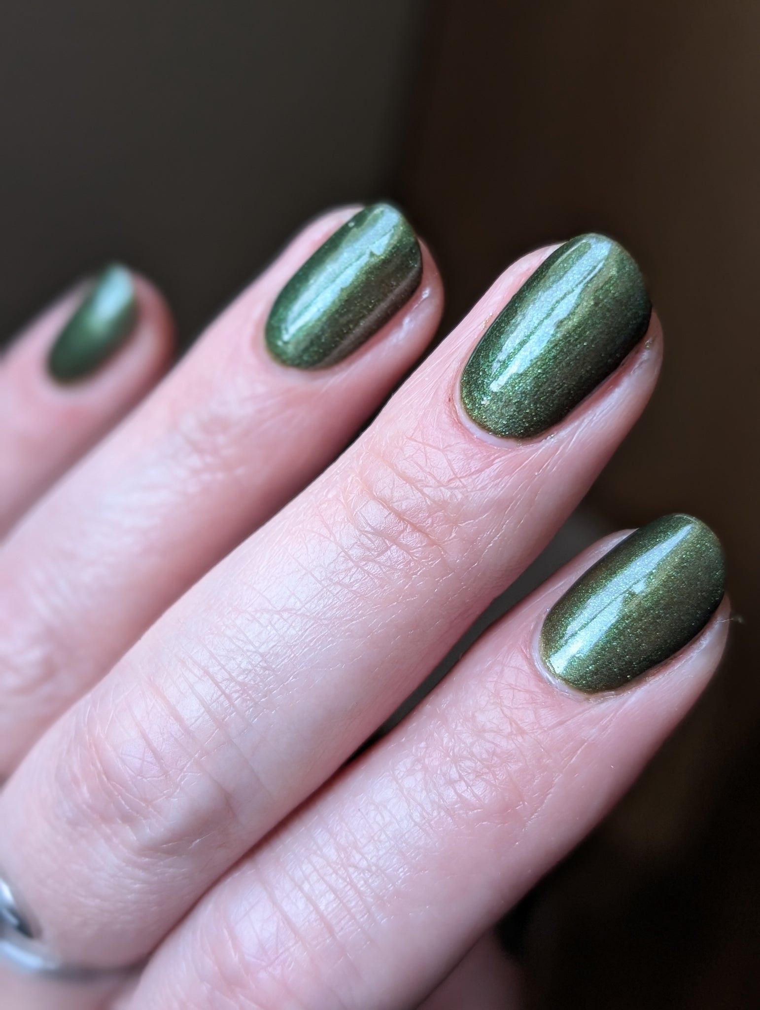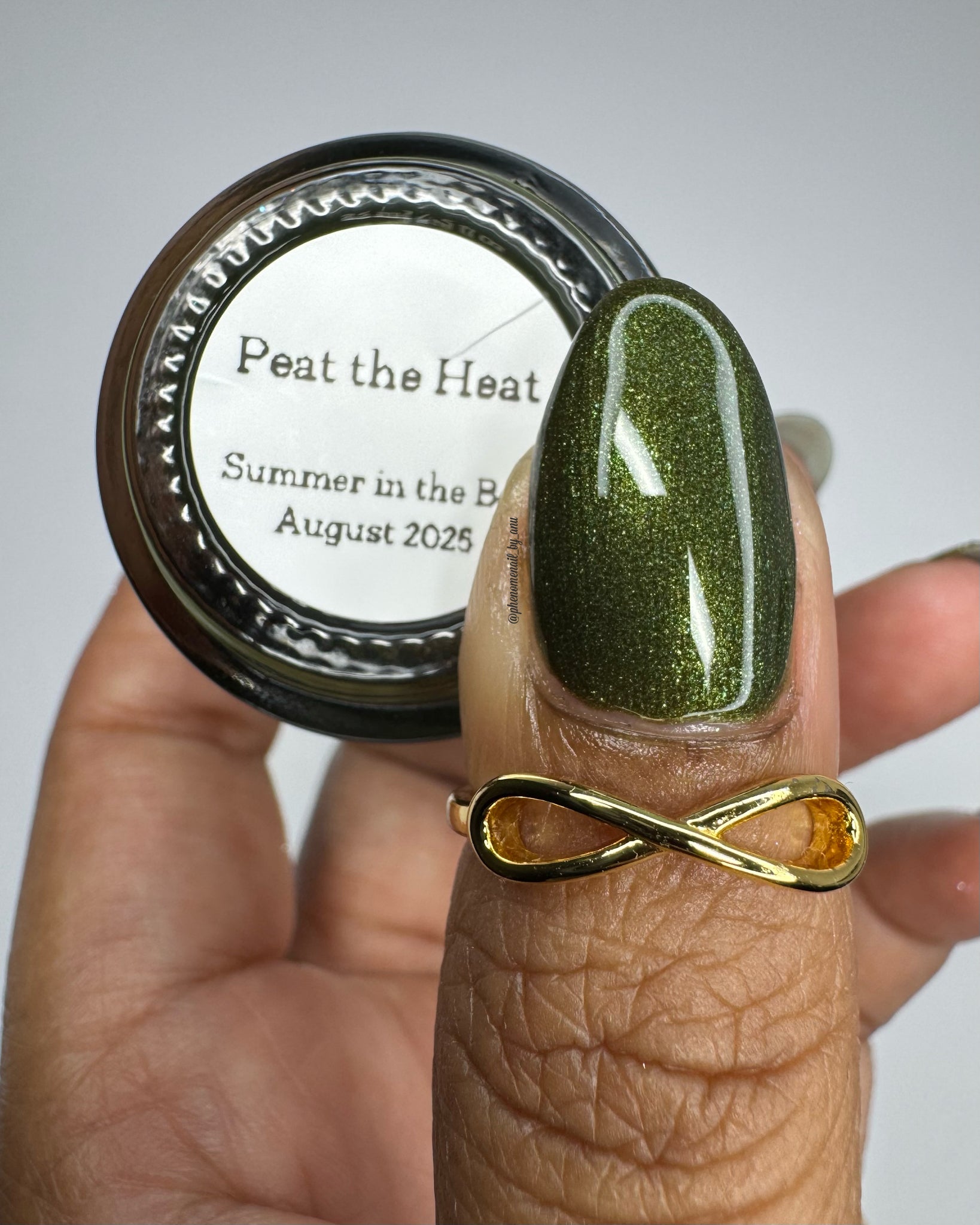 Peat the Heat is a grungy olive green polish with green shimmer.