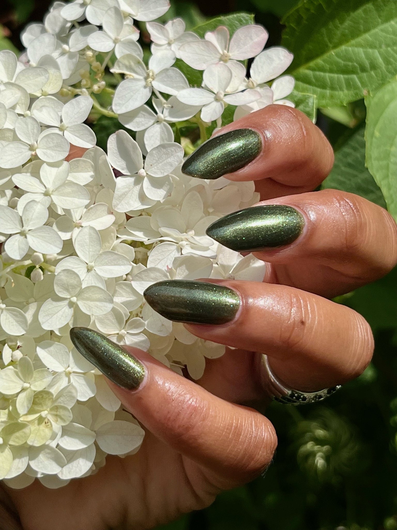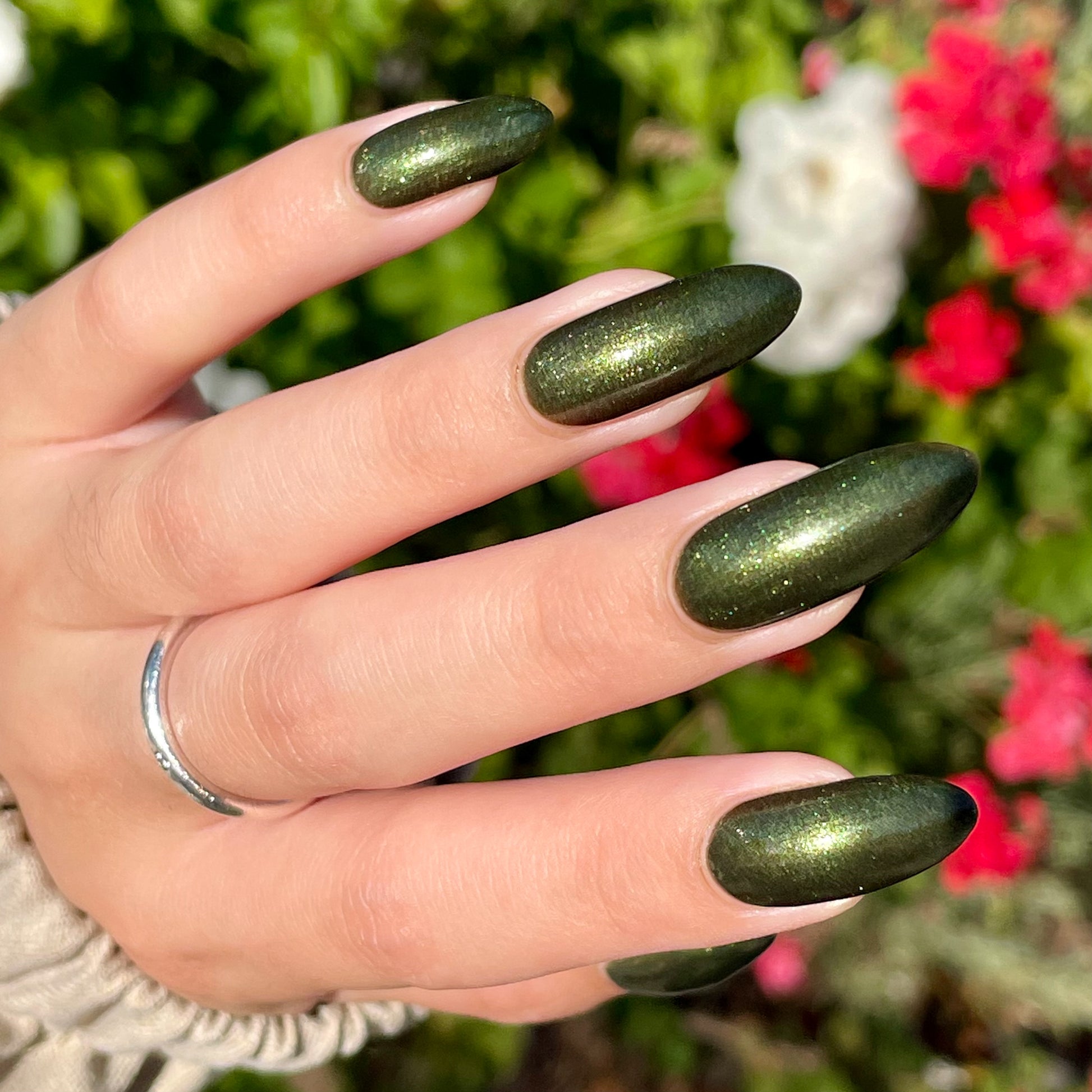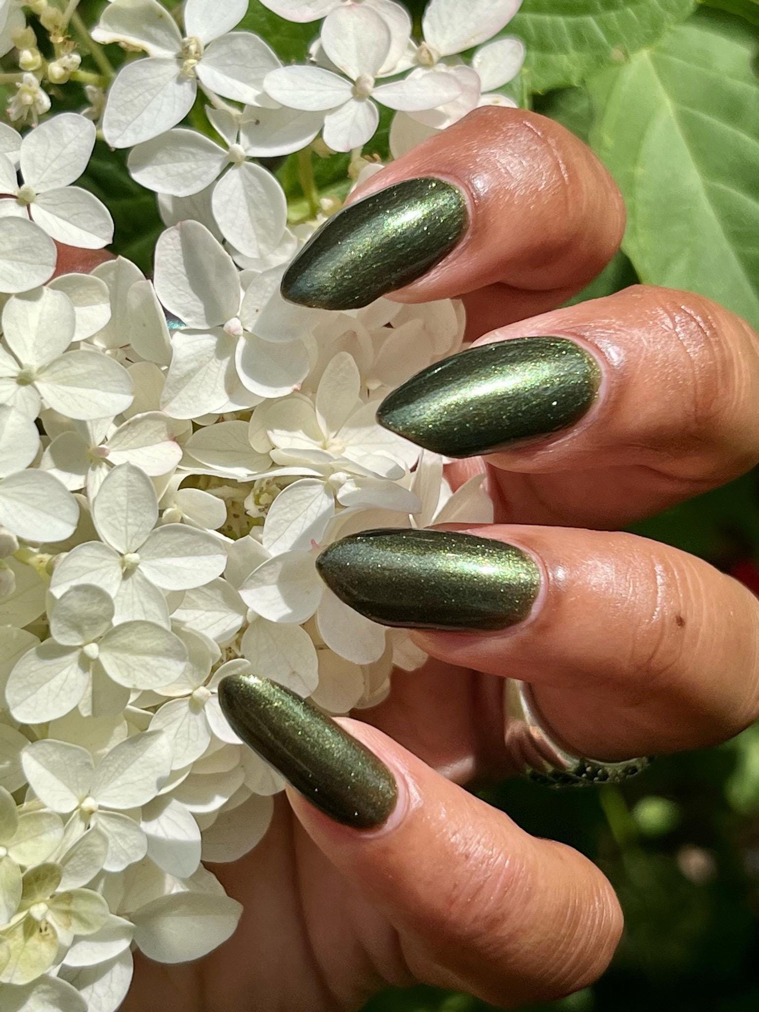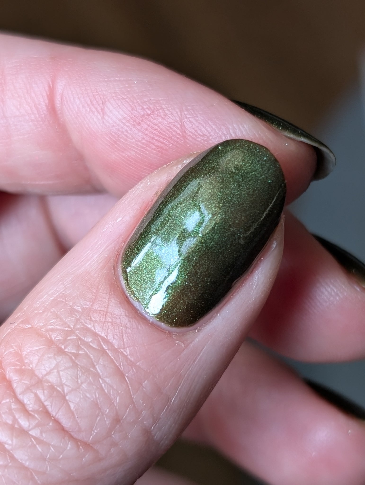 Peat the Heat is a grungy olive green polish with green shimmer.