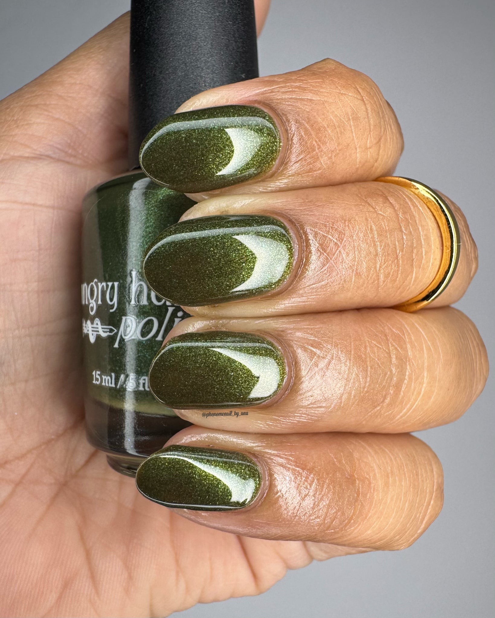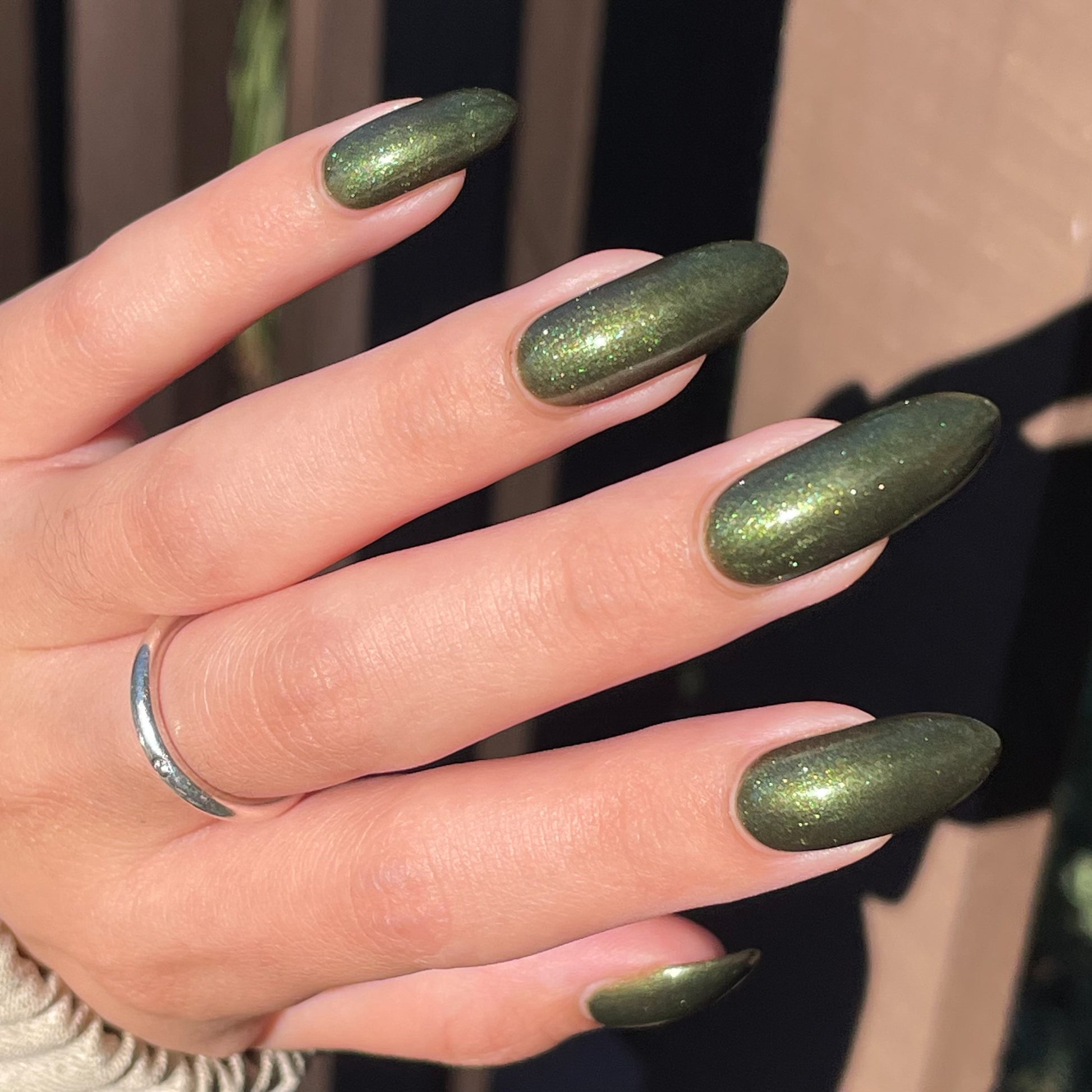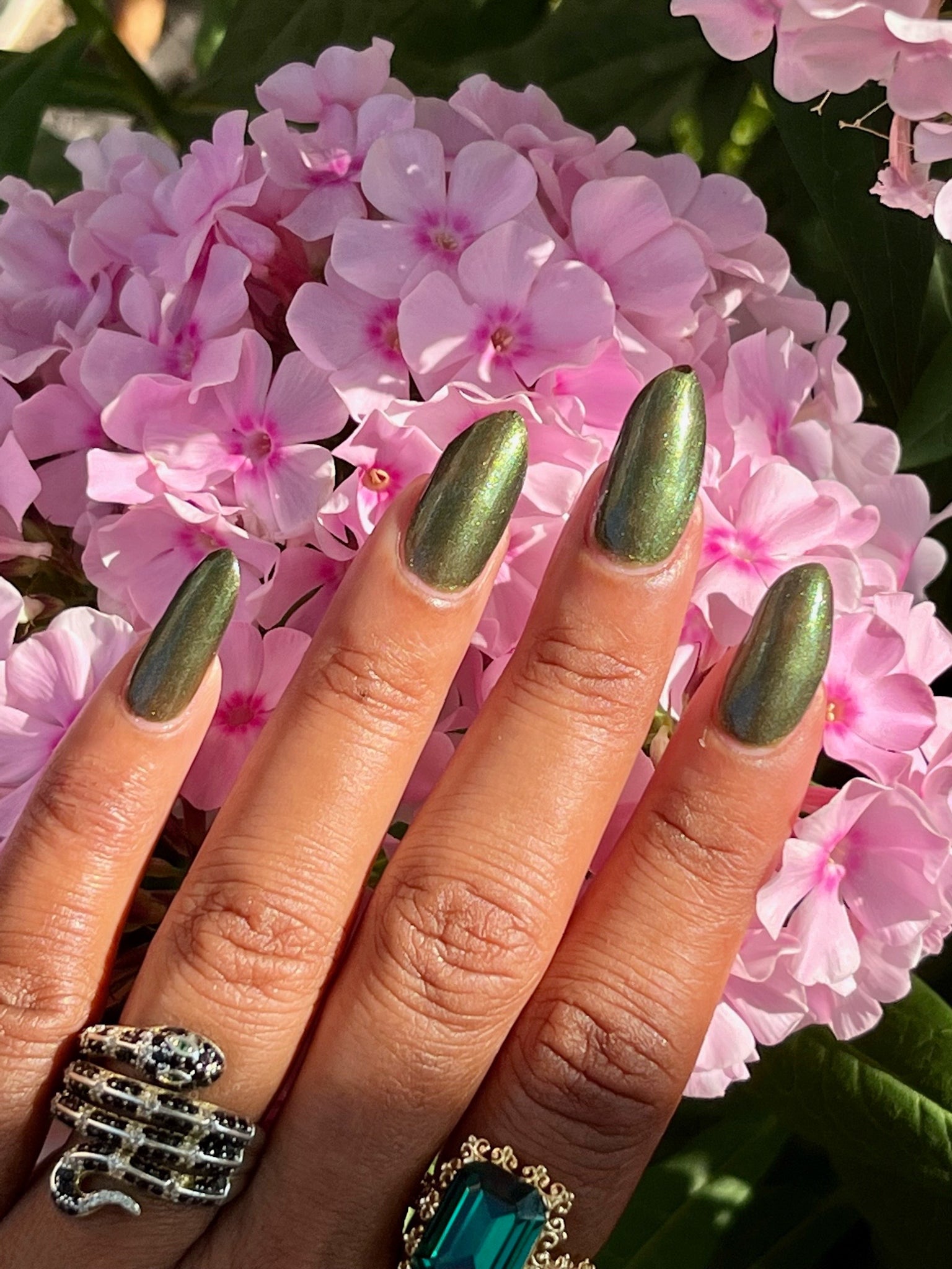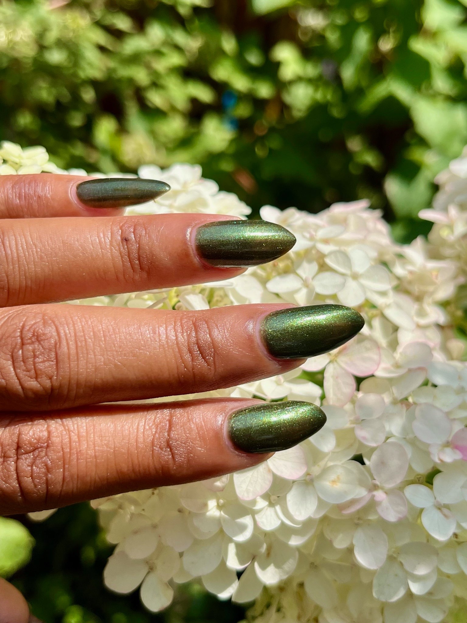 Peat the Heat is a grungy olive green polish with green shimmer.