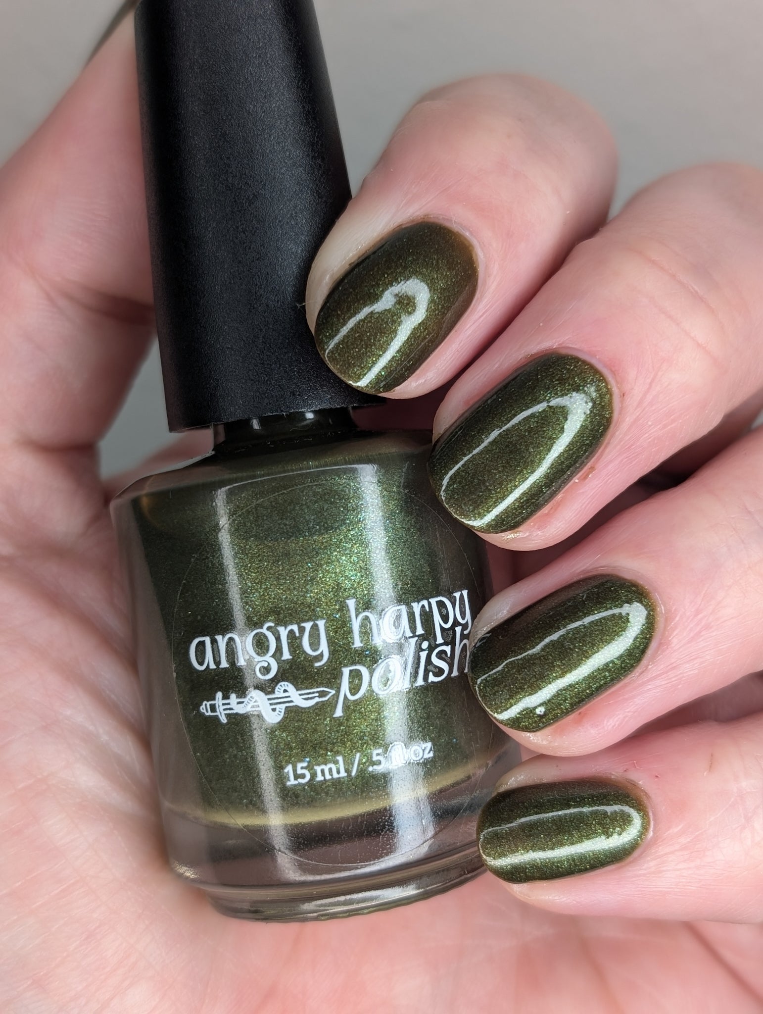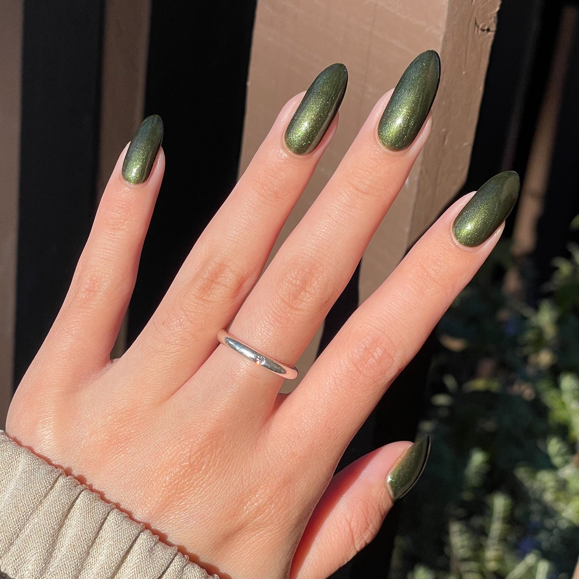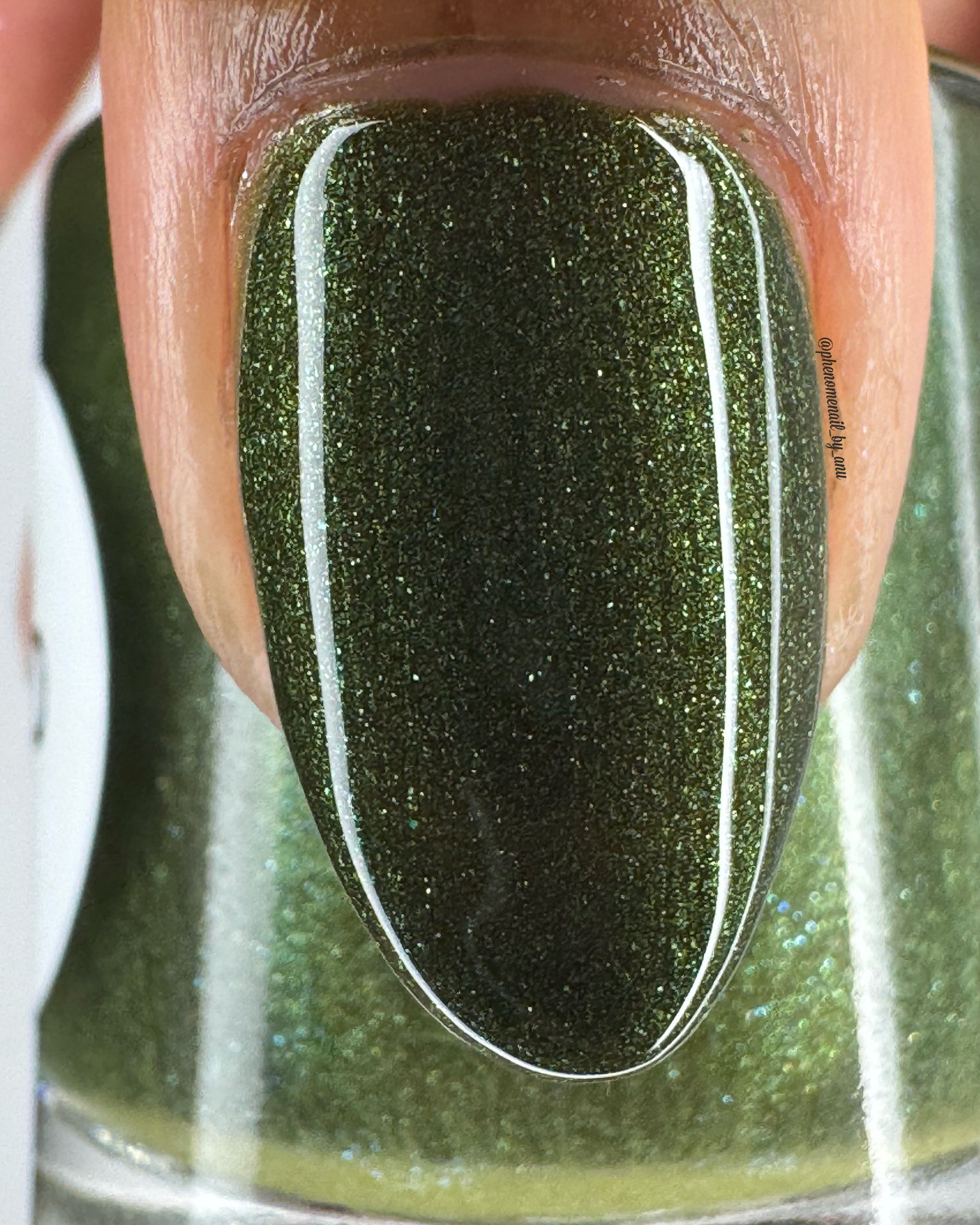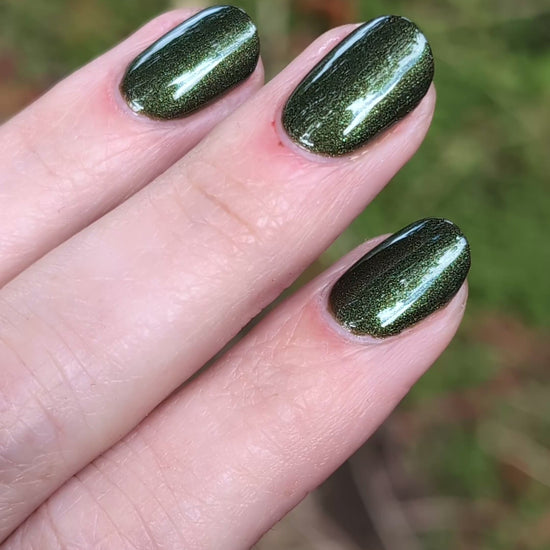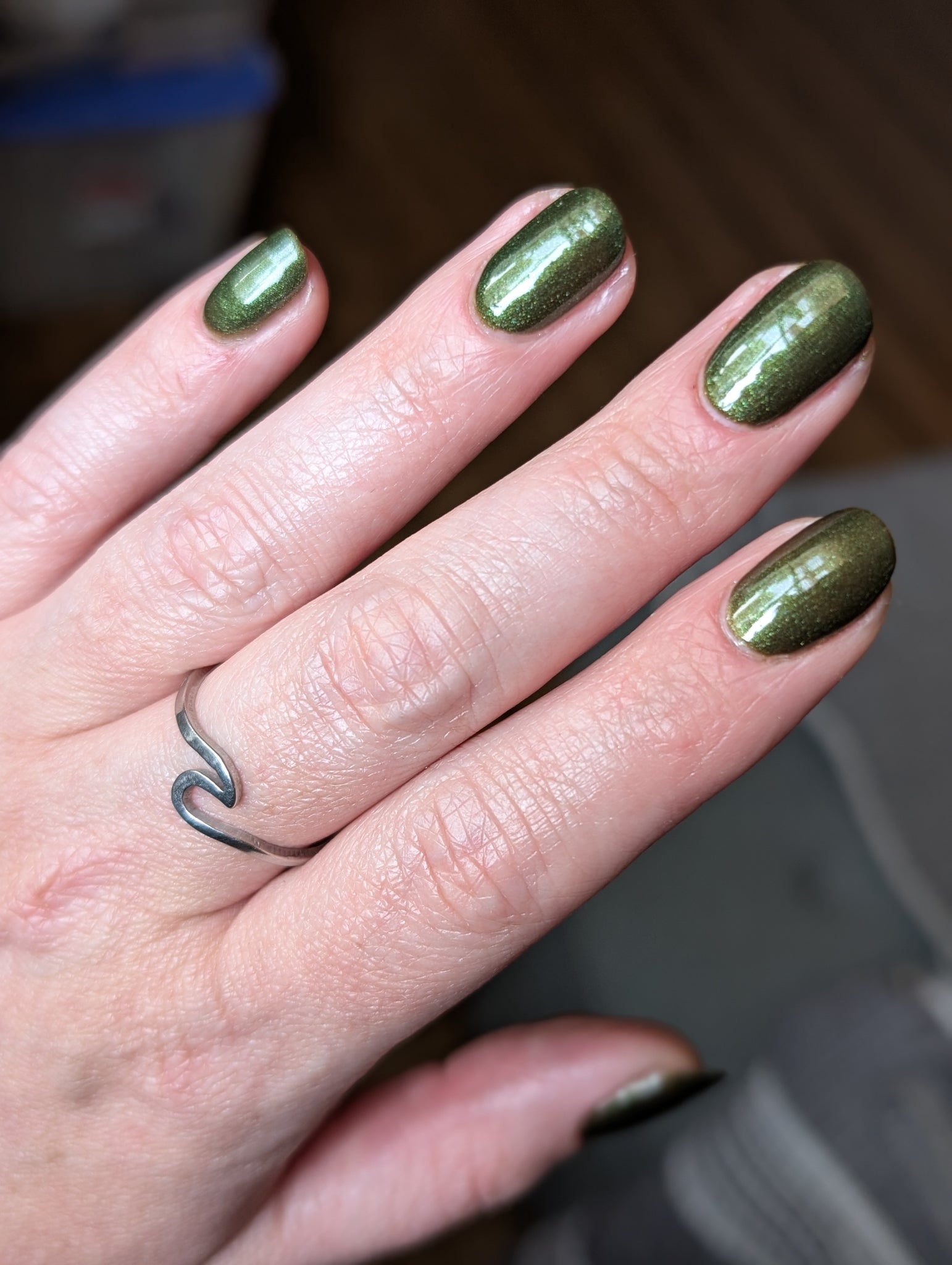 Peat the Heat is a grungy olive green polish with green shimmer.