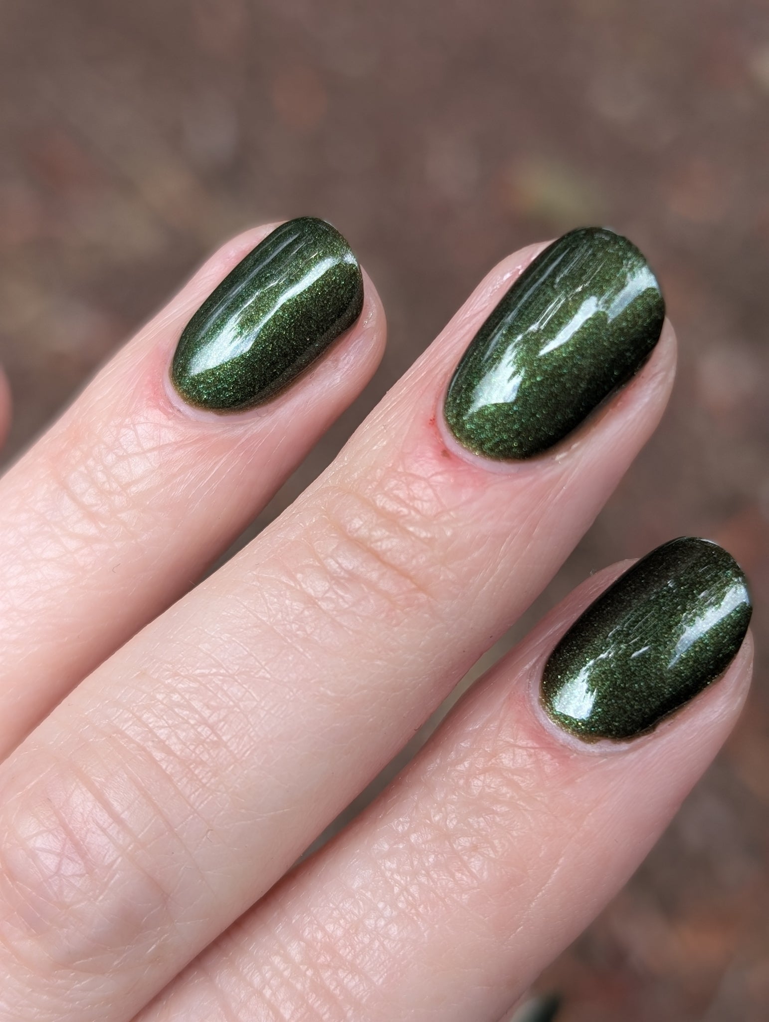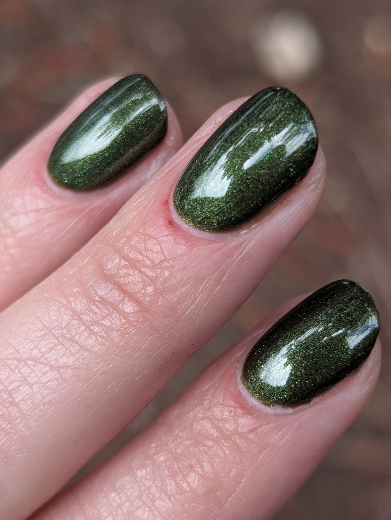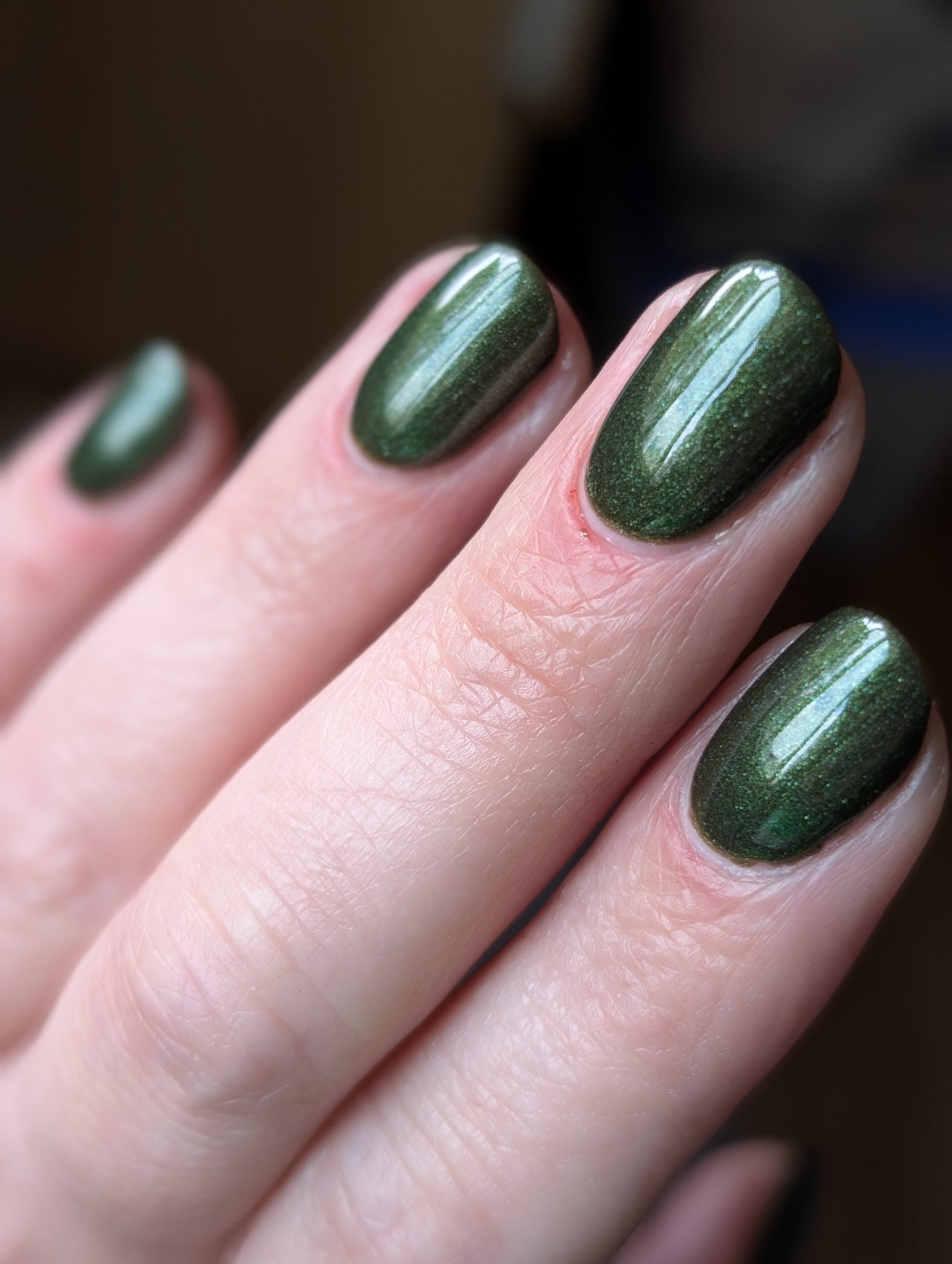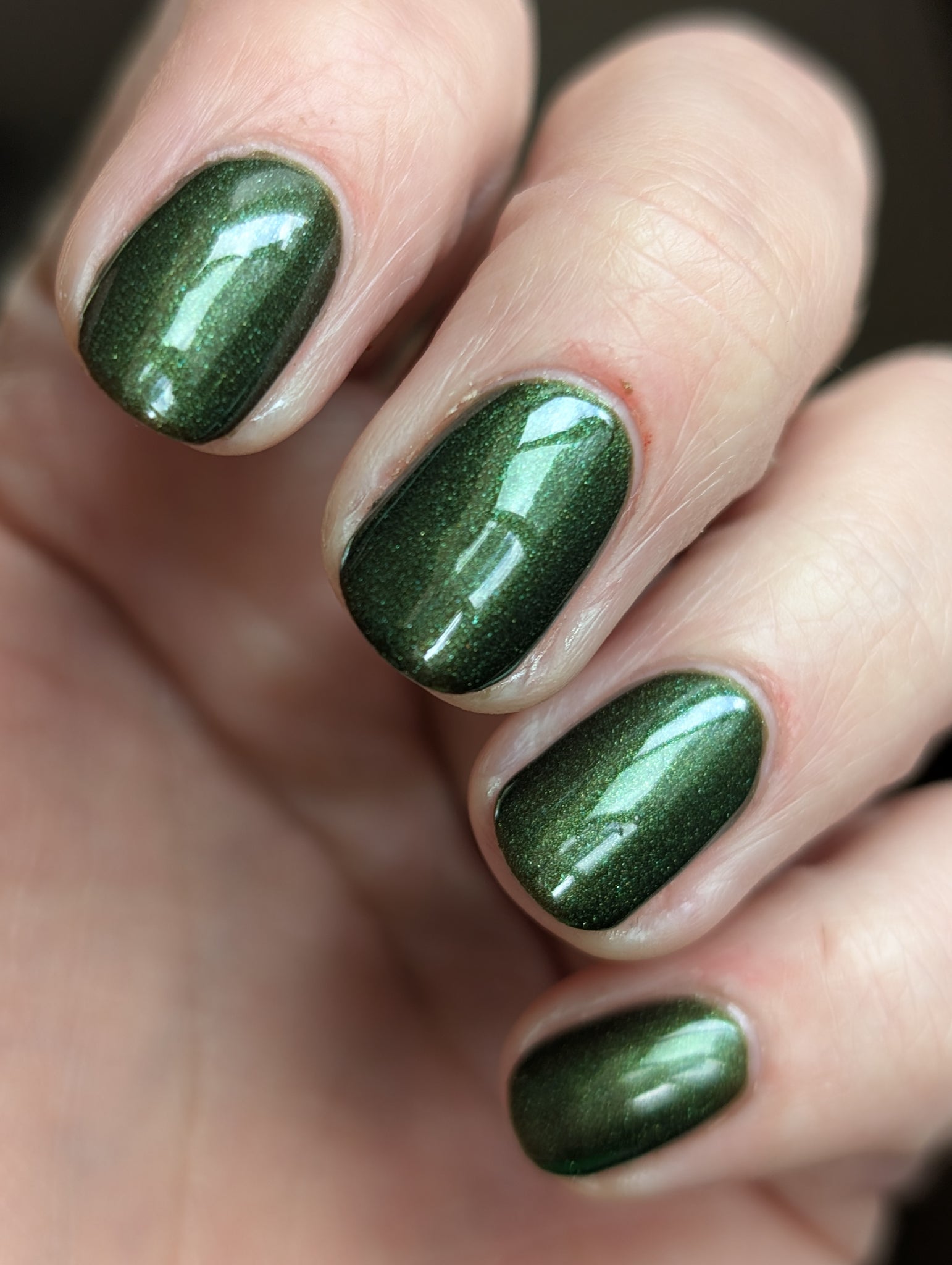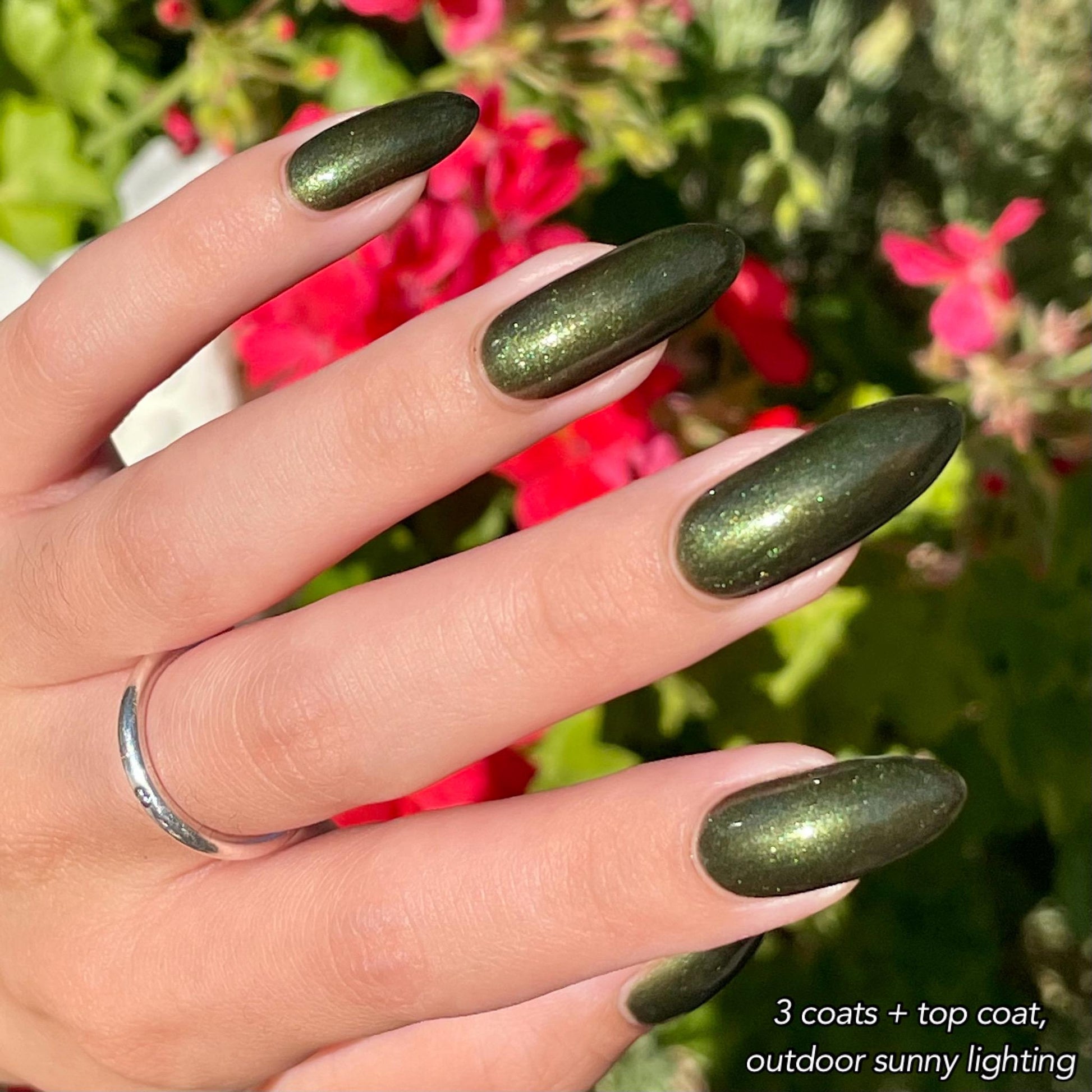 - Opaque in 2-3 coats depending on application. 2 coats results in a grungier look, 3 coats will deepen the polish to more of a forest green.