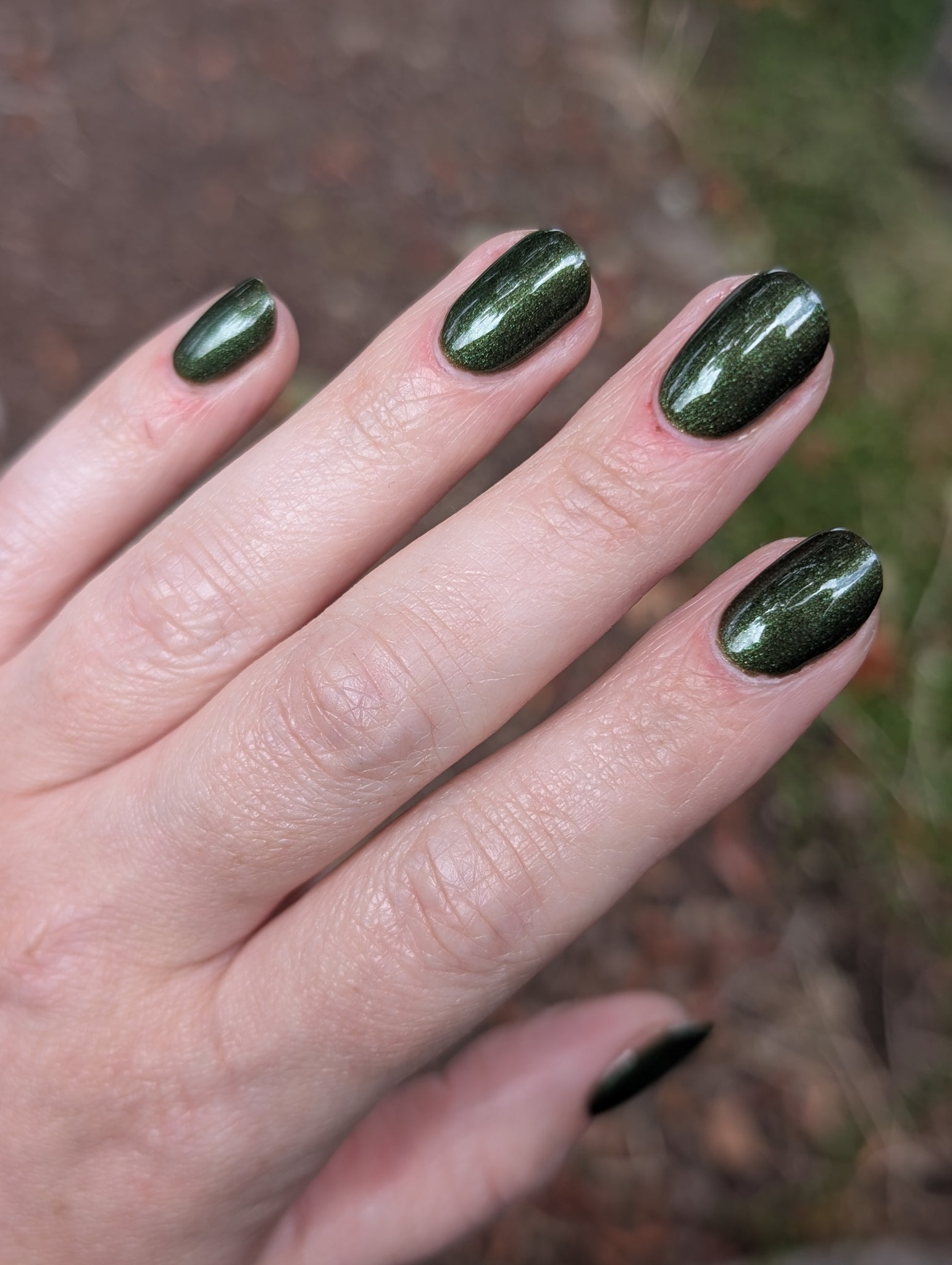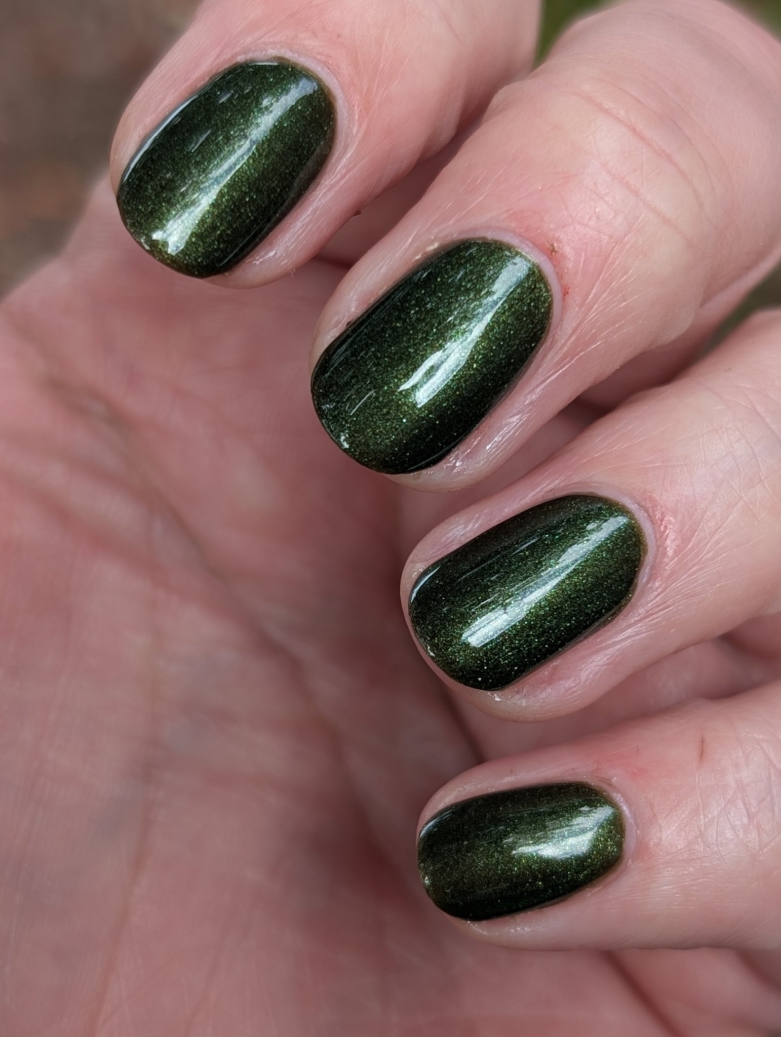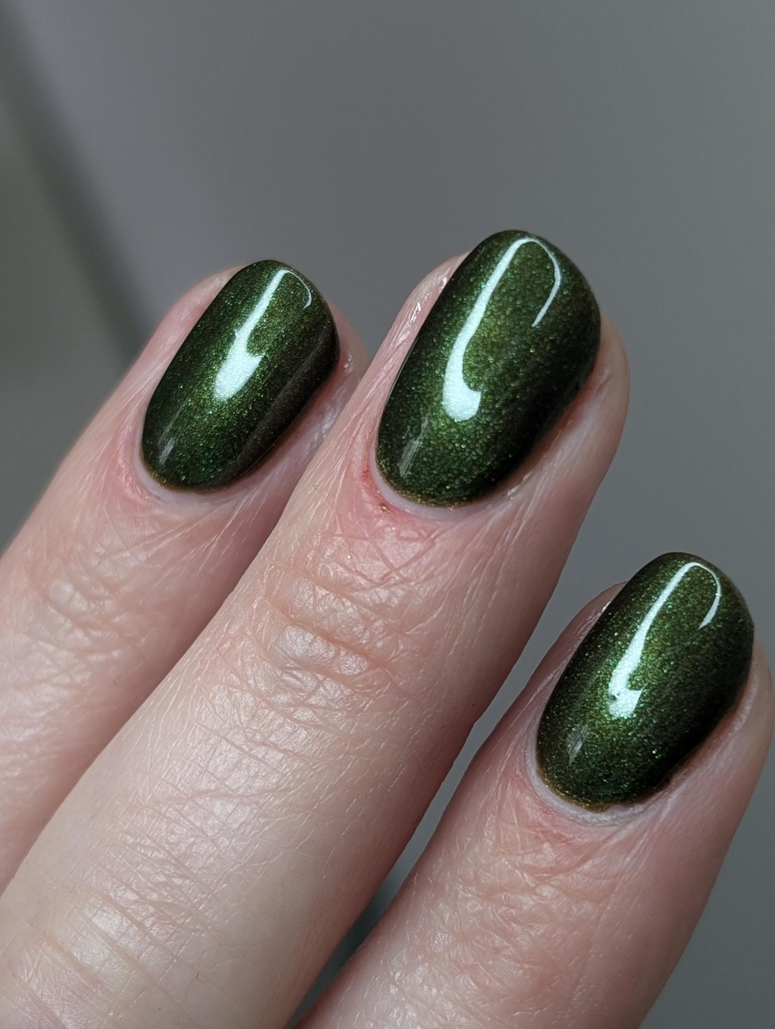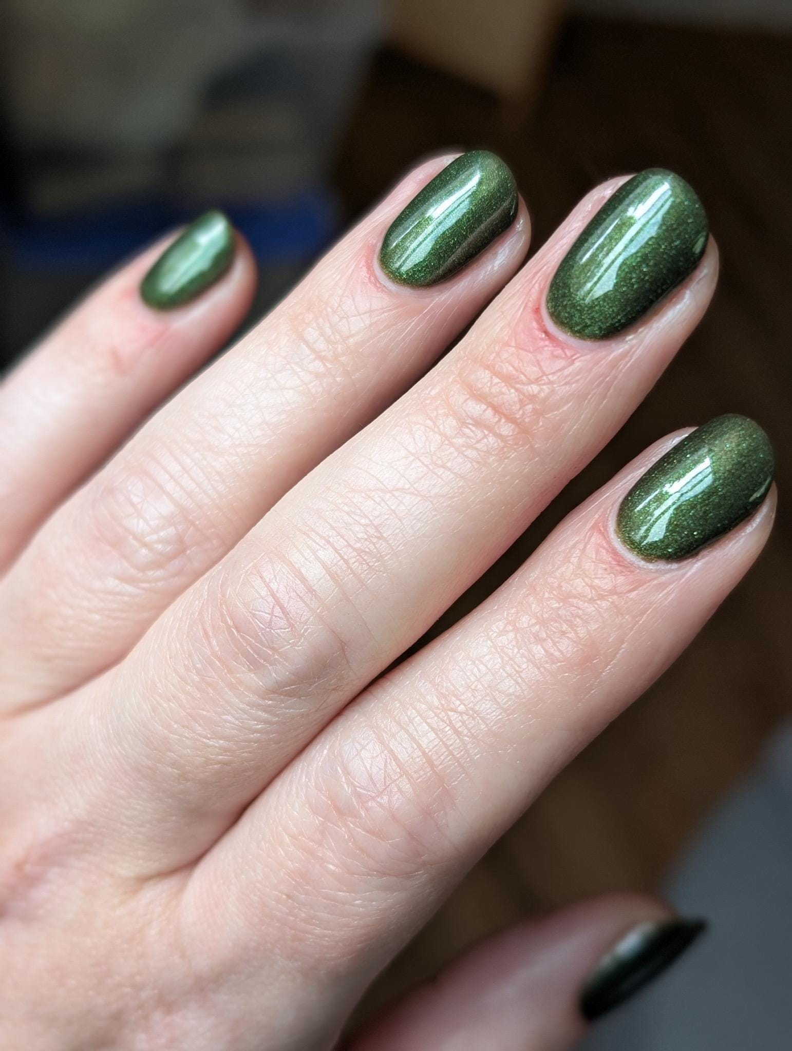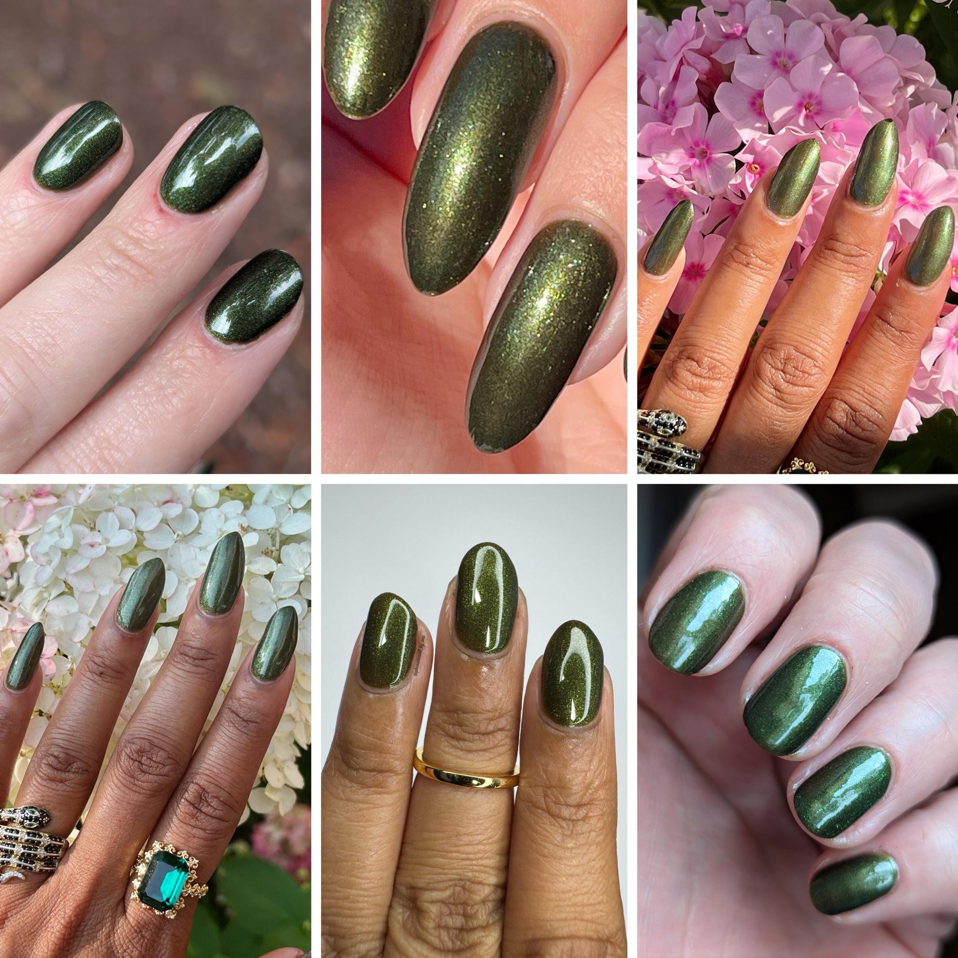 - Opaque in 2-3 coats depending on application. 2 coats results in a grungier look, 3 coats will deepen the polish to more of a forest green.