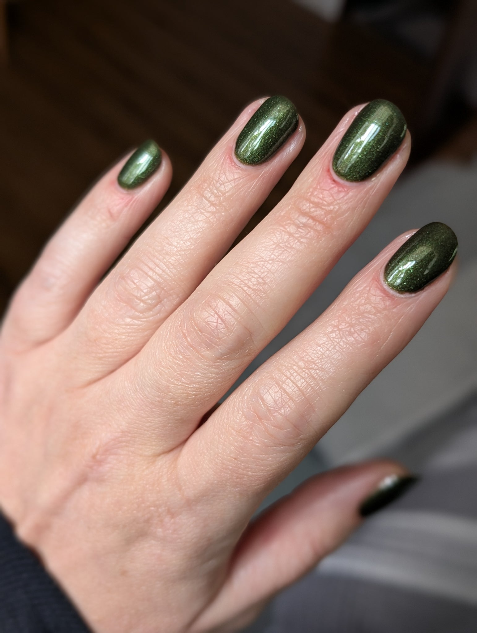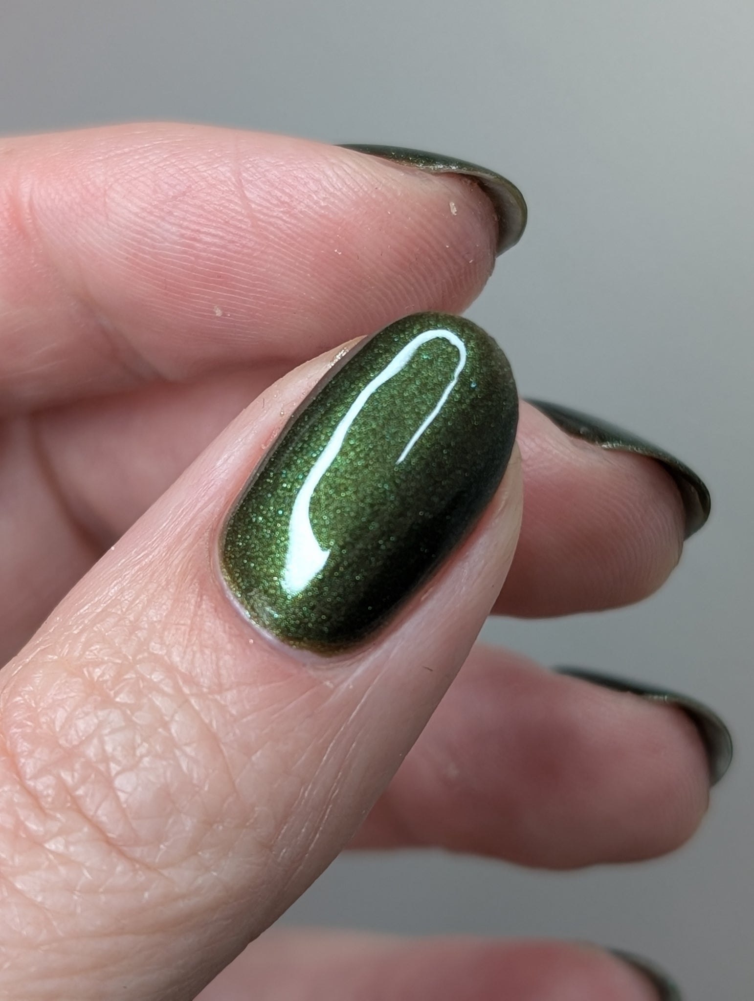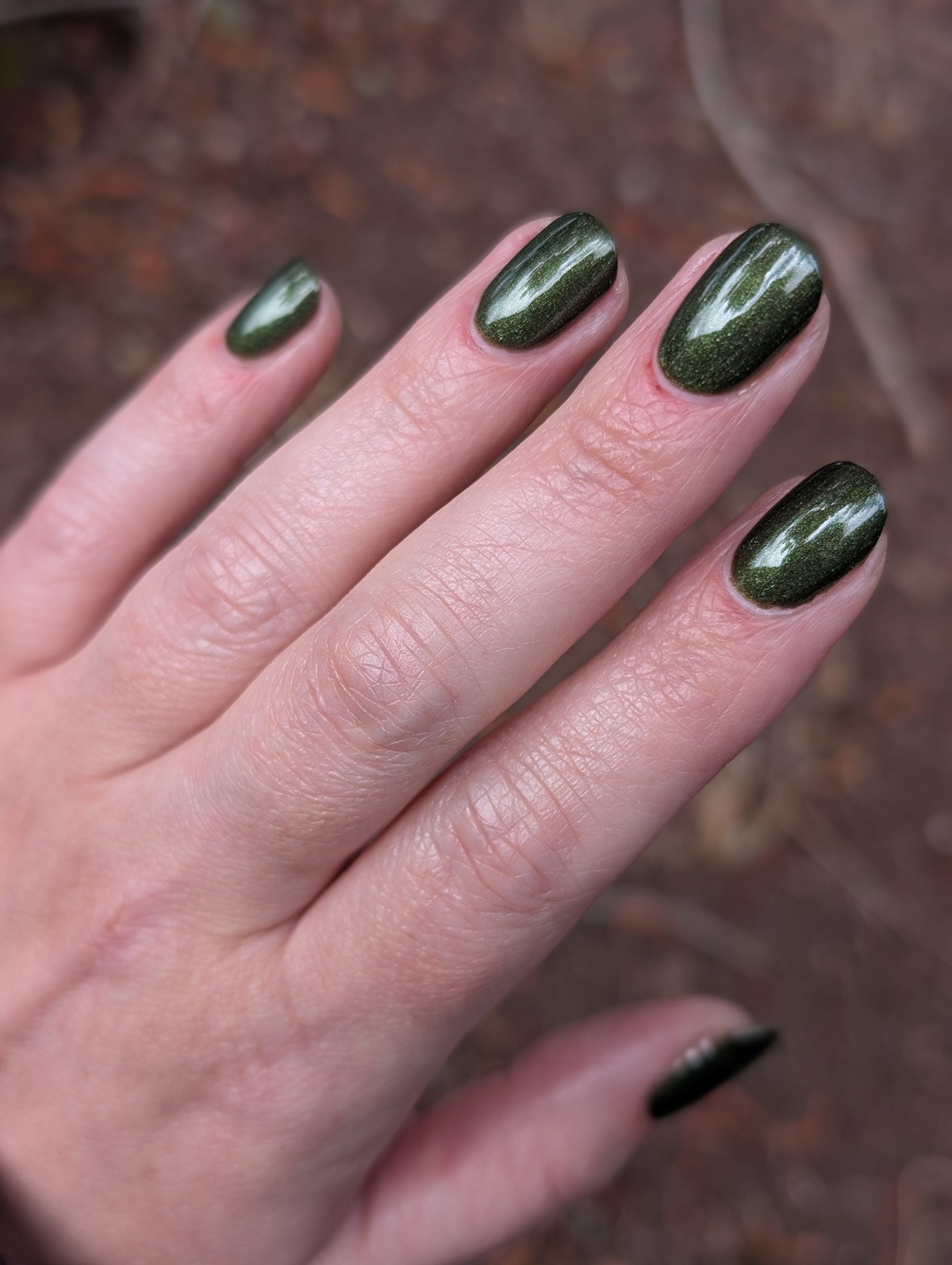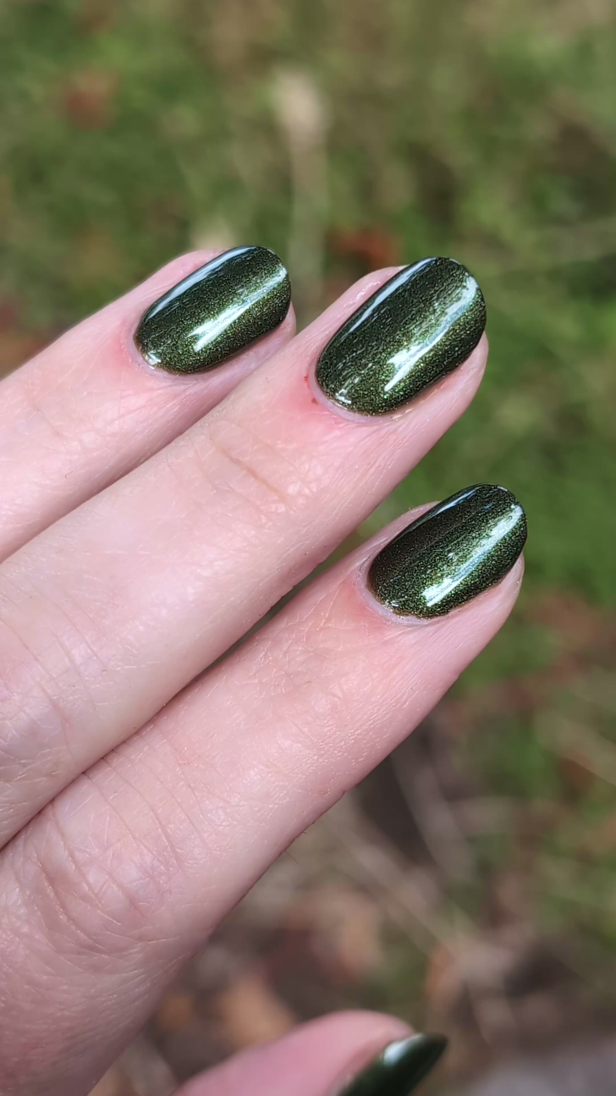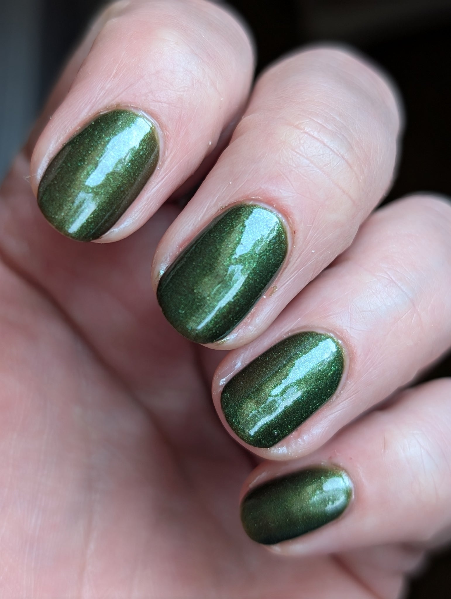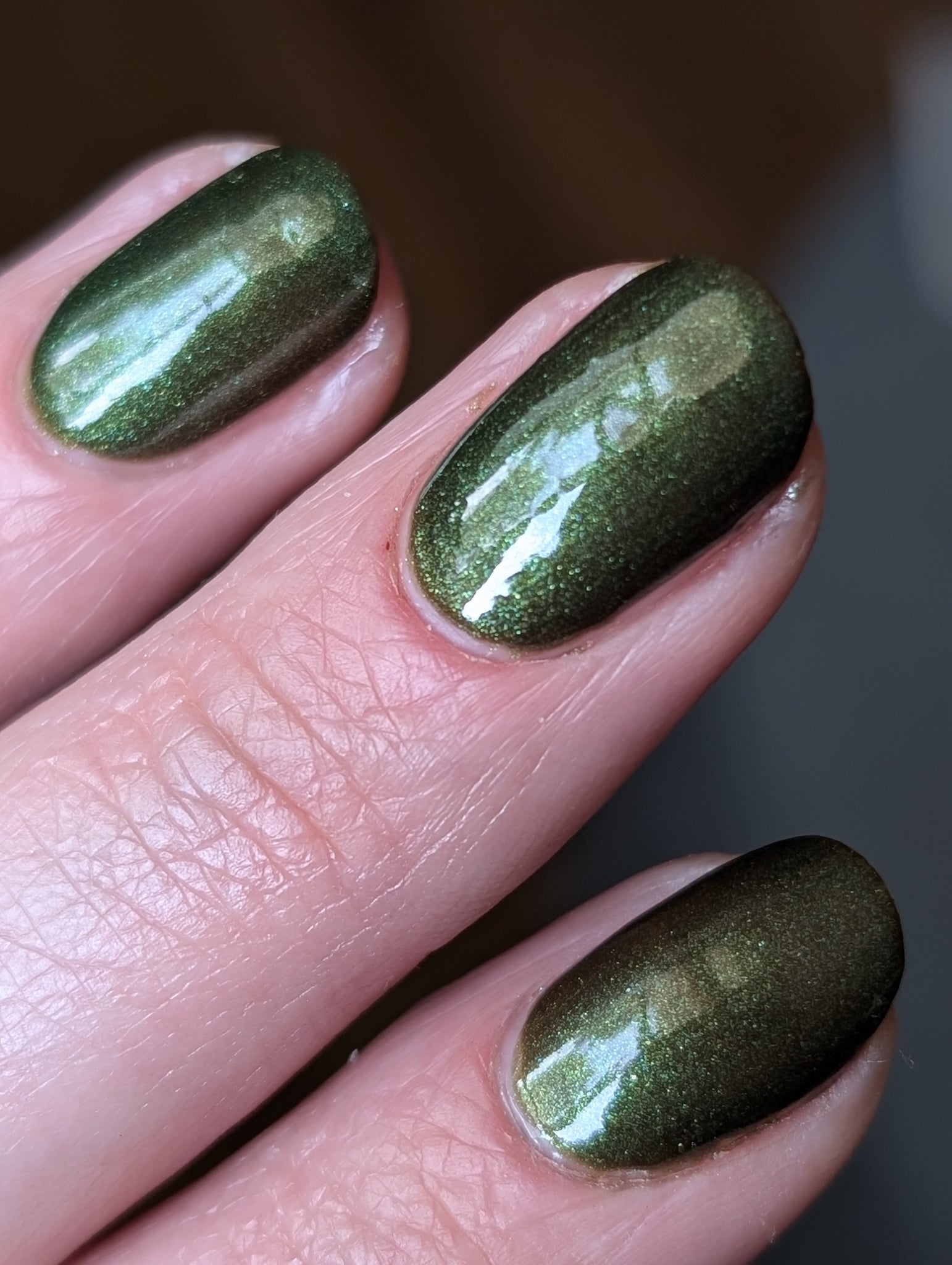 - Opaque in 2-3 coats depending on application. 2 coats results in a grungier look, 3 coats will deepen the polish to more of a forest green.