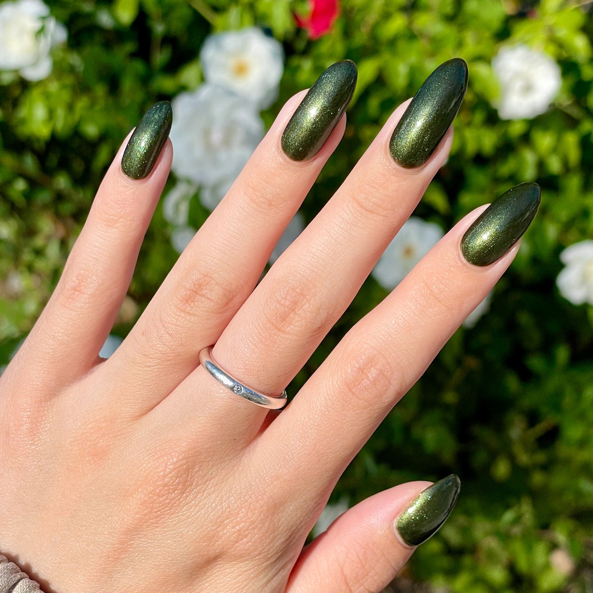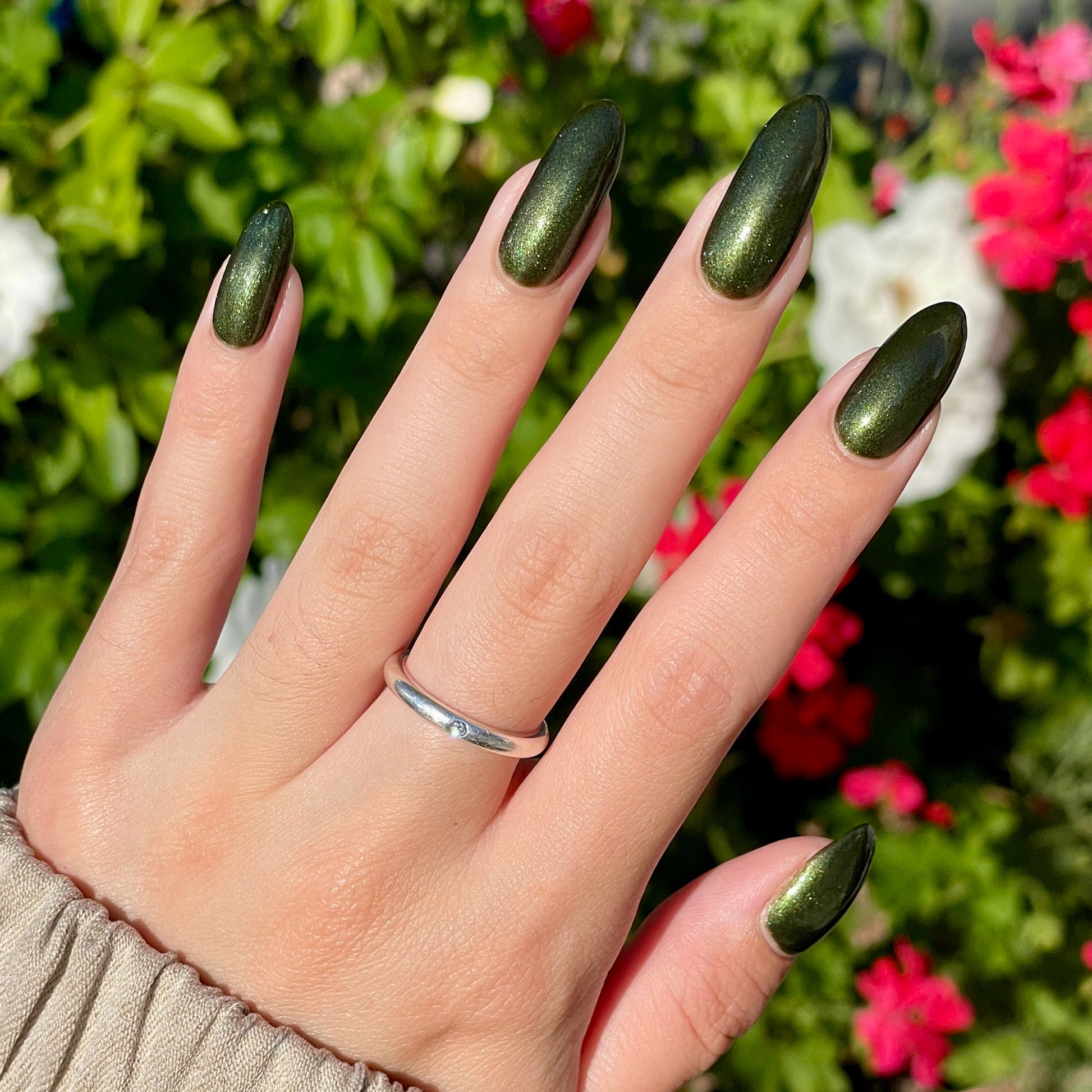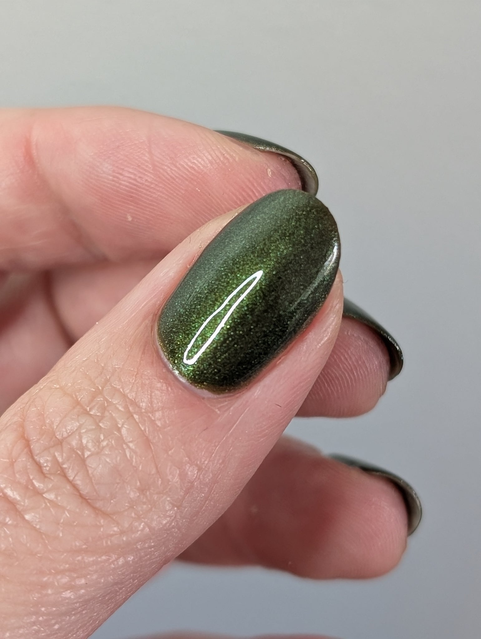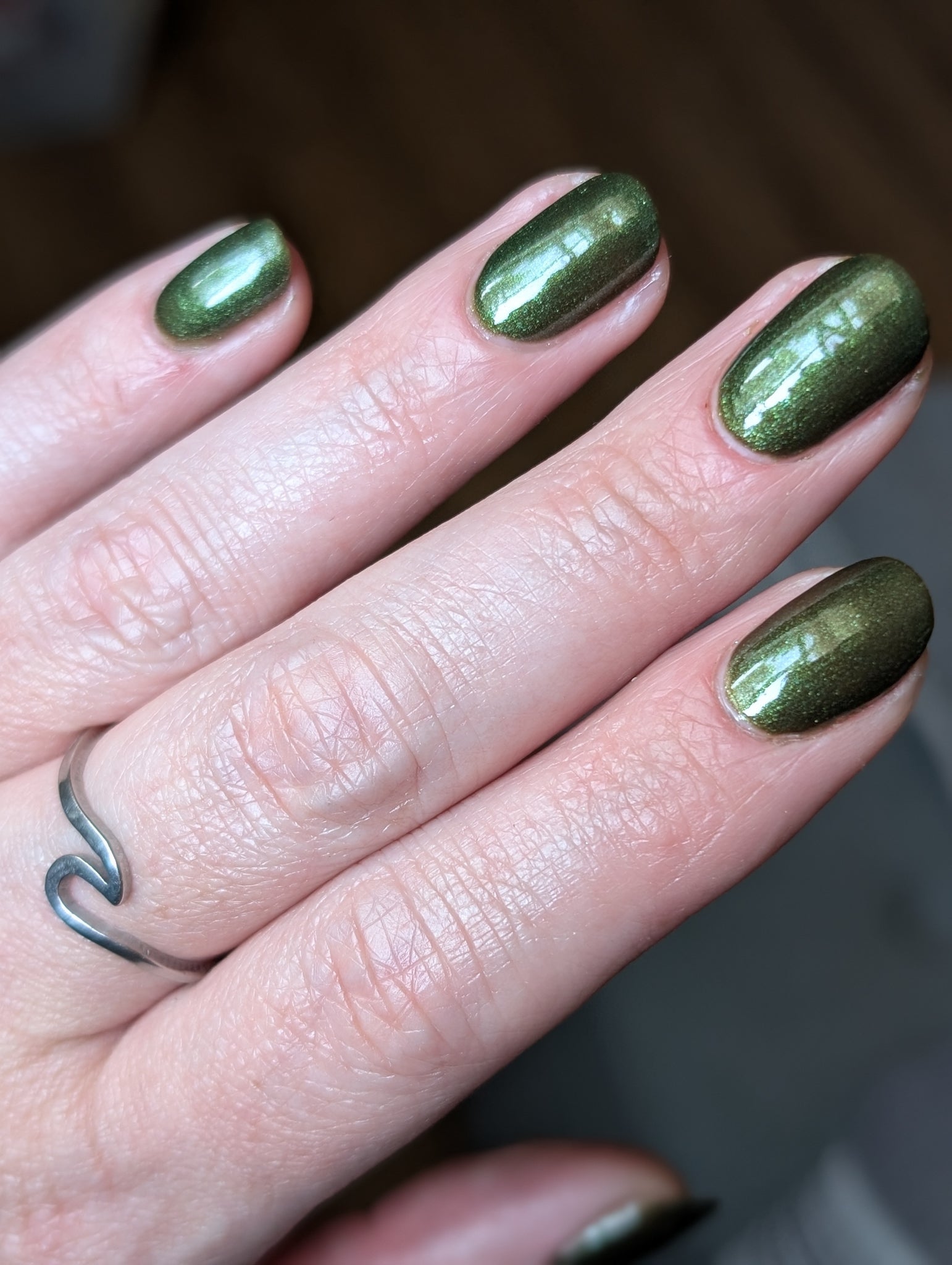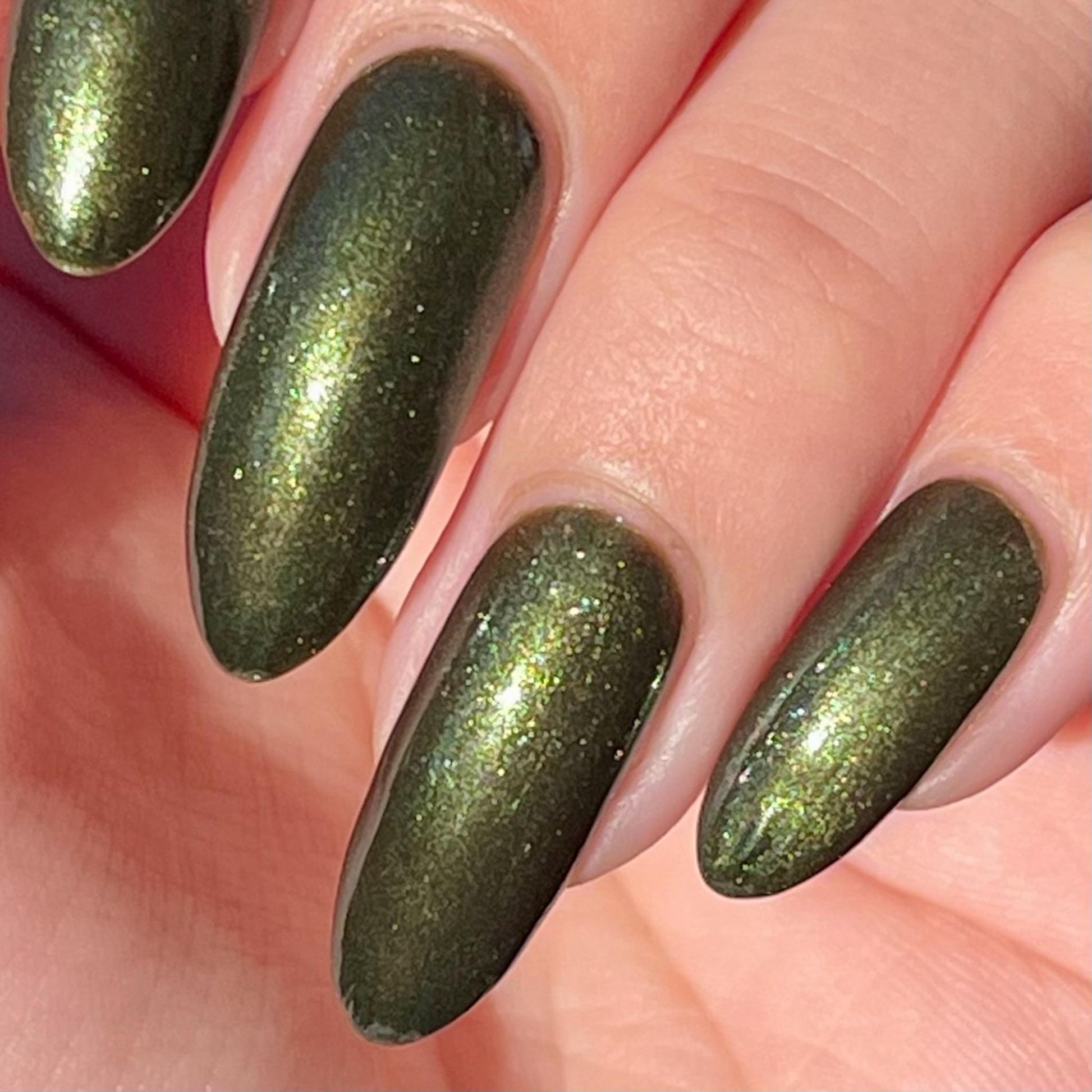 - Opaque in 2-3 coats depending on application. 2 coats results in a grungier look, 3 coats will deepen the polish to more of a forest green.