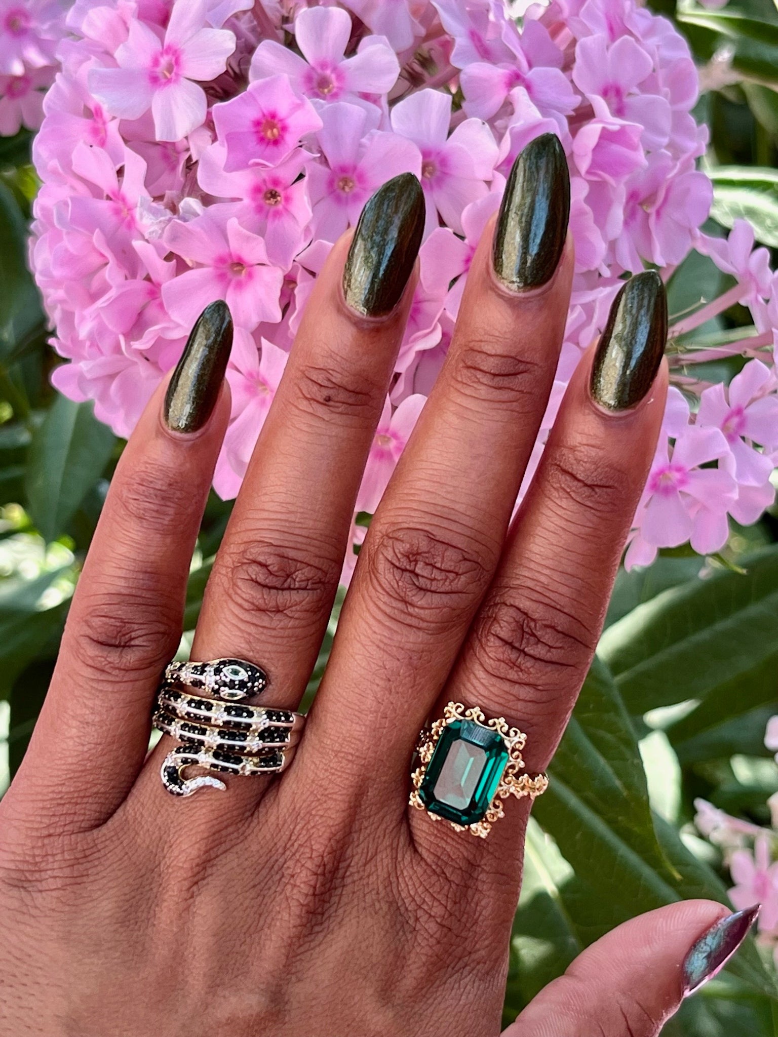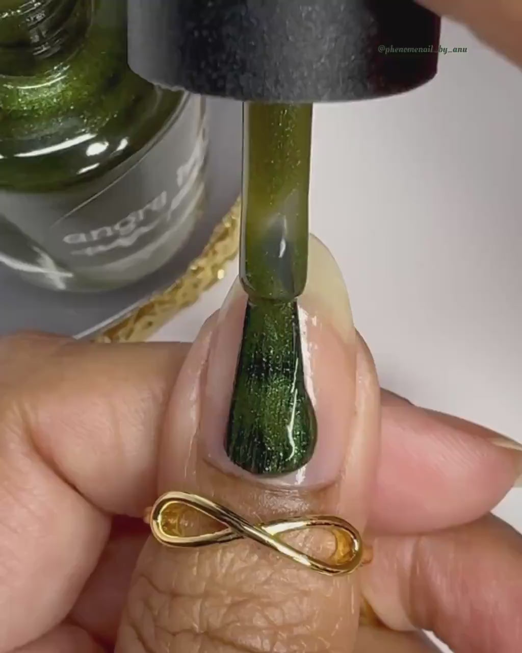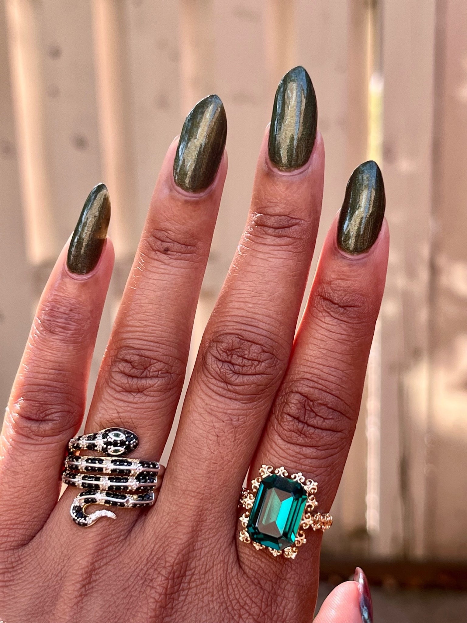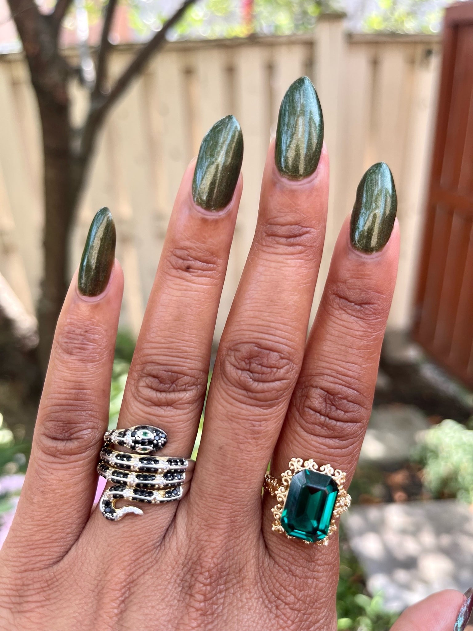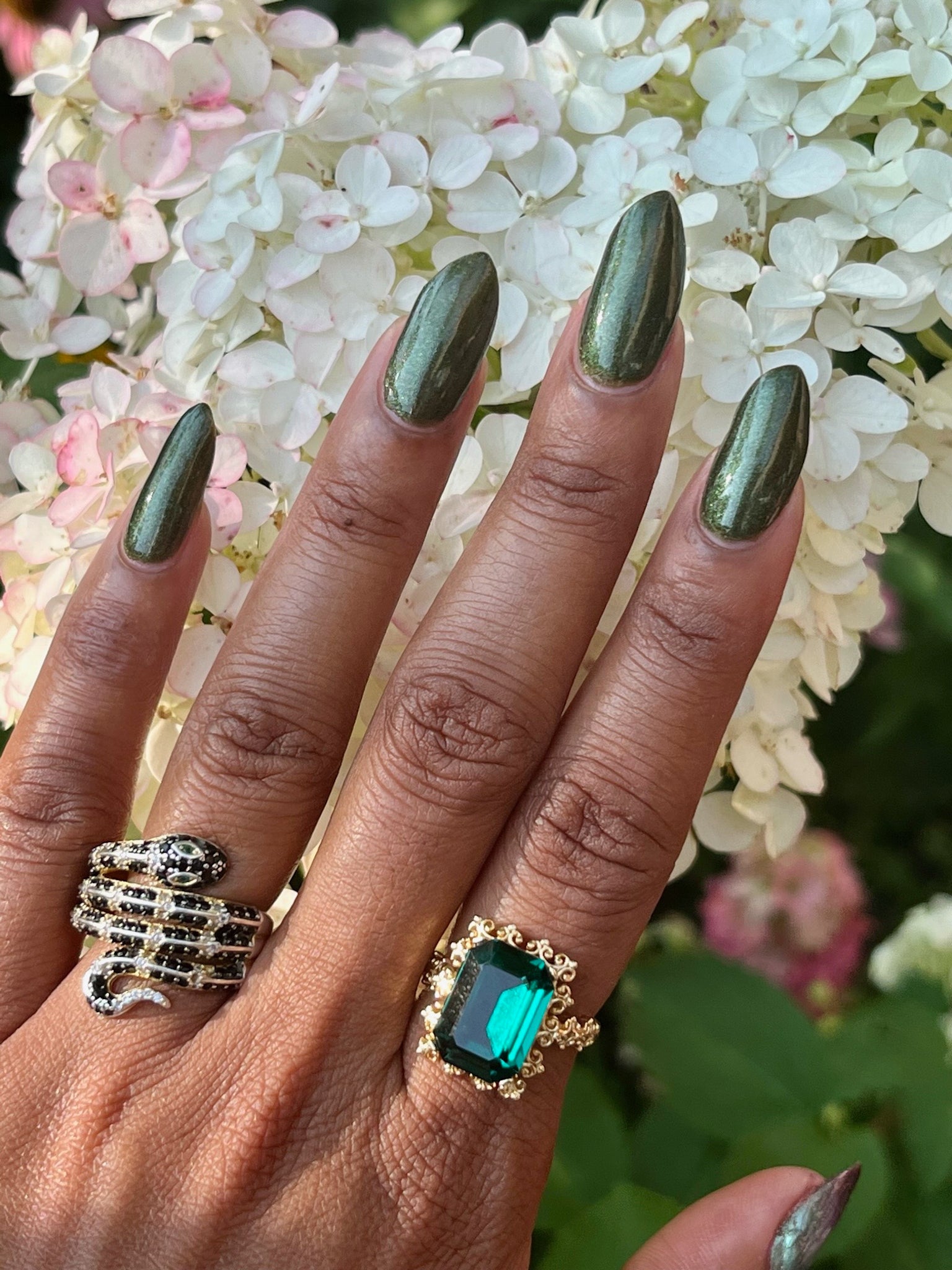 - Opaque in 2-3 coats depending on application. 2 coats results in a grungier look, 3 coats will deepen the polish to more of a forest green.