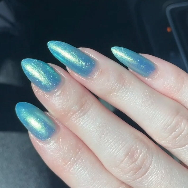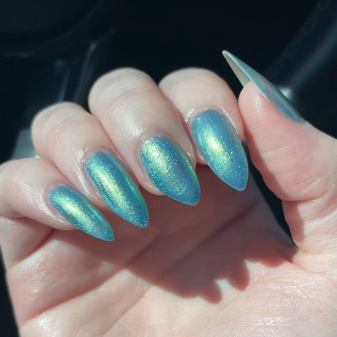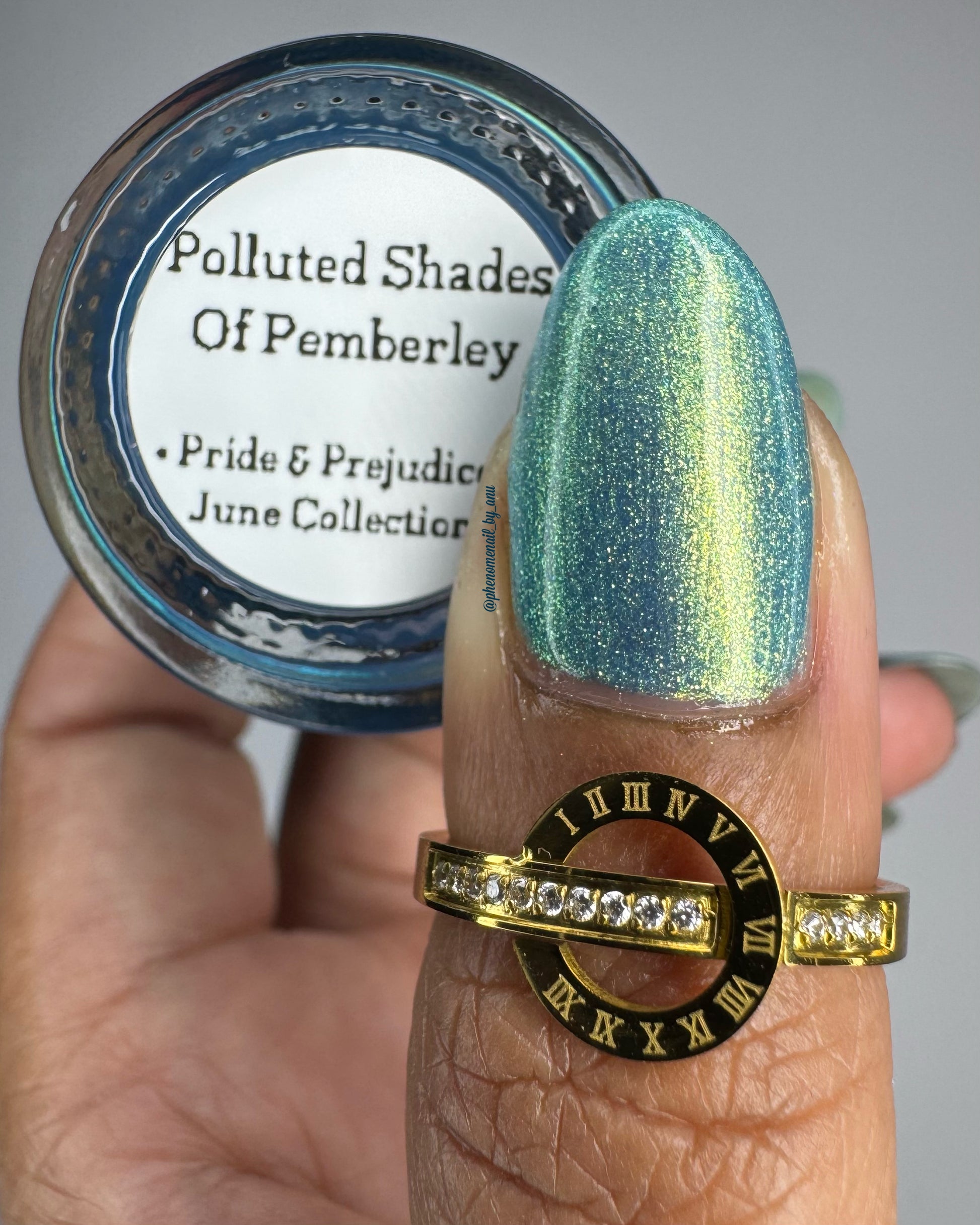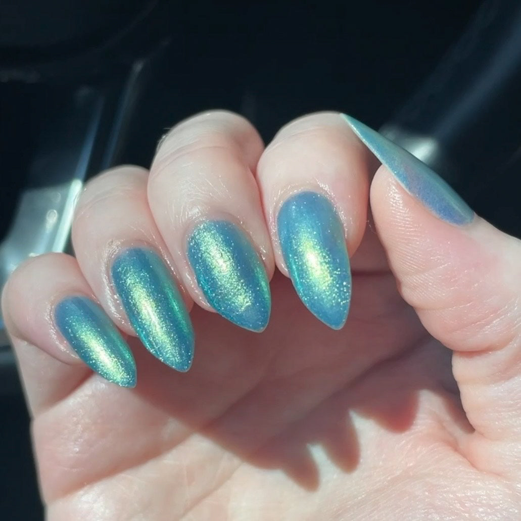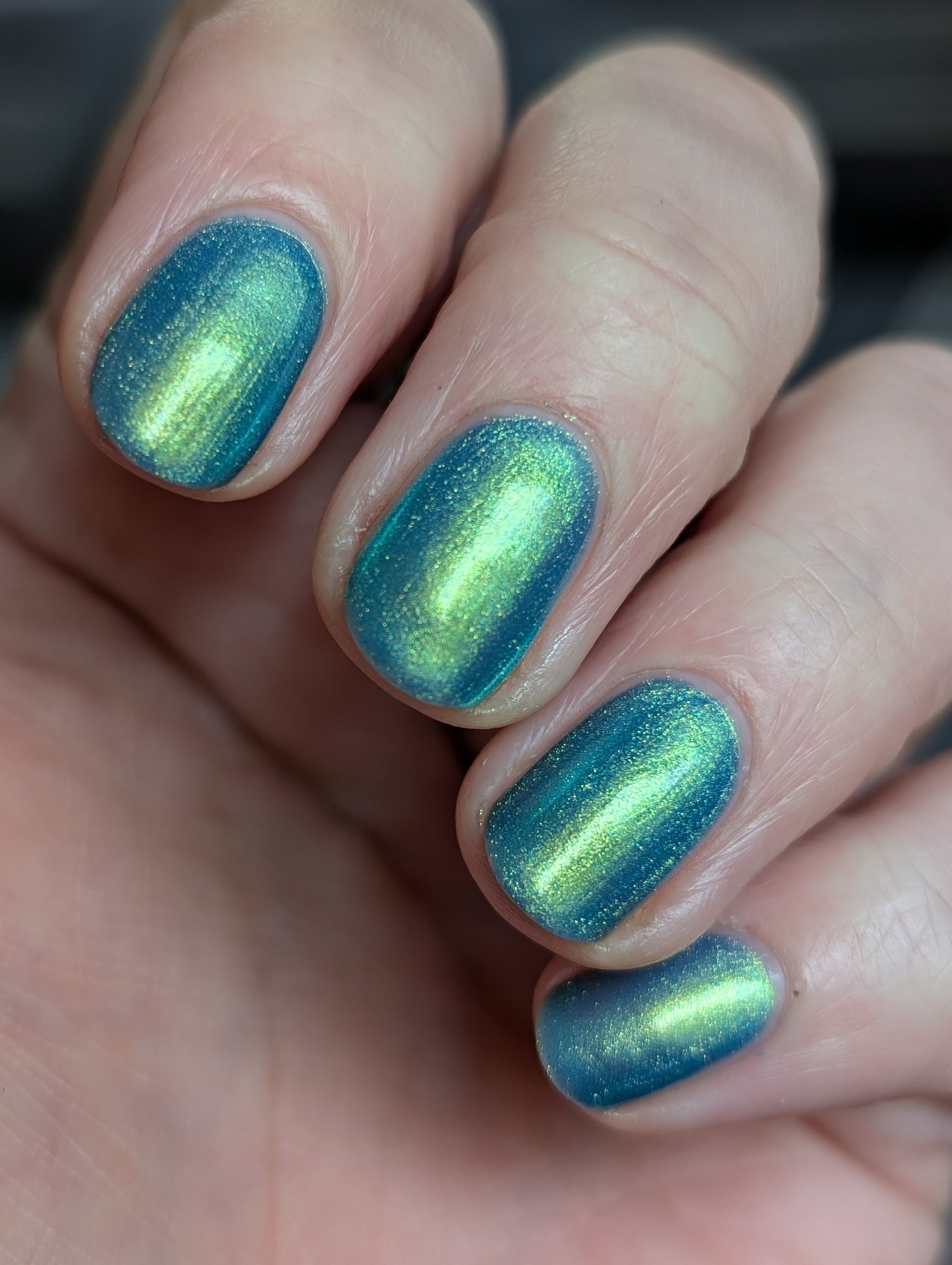 Polluted Shades of Pemberley is a medium teal with intense yellowish shimmer.