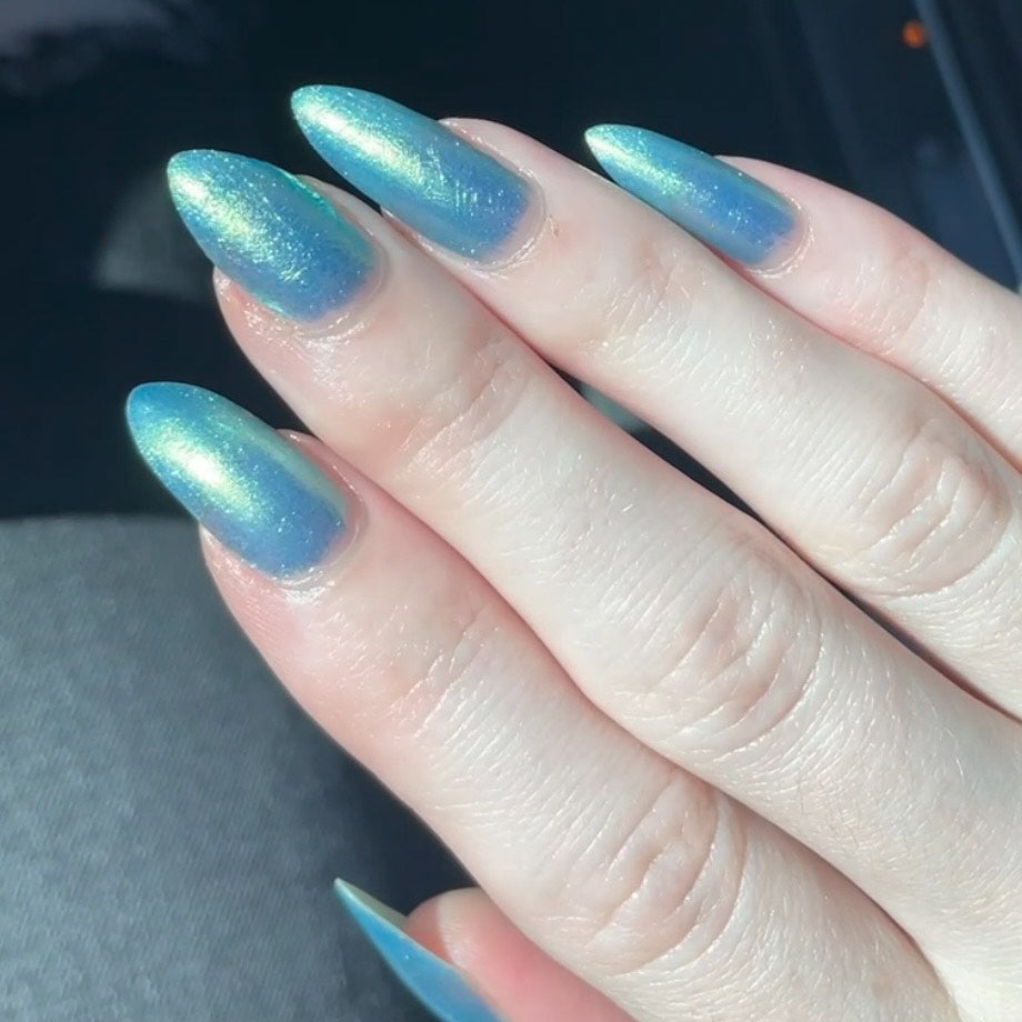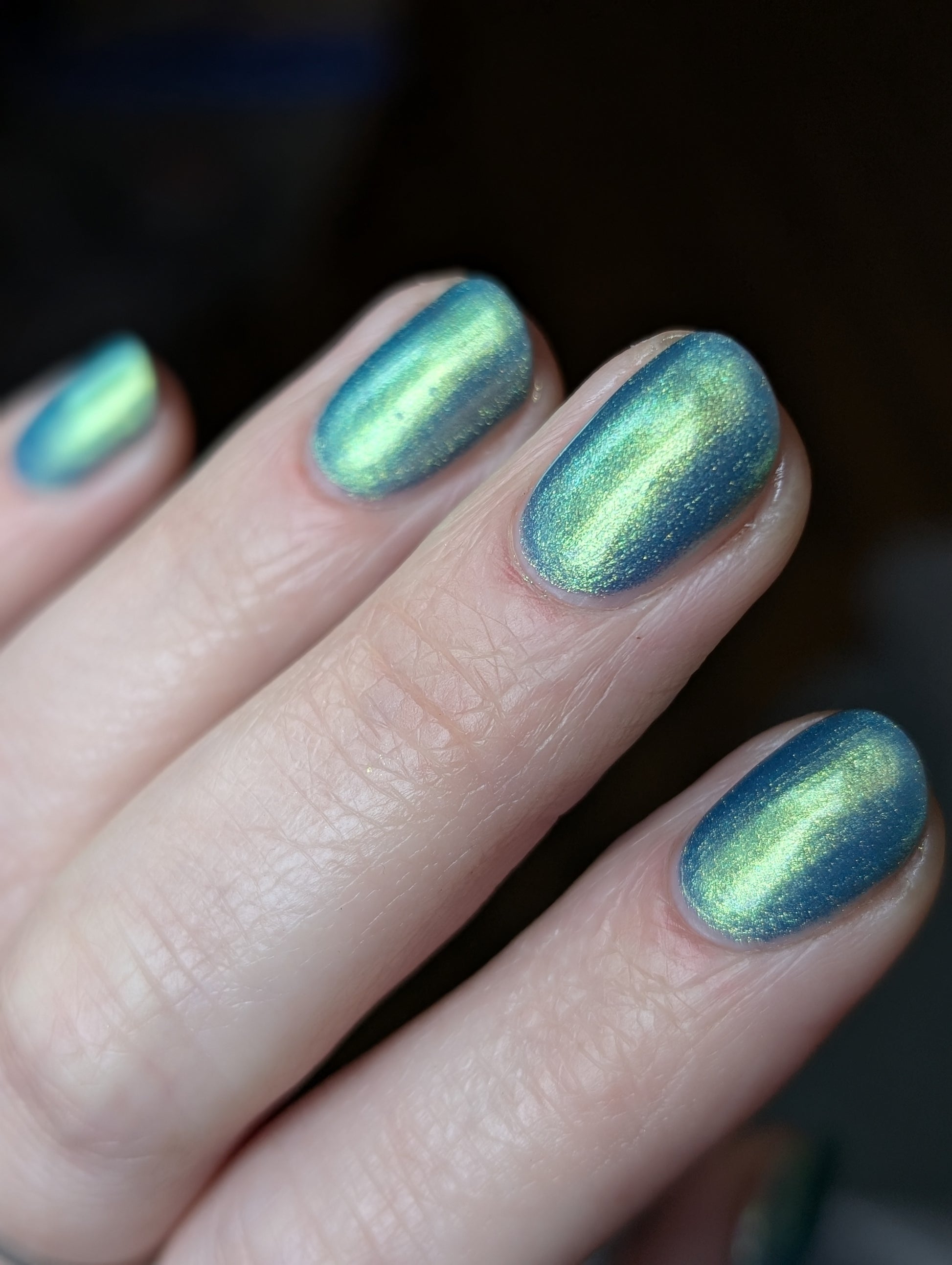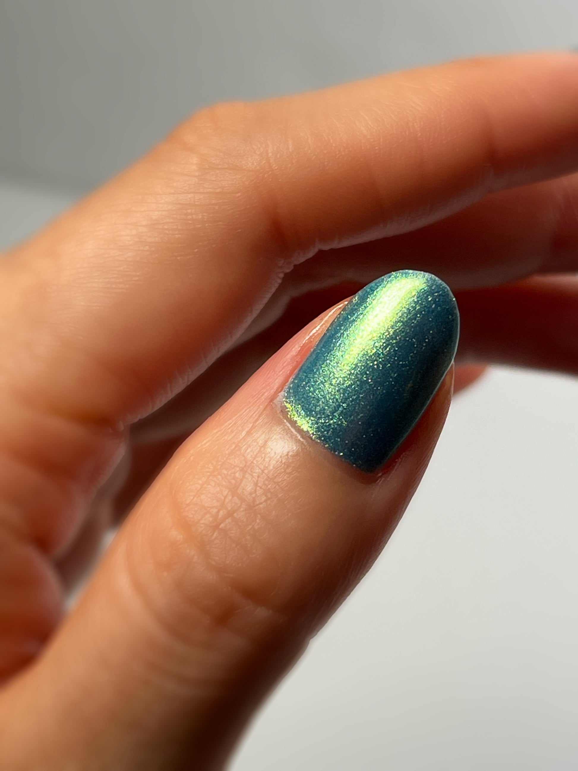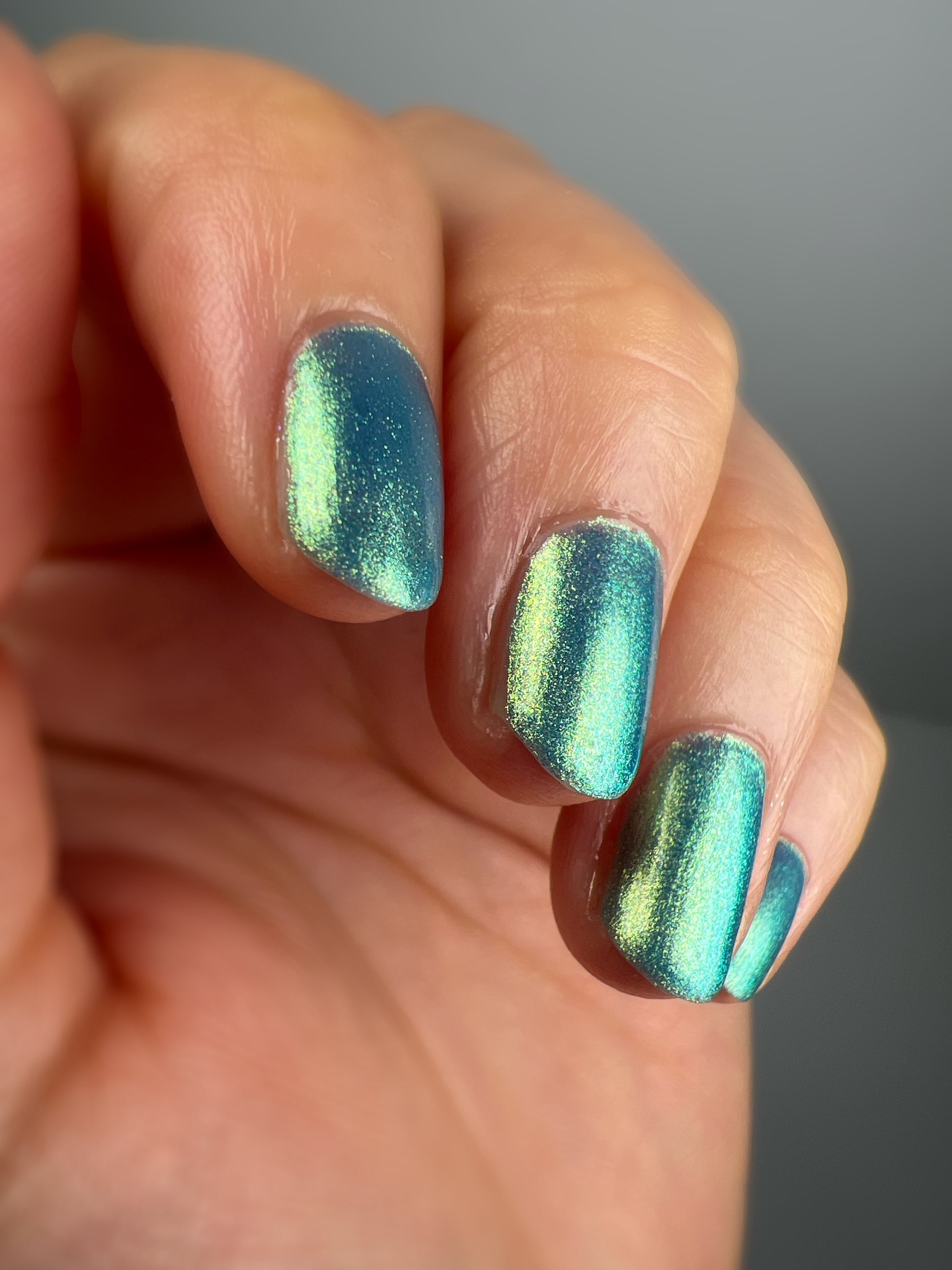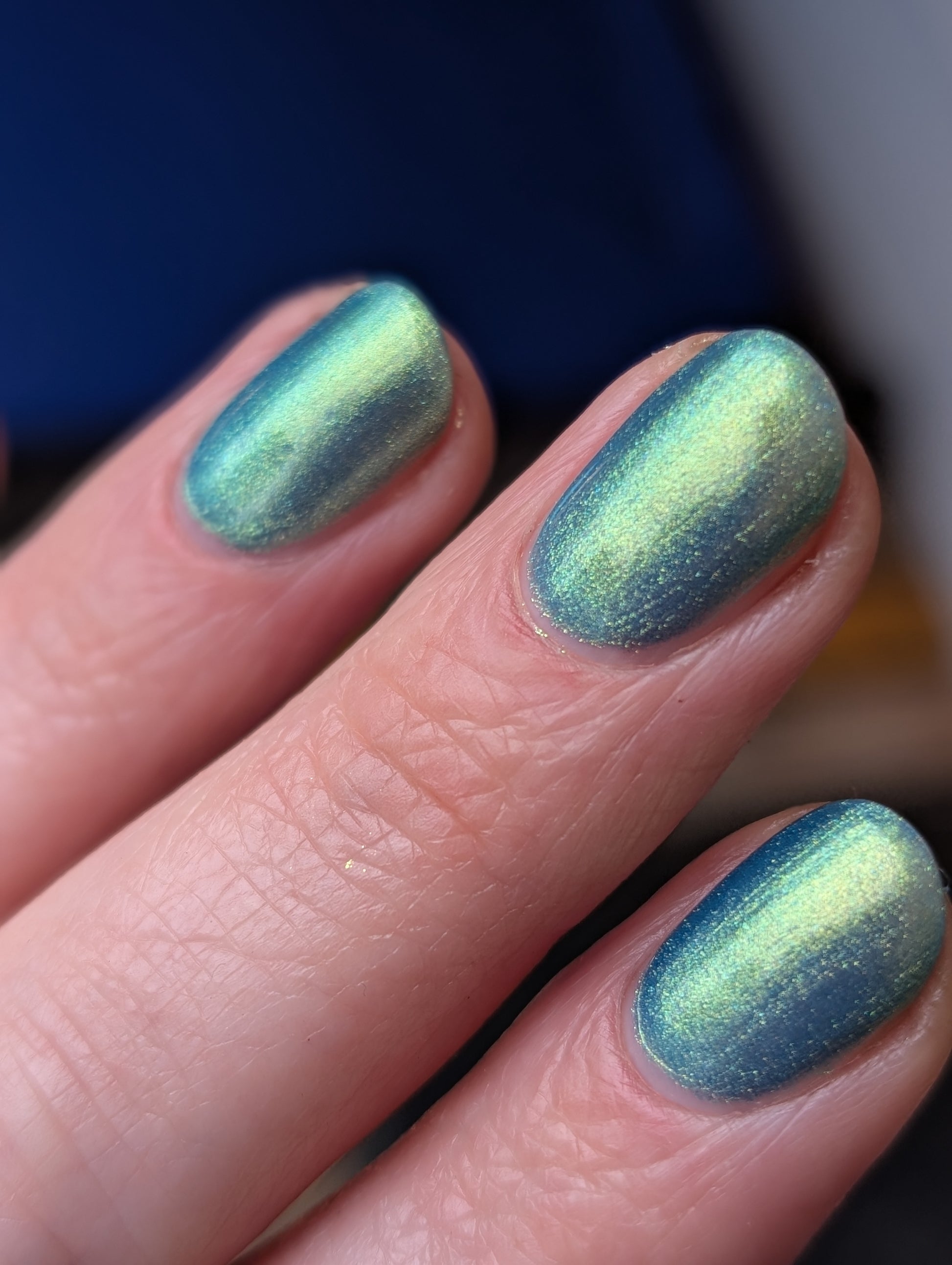 Polluted Shades of Pemberley is a medium teal with intense yellowish shimmer.