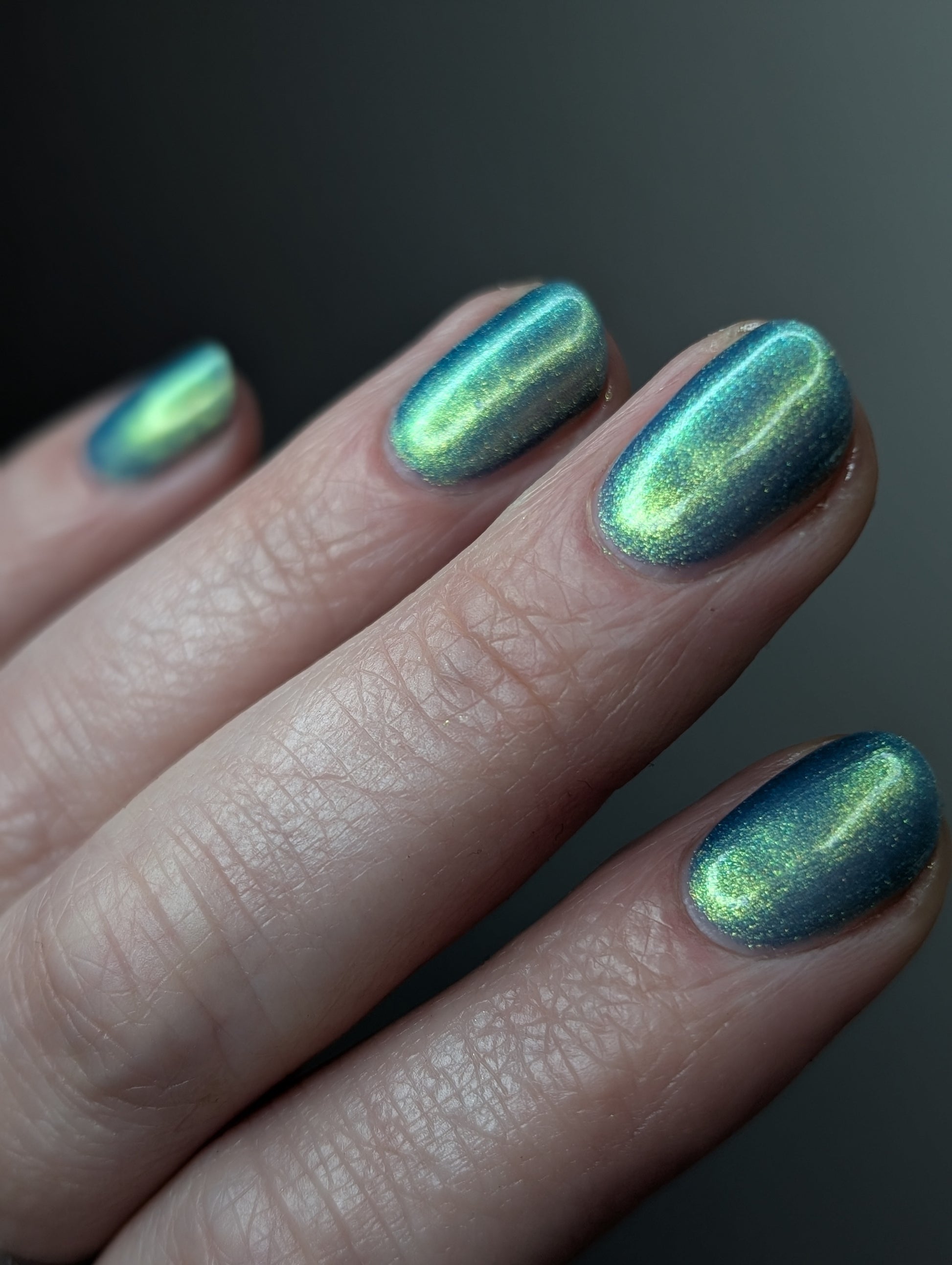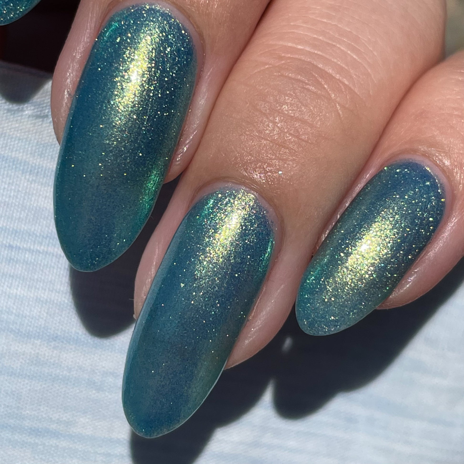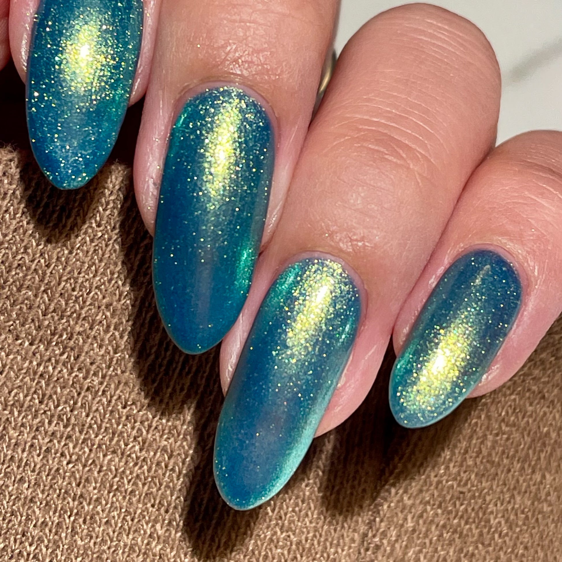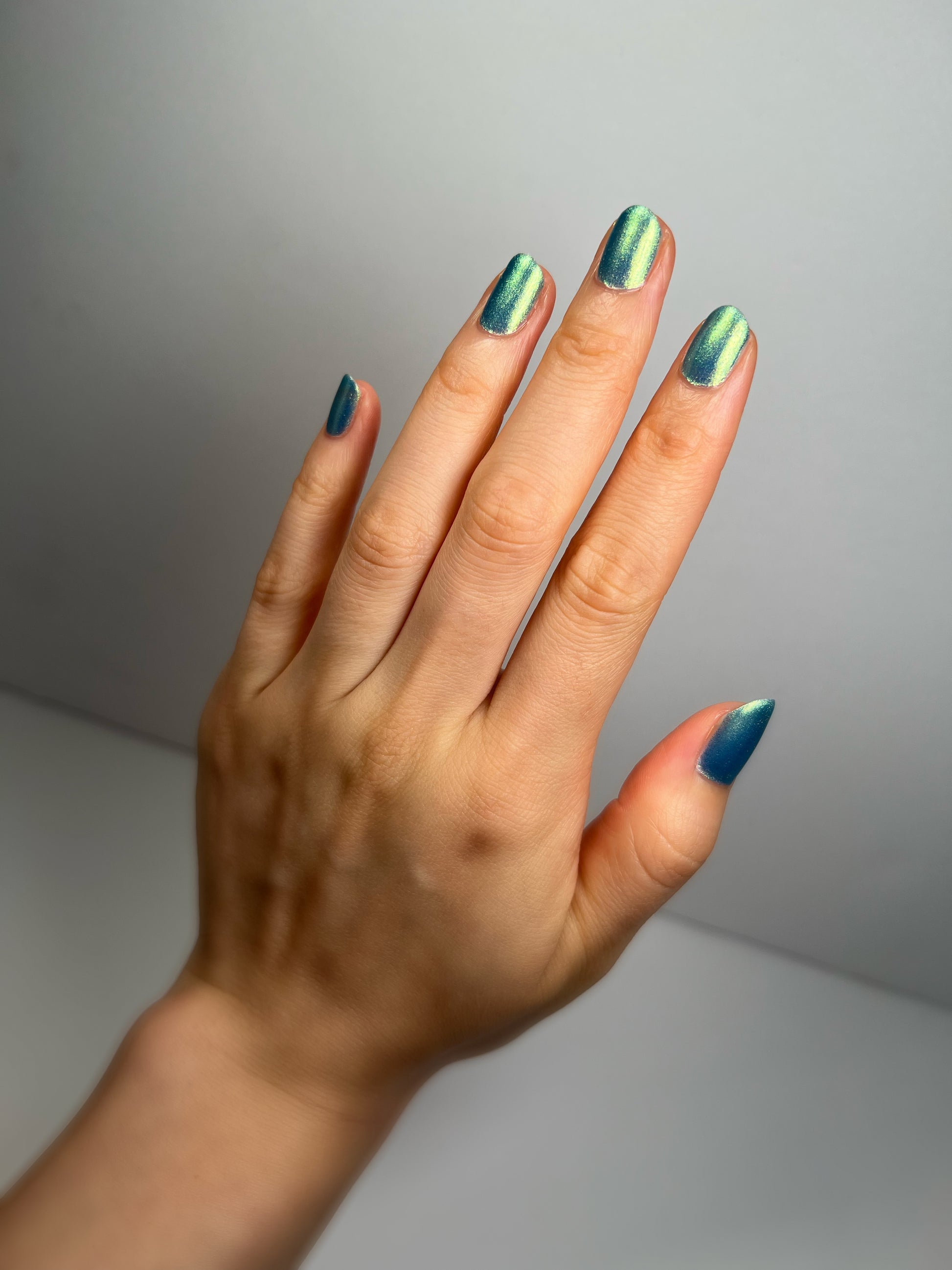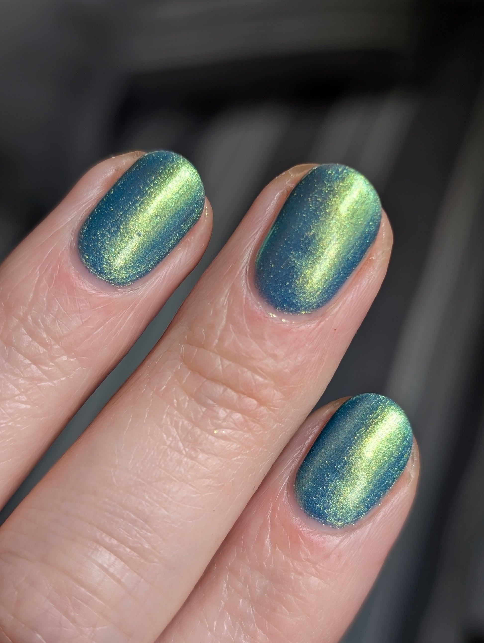 Polluted Shades of Pemberley is a medium teal with intense yellowish shimmer.