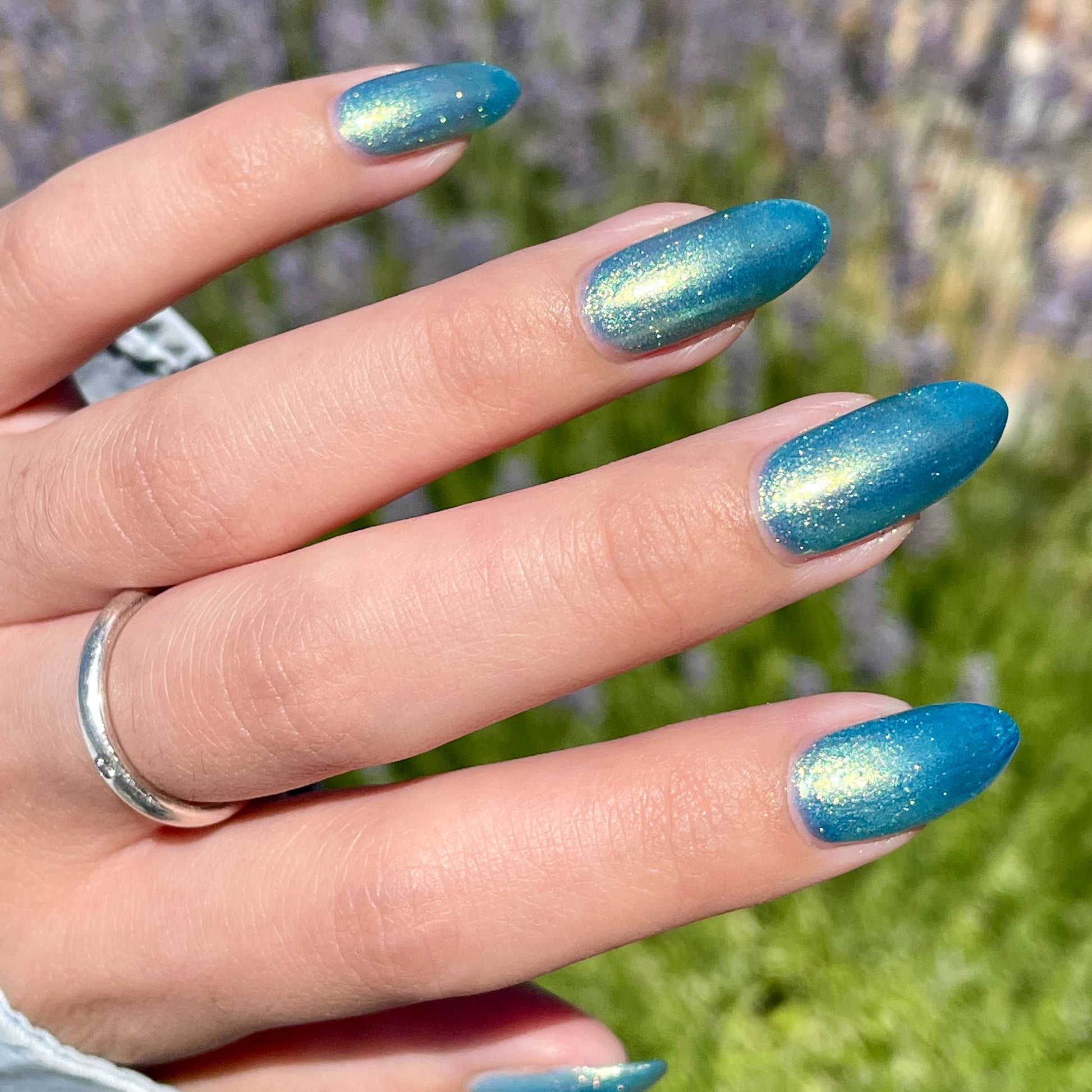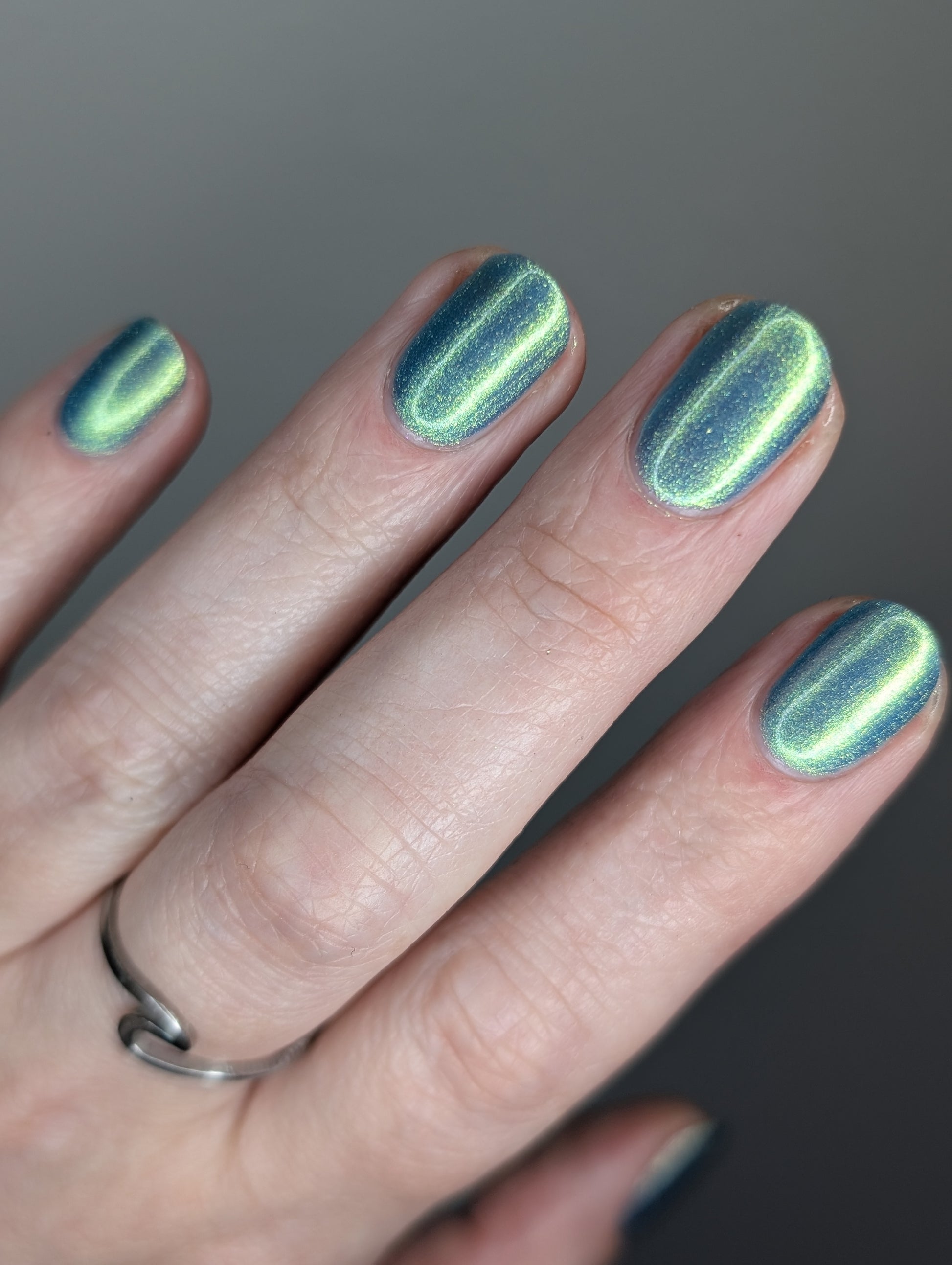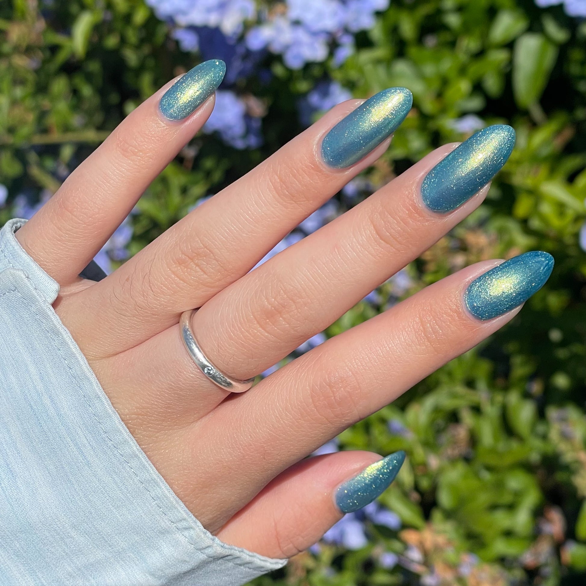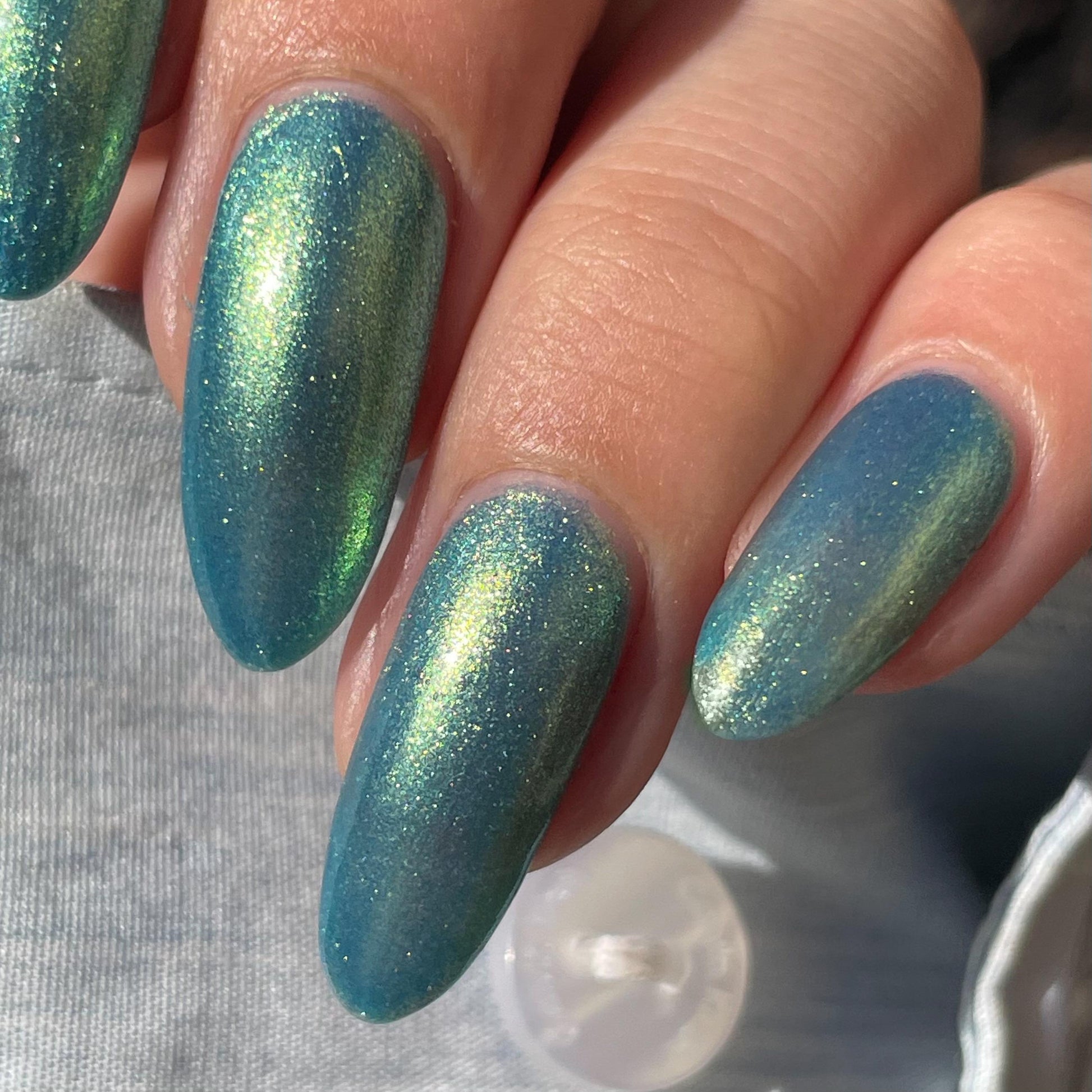 Polluted Shades of Pemberley is a medium teal with intense yellowish shimmer.