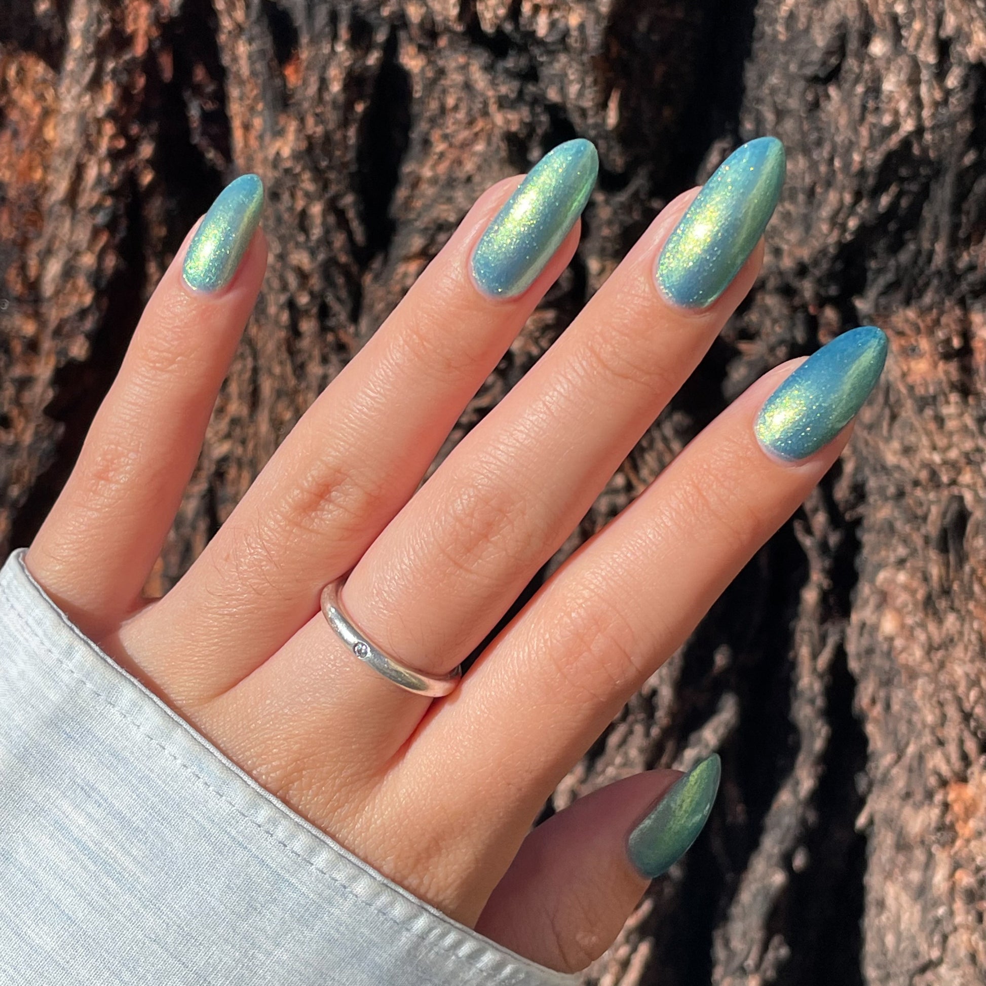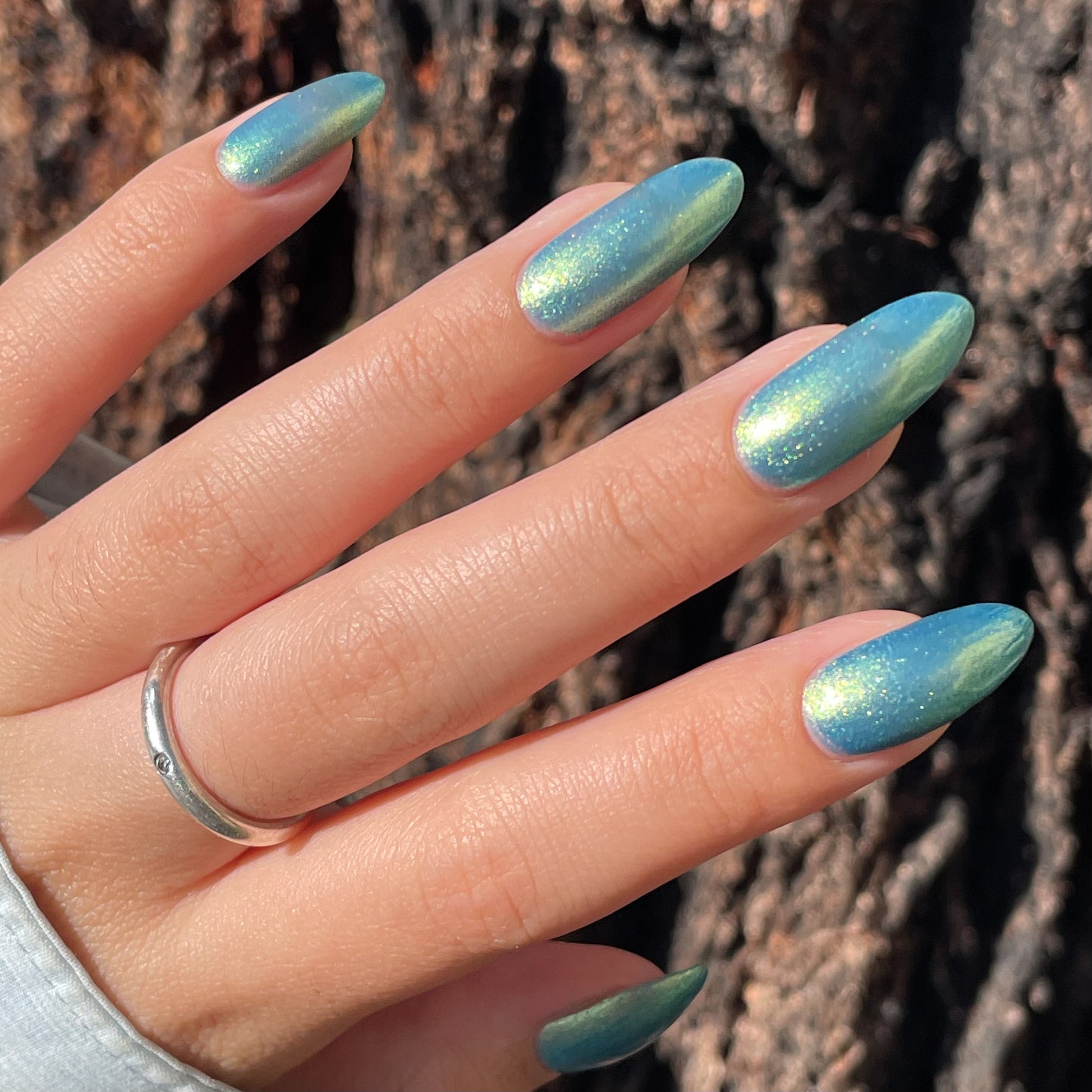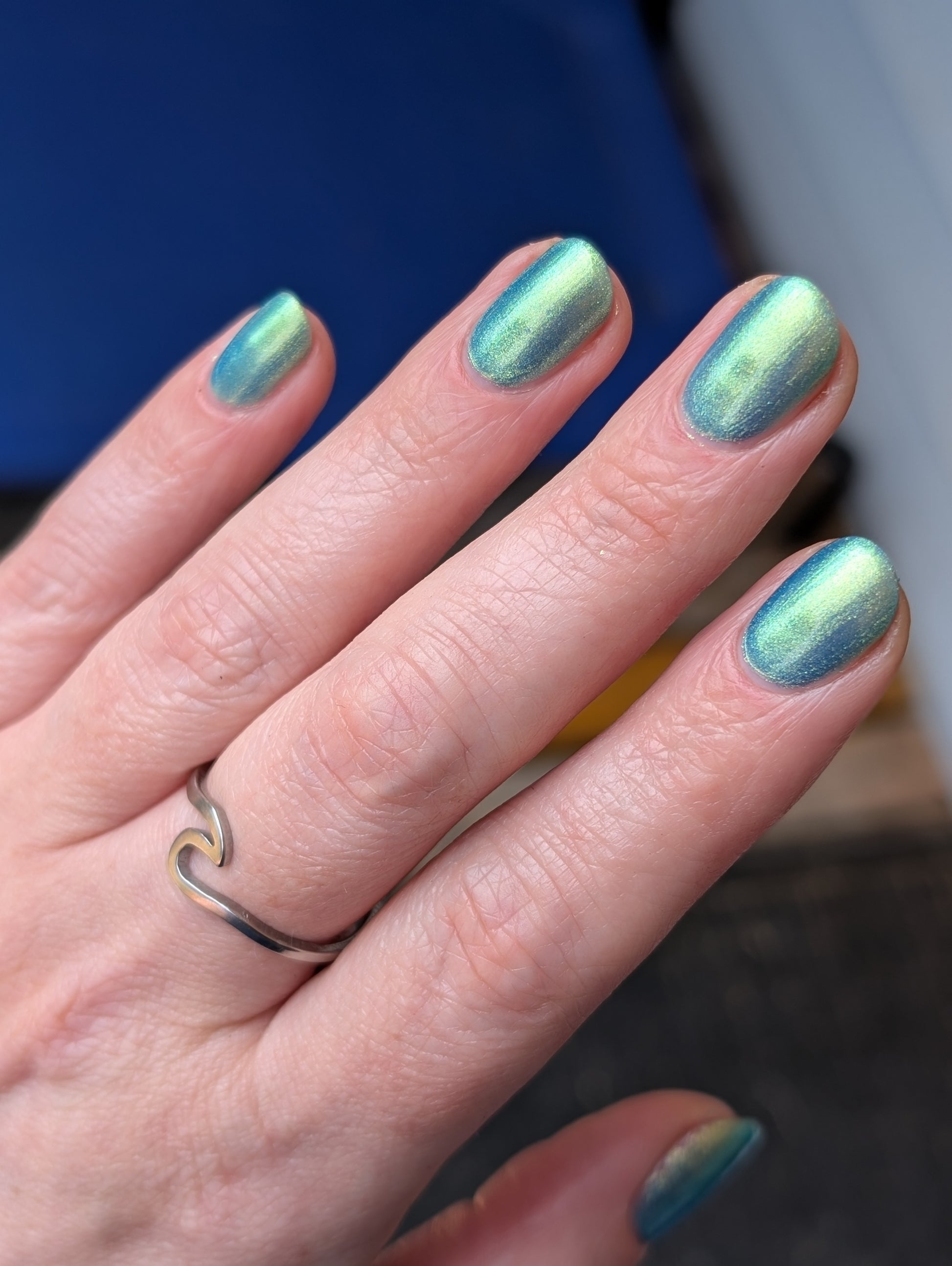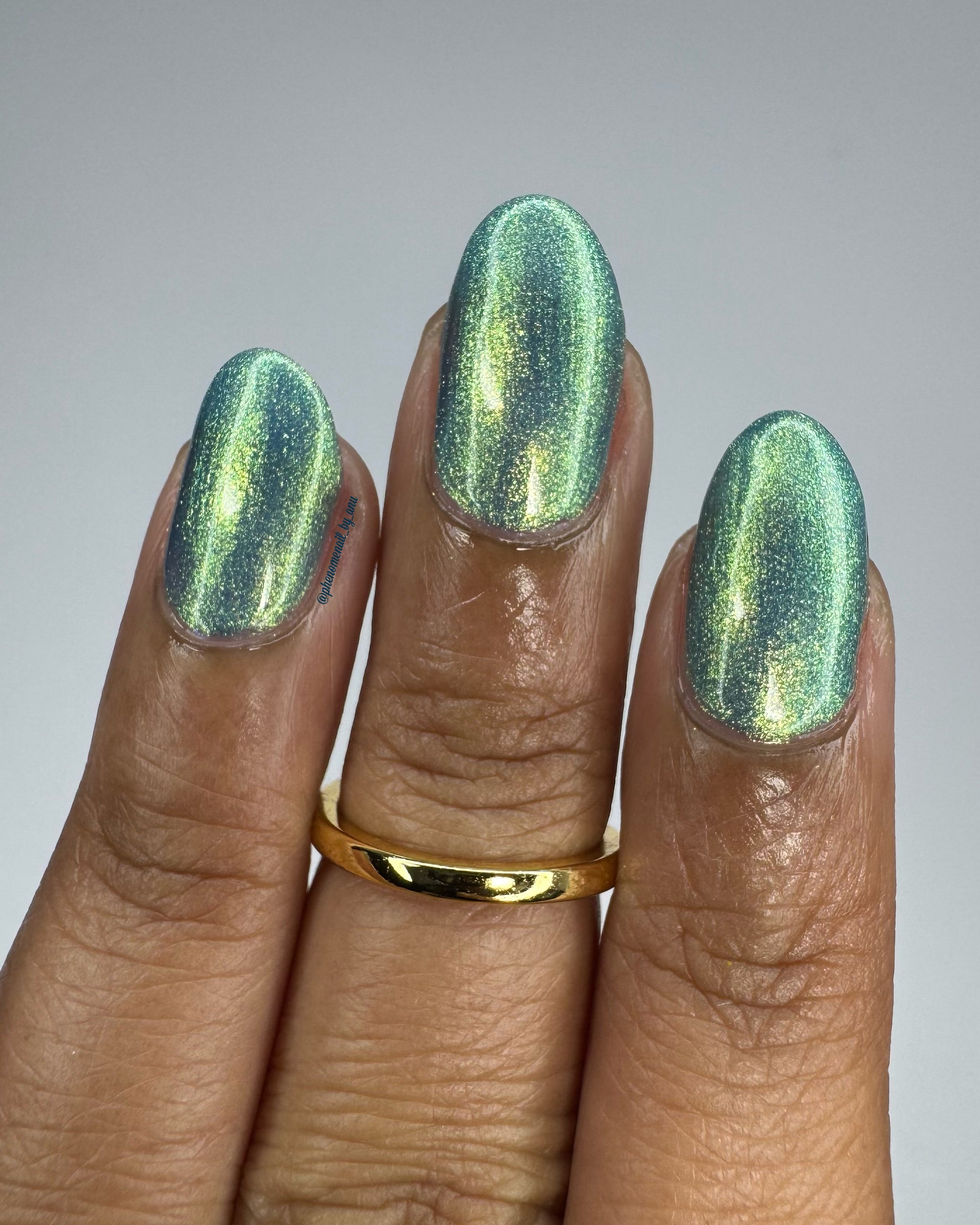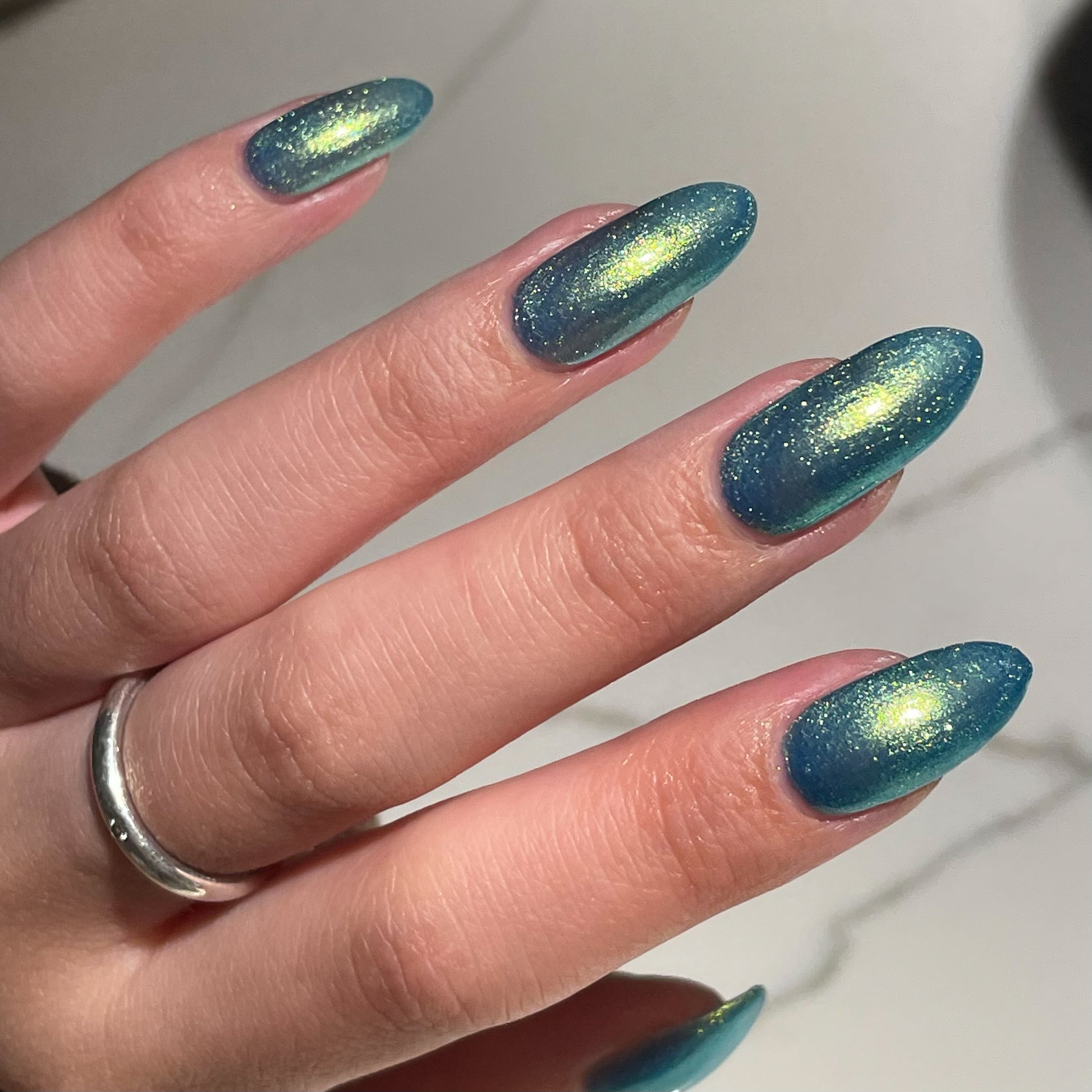 Polluted Shades of Pemberley is a medium teal with intense yellowish shimmer.