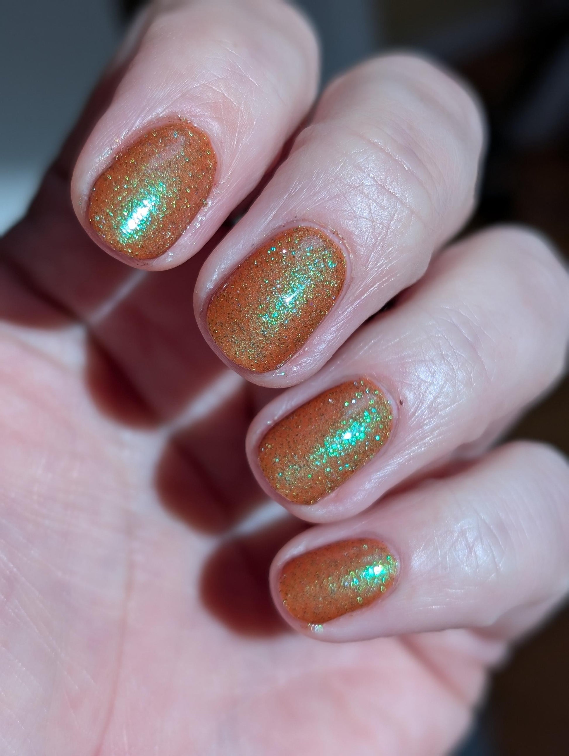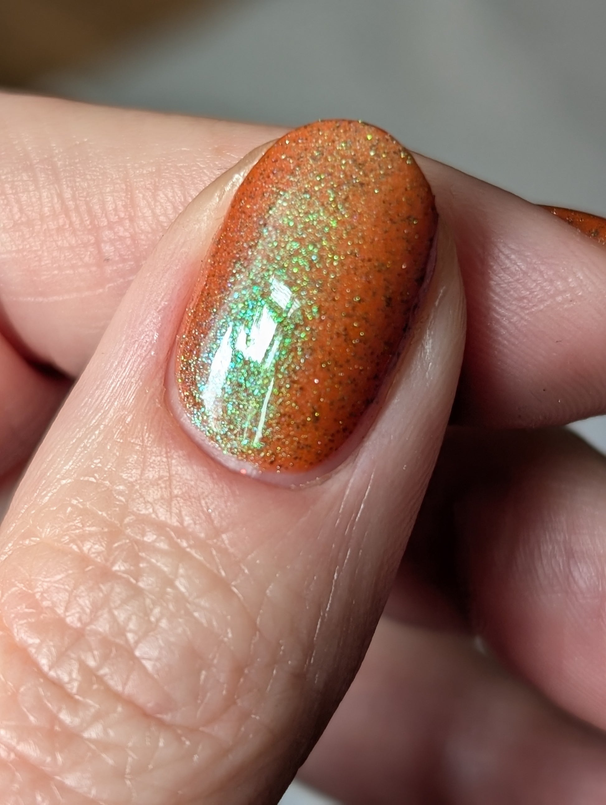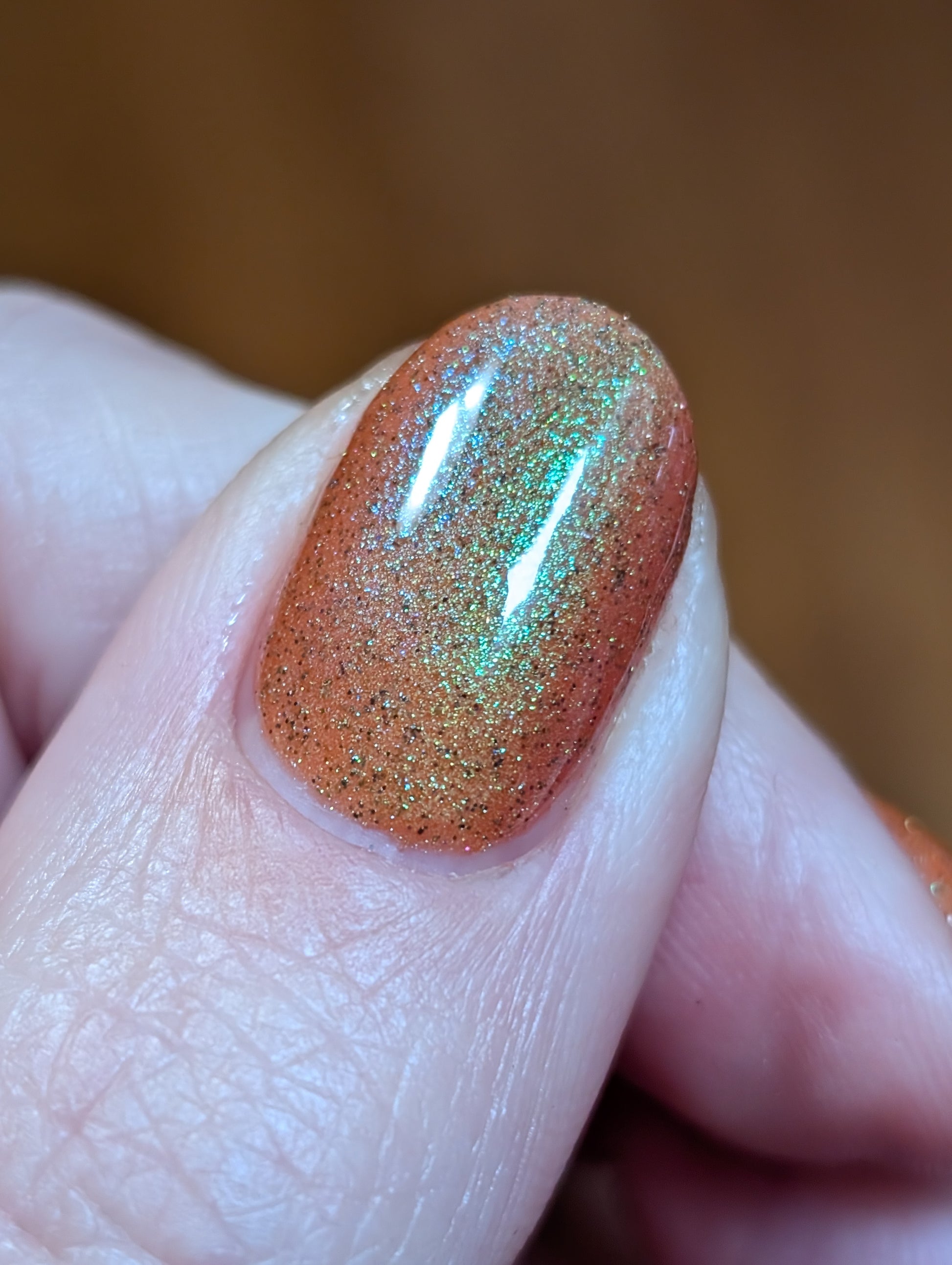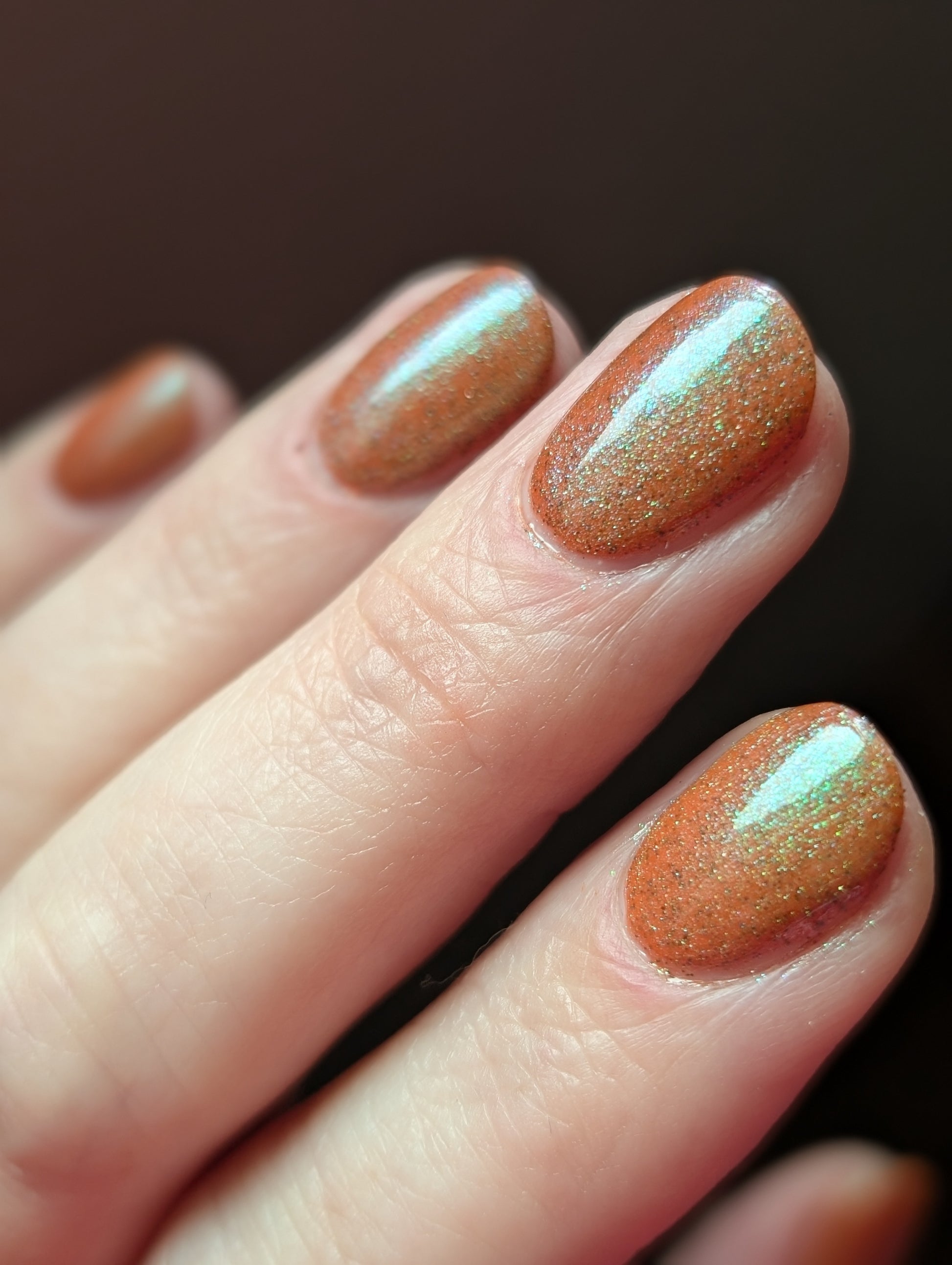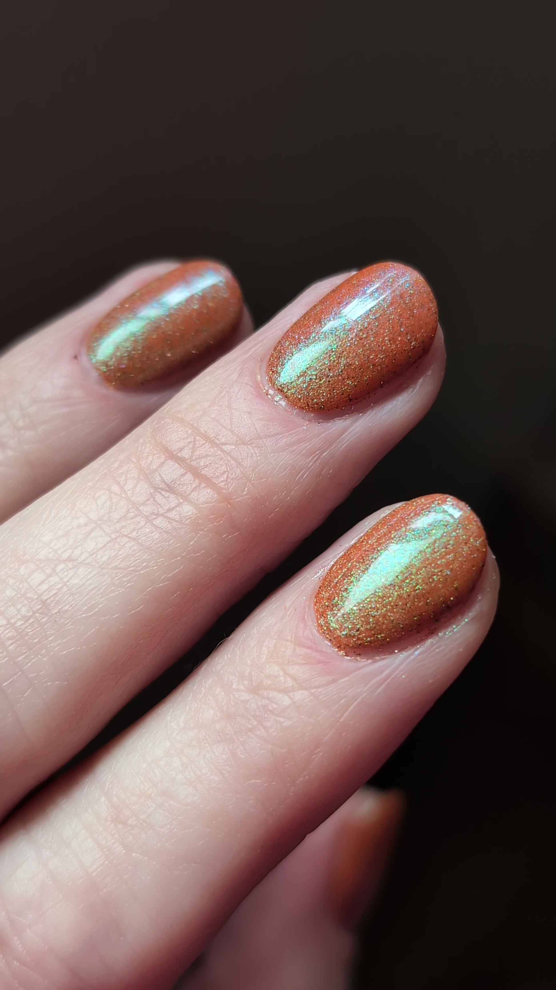 Pumpkin Queen is a terracotta orange lacquer with micro black holo glitter and green-blue shimmer. Dries very textured. Best in 2-3 coats.