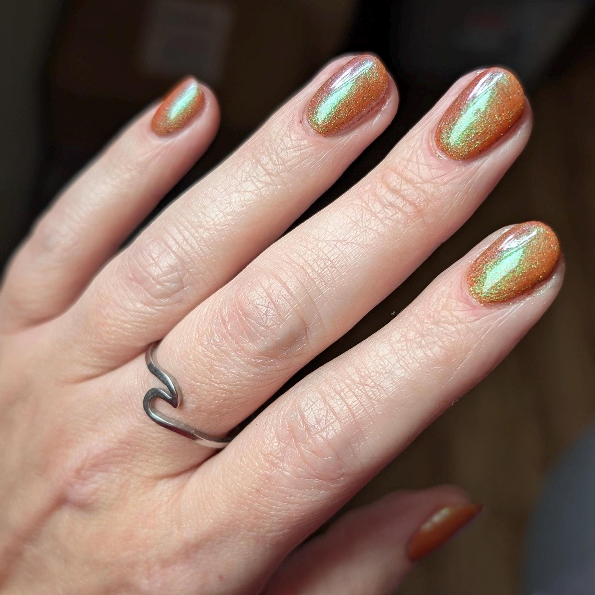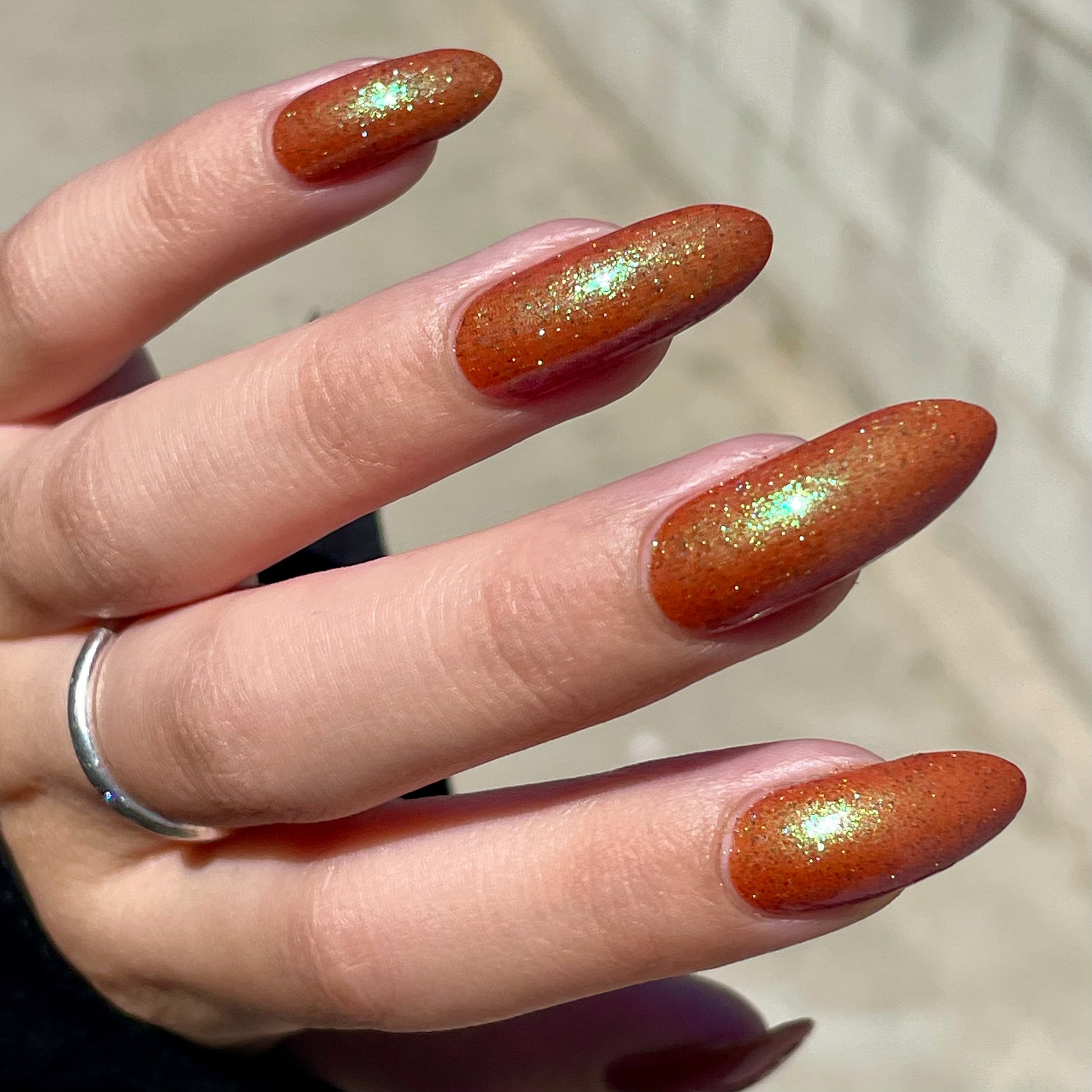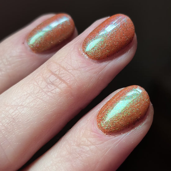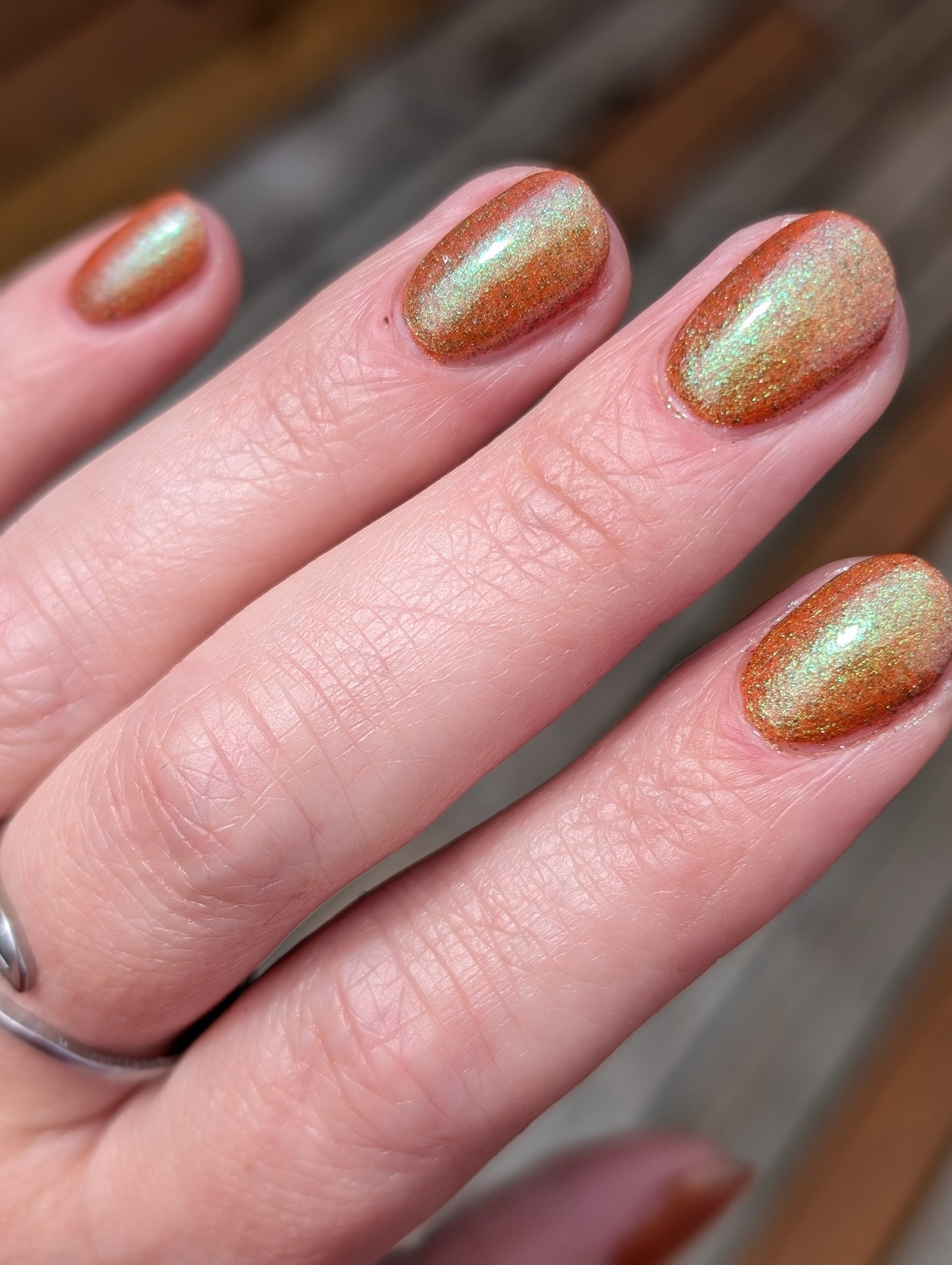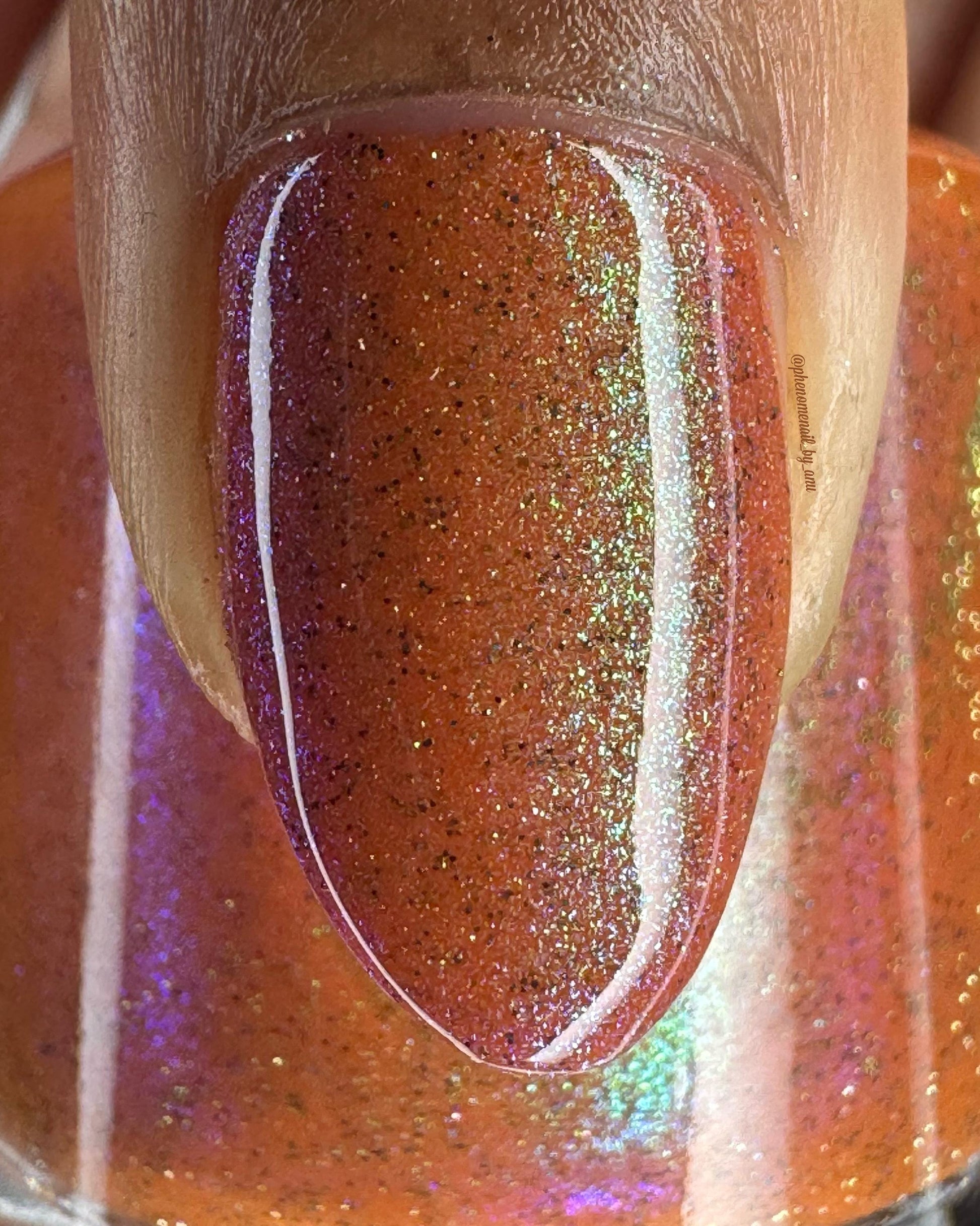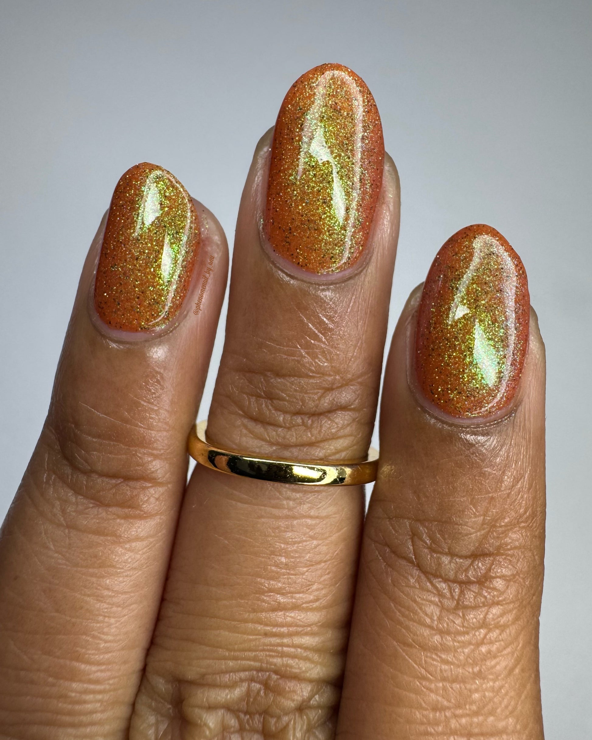 Pumpkin Queen is a terracotta orange lacquer with micro black holo glitter and green-blue shimmer. Dries very textured. Best in 2-3 coats.
