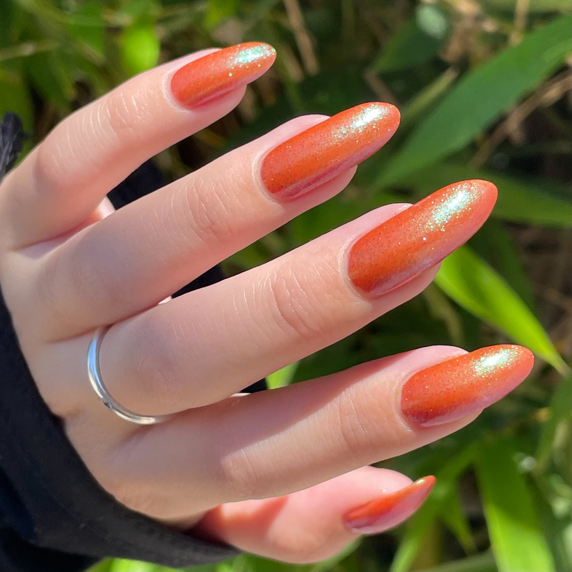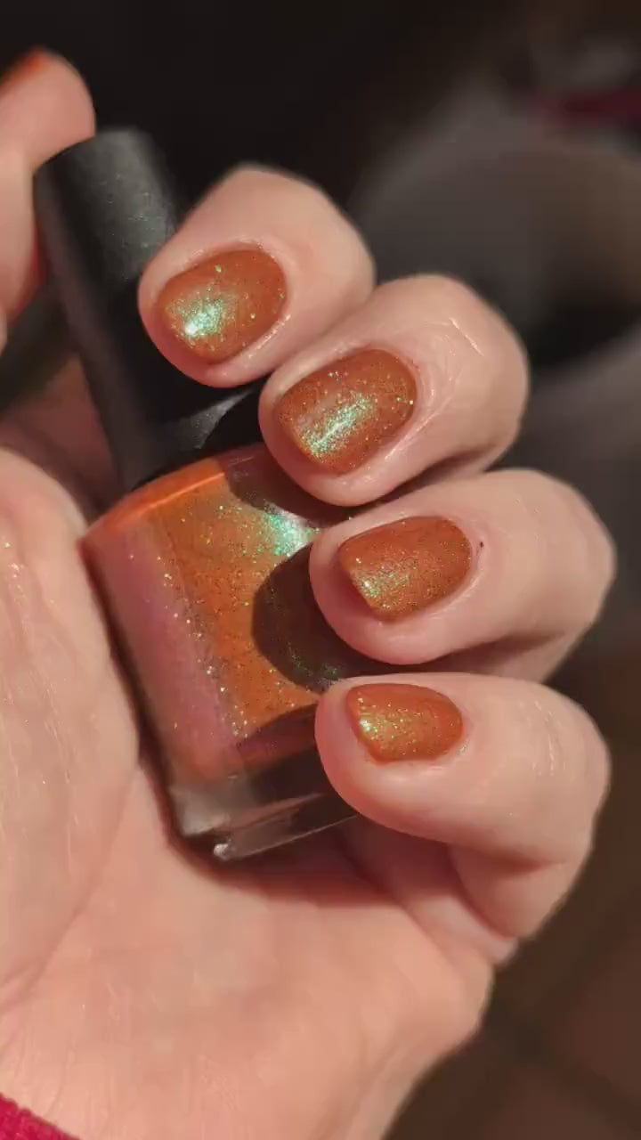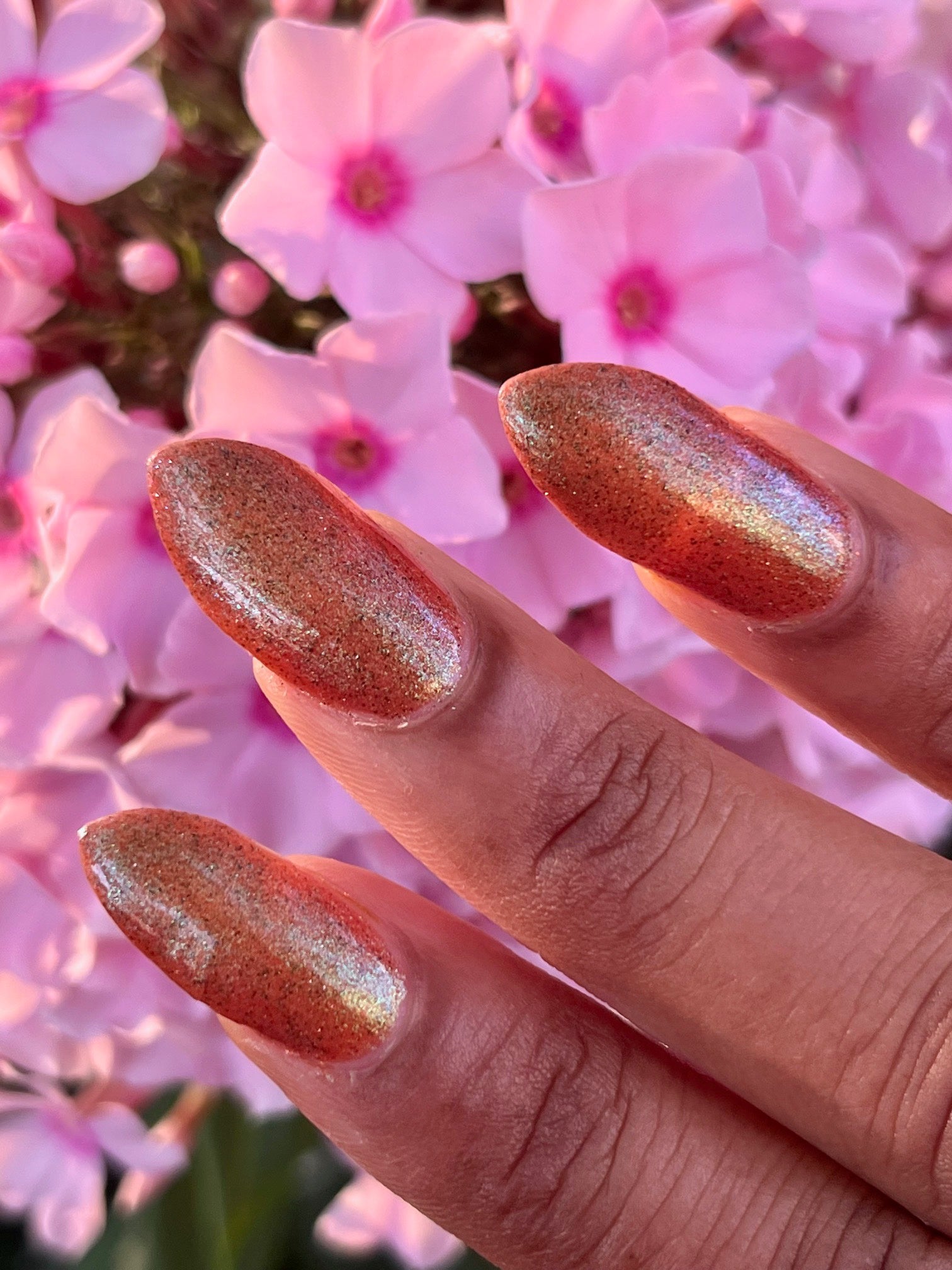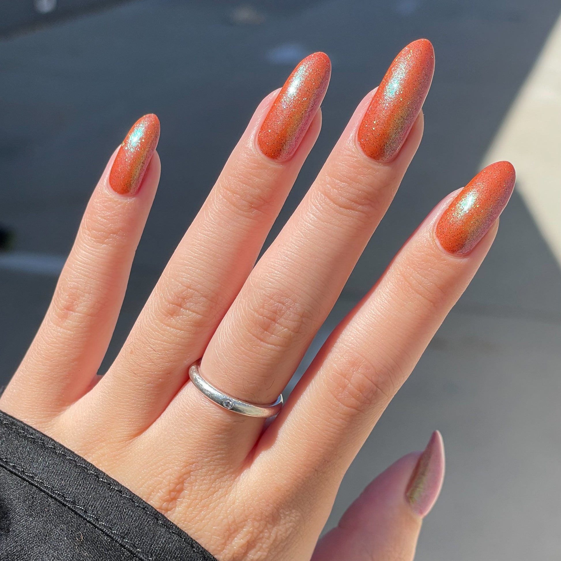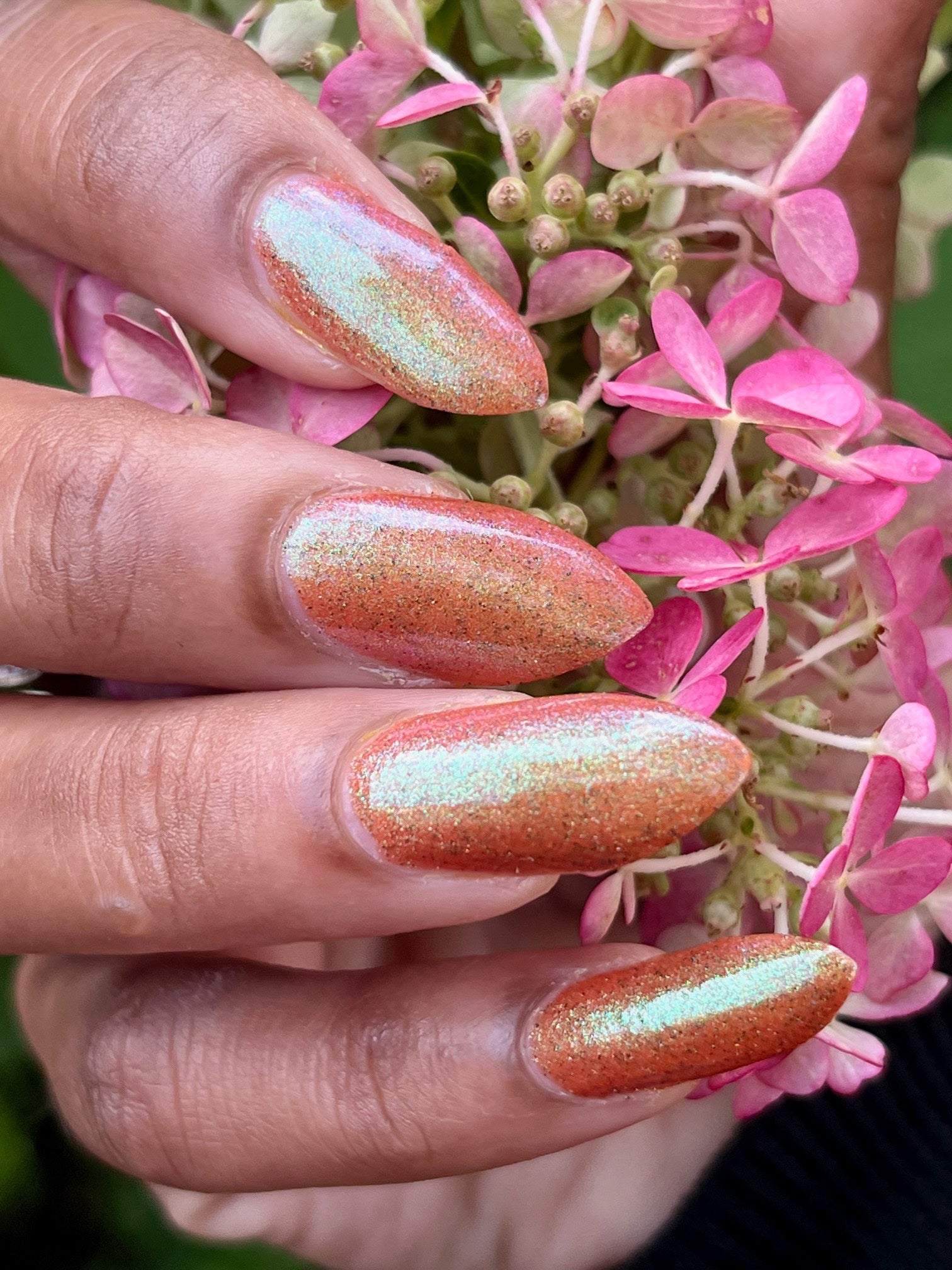 Pumpkin Queen is a terracotta orange lacquer with micro black holo glitter and green-blue shimmer. Dries very textured. Best in 2-3 coats.