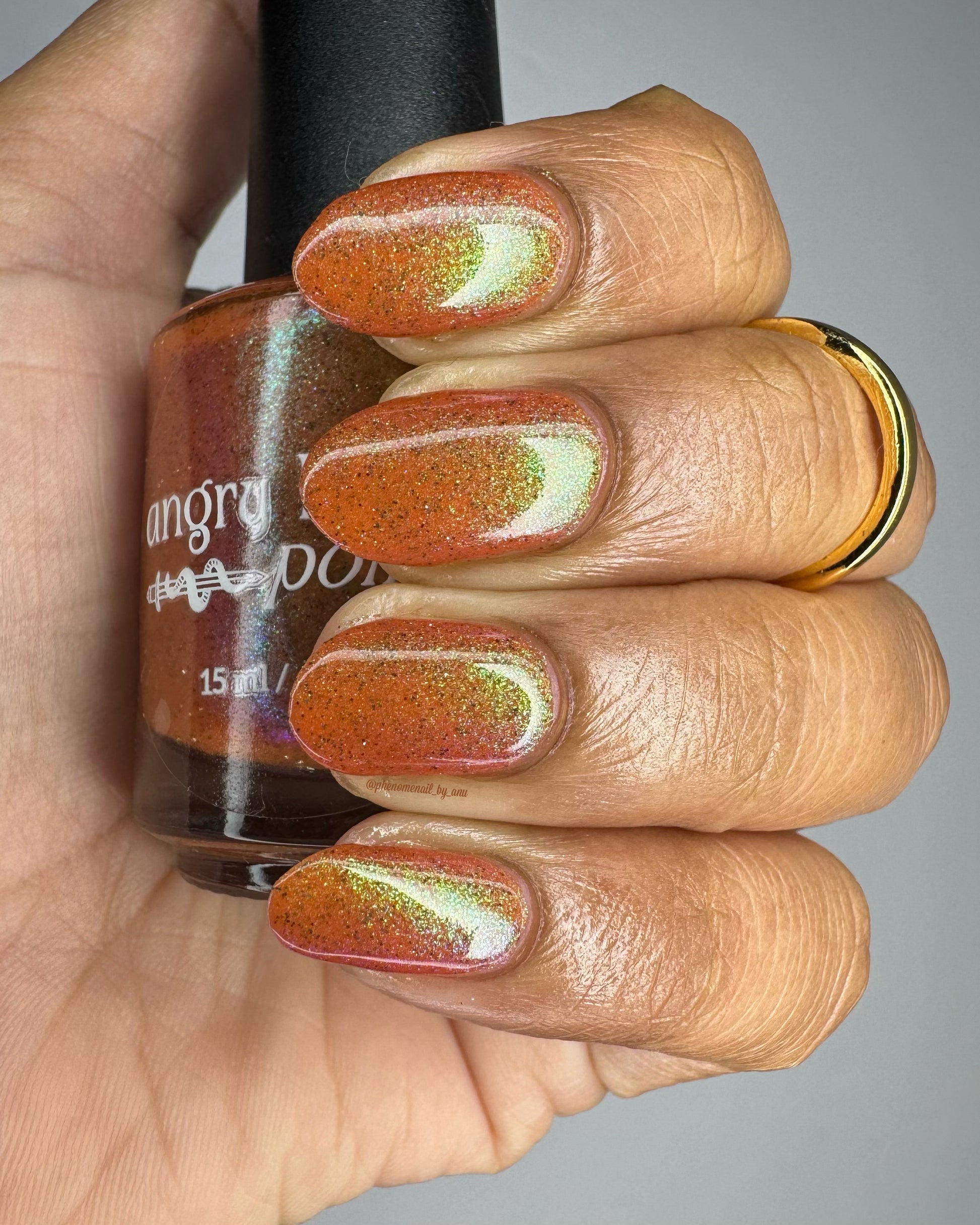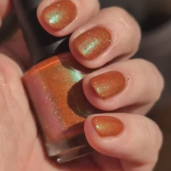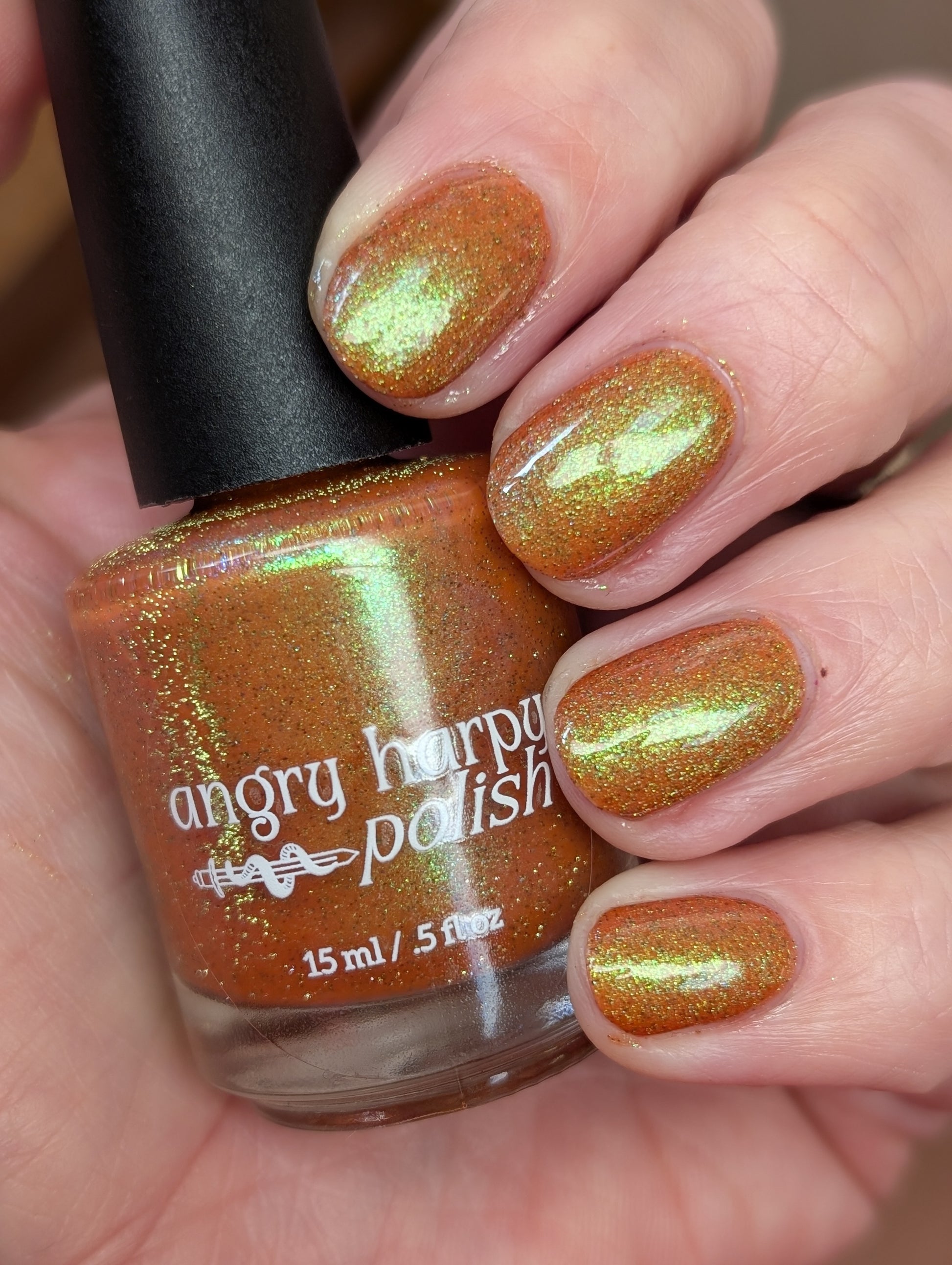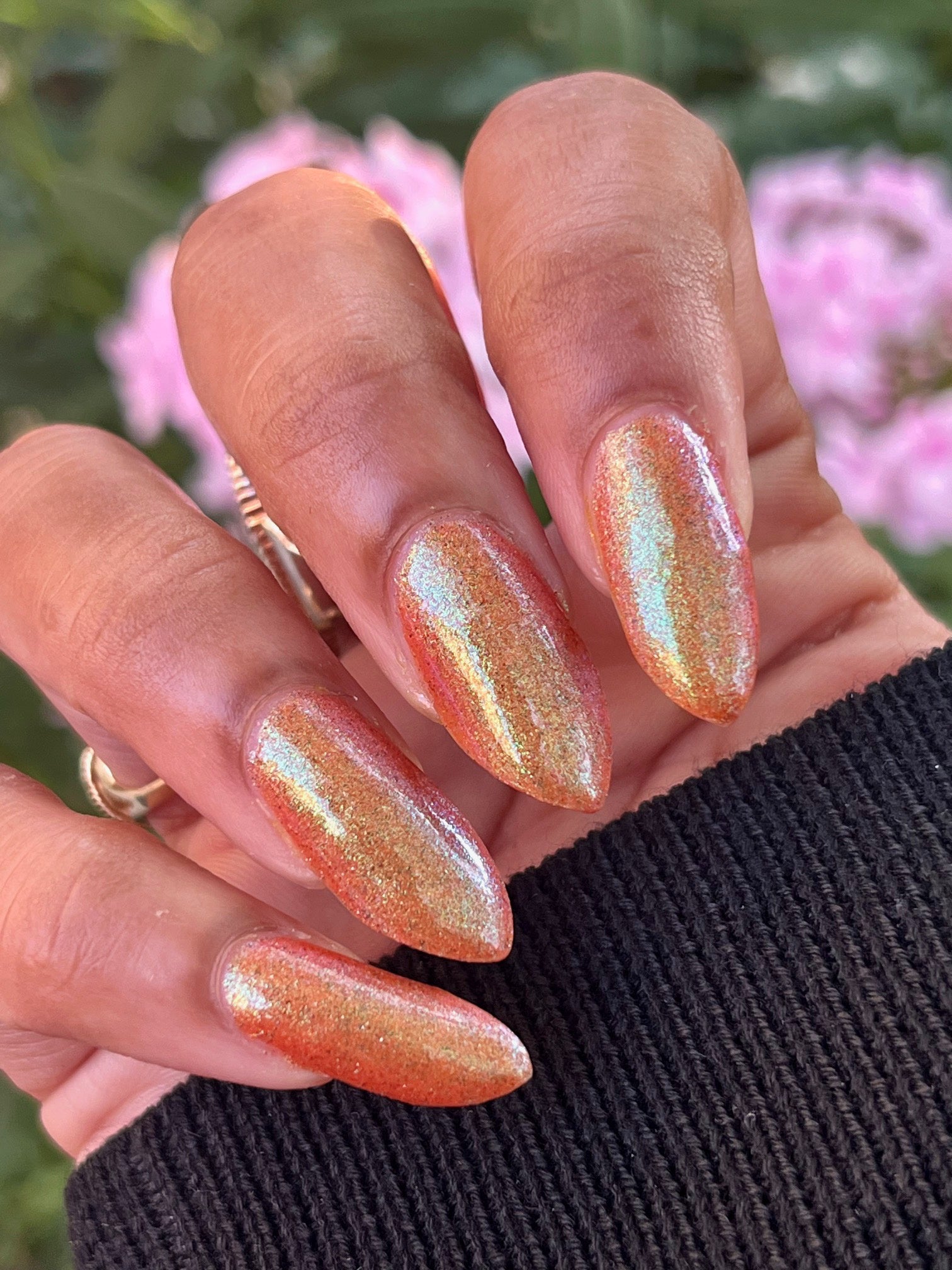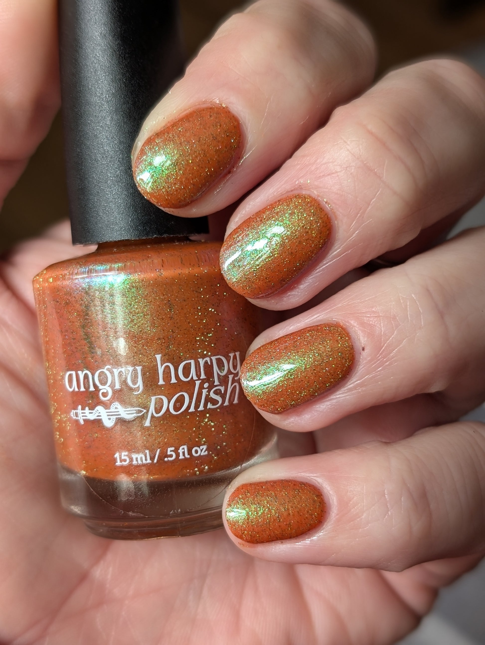 Pumpkin Queen is a terracotta orange lacquer with micro black holo glitter and green-blue shimmer. Dries very textured. Best in 2-3 coats.