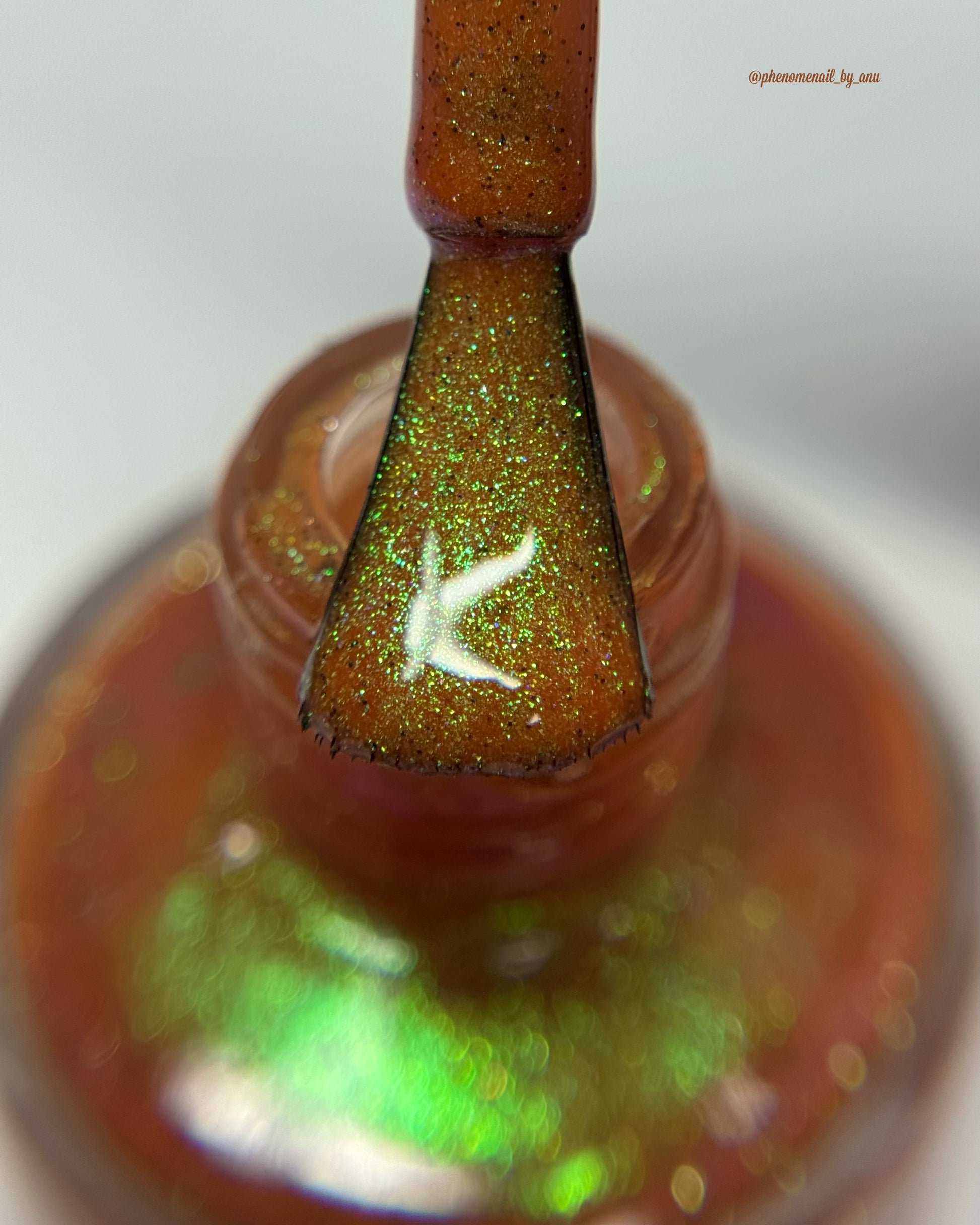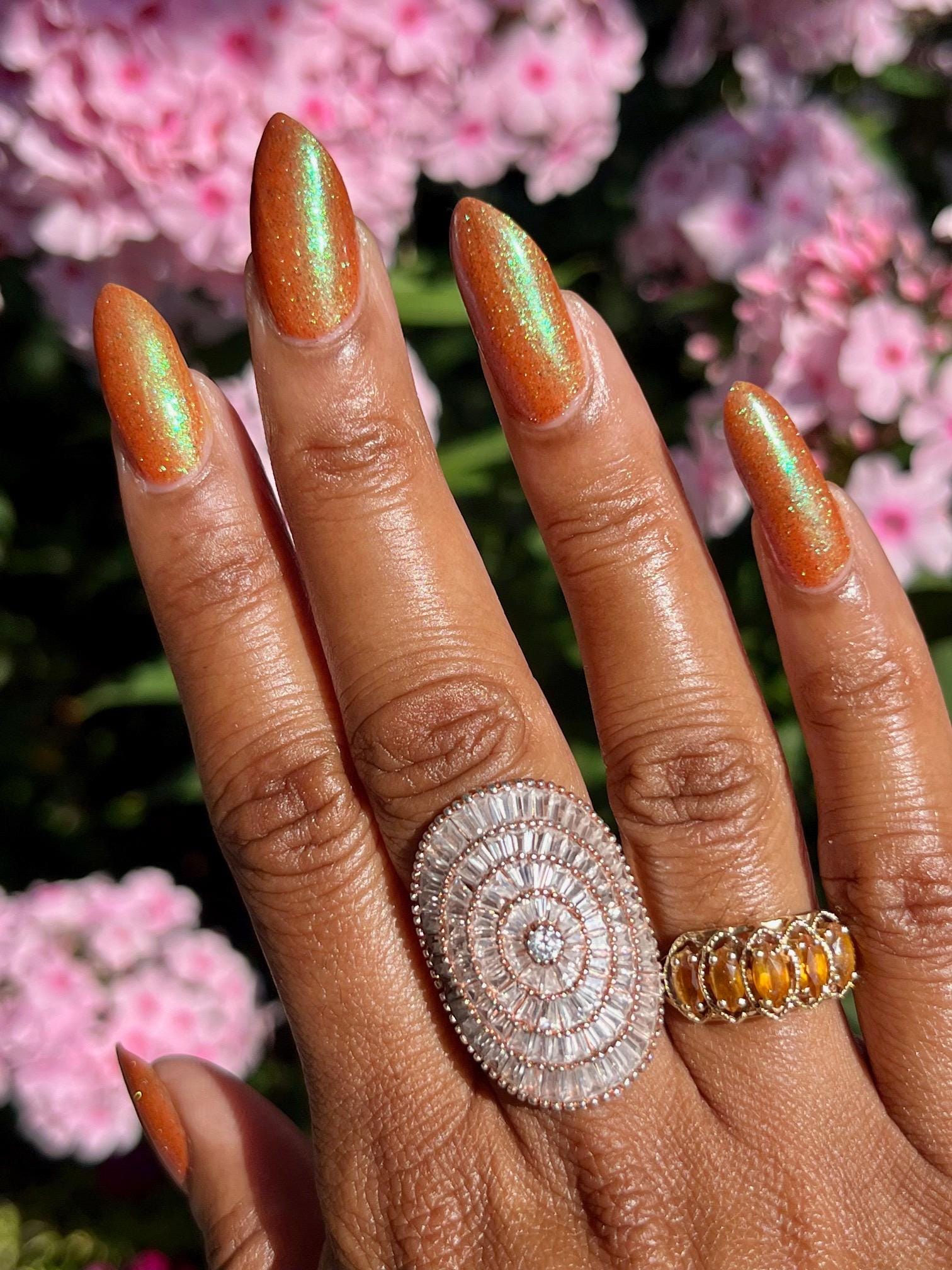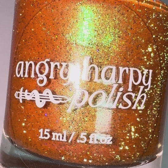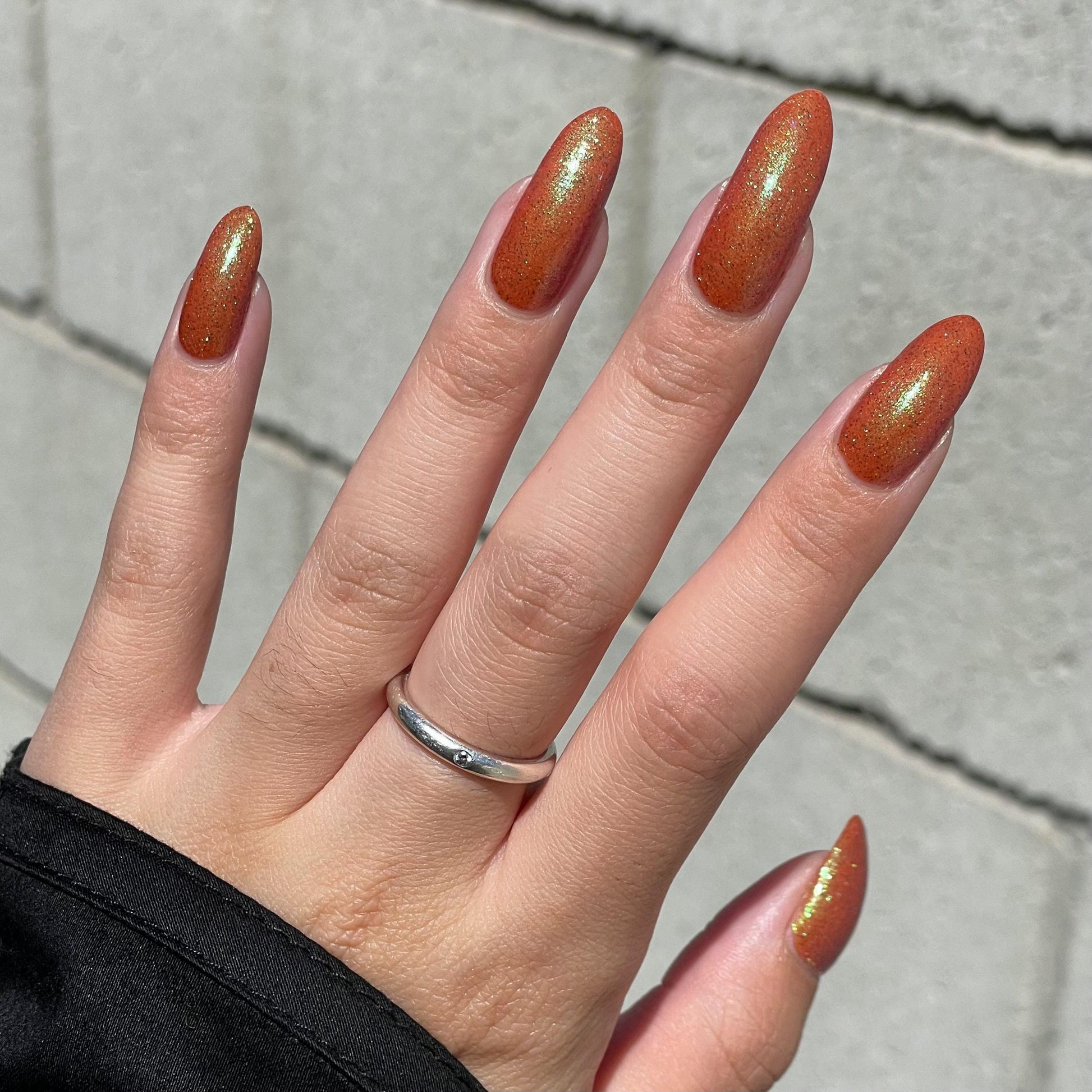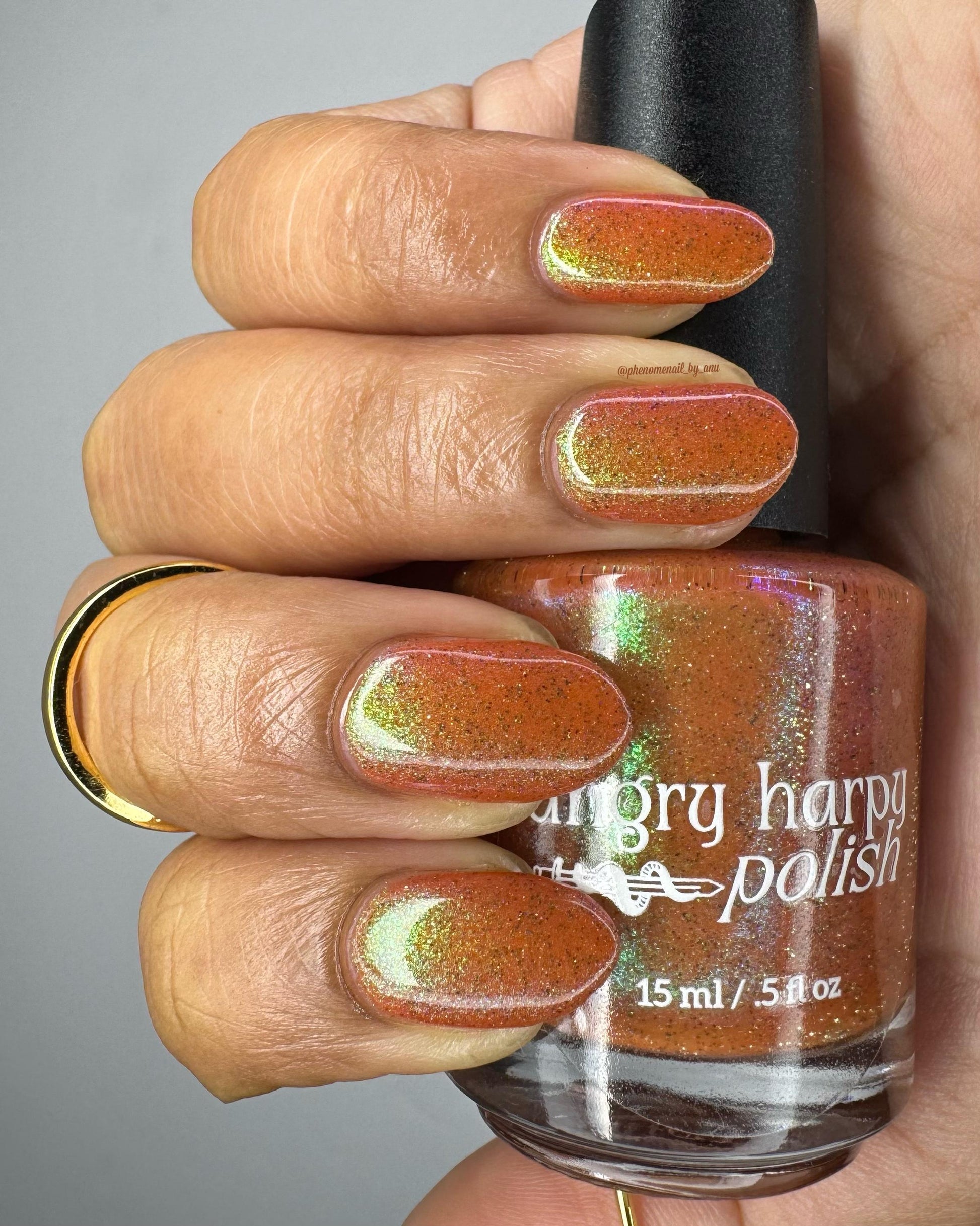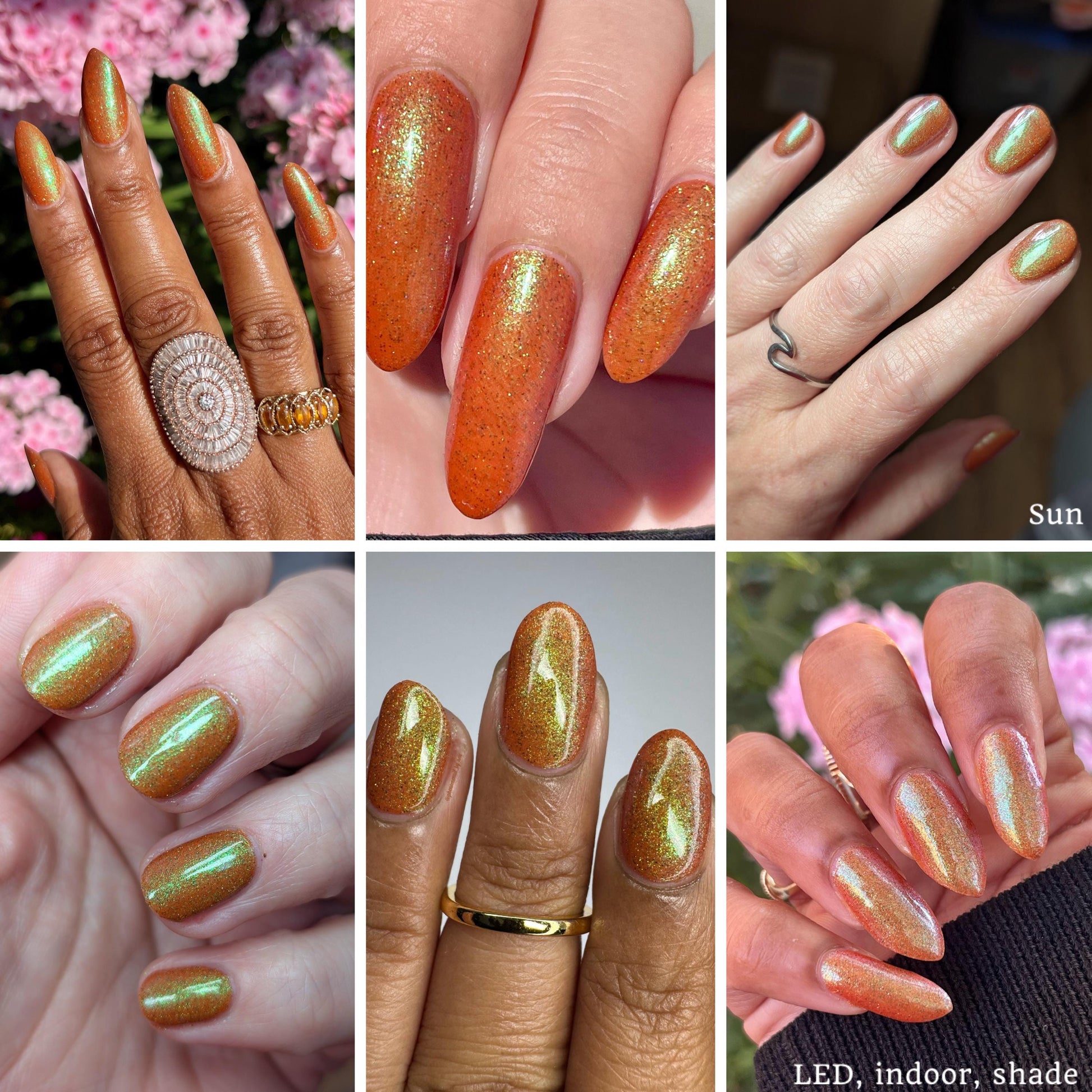 Pumpkin Queen is a terracotta orange lacquer with micro black holo glitter and green-blue shimmer. Dries very textured. Best in 2-3 coats.