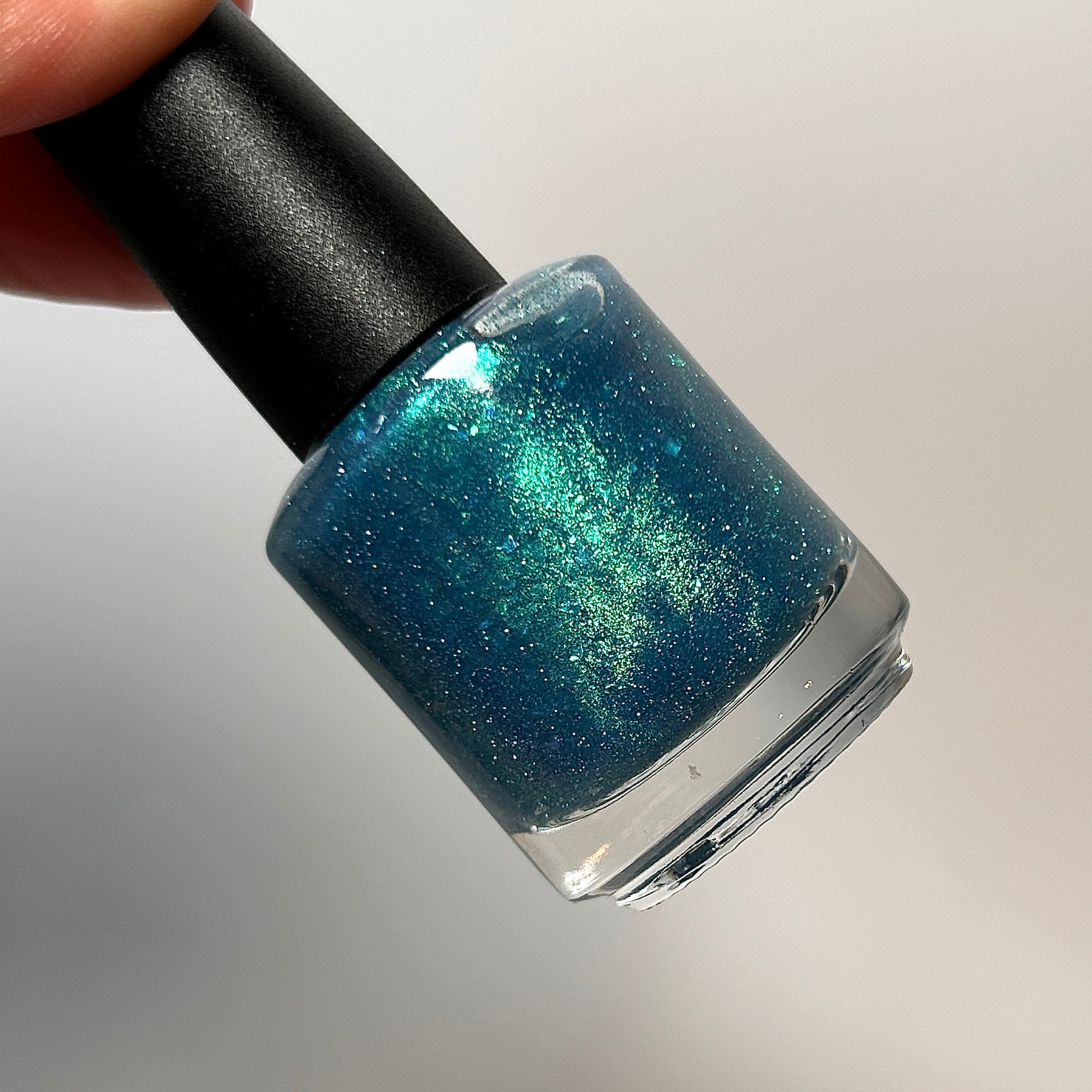Sheer Mermaid Motel is a limited batch resulting from a happy accident while mixing a batch of Mermaid Motel. It is the same formula as MM (blue-green flakey + reflective glitter) but has less pigment in the base. Shown in 3 coats, it is very sheer and what I would categorize as a topper. You won’t achieve full opacity with it.