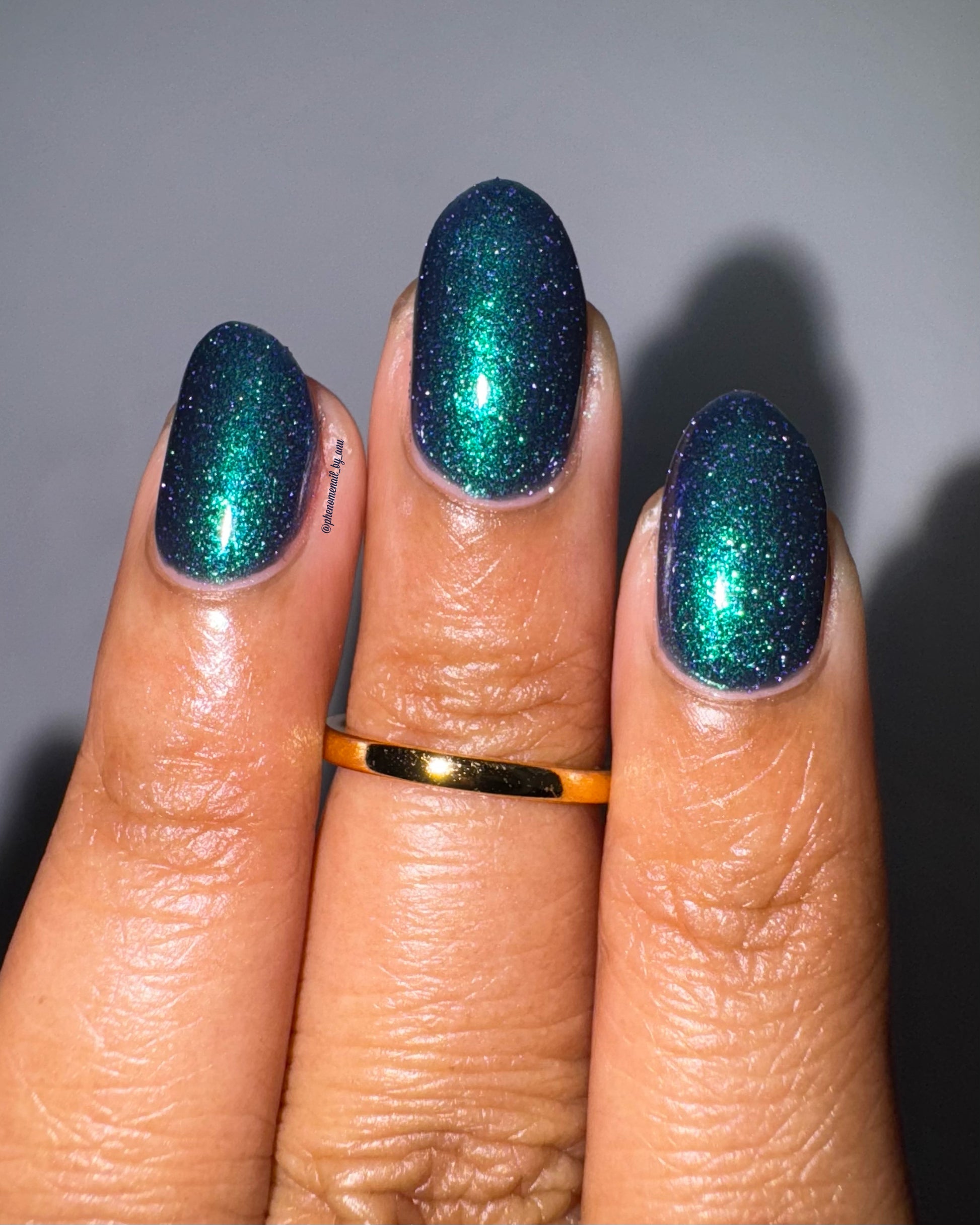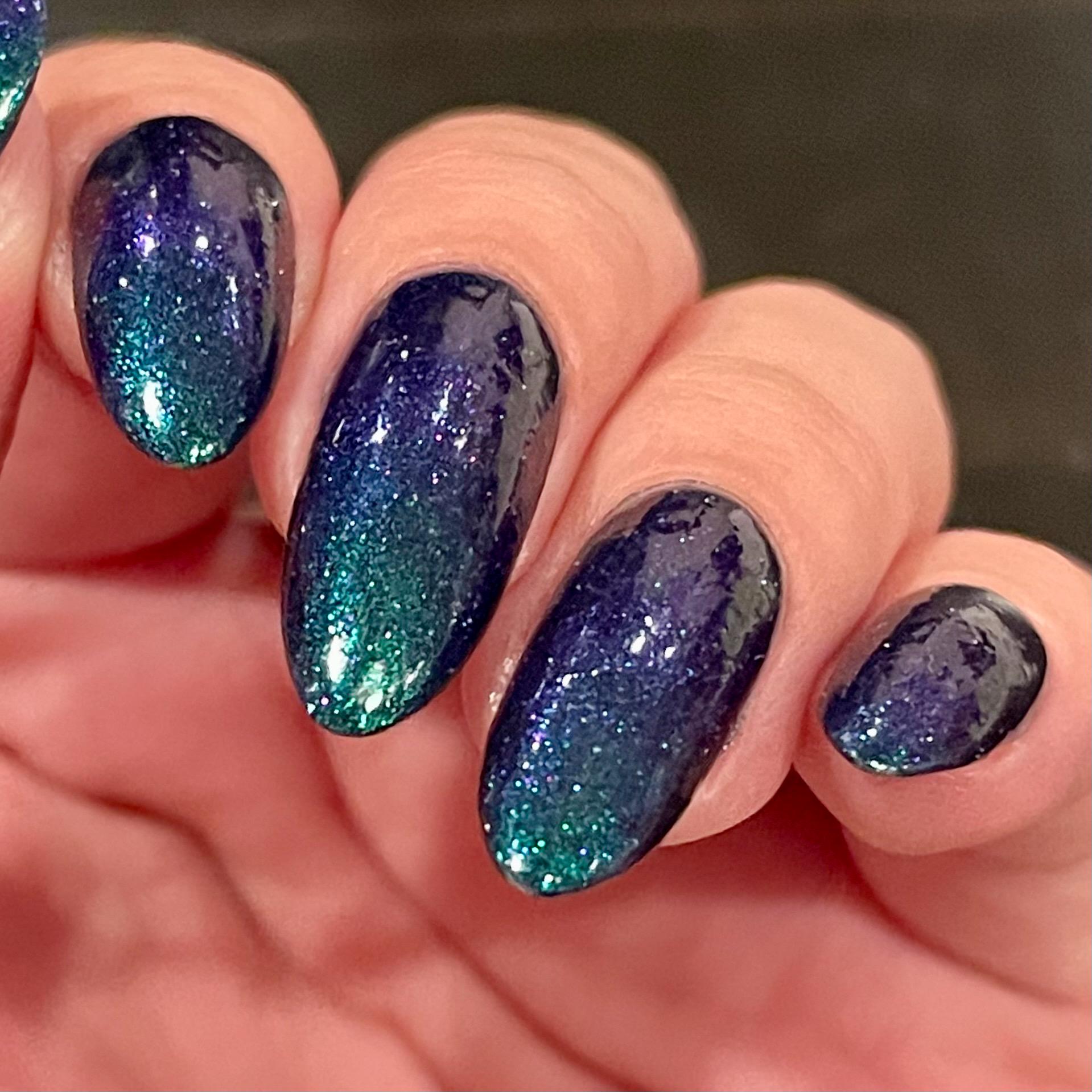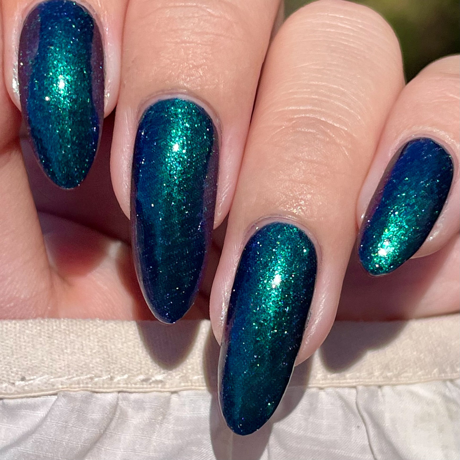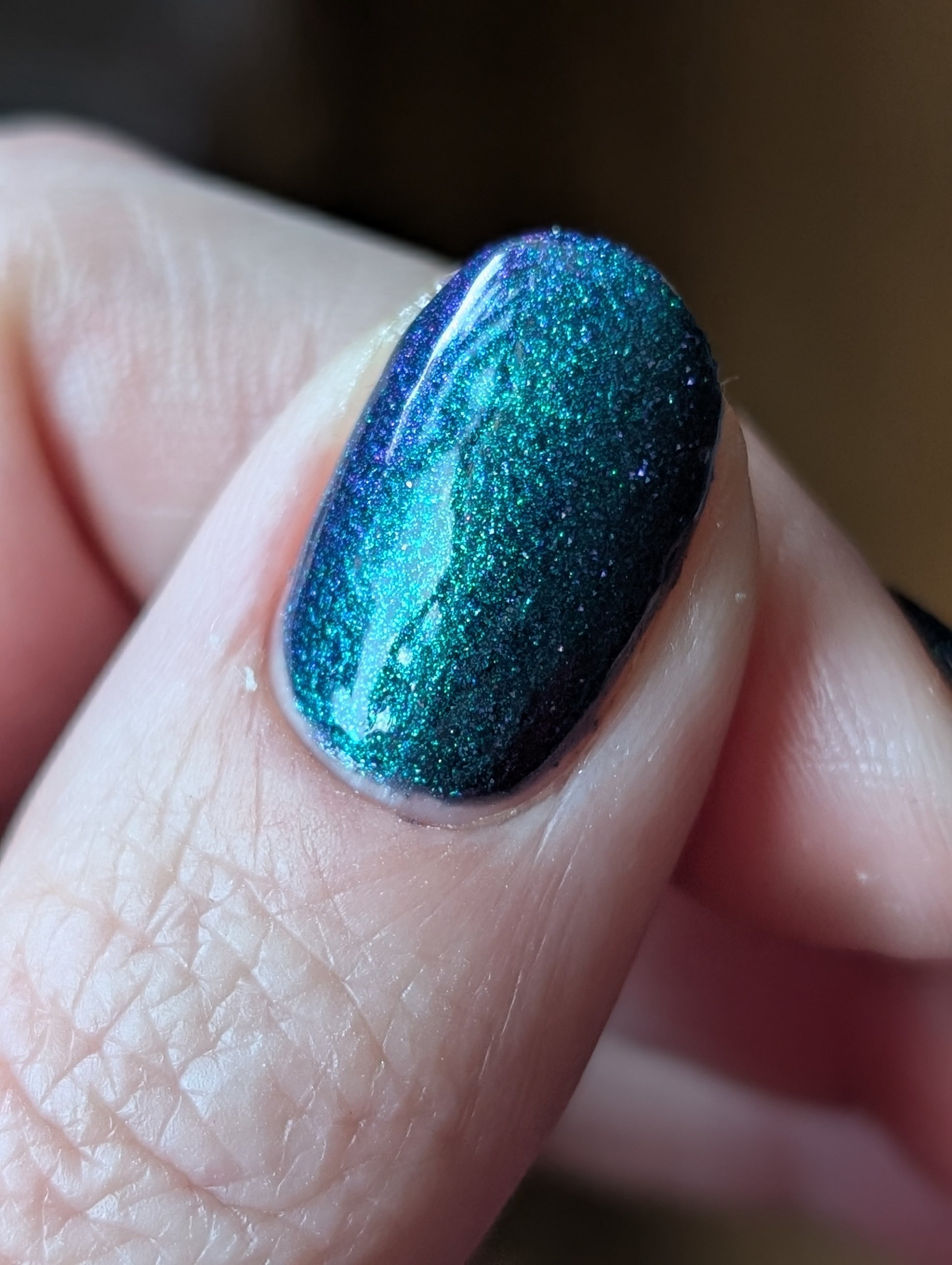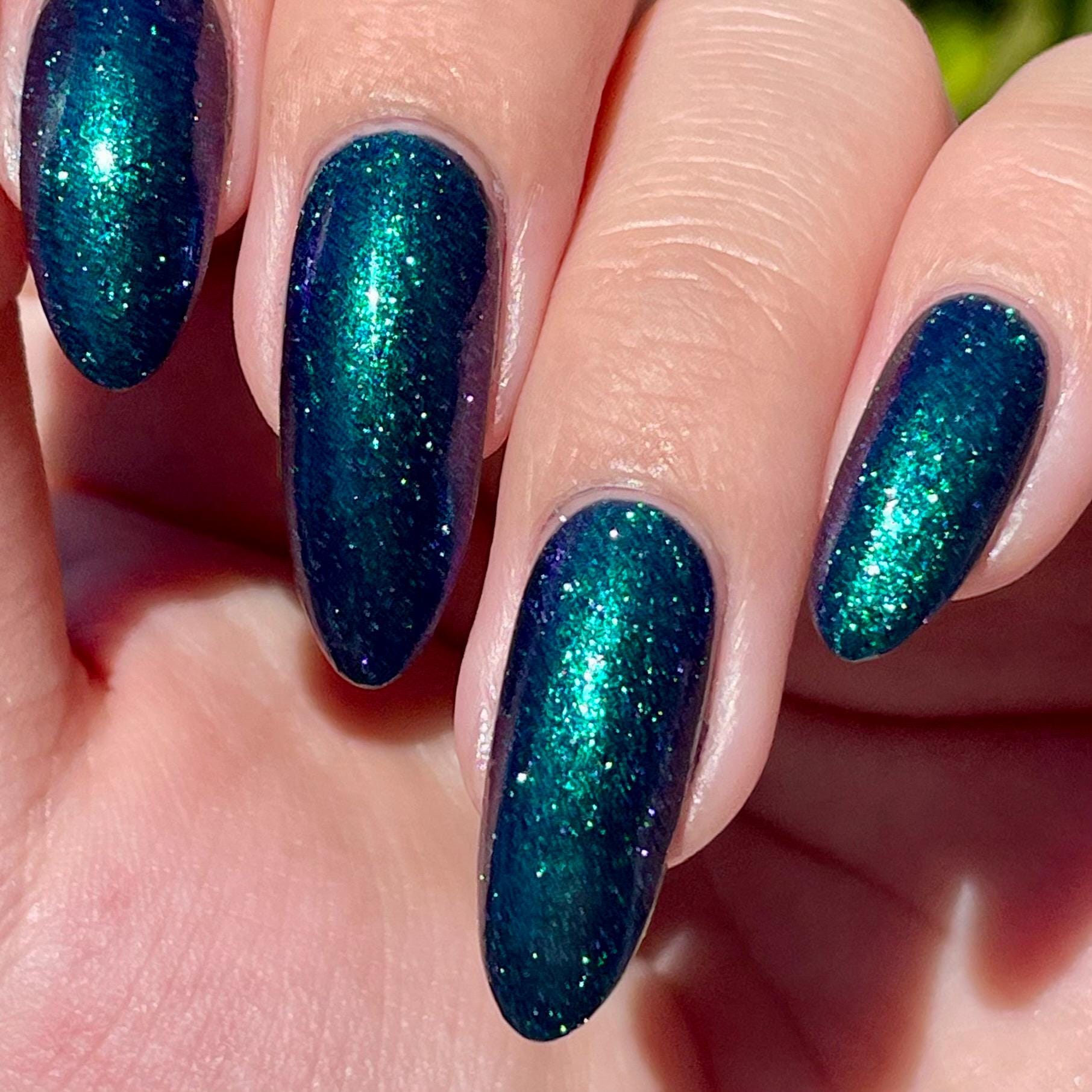 Spooky Jester is a deep blue base with green-purple shifting shimmer and purple reflective glitter. Overall color appears deep teal. Dries textured.