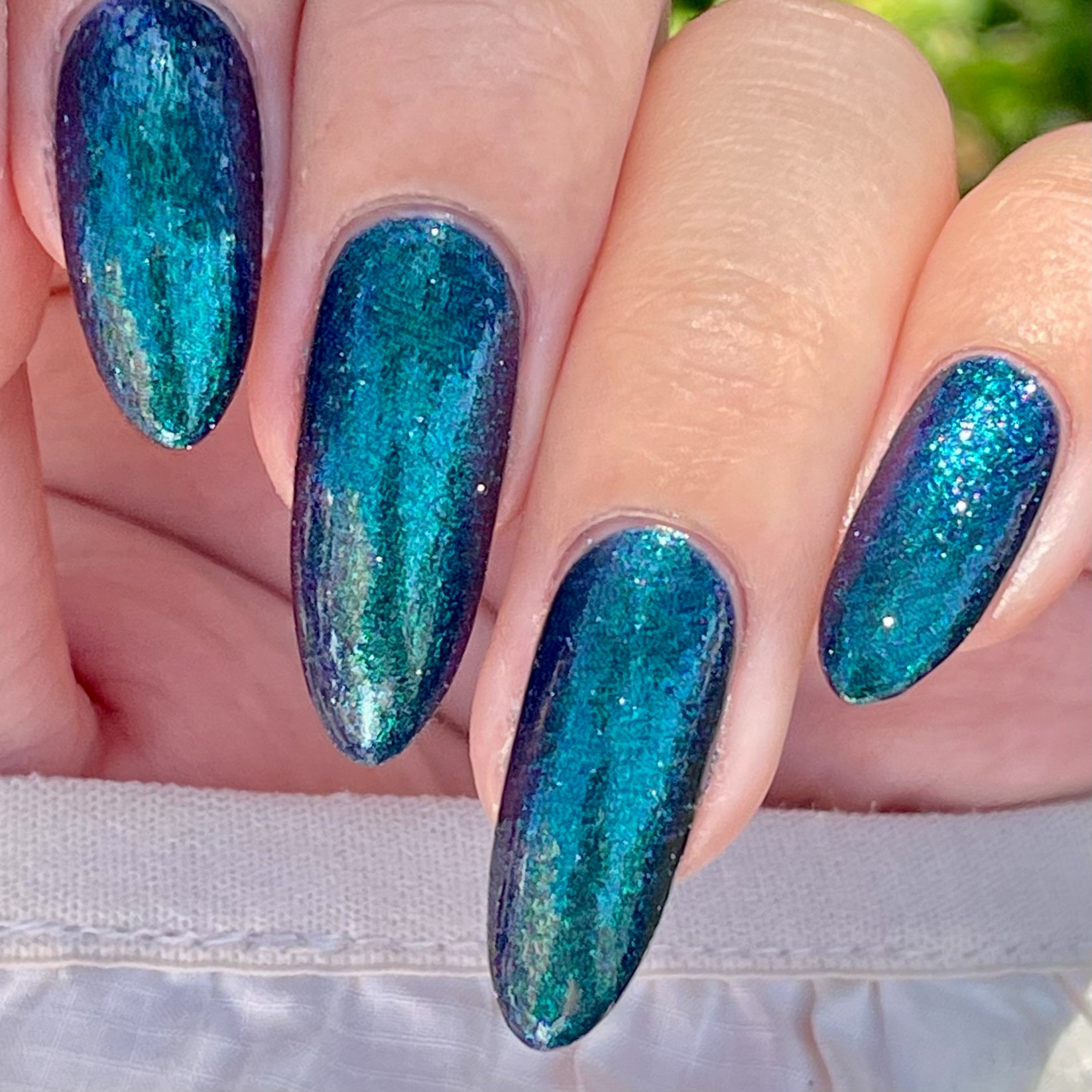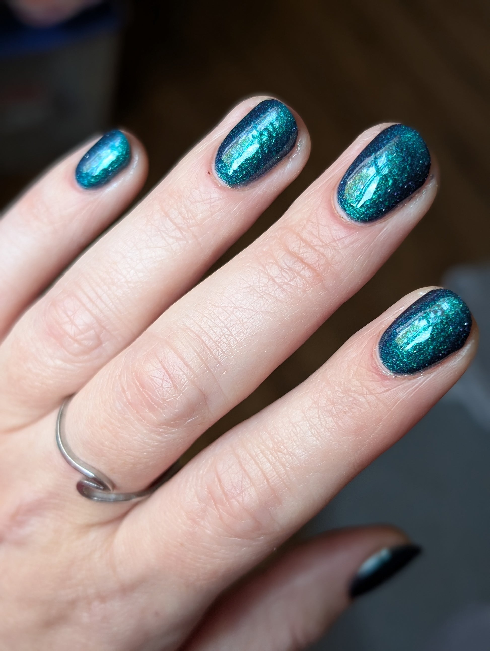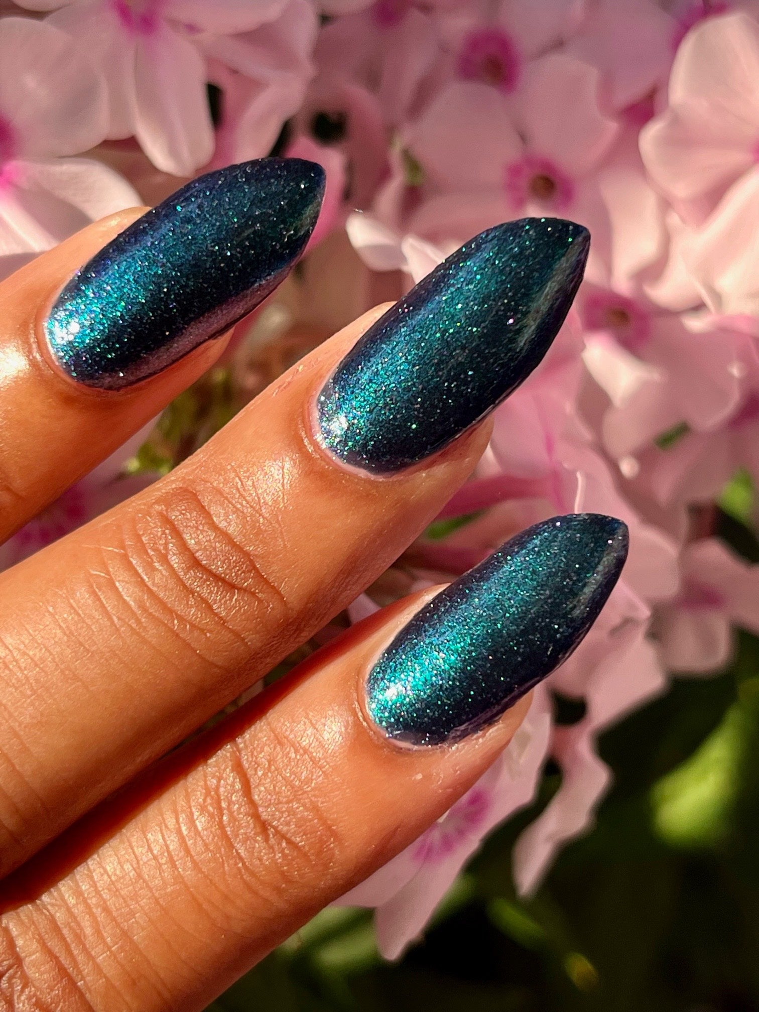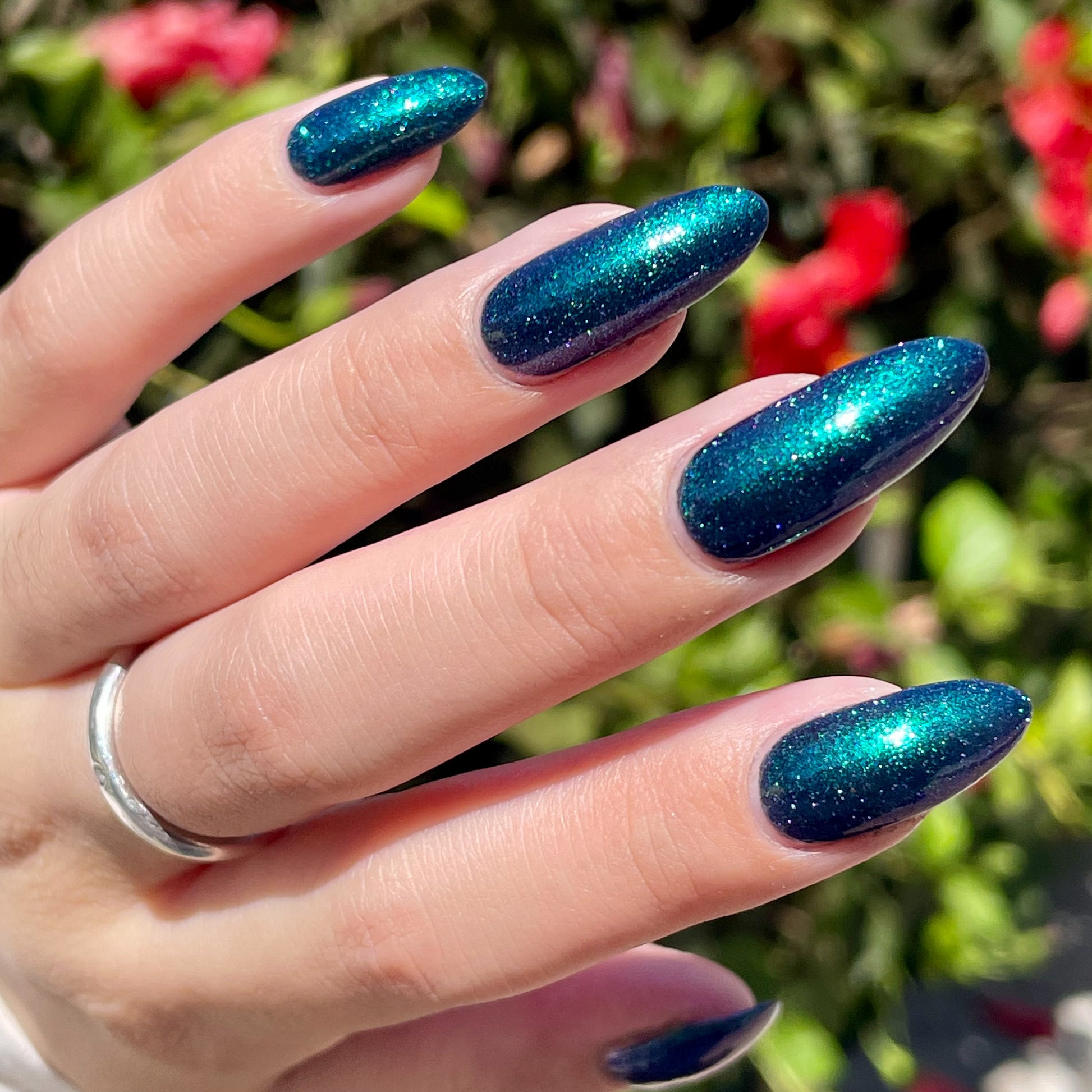 Spooky Jester is a deep blue base with green-purple shifting shimmer and purple reflective glitter. Overall color appears deep teal. Dries textured.