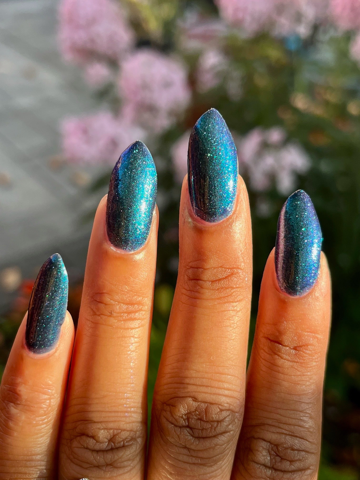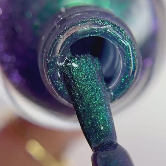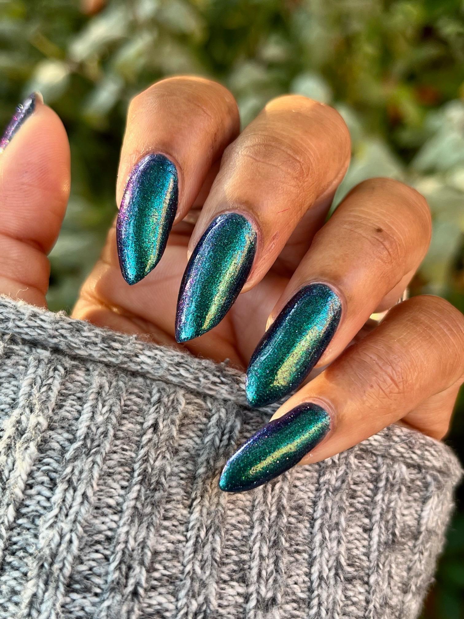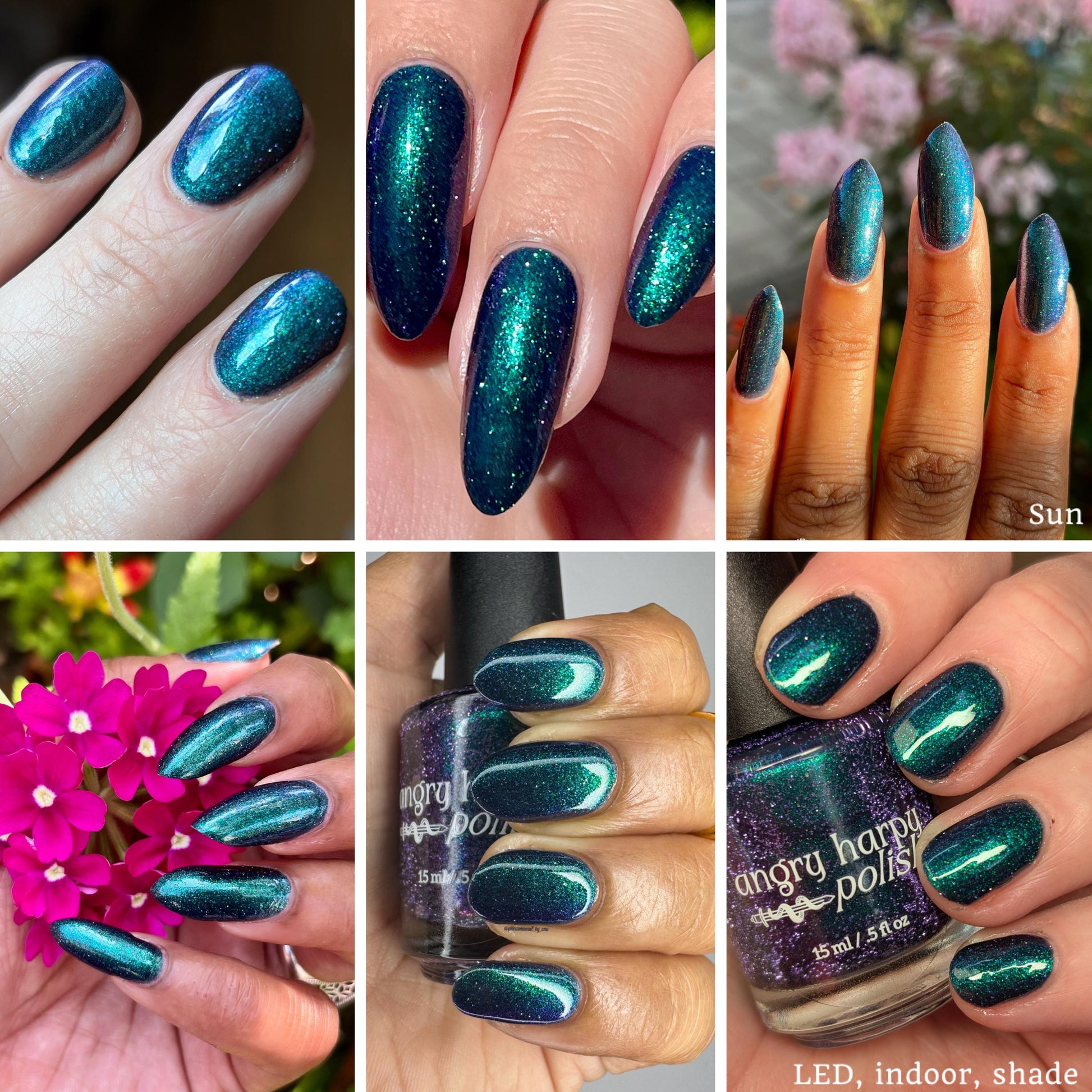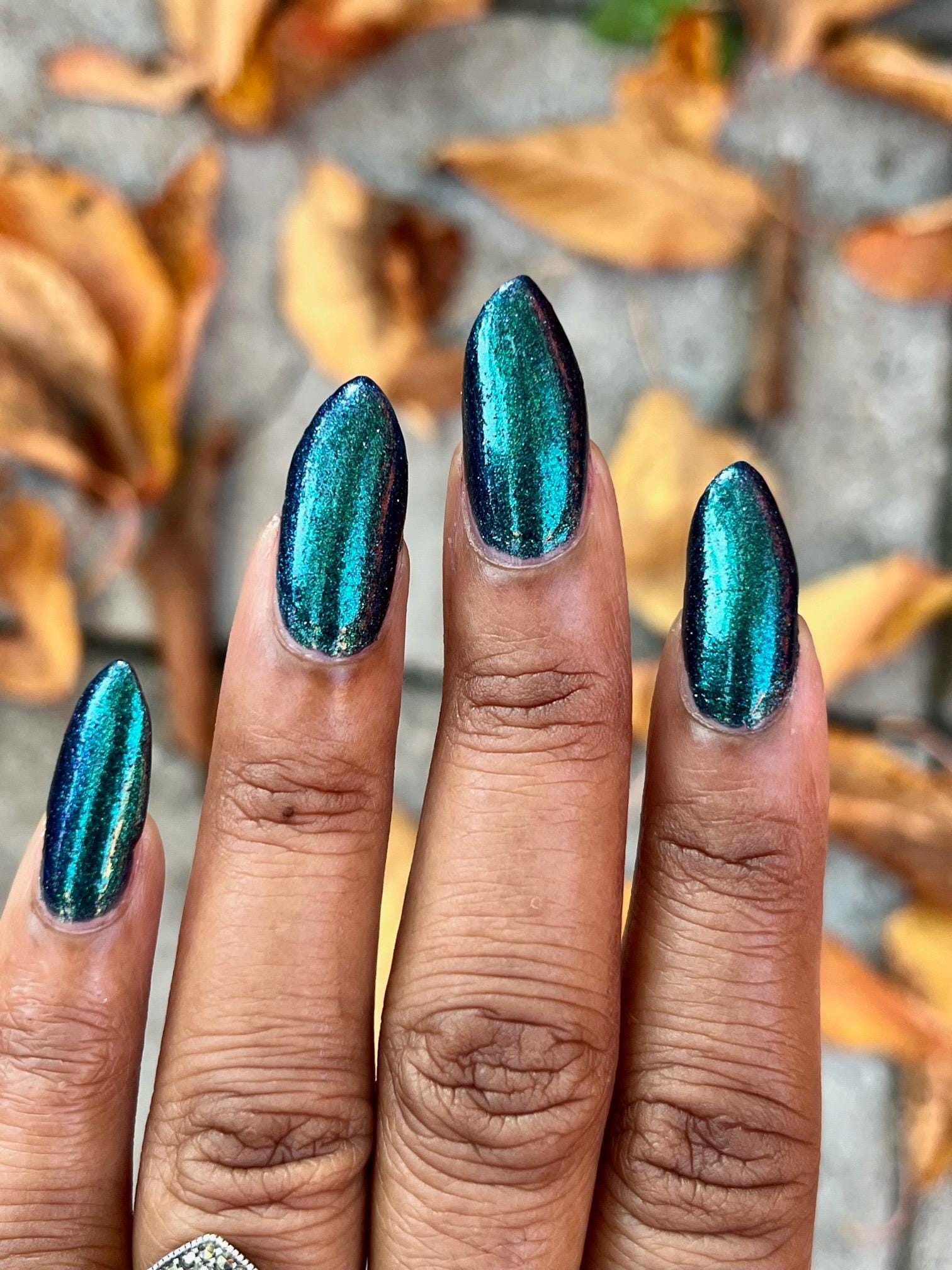 Spooky Jester is a deep blue base with green-purple shifting shimmer and purple reflective glitter. Overall color appears deep teal. Dries textured.