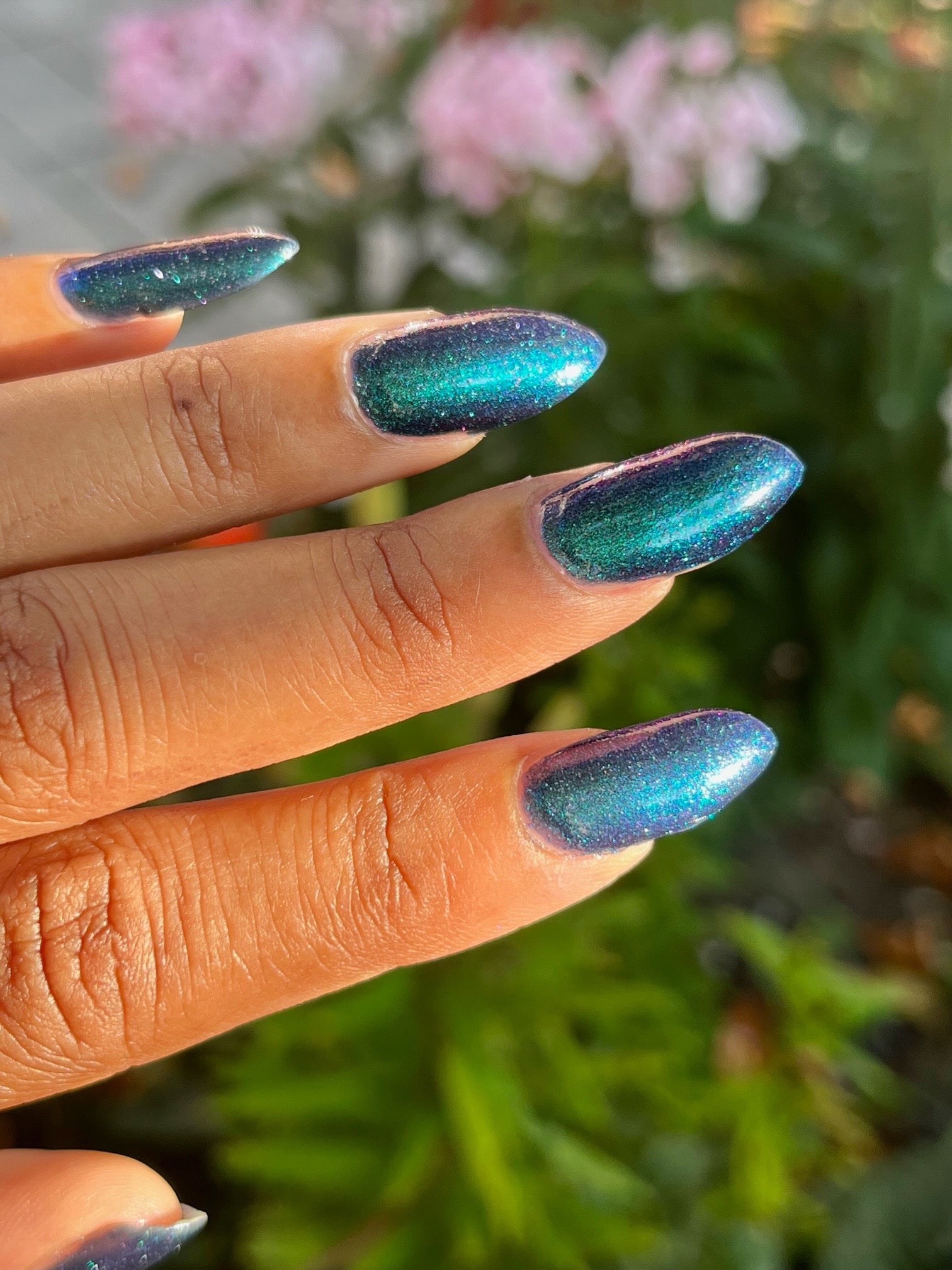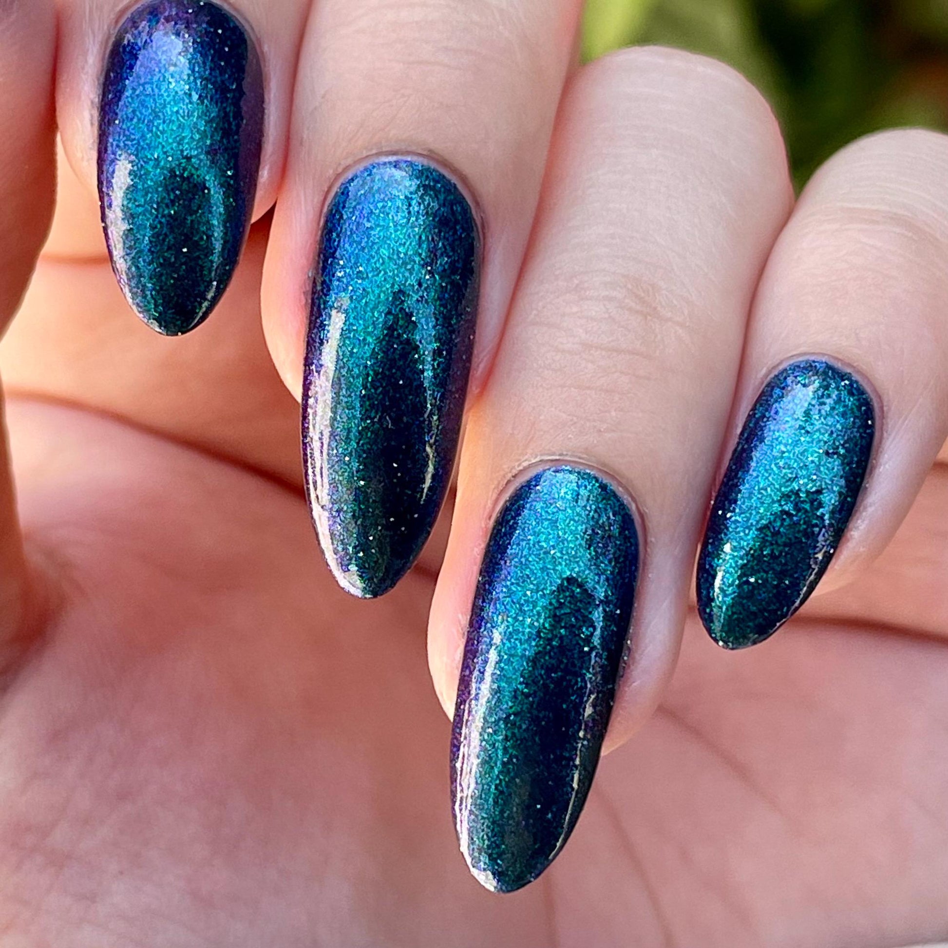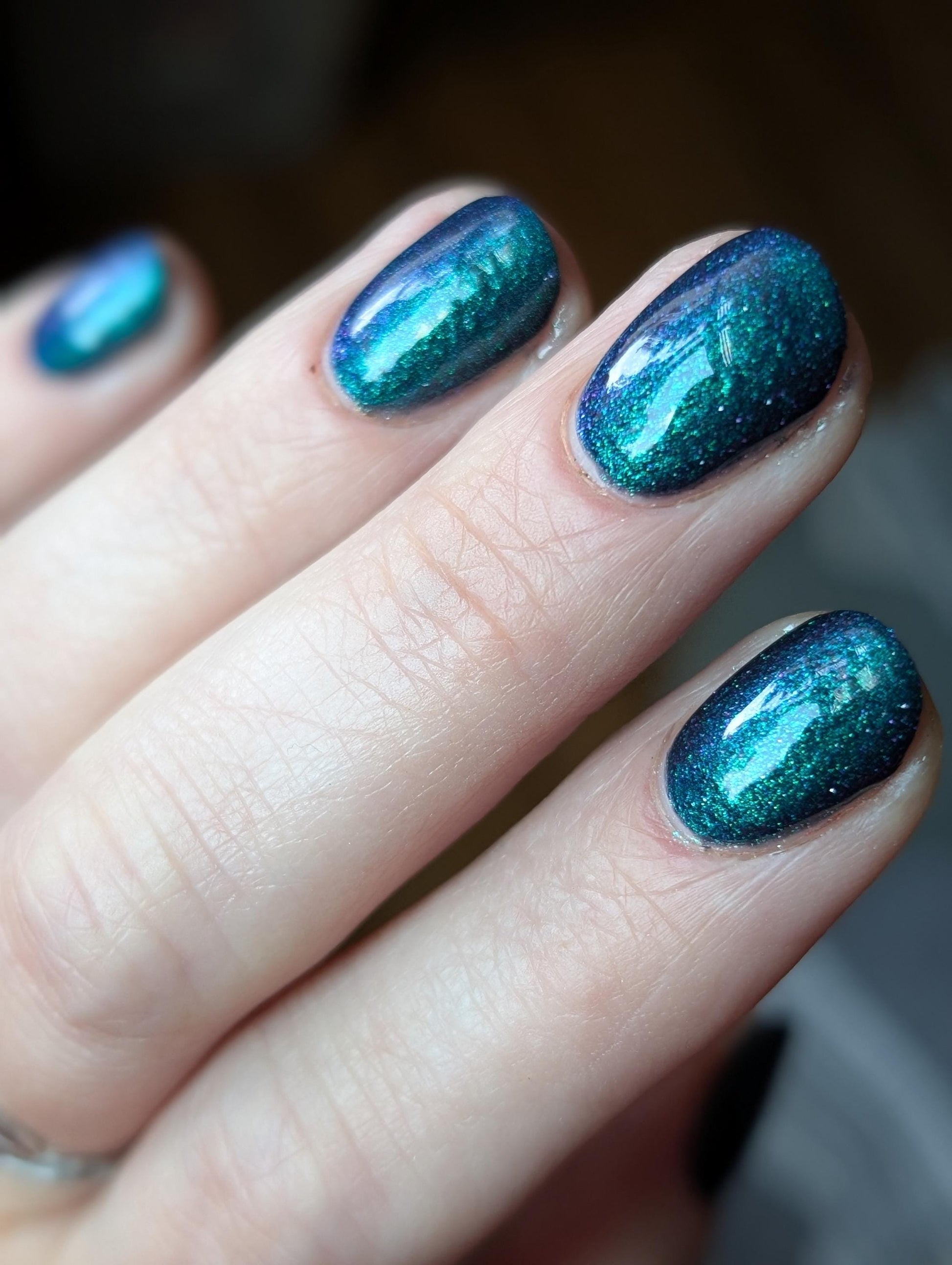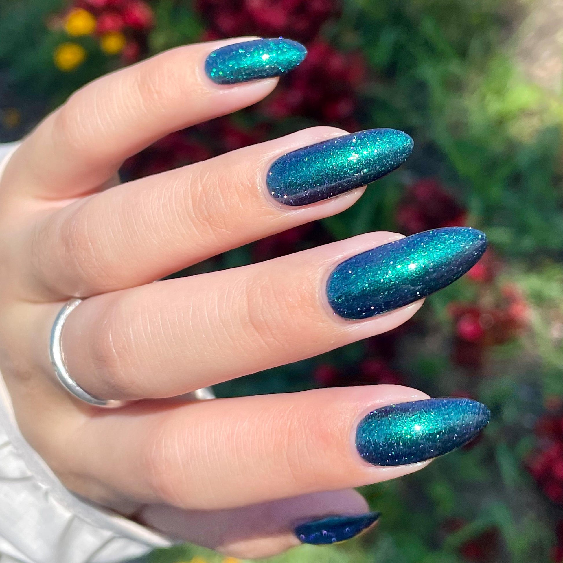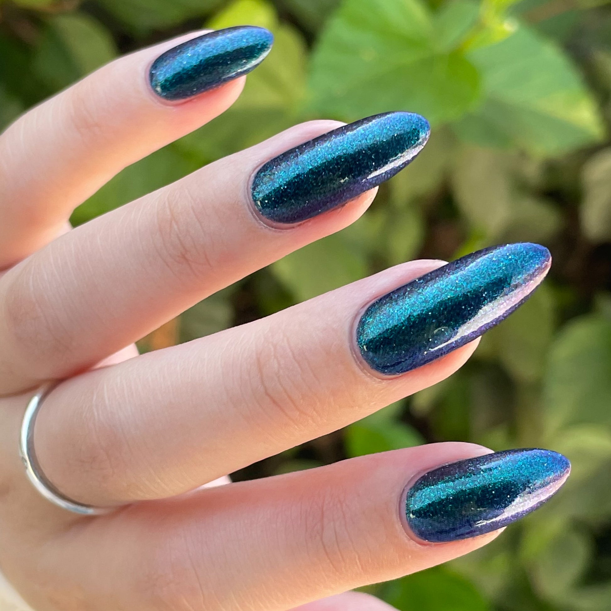 Spooky Jester is a deep blue base with green-purple shifting shimmer and purple reflective glitter. Overall color appears deep teal. Dries textured.