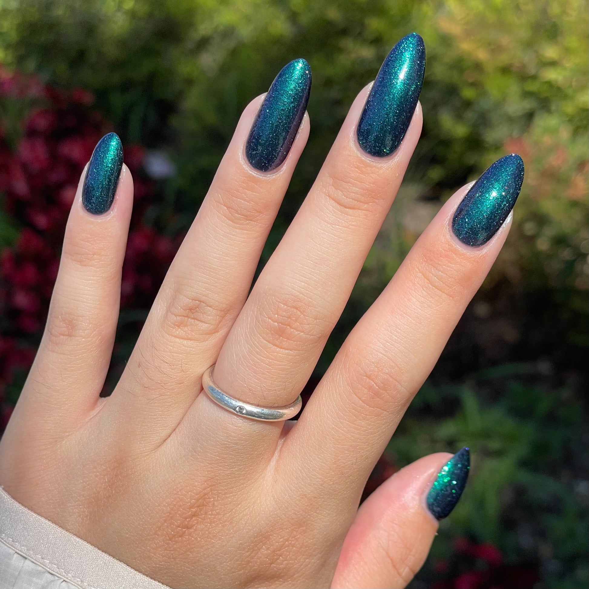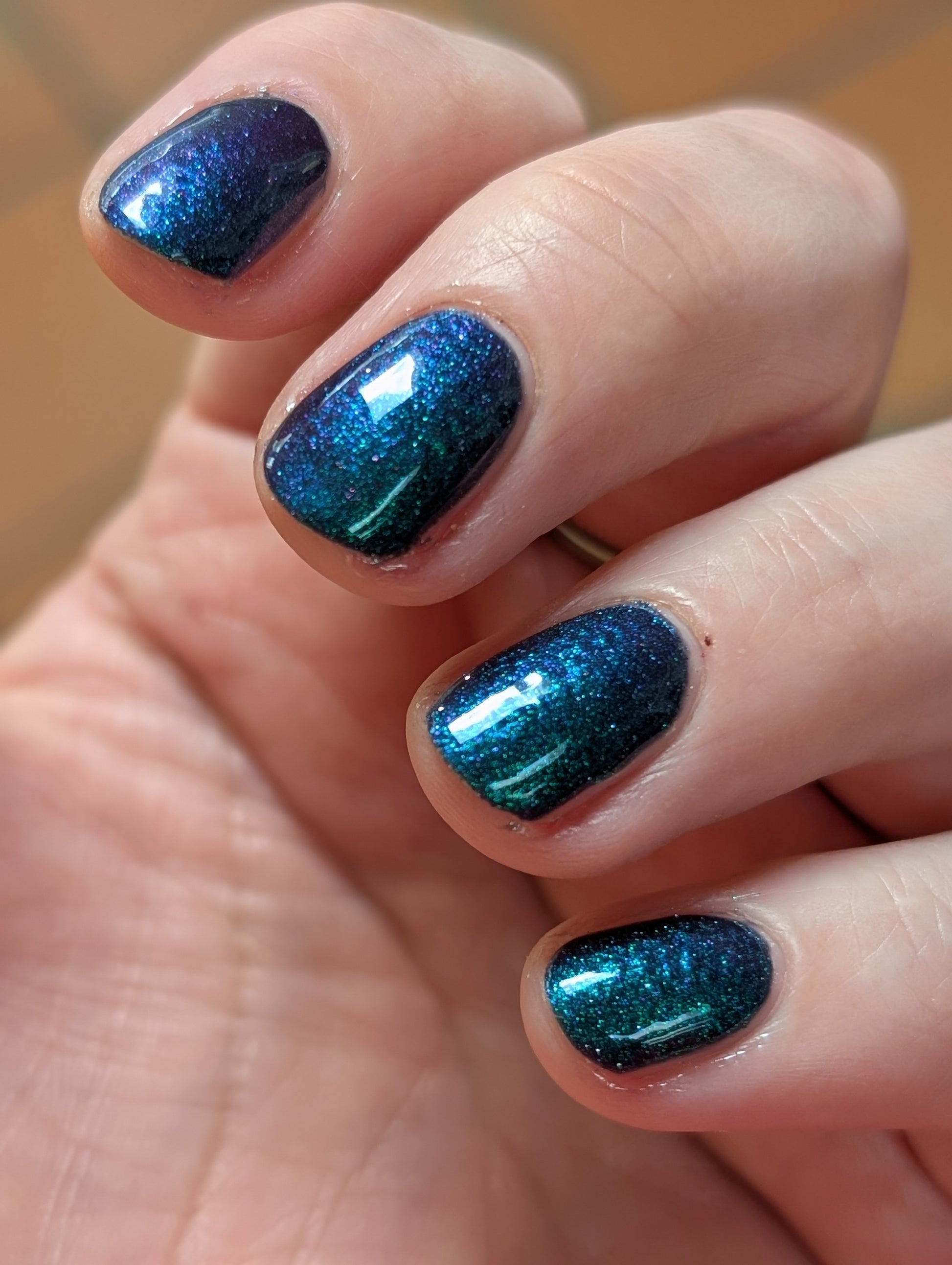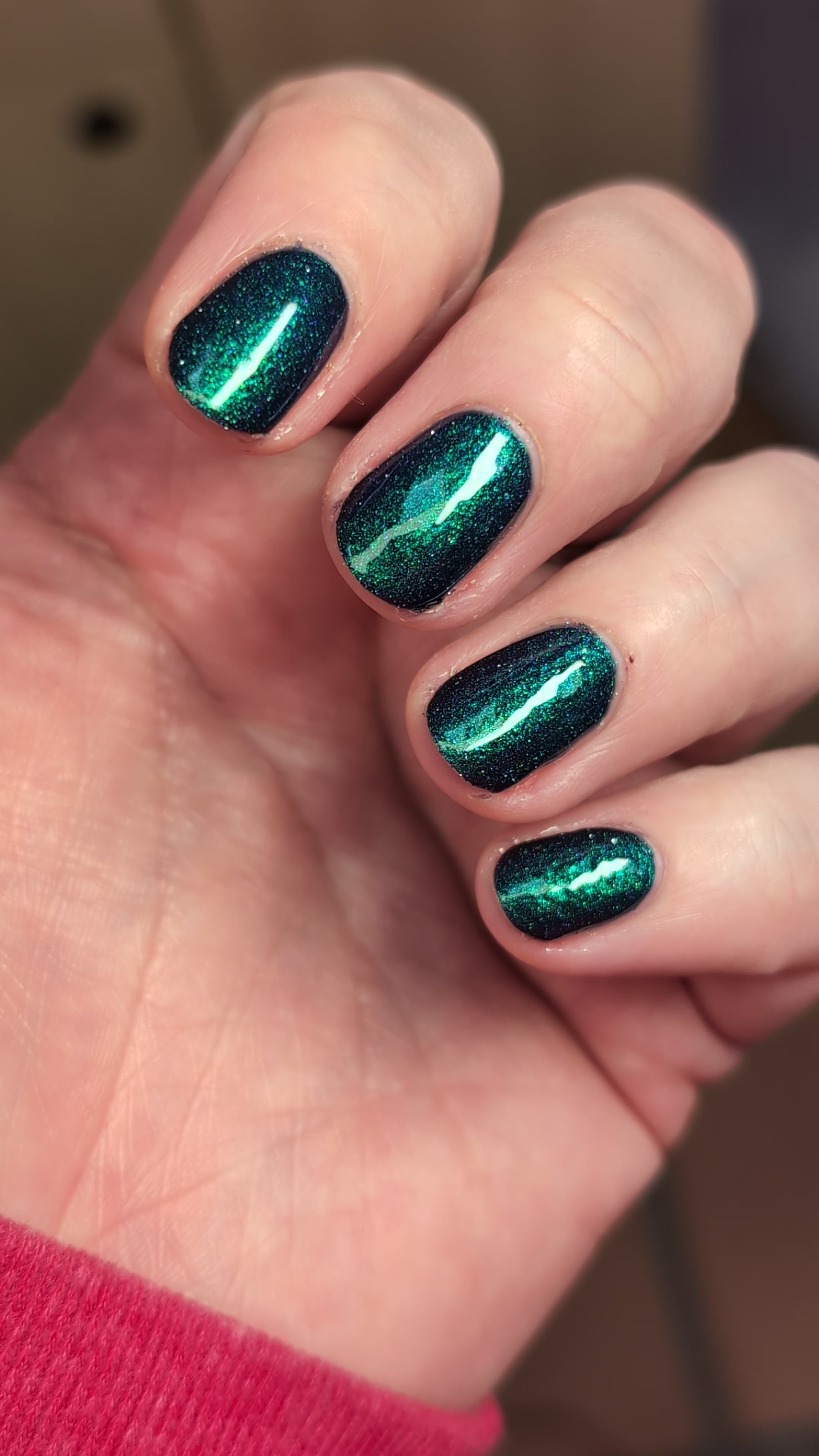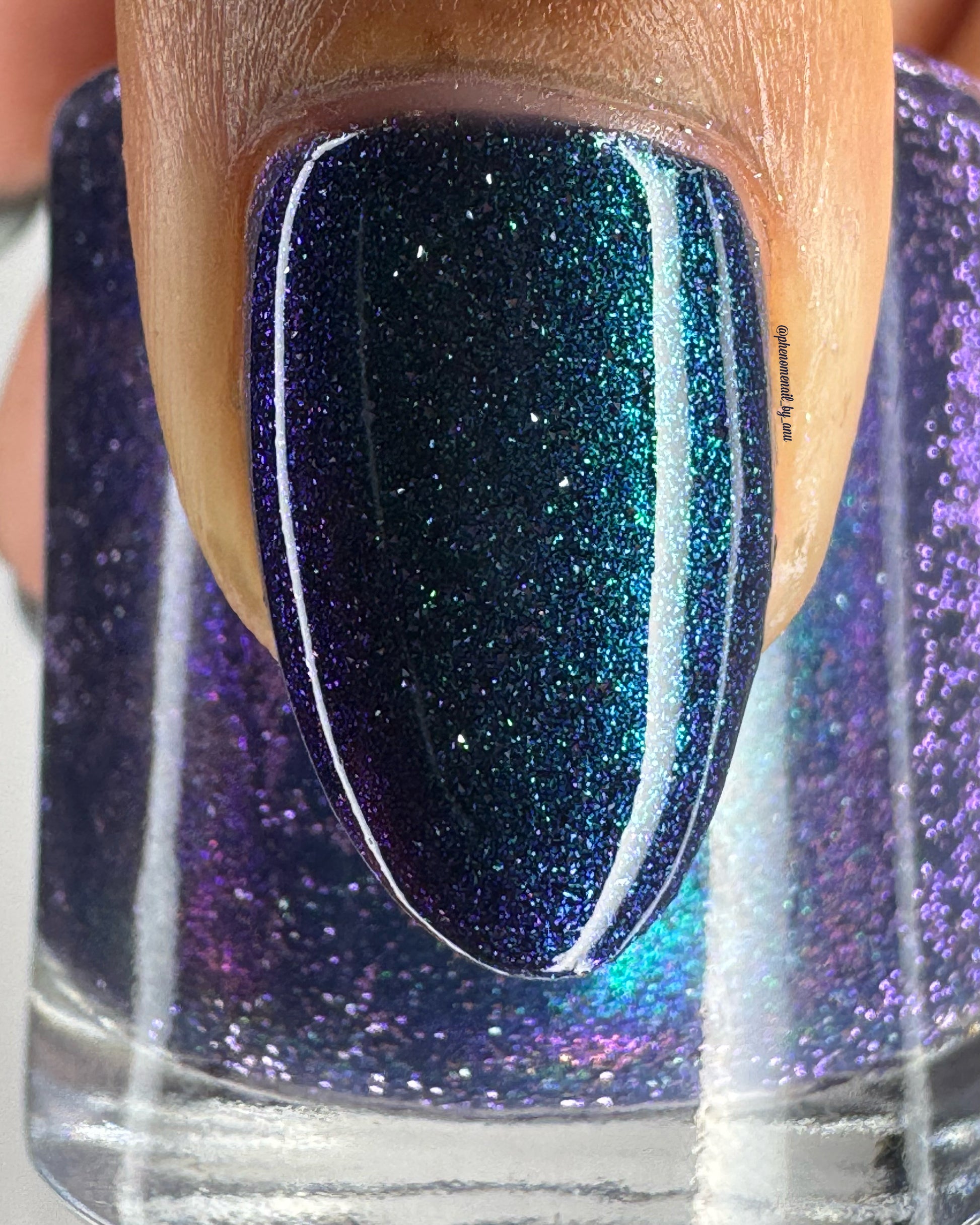 Spooky Jester is a deep blue base with green-purple shifting shimmer and purple reflective glitter. Overall color appears deep teal. Dries textured.