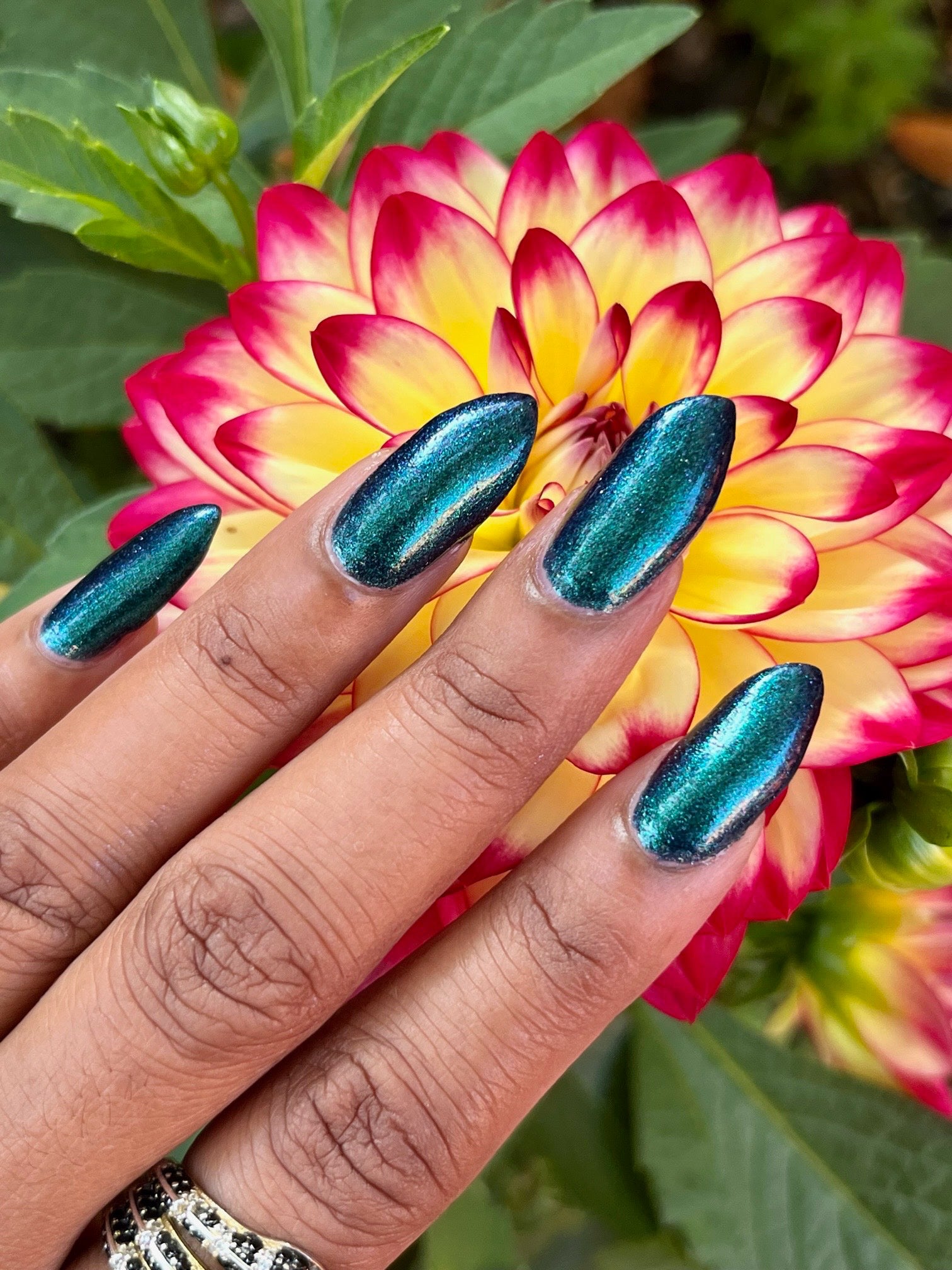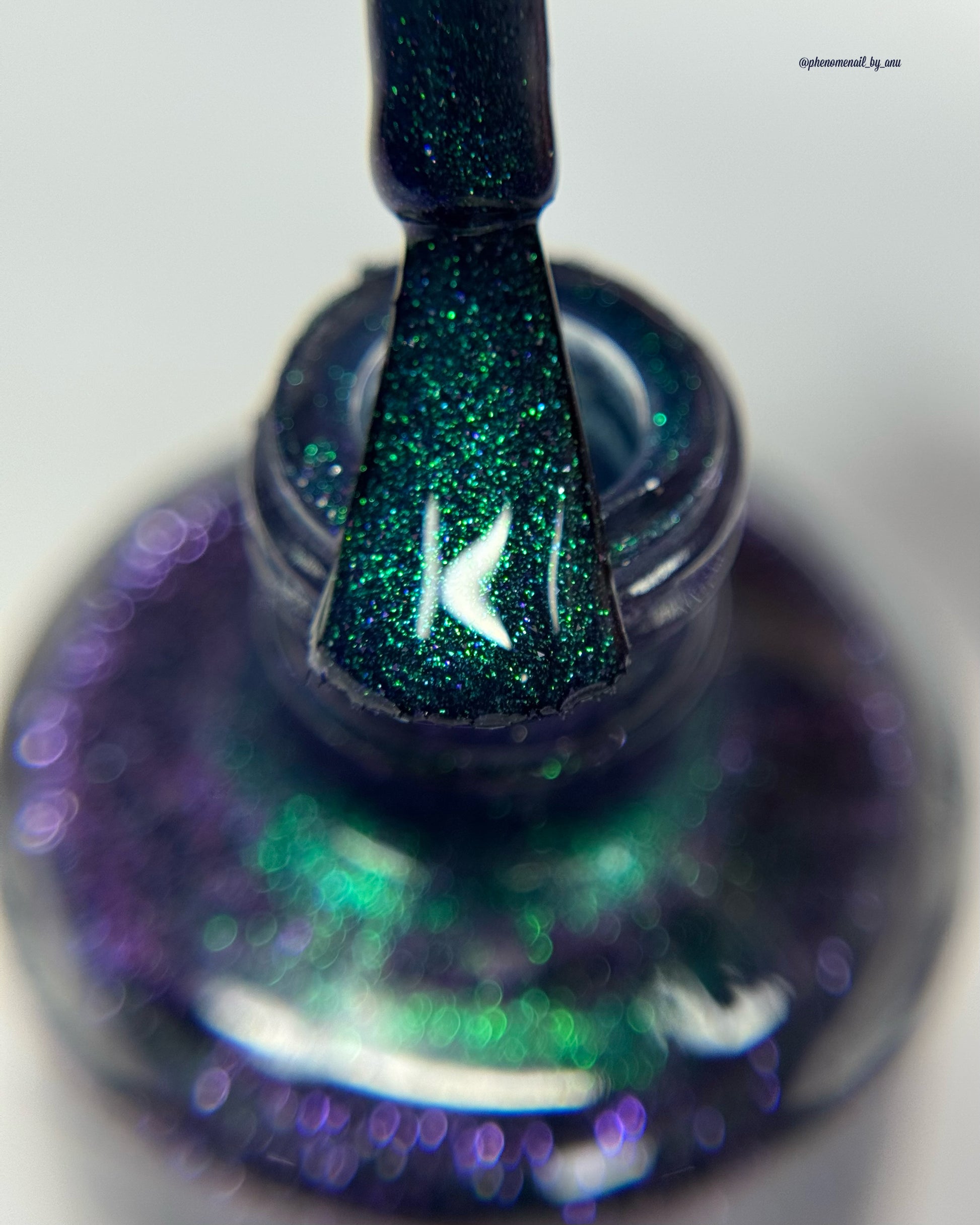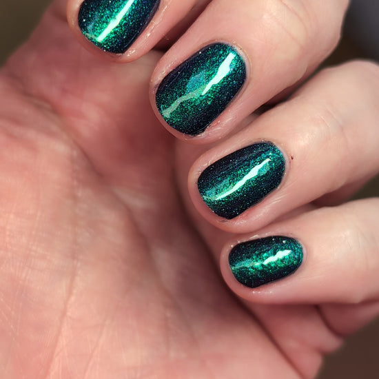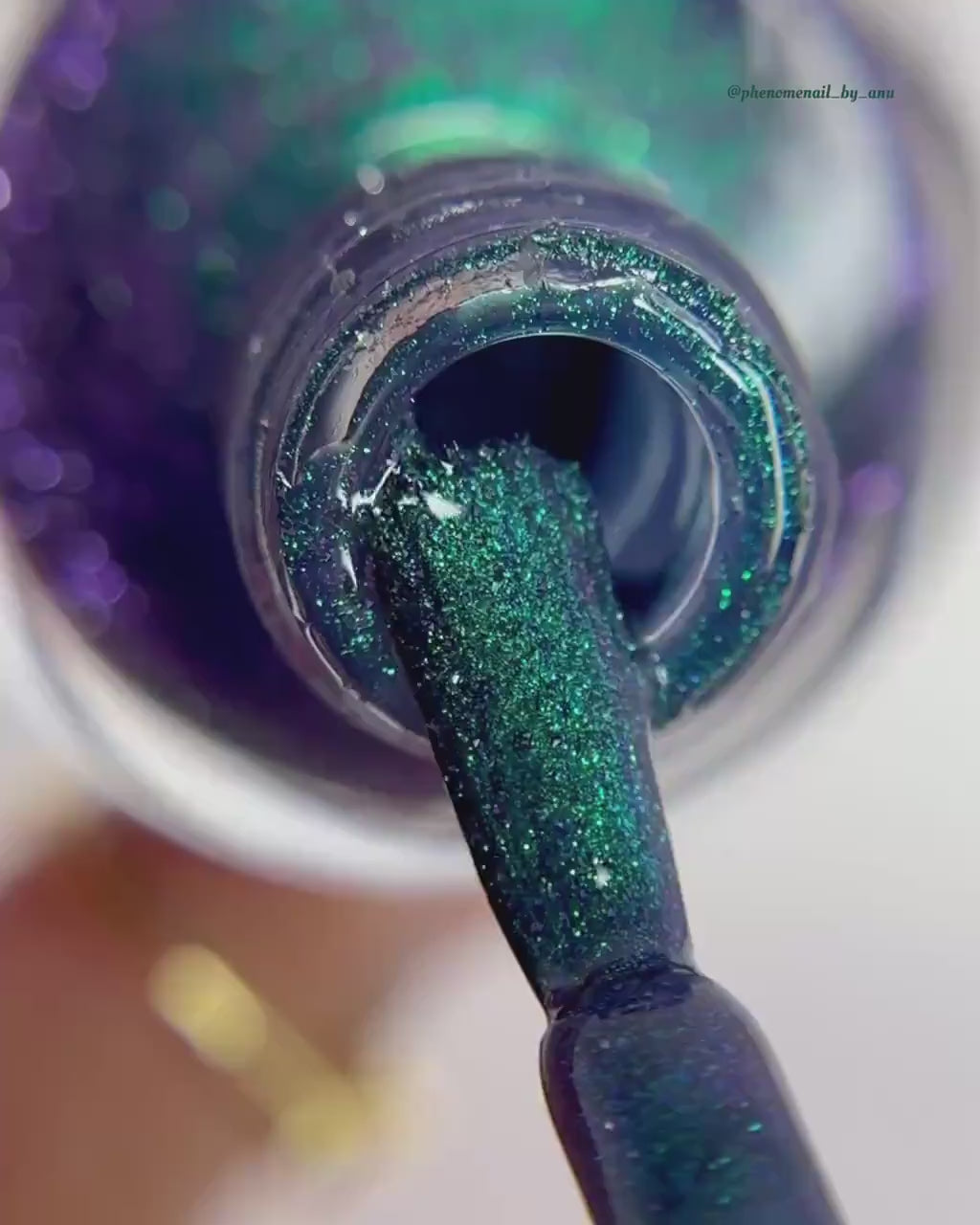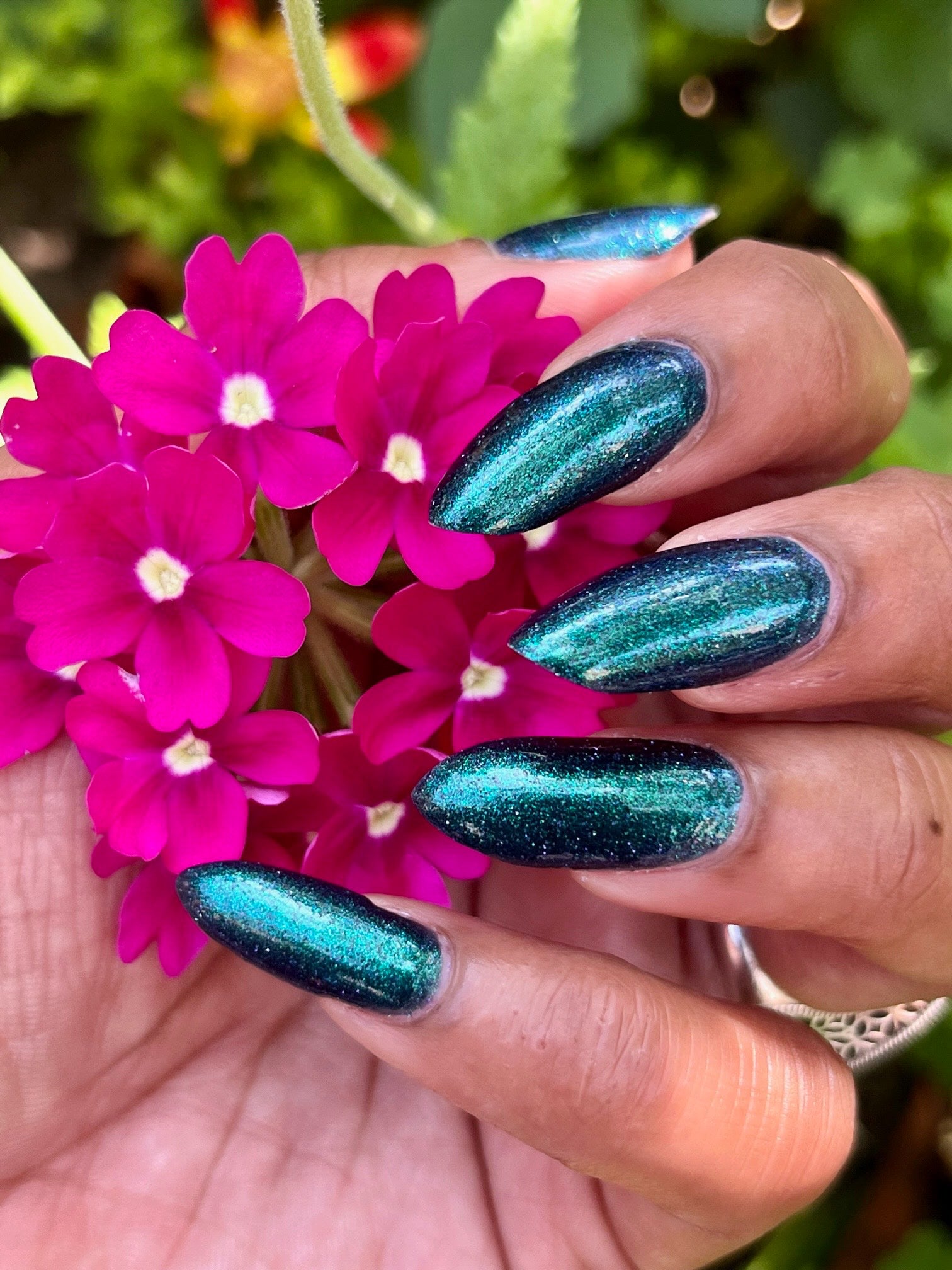 Spooky Jester is a deep blue base with green-purple shifting shimmer and purple reflective glitter. Overall color appears deep teal. Dries textured.