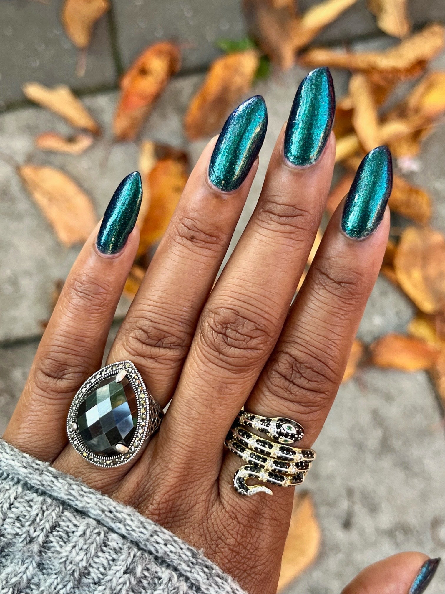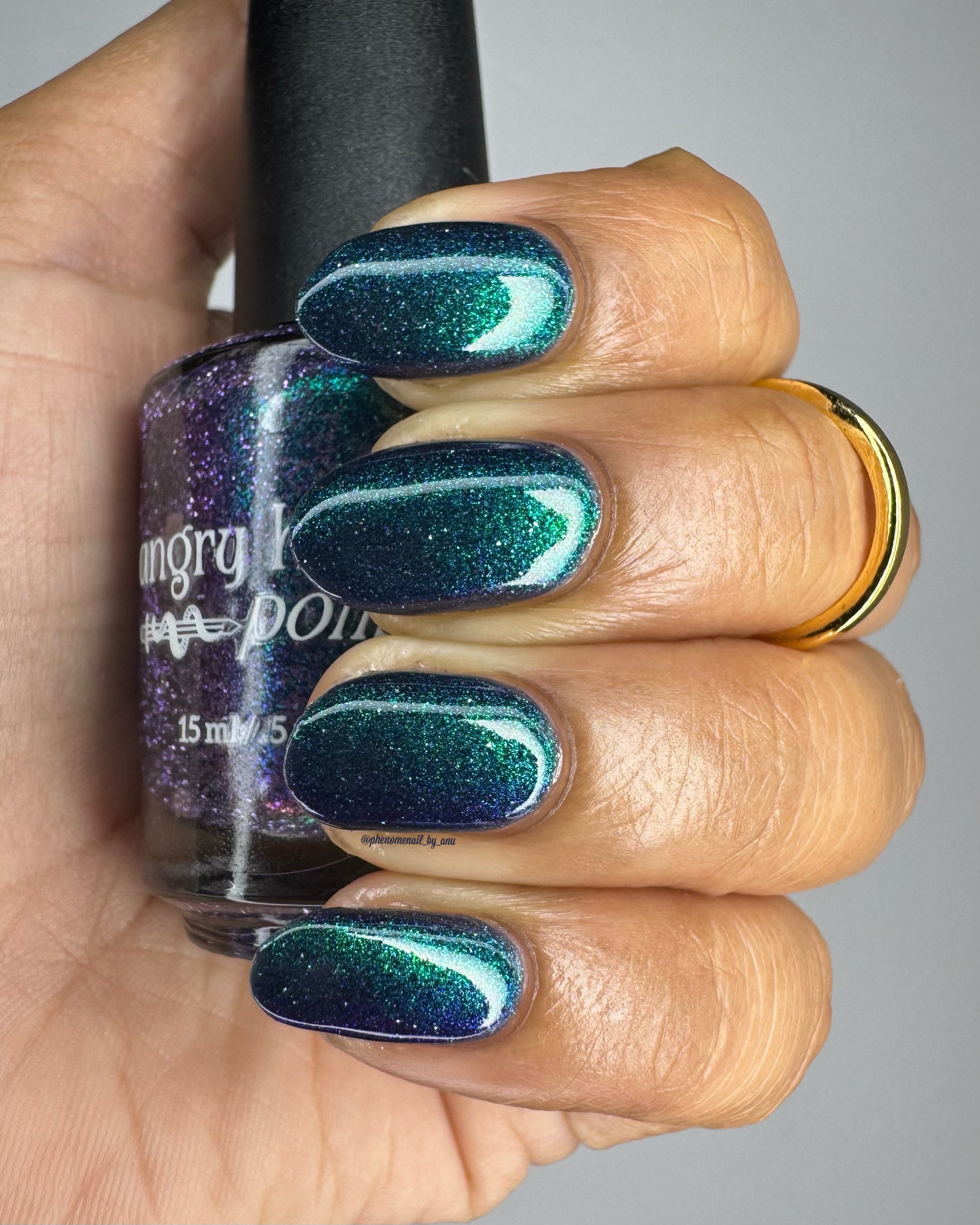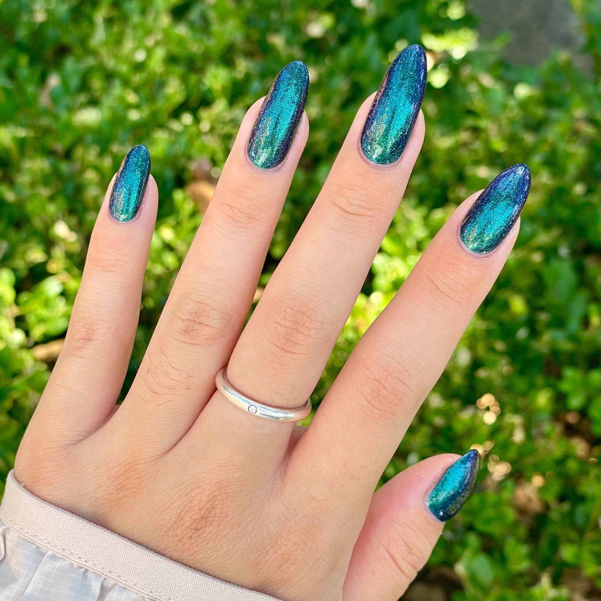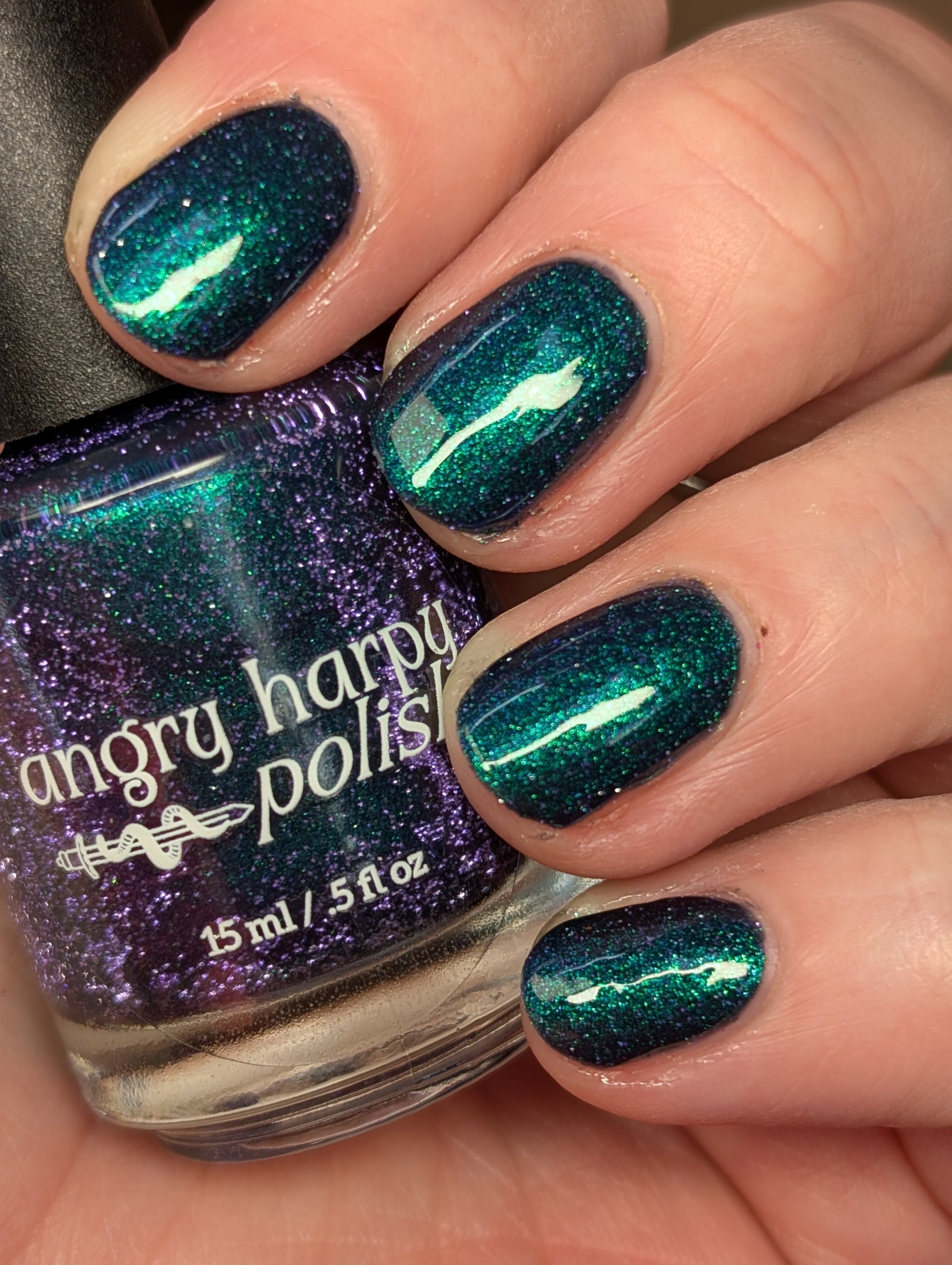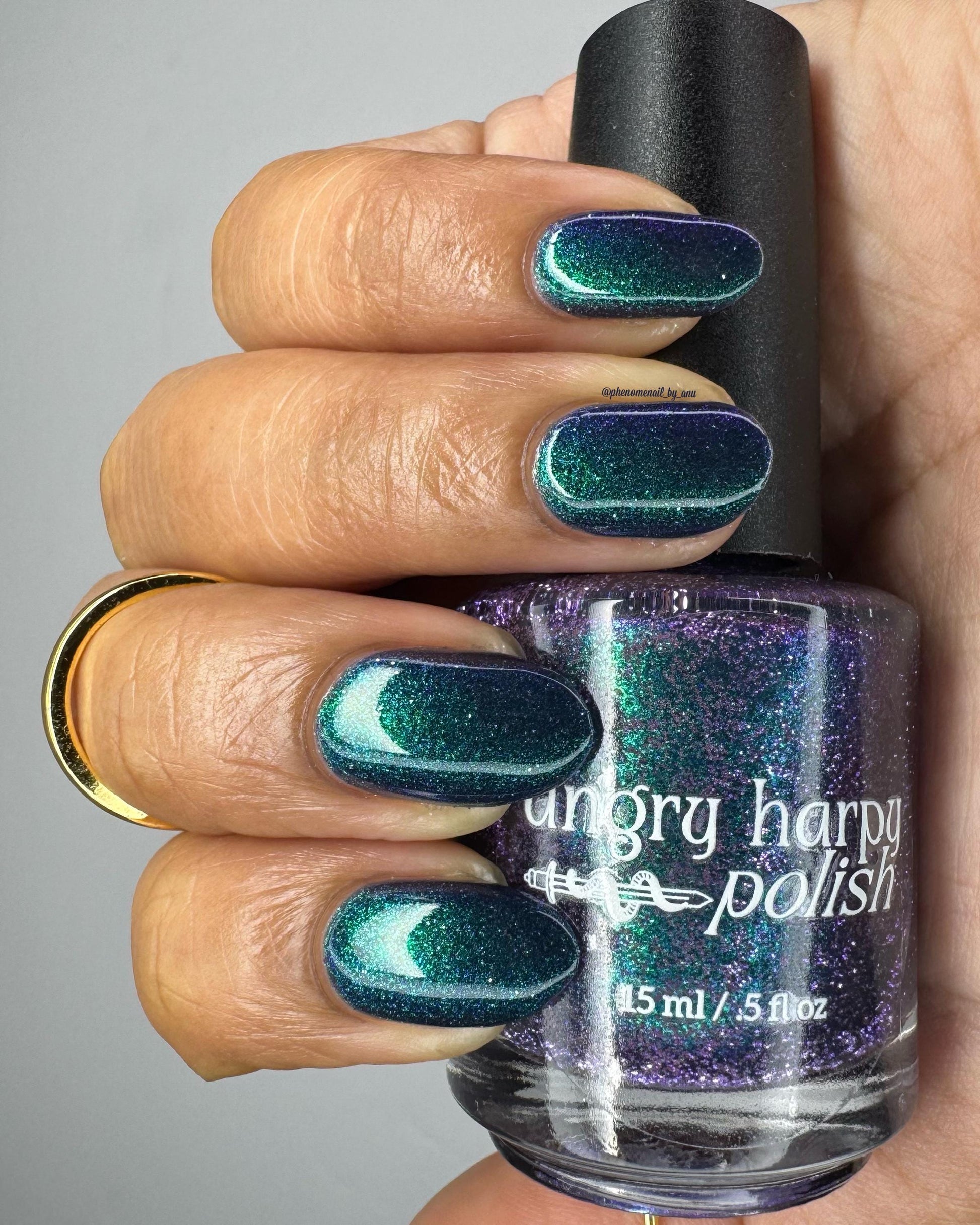 Spooky Jester is a deep blue base with green-purple shifting shimmer and purple reflective glitter. Overall color appears deep teal. Dries textured.
